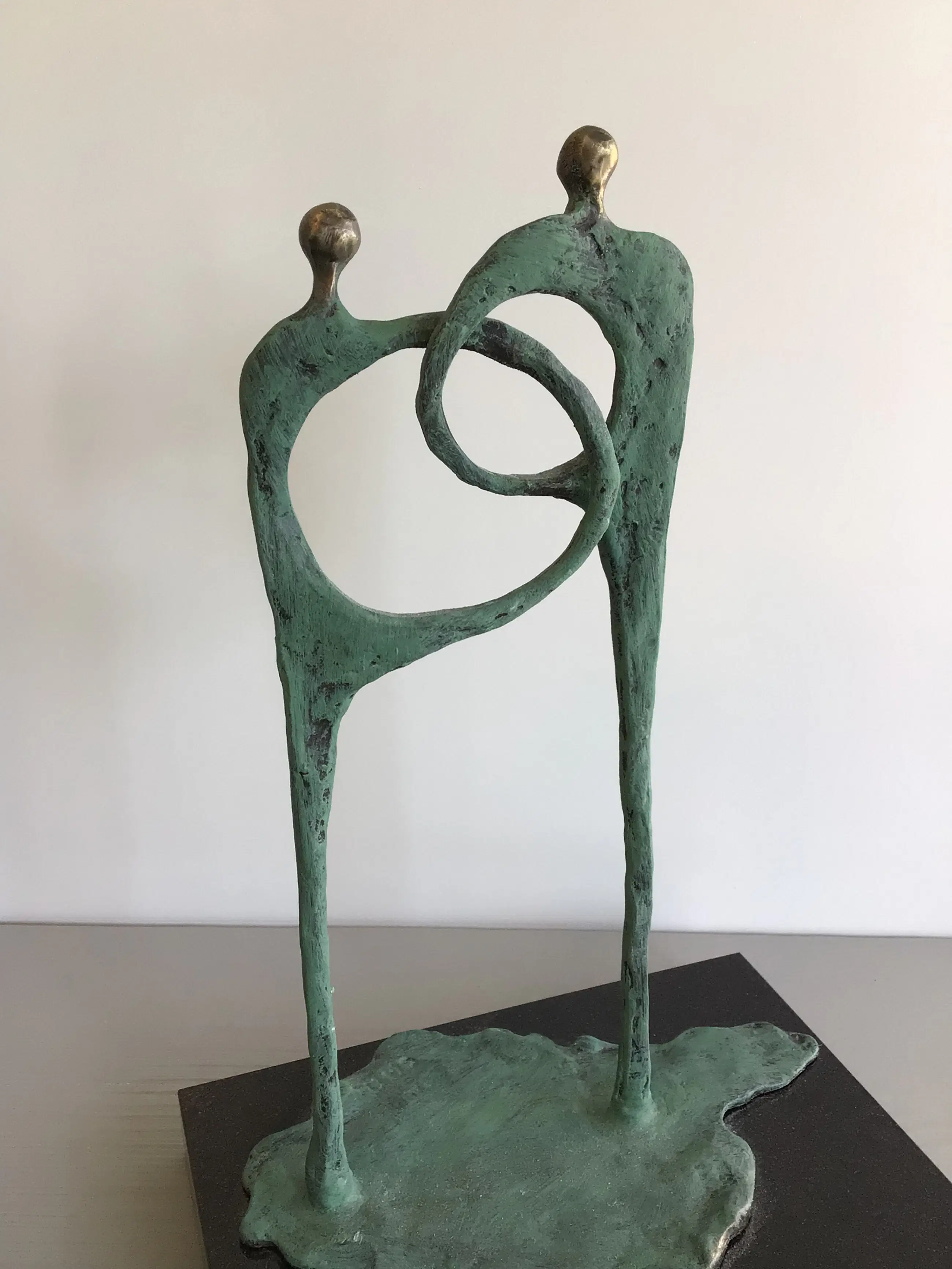 Zeer fraai vormgegeven en symbolisch sculptuur van twee mensfiguren die door middel van hun armen onlosmakelijk met elkaar zijn verbonden. Het beeld heeft een prachtig groen kleurig patina en is bevestigd op een fraaie zwart marmeren voet Titel “ De menselijke schakel “ Kunstenares: Corry Ammerlaan Op voet gesigneerd : CAN Materiaal: legering en marmer Wordt geleverd inclusief info kaartje met achtergrondgedachte van de kunstenares Het beeld verkeert in zeer goede staat en wordt zorgvuldig verpakt verzonden