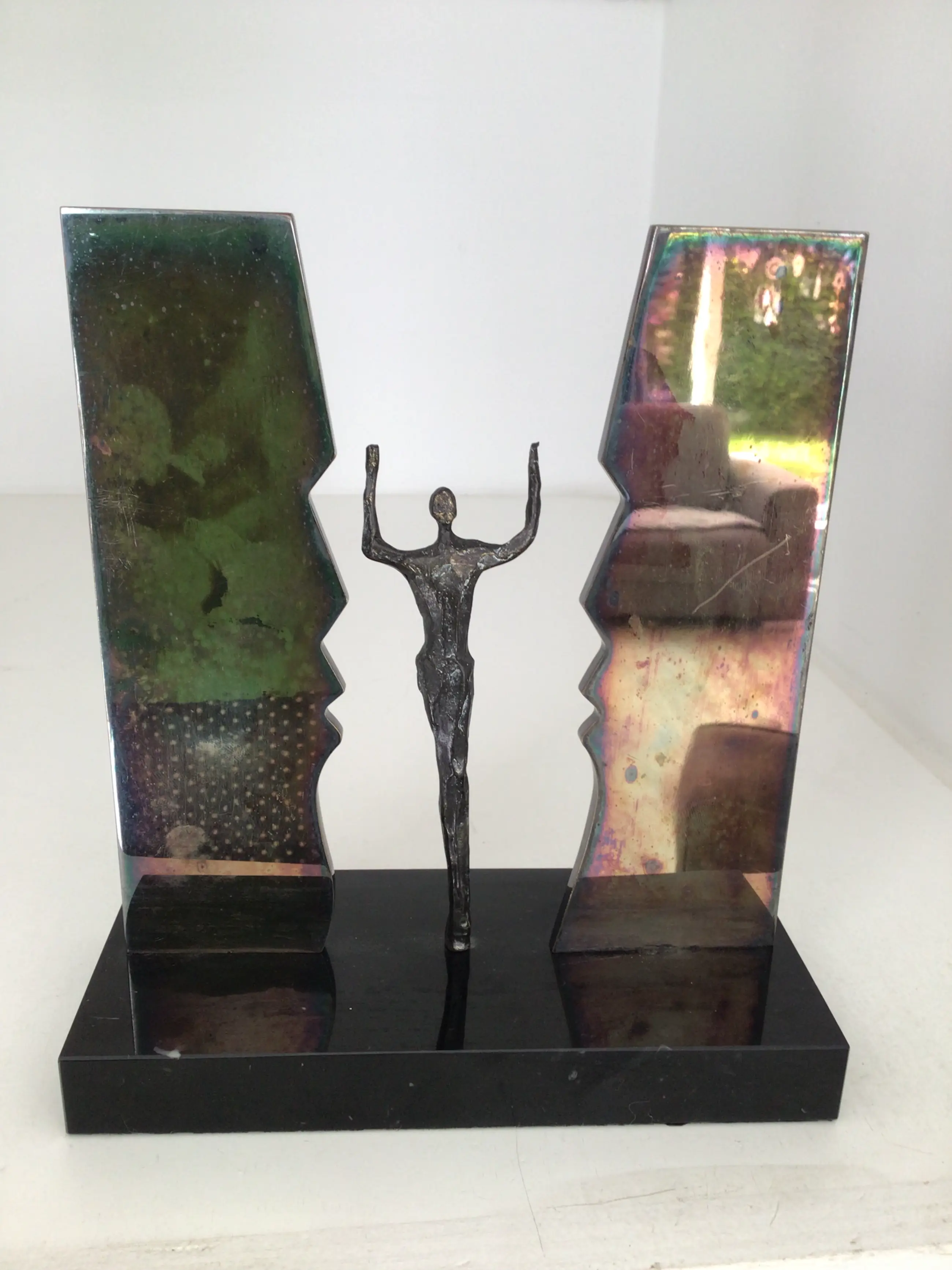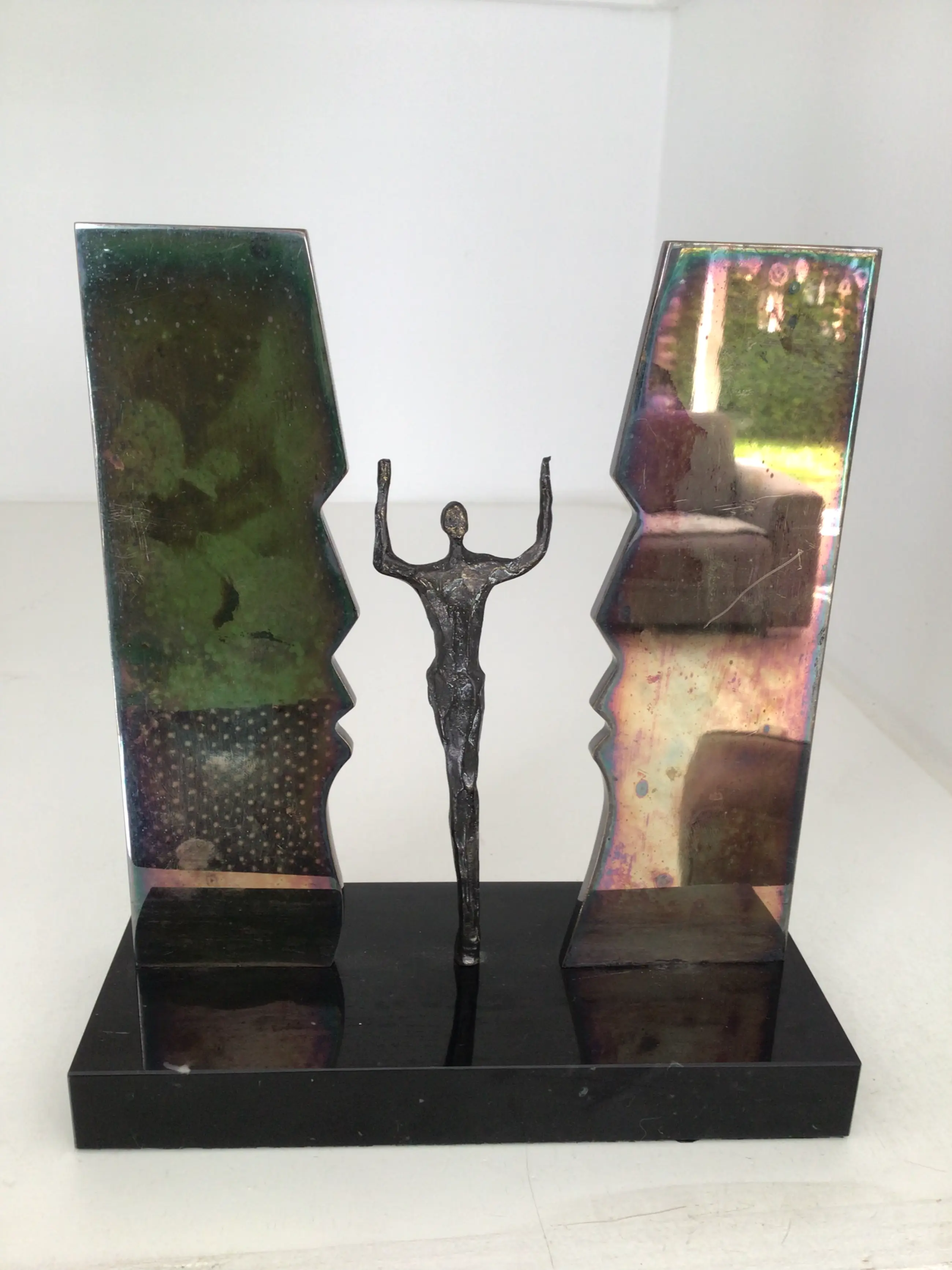 Zeer fraai , zeldzaam en symbolisch sculptuur van een mensfiguur met de armen in de lucht staande tussen twee “ spiegels “ in de vorm van gezichten, een zeer bijzonder exemplaar dat je niet vaak meer tegenkomt ! Kunstenares: Corry Ammerlaan Titel: “ De Overwinning “ Afmetingen: 20 x 16 cm Materiaal: Alloy en verzilverd metaal op fraaie zwart marmeren sokkel. Het beeld verkeert in goede staat en wordt zorgvuldig verpakt verzonden.