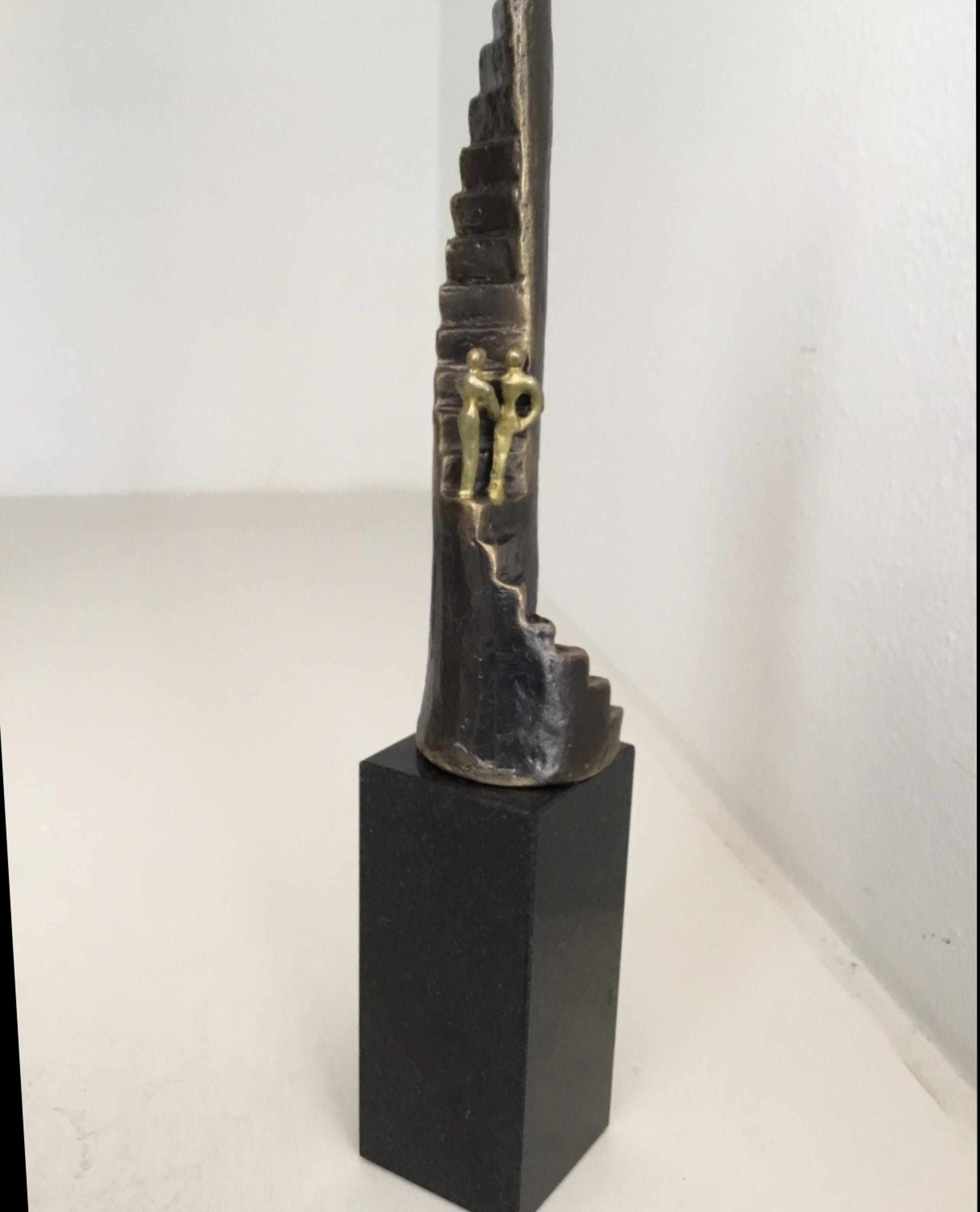 Mooi symbolisch sculptuur van een trap met daarop halverwege twee mensen die elkaar de hand schudden, op naar een nieuwe uitdaging, succes gewenst! Kunstenares: Corry Ammerlaan Hoogte : 20 cm Materiaal: Alloy op marmeren voet. Wordt geleverd inclusief originele verpakking. Het sculptuur verkeert in zeer goede staat en wordt zorgvuldig verpakt en aangetekend verzonden.
