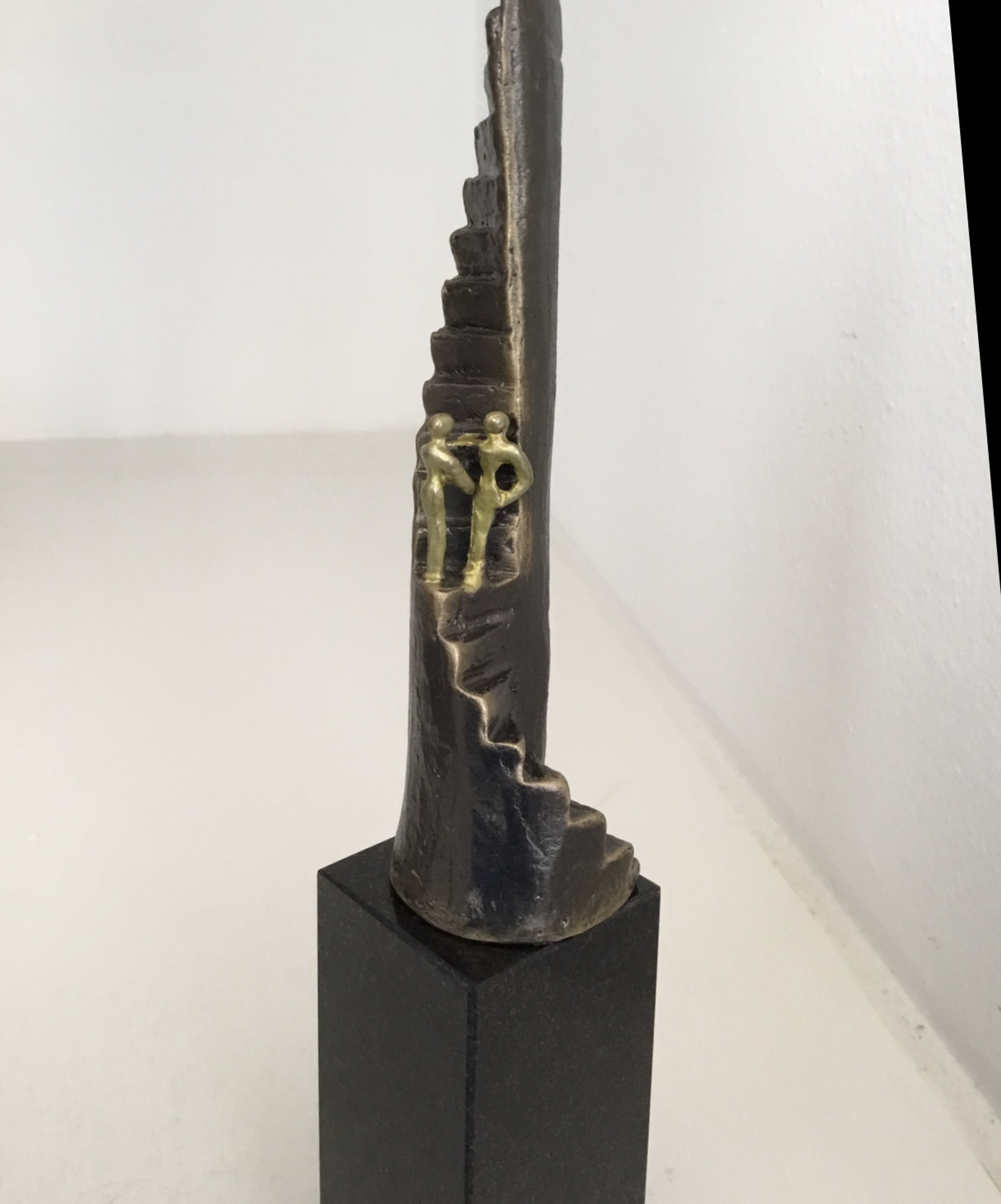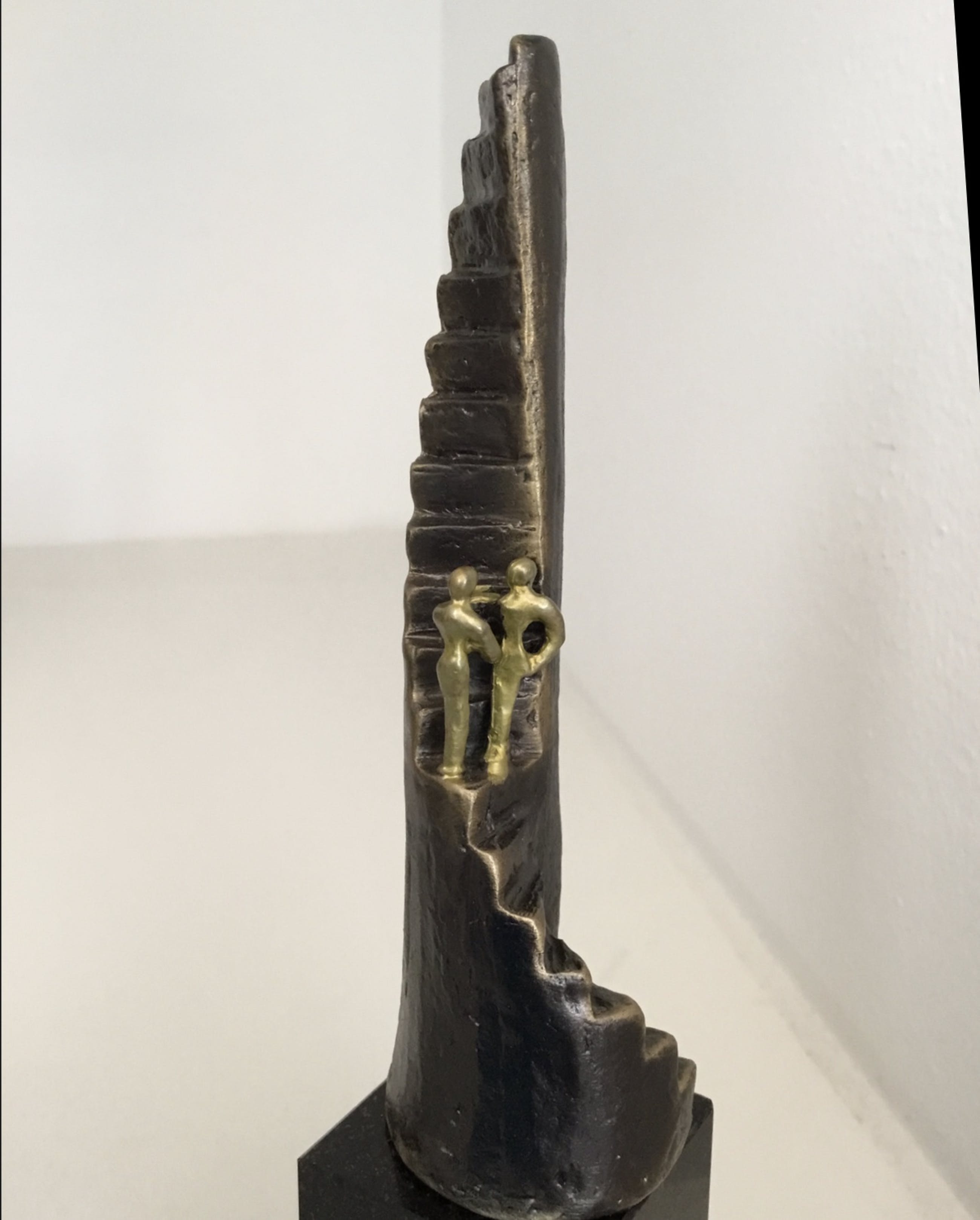 Mooi symbolisch sculptuur van een trap met daarop halverwege twee mensen die elkaar de hand schudden, op naar een nieuwe uitdaging, succes gewenst! Kunstenares: Corry Ammerlaan Hoogte : 20 cm Materiaal: Alloy op marmeren voet. Wordt geleverd inclusief originele verpakking. Het sculptuur verkeert in zeer goede staat en wordt zorgvuldig verpakt en aangetekend verzonden.