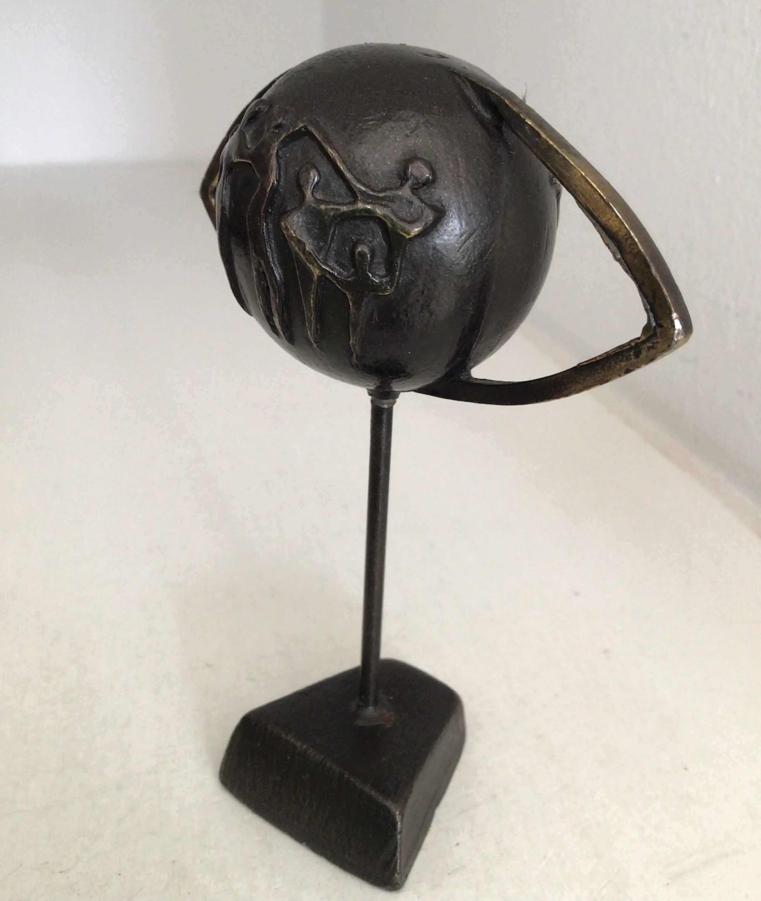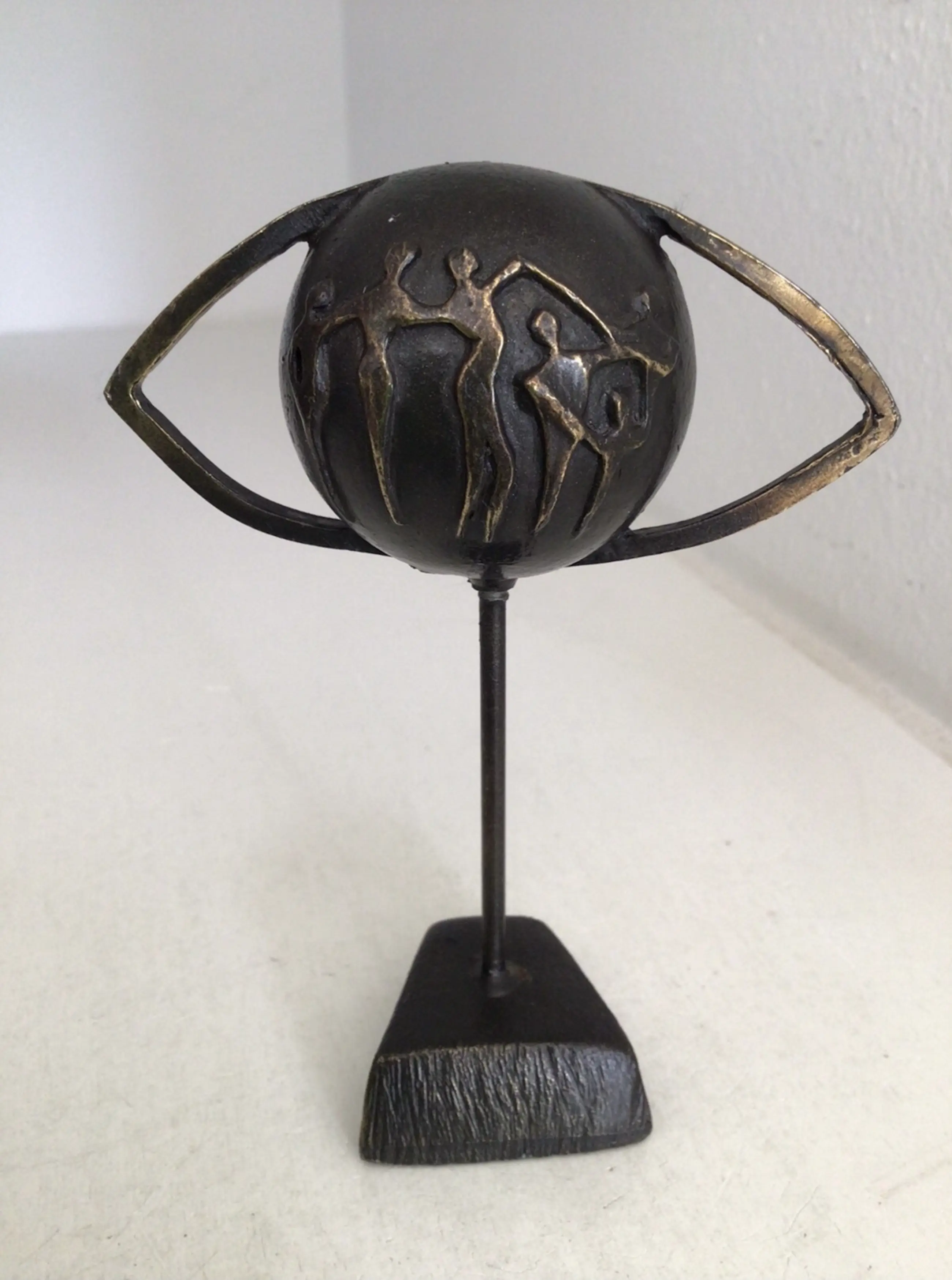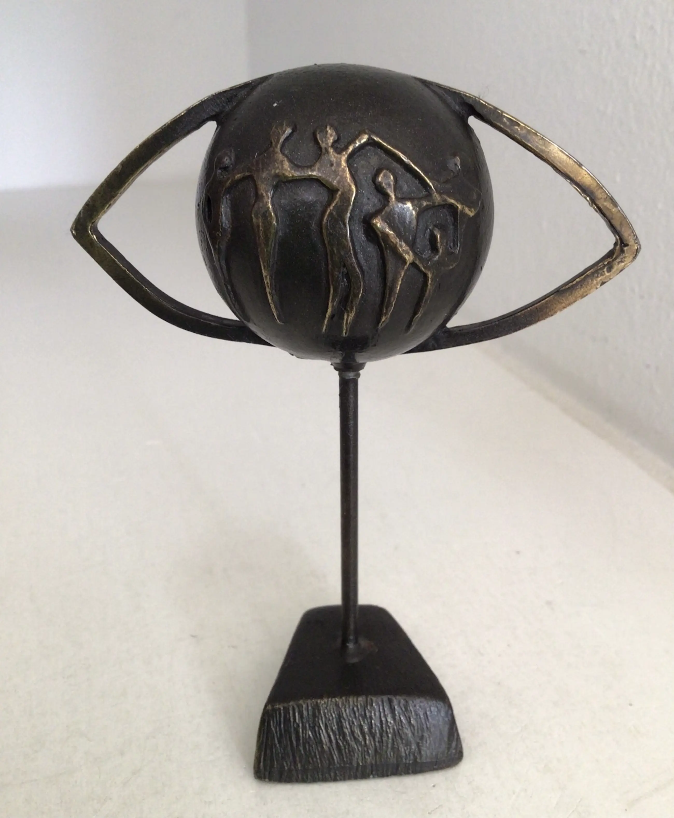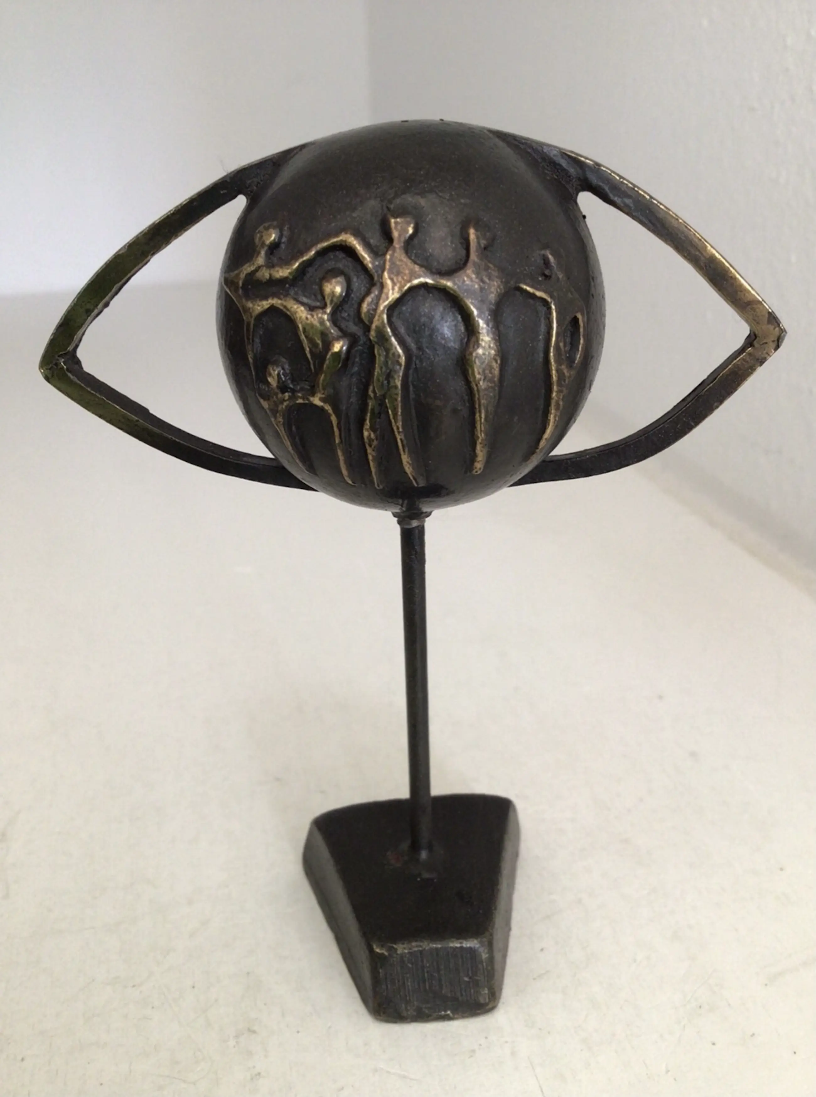 Zeer fraai en symbolisch sculptuur van een wereldbol in de vorm van een oog met daarop afbeeldingen van mensfiguren. Titel “ Door het oog van de wereld “ Kunstenares: Corry Ammerlaan Hoogte: 11 cm Materiaal: Alloy Het beeld verkeert in goede staat en wordt zorgvuldig verpakt verzonden.