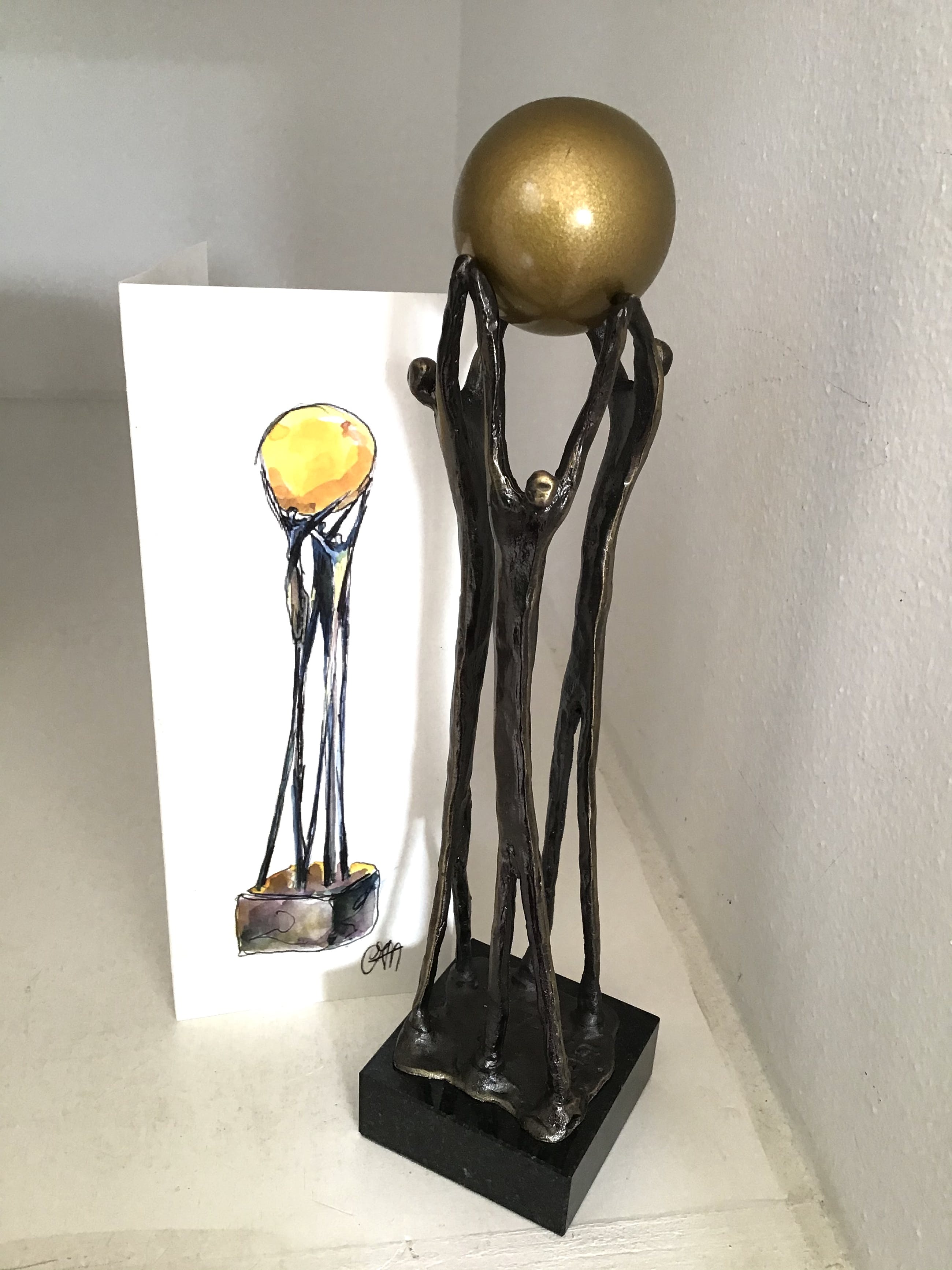 Zeer fraai sculptuur van drie mensfiguren die samen een gouden bal in de lucht houden. Achtergrondgedachte “ Samen kunnen wij de wereld aan ! “ Kunstenares : Corry Ammerlaan Het beeld is gesigneerd op voet : CAN Titel “ Gebundelde samenwerking “ Hoogte : 23 cm Materiaal: Alloy op marmeren voet. Wordt geleverd inclusief originele verpakking Het beeld verkeert in nieuwstaat en wordt zorgvuldig verpakt en aangetekend verzonden.