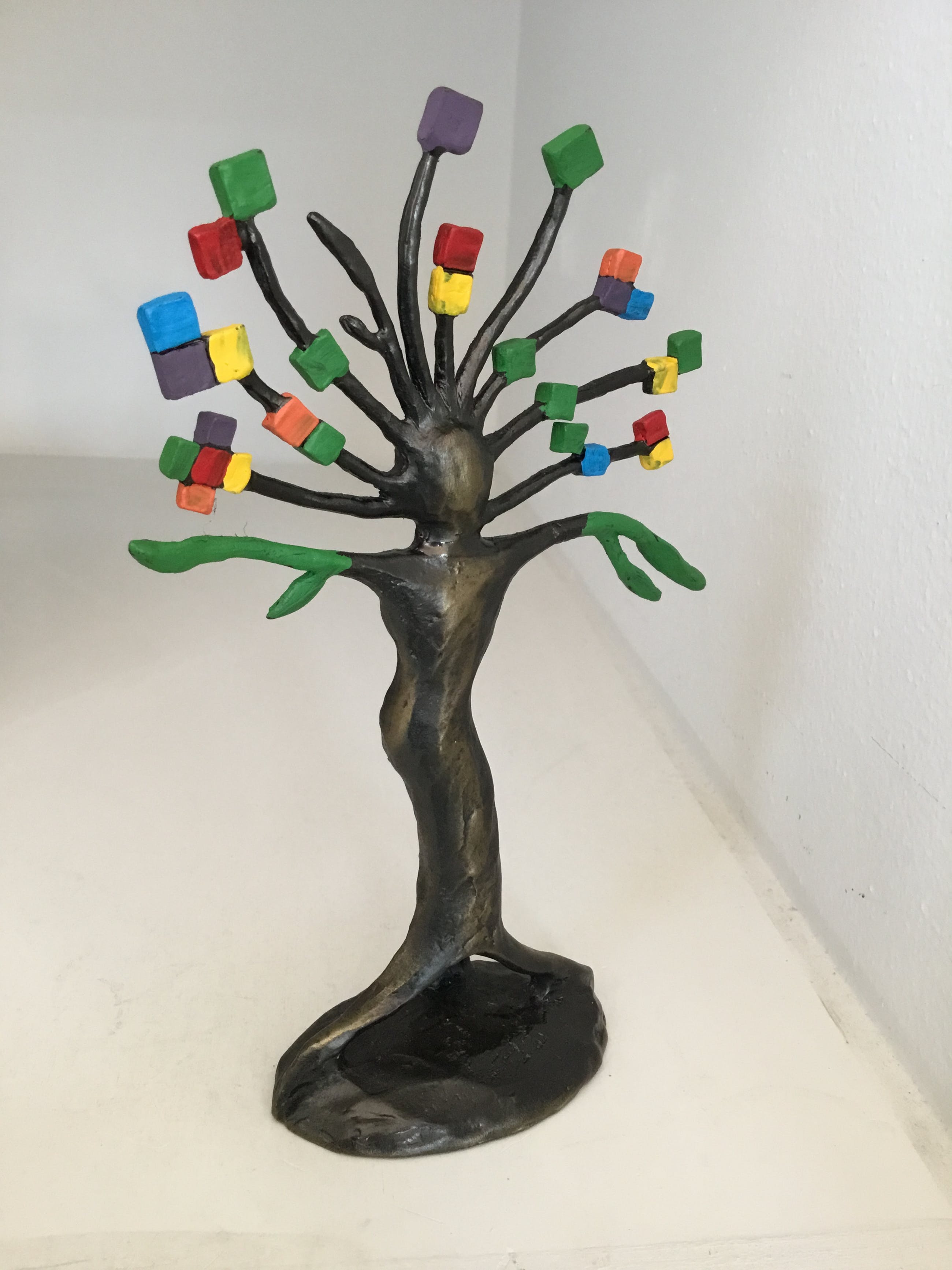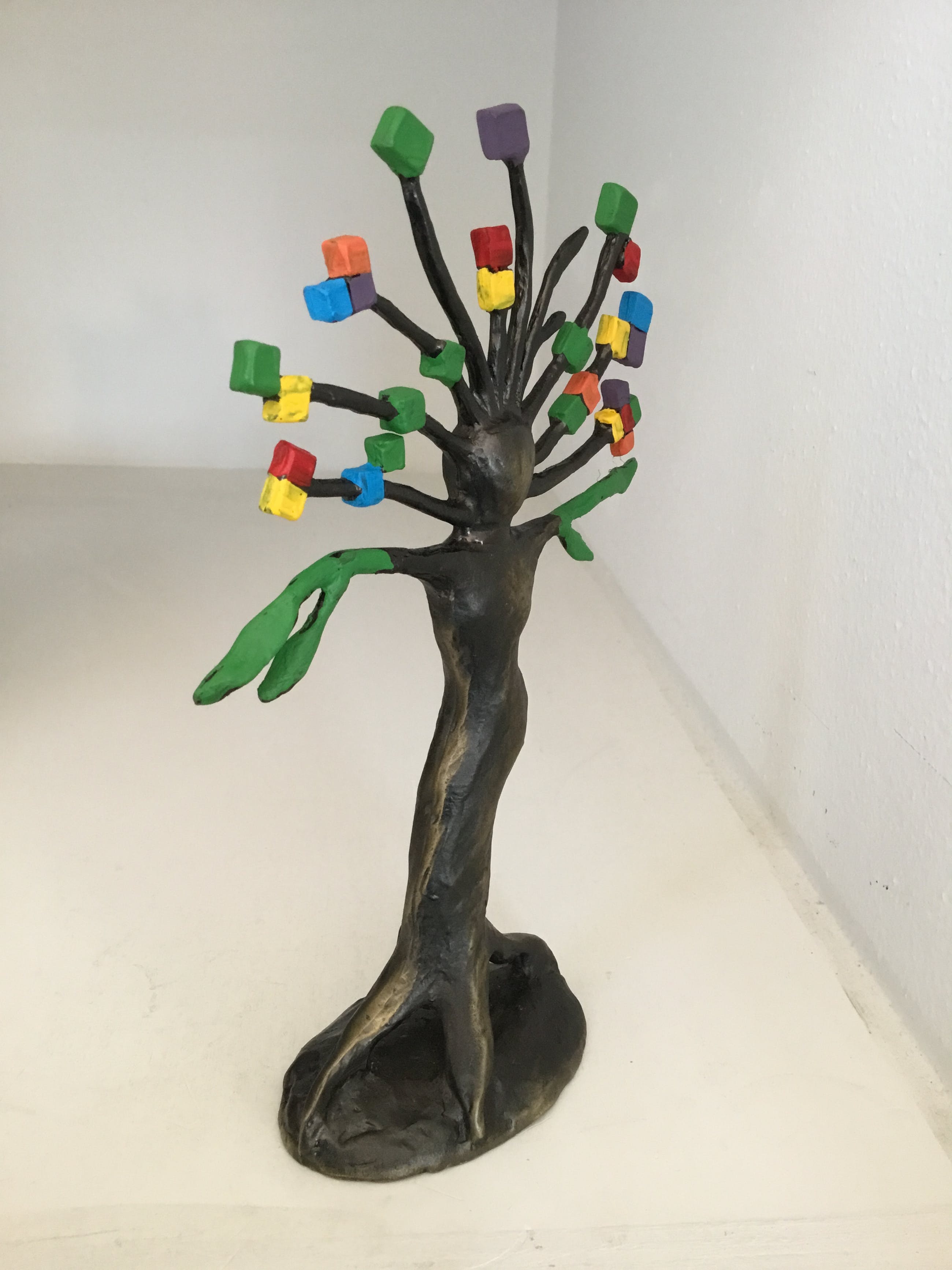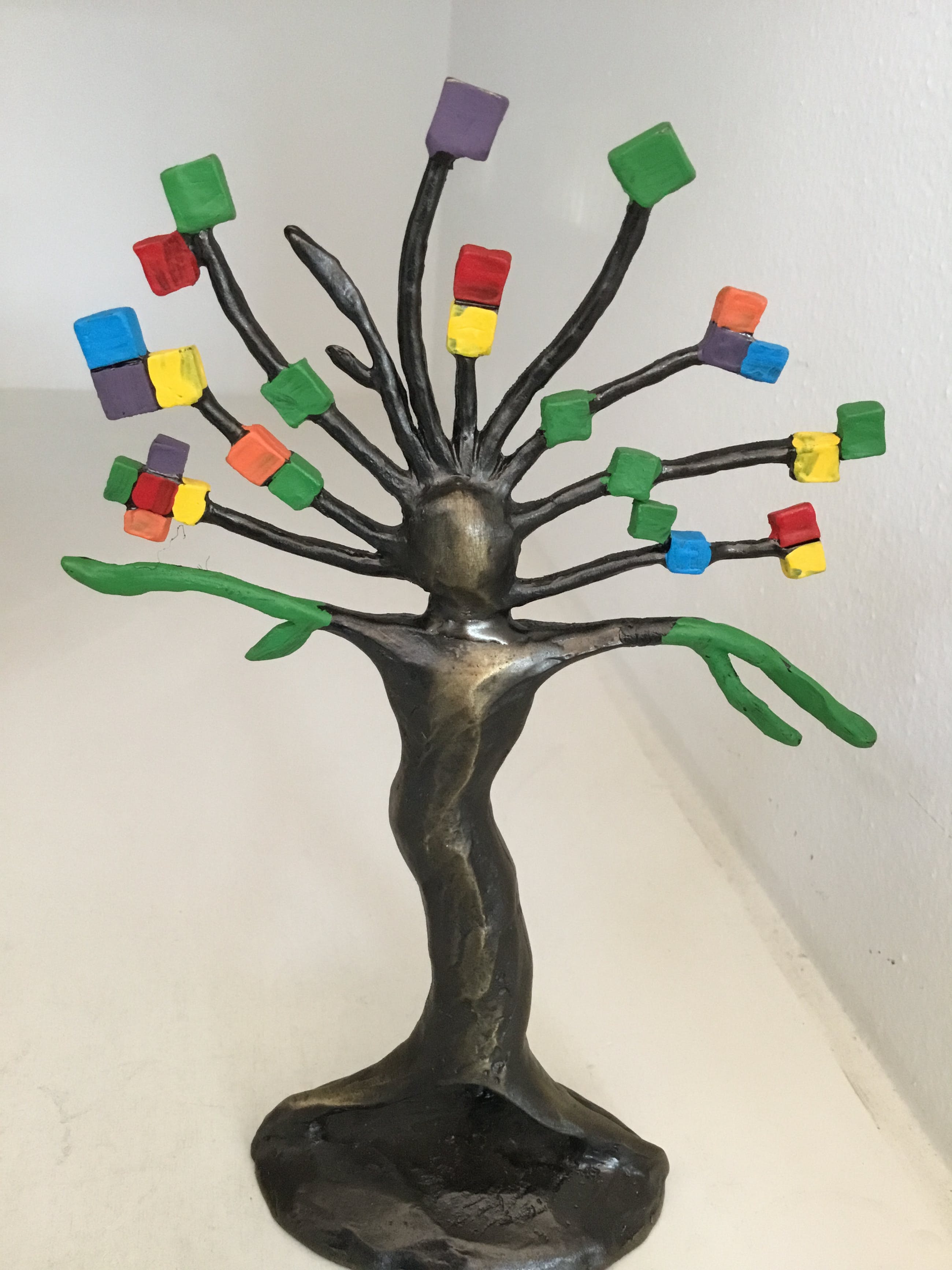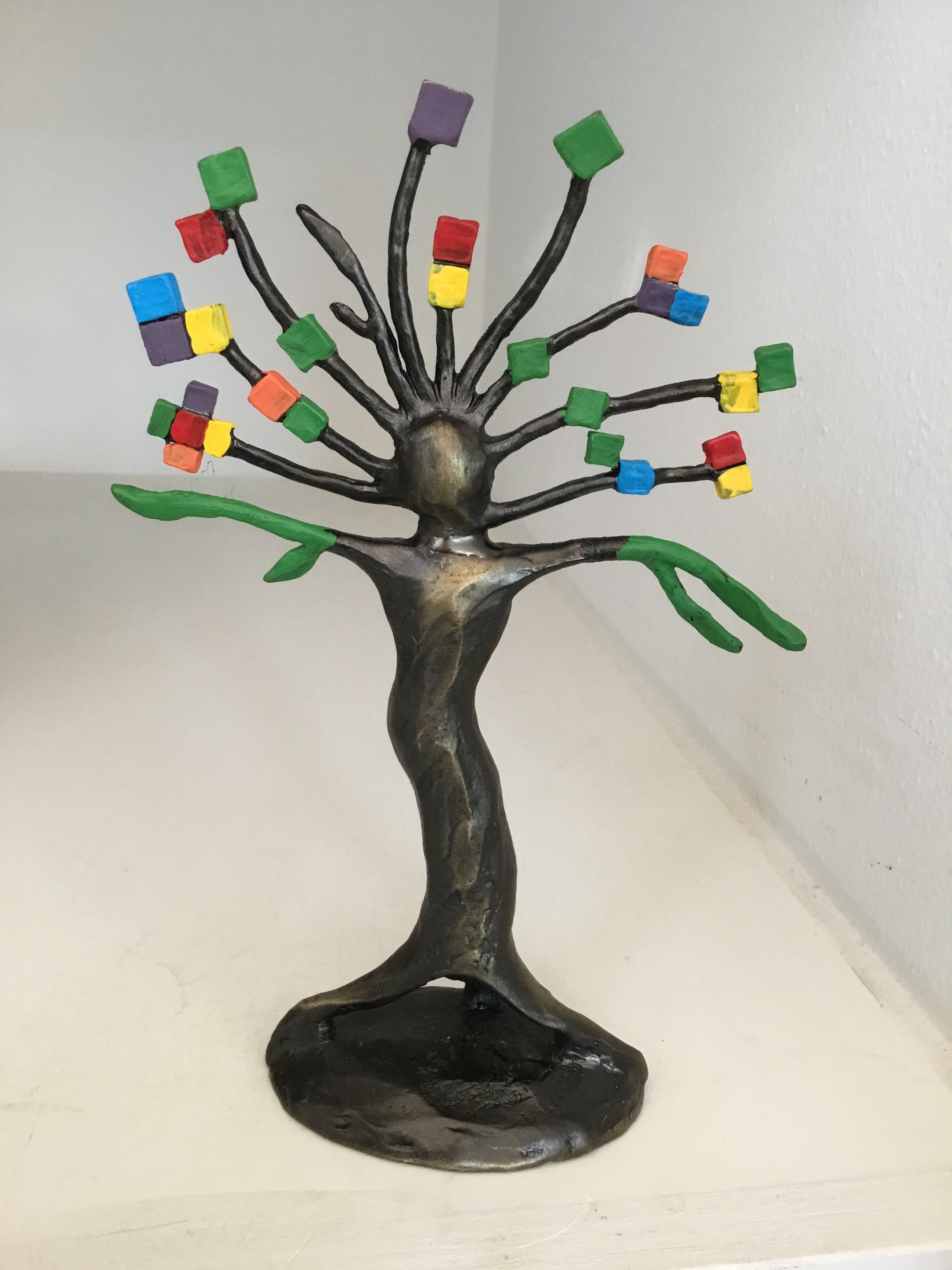 Prachtig kleurrijk sculptuur van een mensfiguur in de vorm van een boom met kleurrijke bladeren ! Titel “ Groei en bloei ! “ Kunstenares : Corry Ammerlaan Het sculptuur verkeert in zeer goede staat en wordt zorgvuldig verpakt en aangetekend verzonden .
