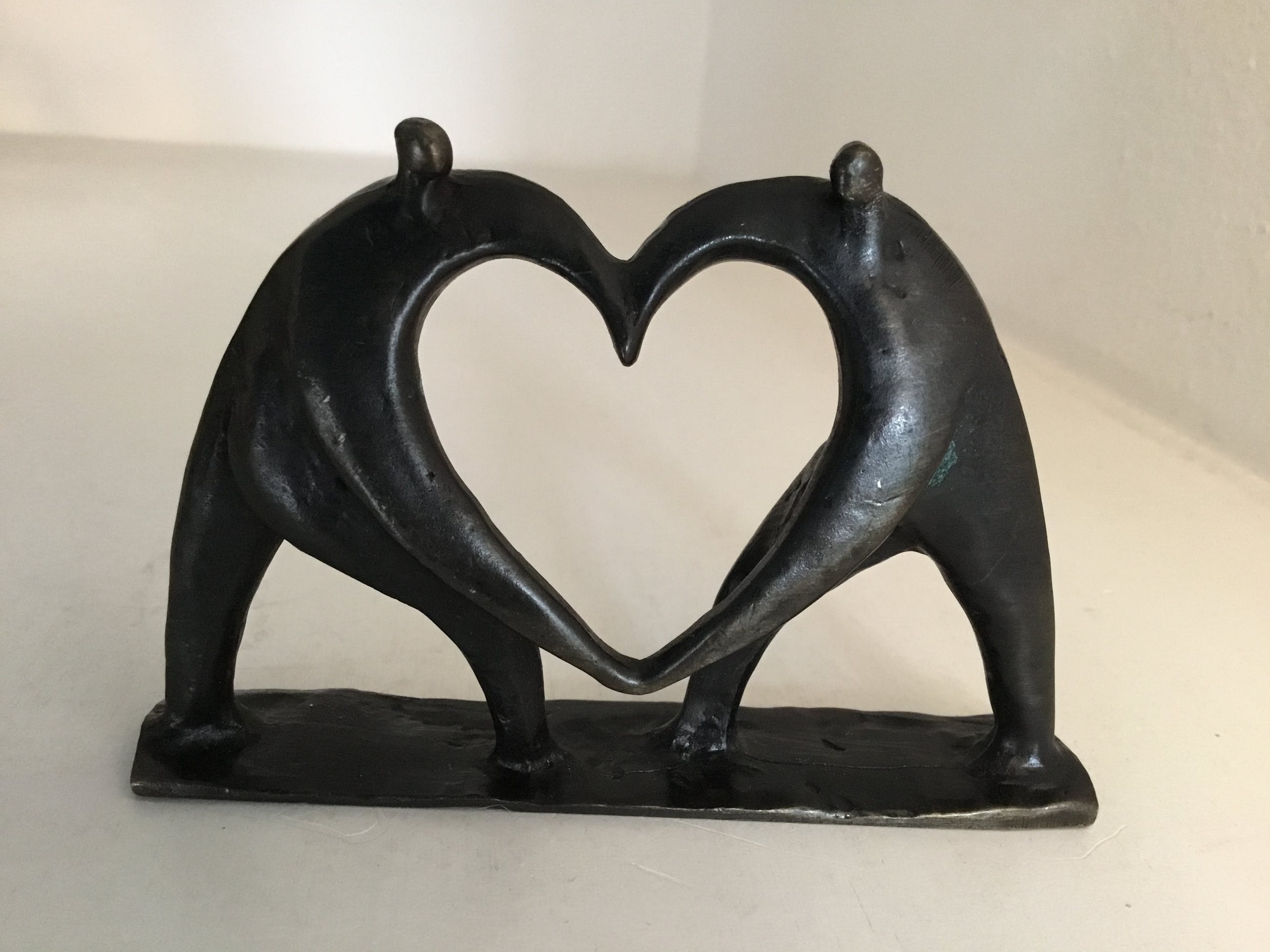 Mooi symbolisch sculptuur van twee mensfiguren die met hun armen samen een hart vormen. Titel “ Hart voor elkaar “ Kunstenares : Corry Ammerlaan Materiaal : brons Het sculptuur verkeert in goede staat en wordt zorgvuldig verpakt en aangetekend verzonden .