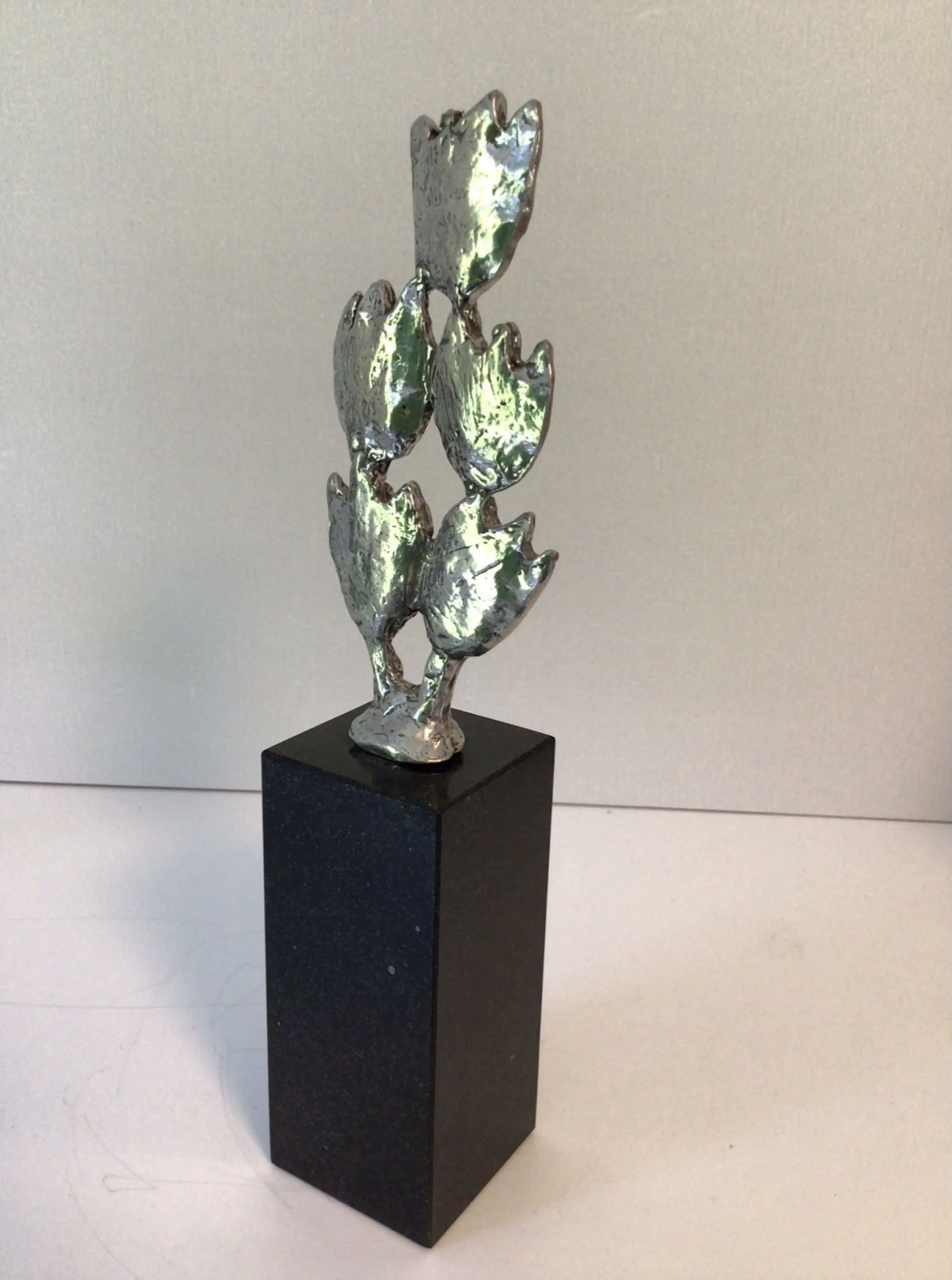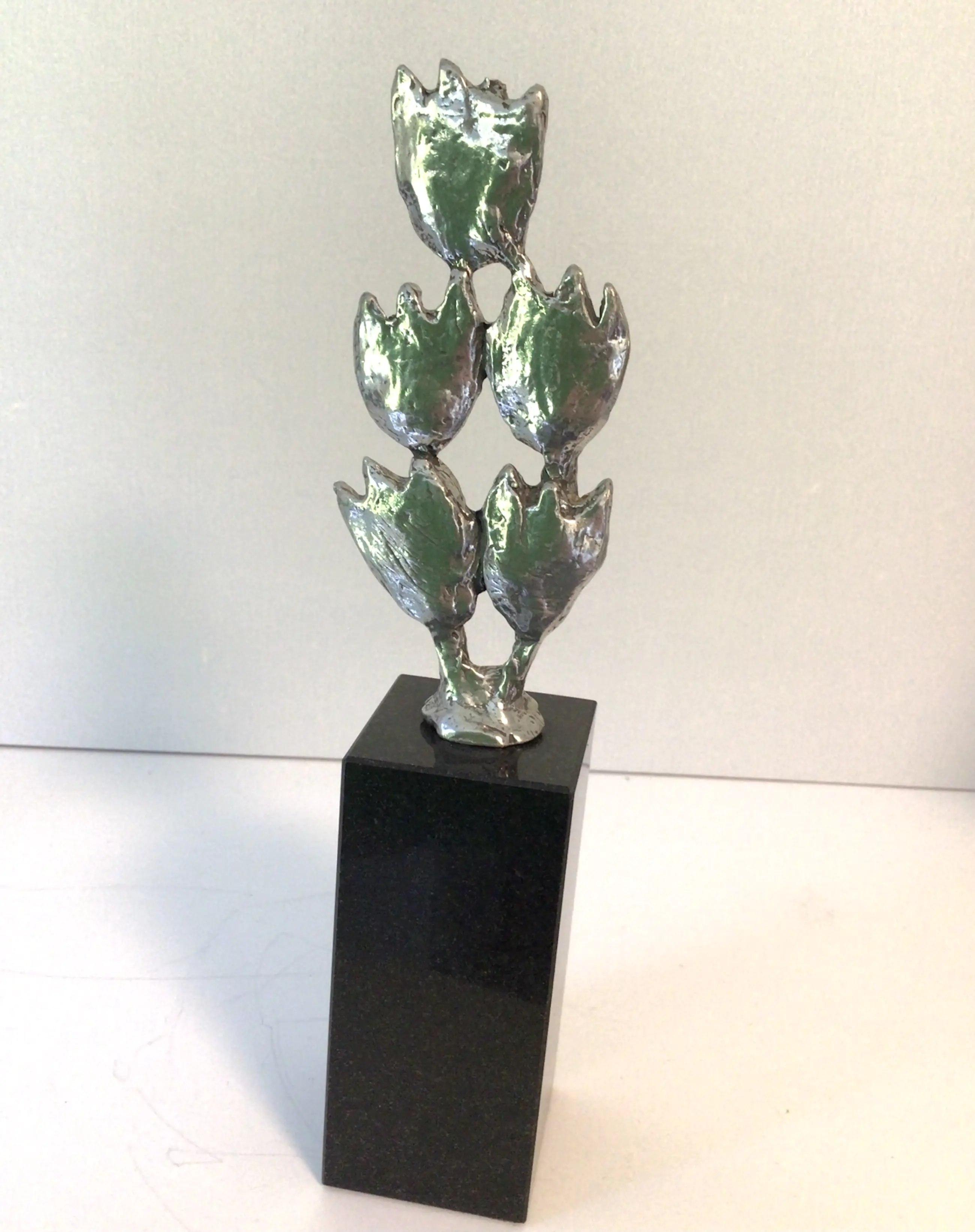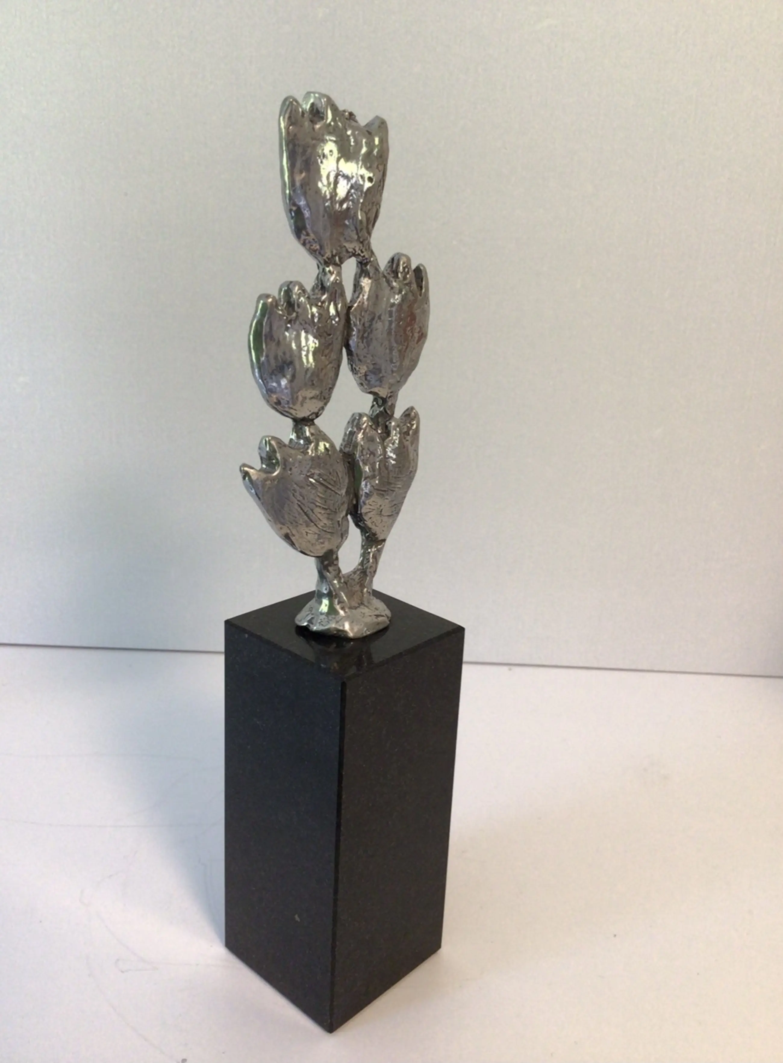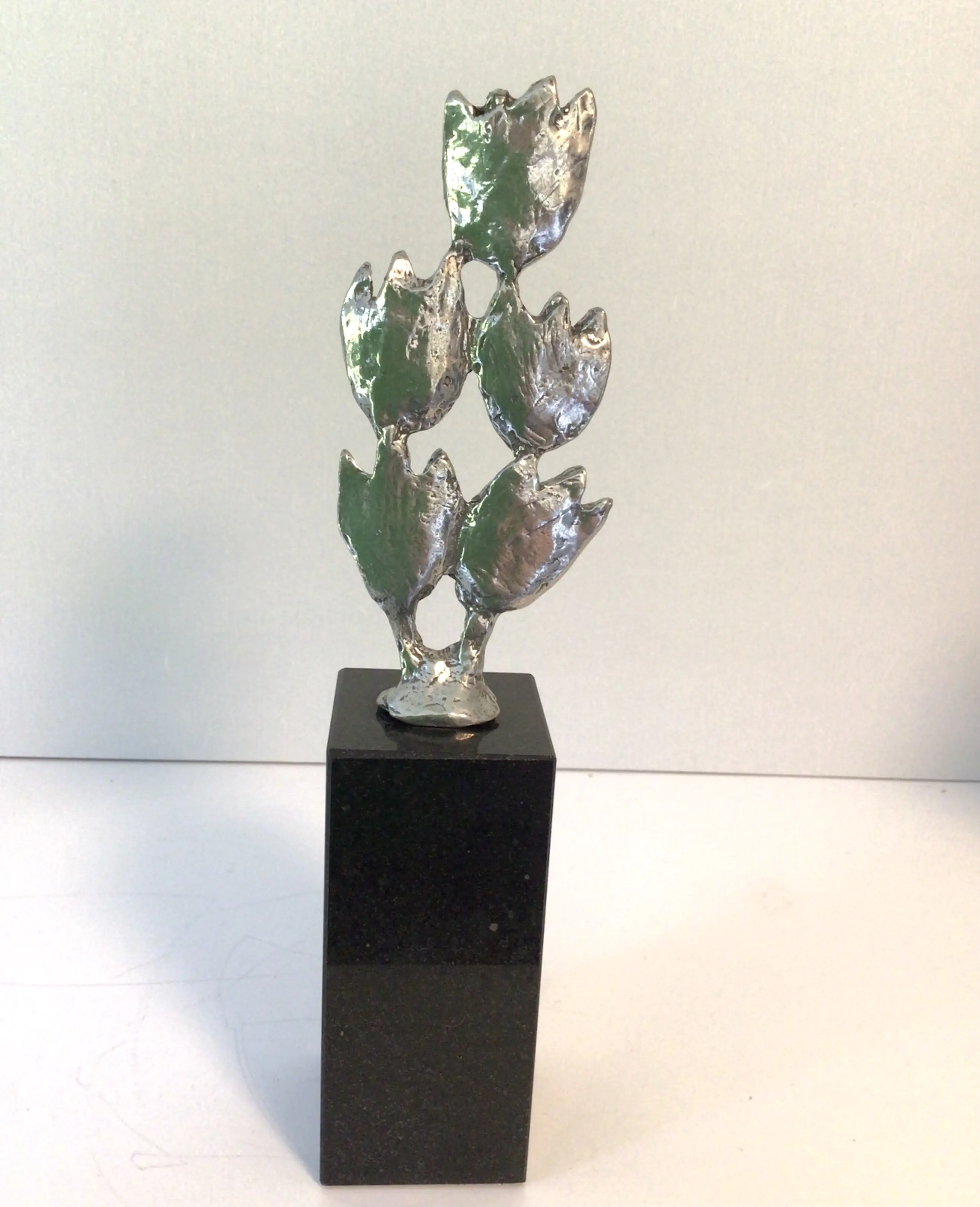 Zeer fraai en gedetailleerd uitgevoerd sculptuur van een vijftal zilverkleurige tulpen. Titel : “ Hollands Bloemenpracht “ Kunstenares: Corry Ammerlaan Hoogte : 17 cm Materiaal: verzilverd metaal op fraaie zwart marmeren sokkel. Het beeld verkeert in zeer goede staat en wordt zorgvuldig verpakt verzonden.