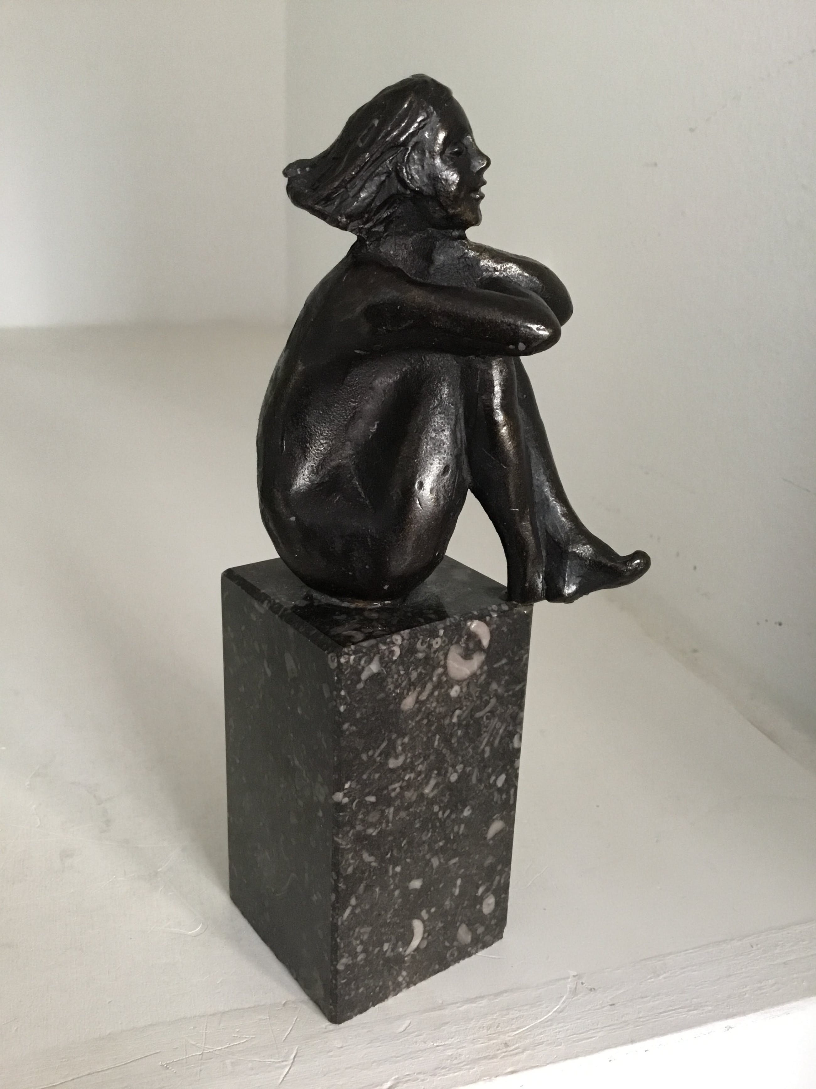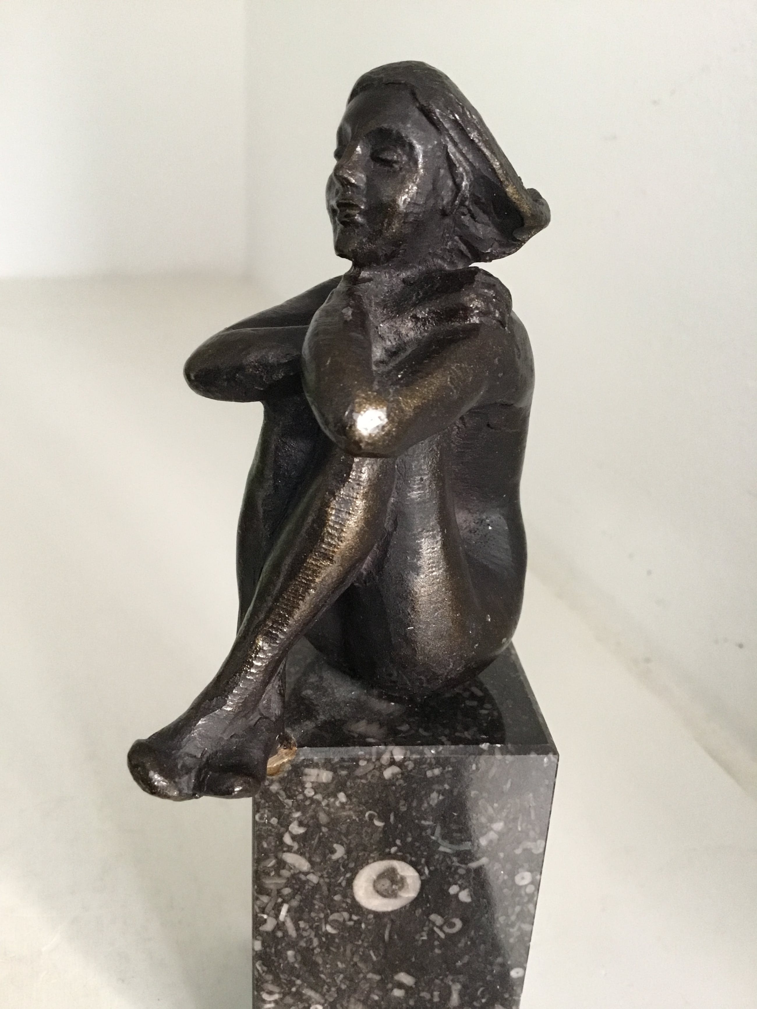 Mooi symbolisch sculptuur van een zittende vrouw verzonken in gedachten. Kunstenares ; Corry Ammerlaan Materiaal : verbronsd metaal op marmeren sokkel Hoogte : 15 cm Aan de voet van de sokkel mist een klein chipje, niet storend.. Verder verkeert het beeld in goede staat en wordt het zorgvuldig verpakt en aangetekend verzonden .