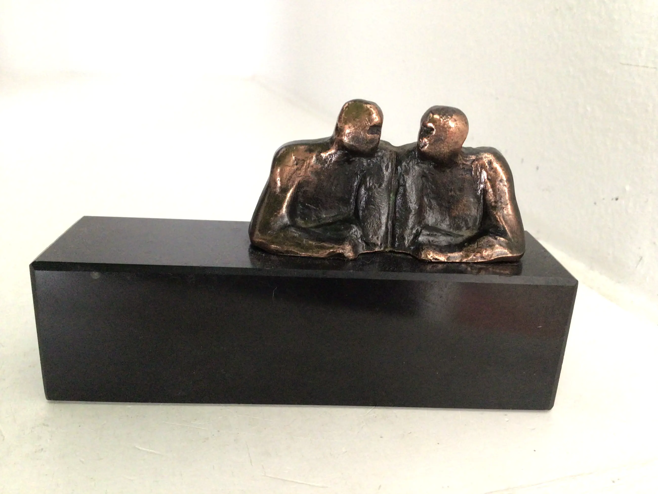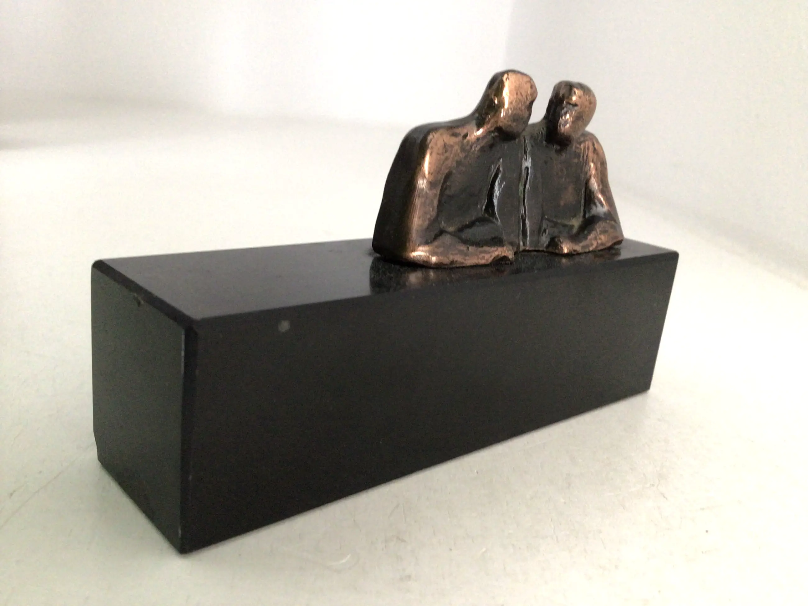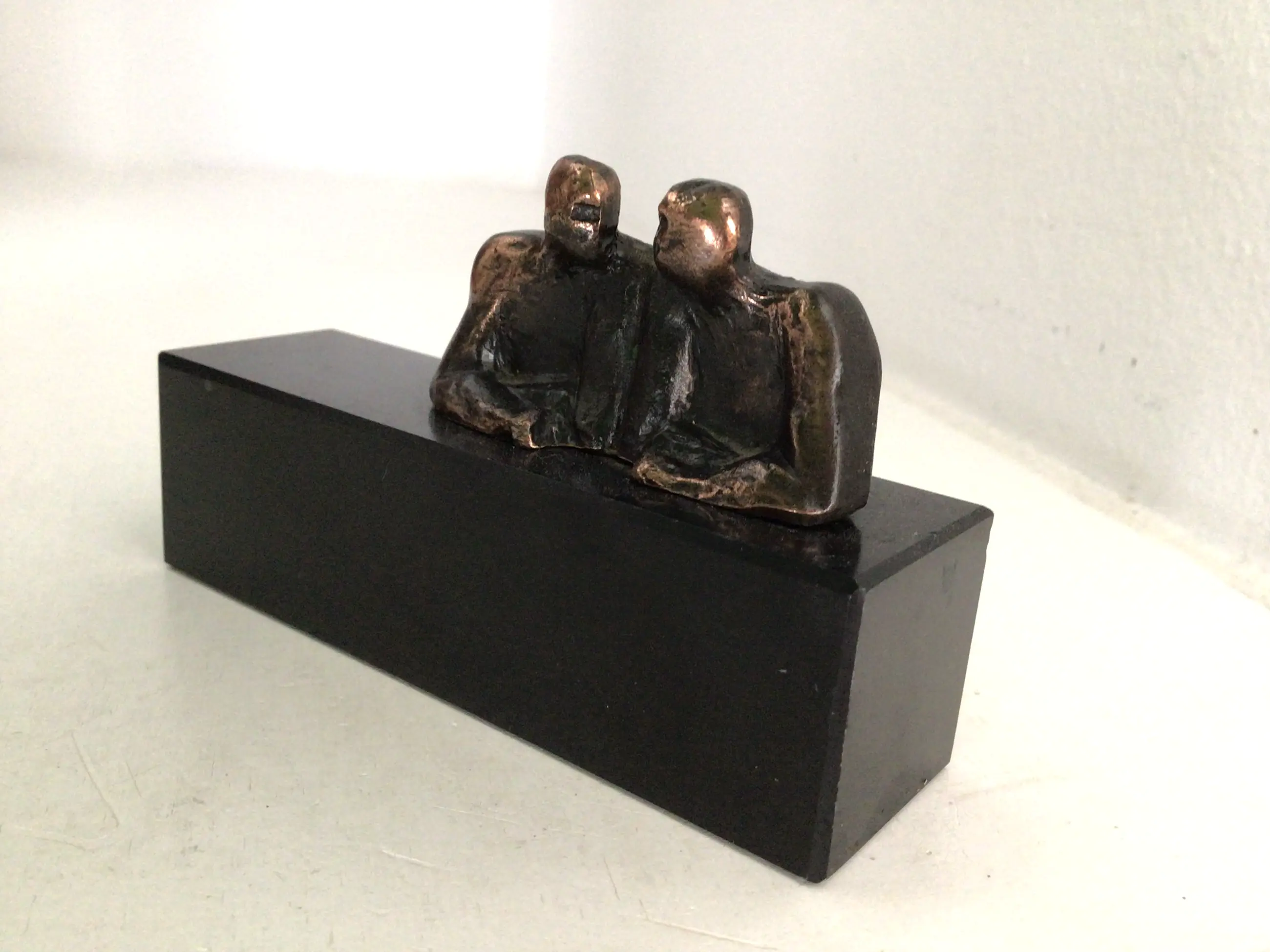 Fraai en symbolisch uitgevoerd sculptuur van twee mensfiguren in een diepgaand gesprek Titel “ In overleg “ Kunstenares: Corry Ammerlaan Afmetingen: 6 x 10 cm Materiaal: Alloy op zwart marmeren sokkel Het beeld verkeert in goede staat en wordt zorgvuldig verpakt en aangetekend verzonden.