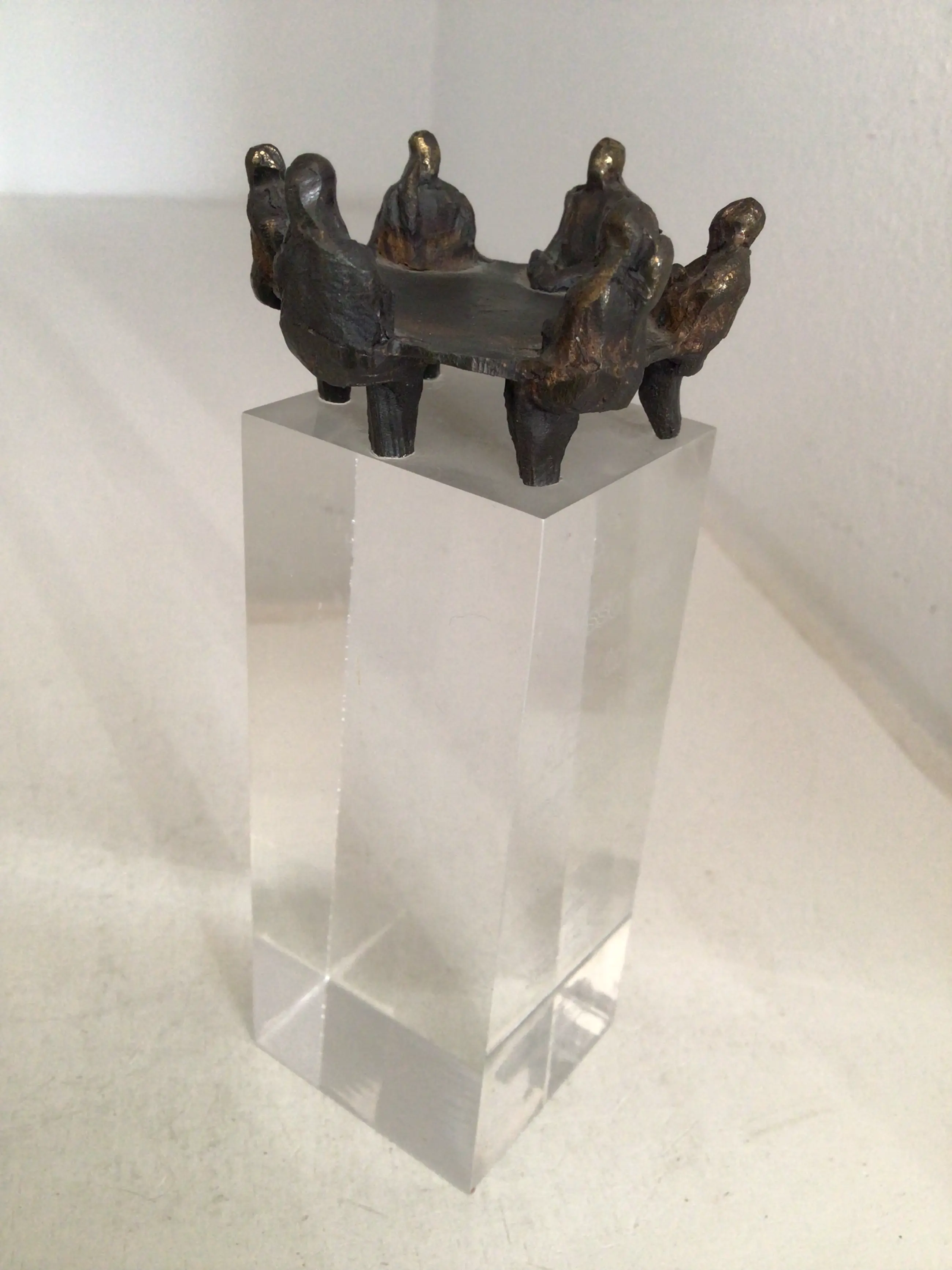 Fraai gedetailleerd uitgevoerd sculptuur van een zestal mensfiguren zittend rondom een tafel Titel “ In Overleg “ Kunstenares : Corry Ammerlaan Hoogte : 12 cm Materiaal: Alloy op kunststof sokkel Het beeld verkeert in goede staat en wordt goed verpakt verzonden.