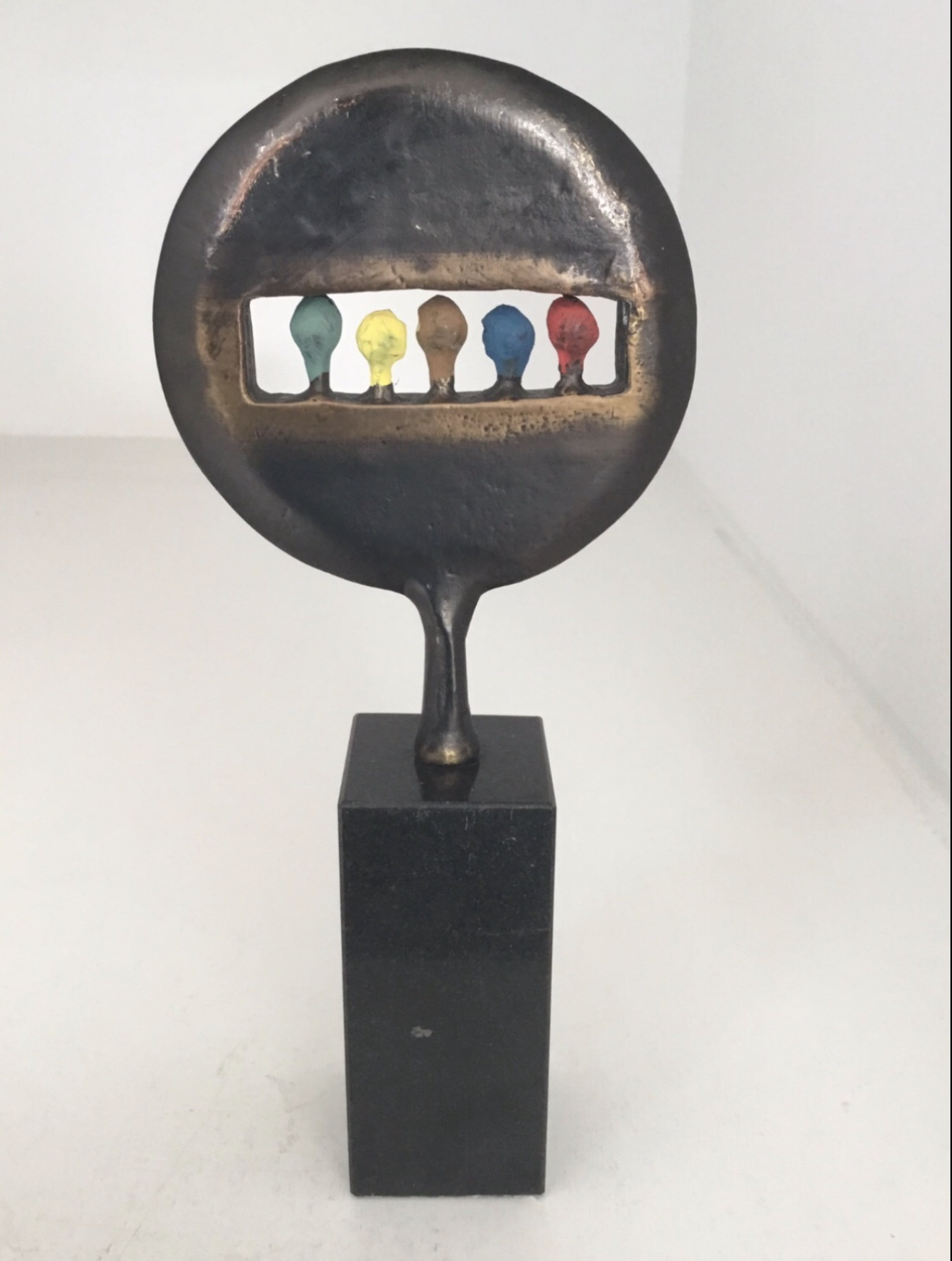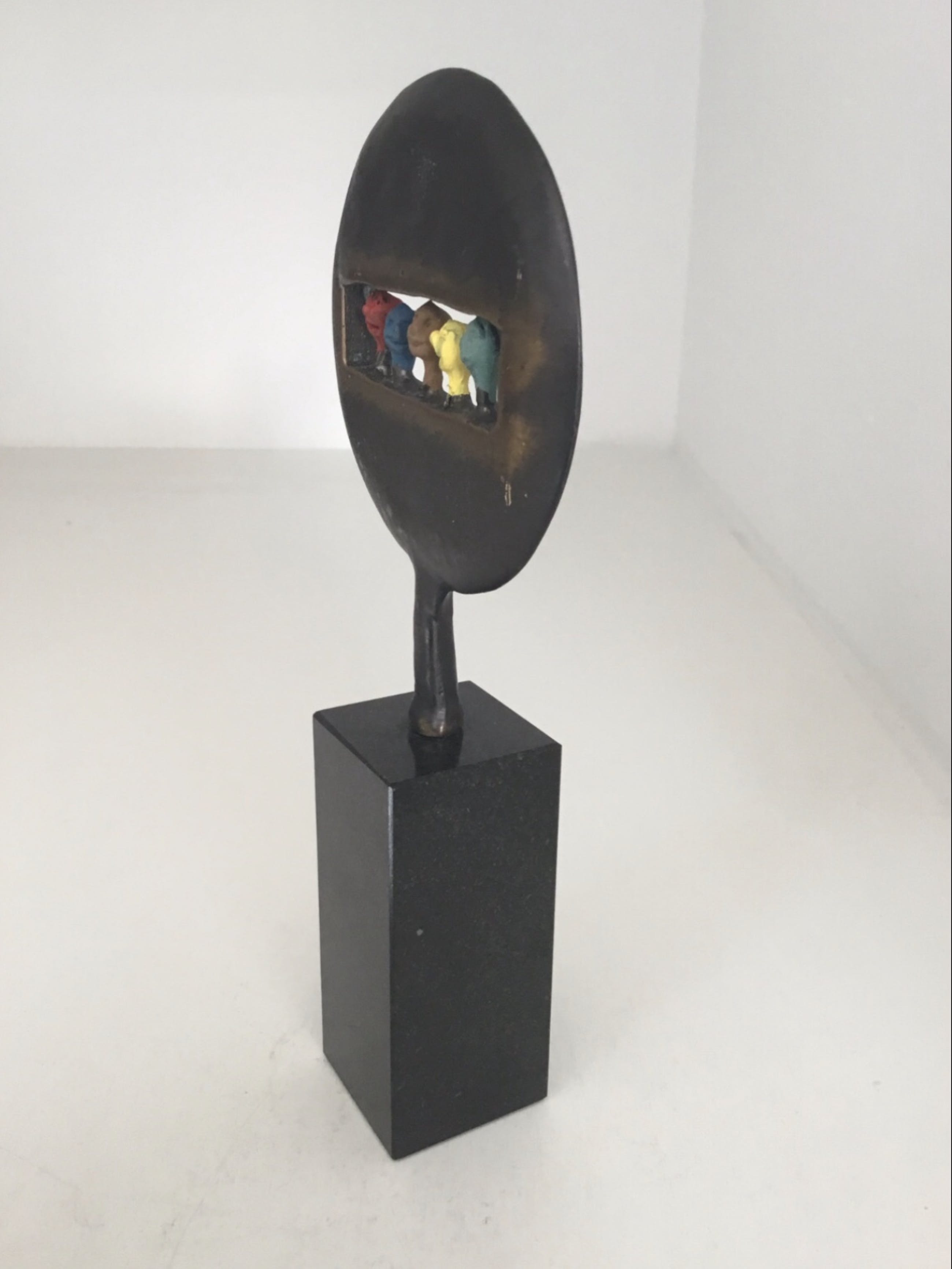 Mooi symbolisch sculptuur van gekleurde gezichten kijkend vanachter een “ venster “ naar wat gaat komen. Titel “ Kijk naar de toekomst ! “ Hoogte : 19 cm Materiaal : brons op marmeren sokkel Het sculptuur wordt geleverd in originele verpakking. Het verkeert in nieuwstaat en wordt zorgvuldig verpakt en aangetekend verzonden .