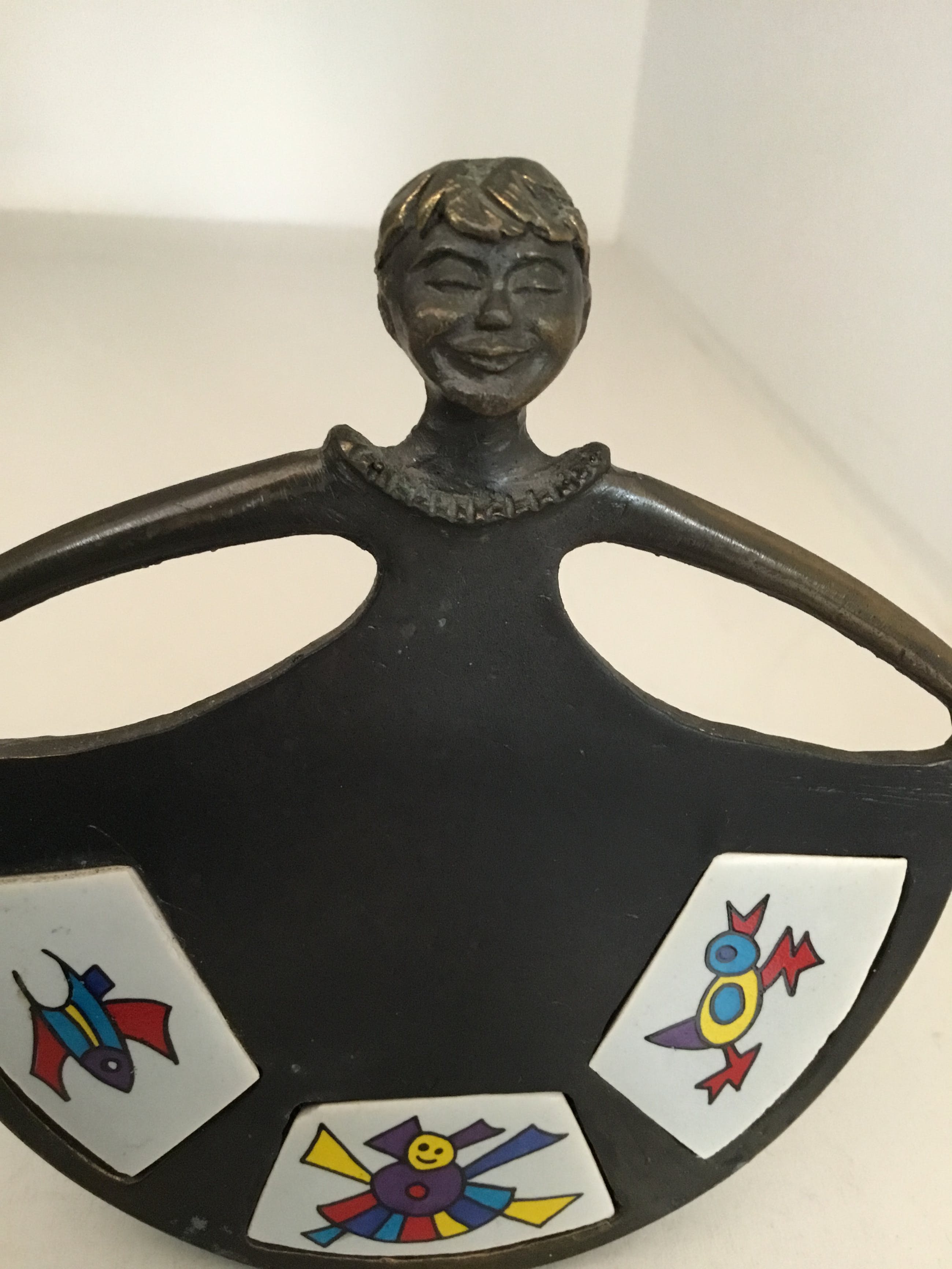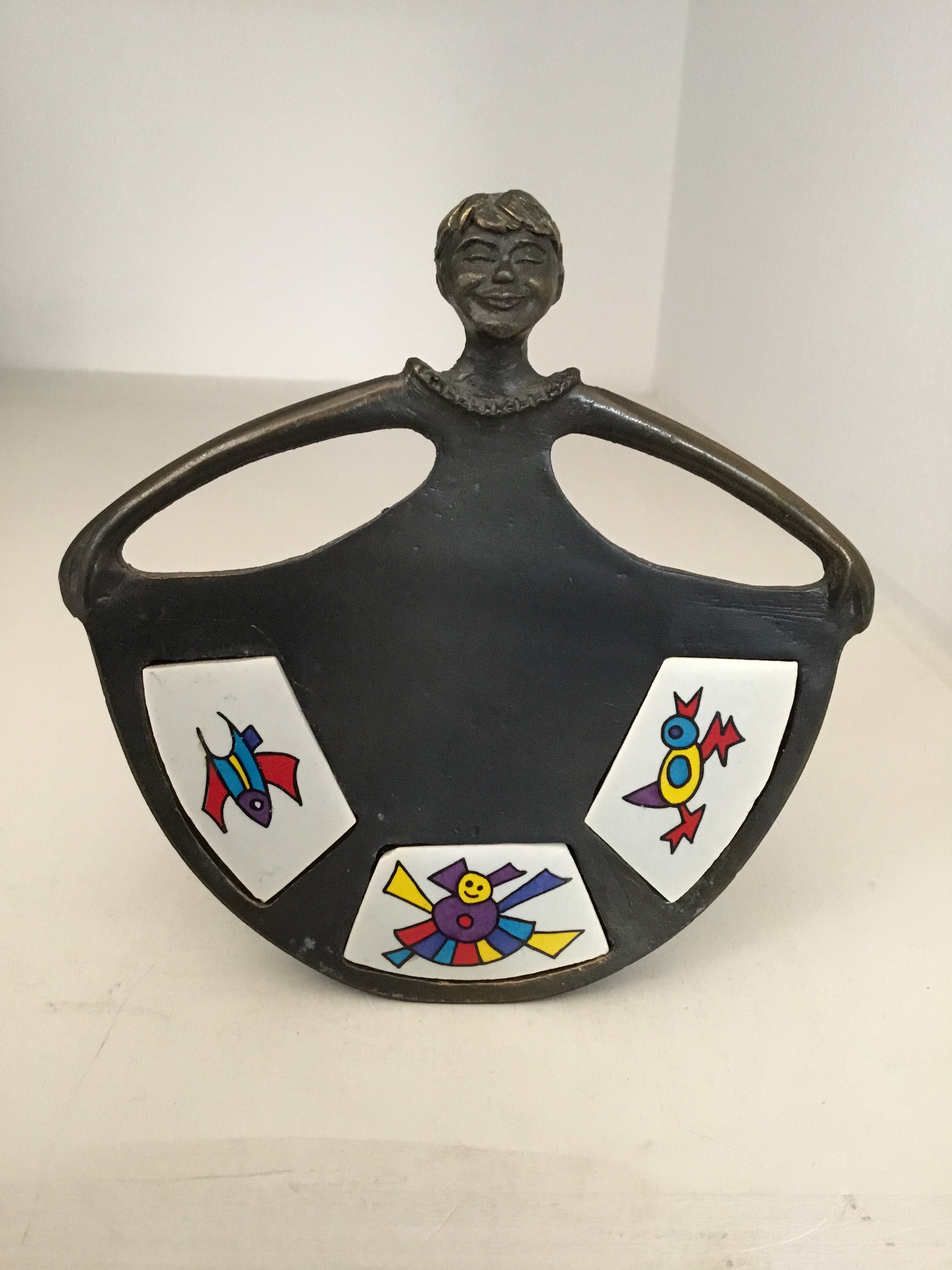 Bijzonder mooi en zeldzaam sculptuur van een meisje met een wijde rok waarop kleurige afbeeldingen staan van keramiek . Kunstenares : Corry Ammerlaan van Niekerk . Materiaal : brons en keramiek . Het sculptuur verkeert in goede staat en wordt zorgvuldig verpakt en aangetekend verzonden .