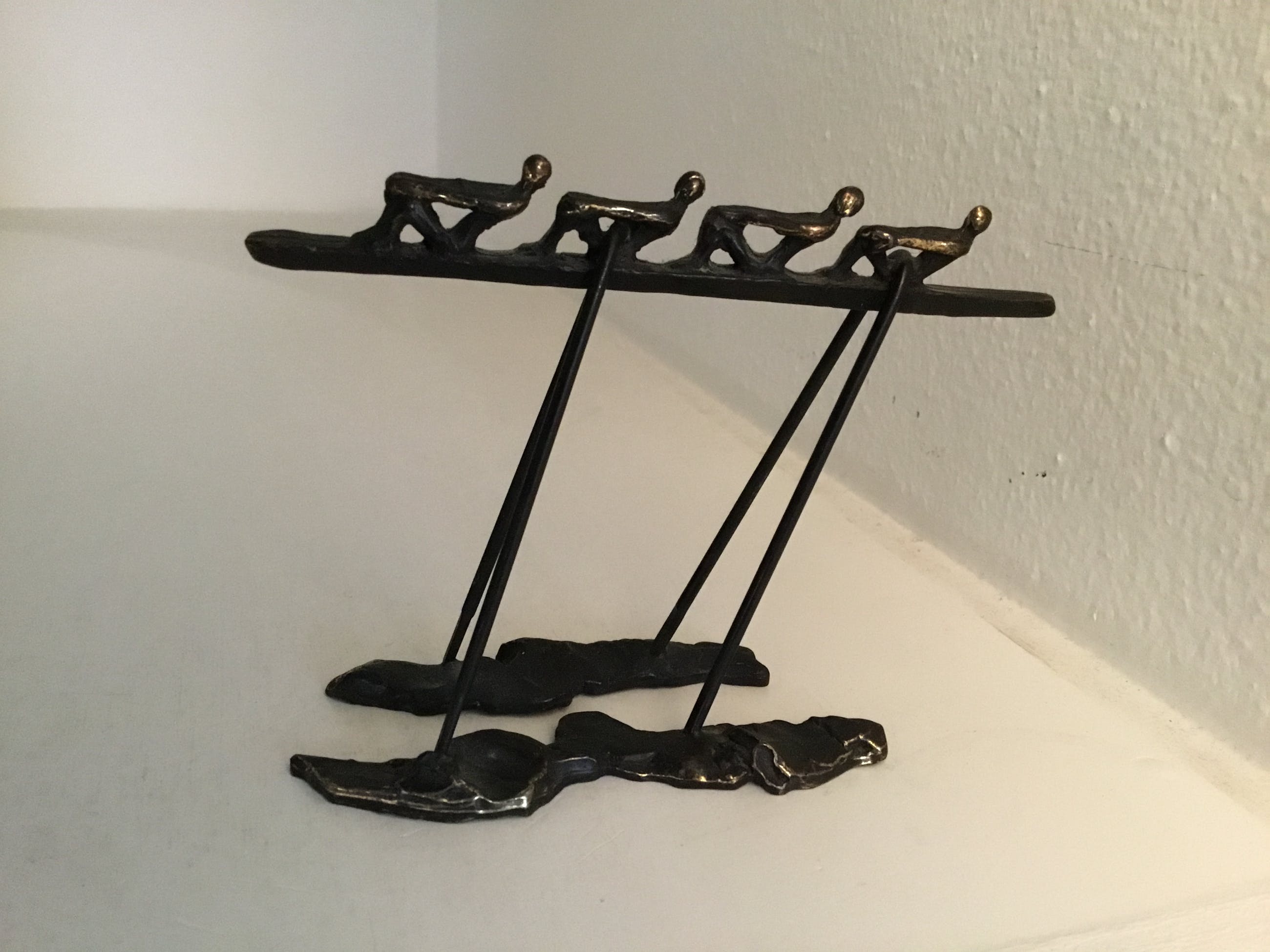 Prachtig dynamisch sculptuur van vier roeiende mensfiguren - met vereende kracht voor uit ! Kunstenares : Corry Ammerlaan Materiaal : verbronsd metaal Het sculptuur verkeert in goede staat en wordt zorgvuldig verpakt en aangetekend verzonden