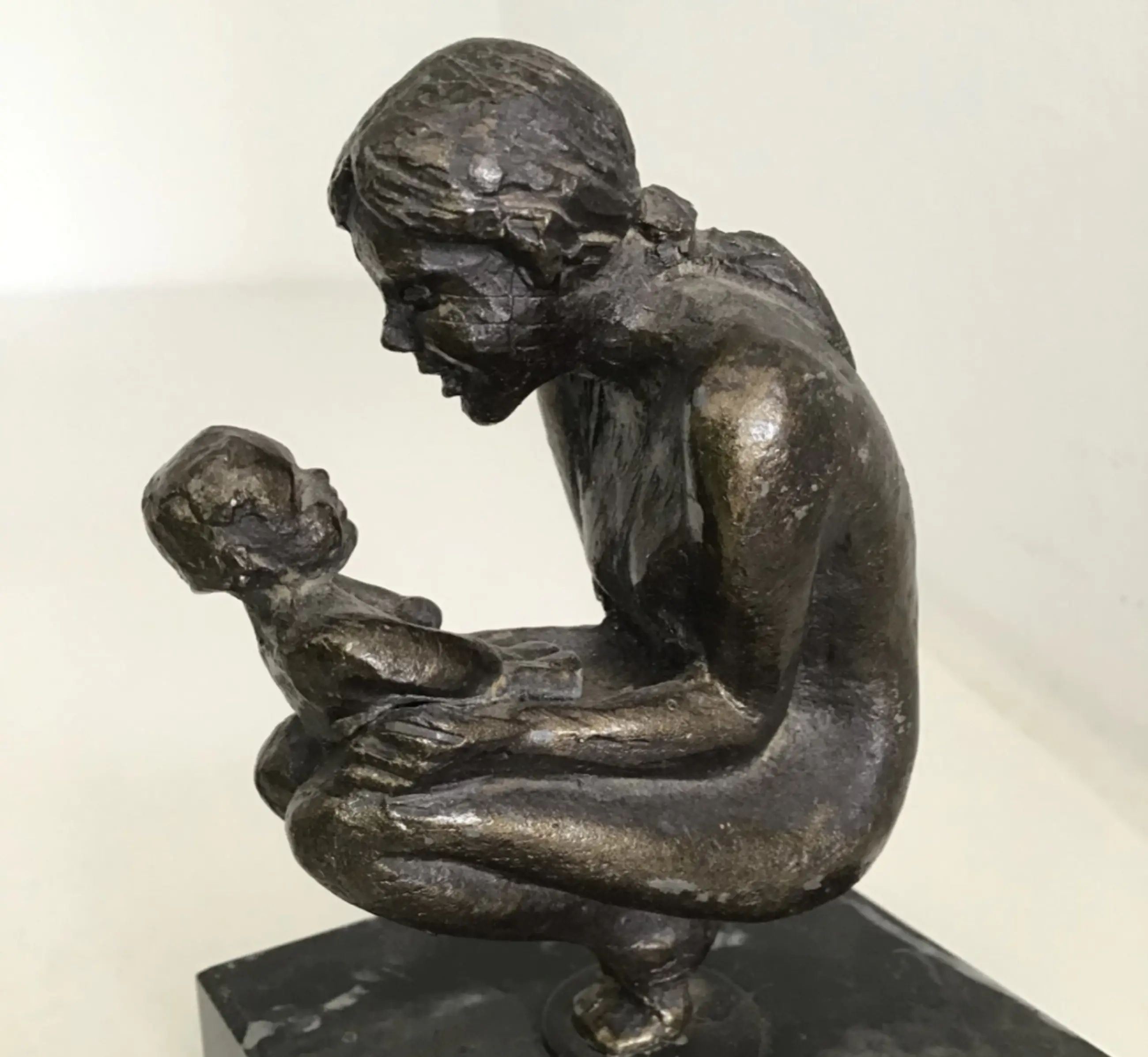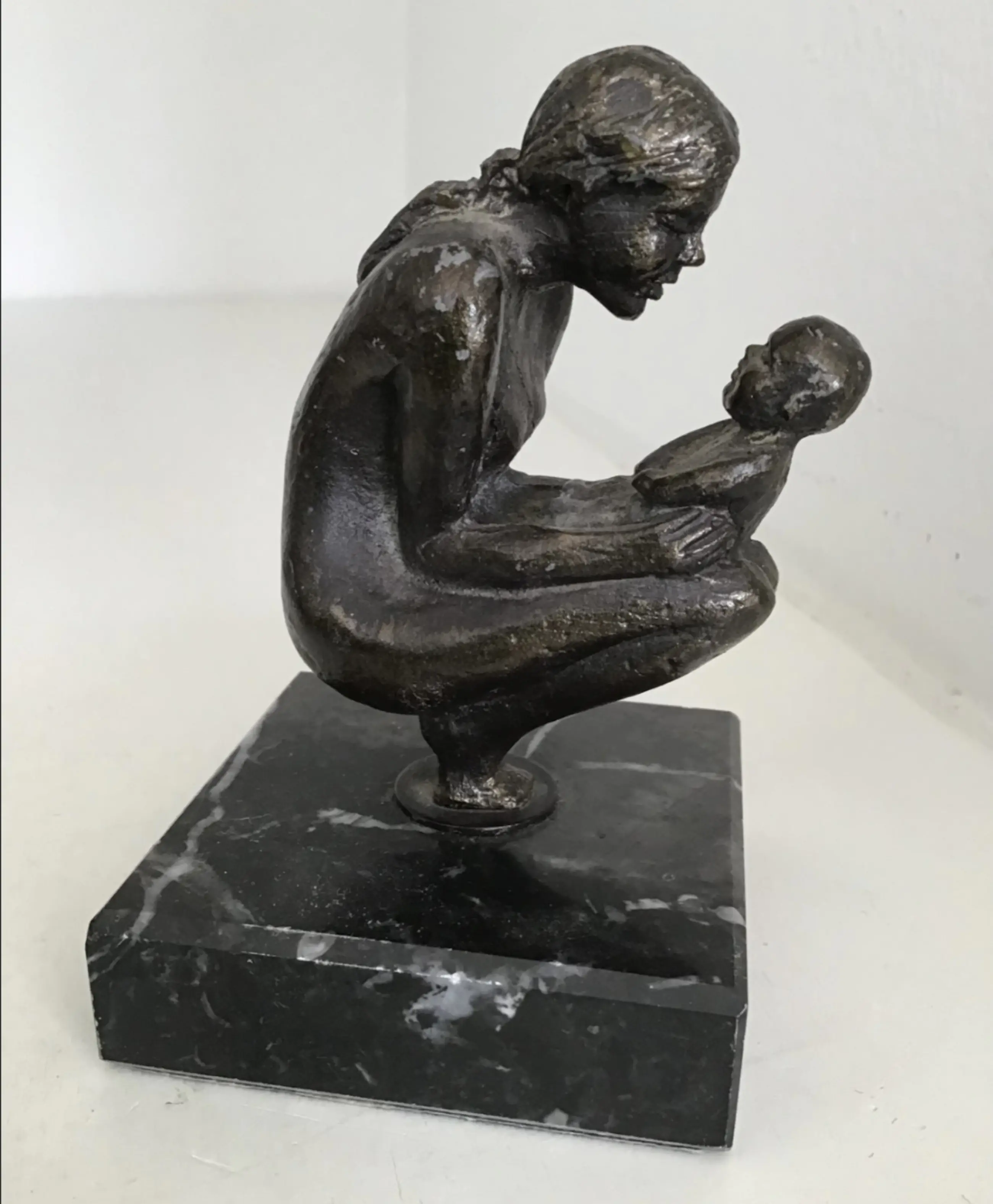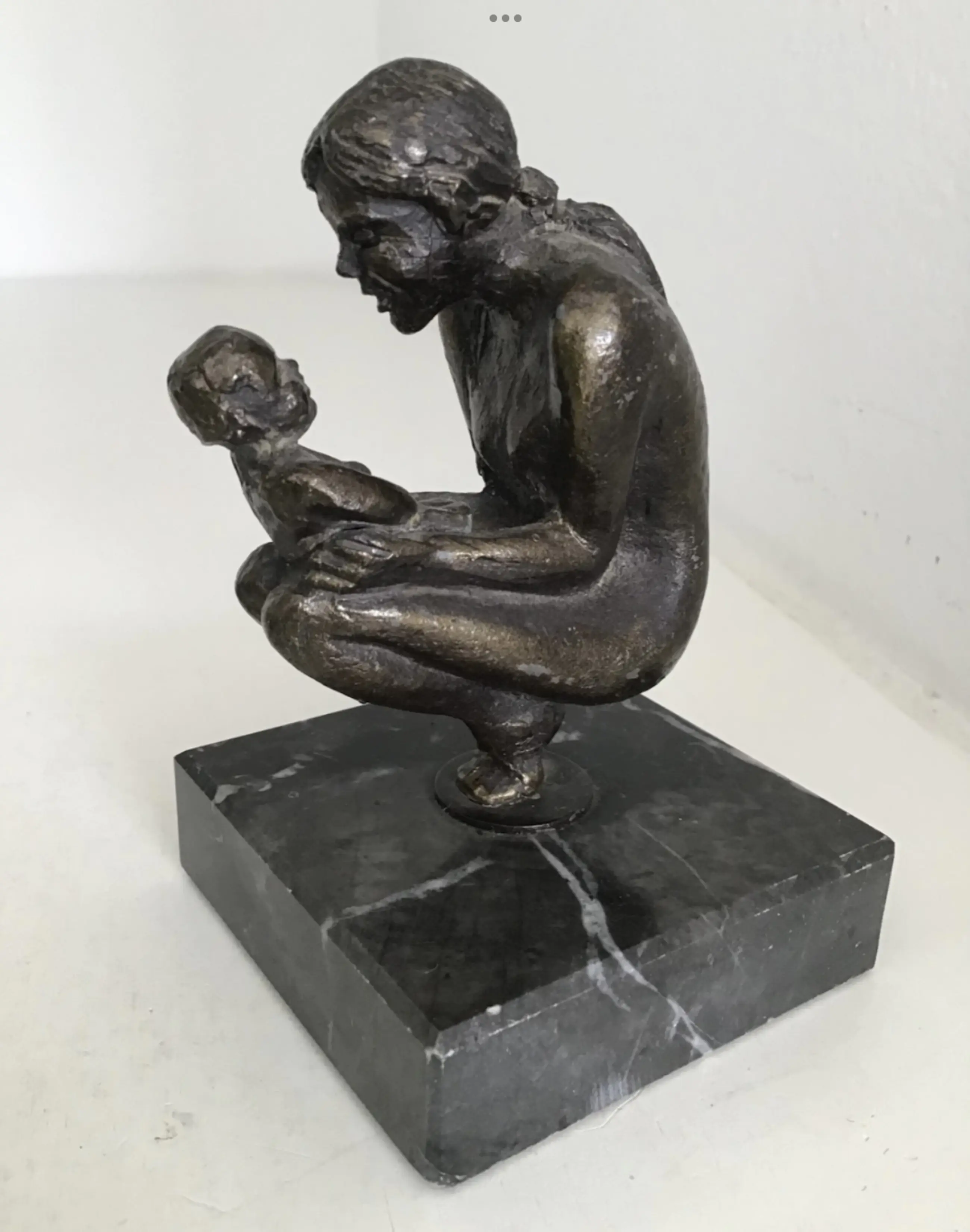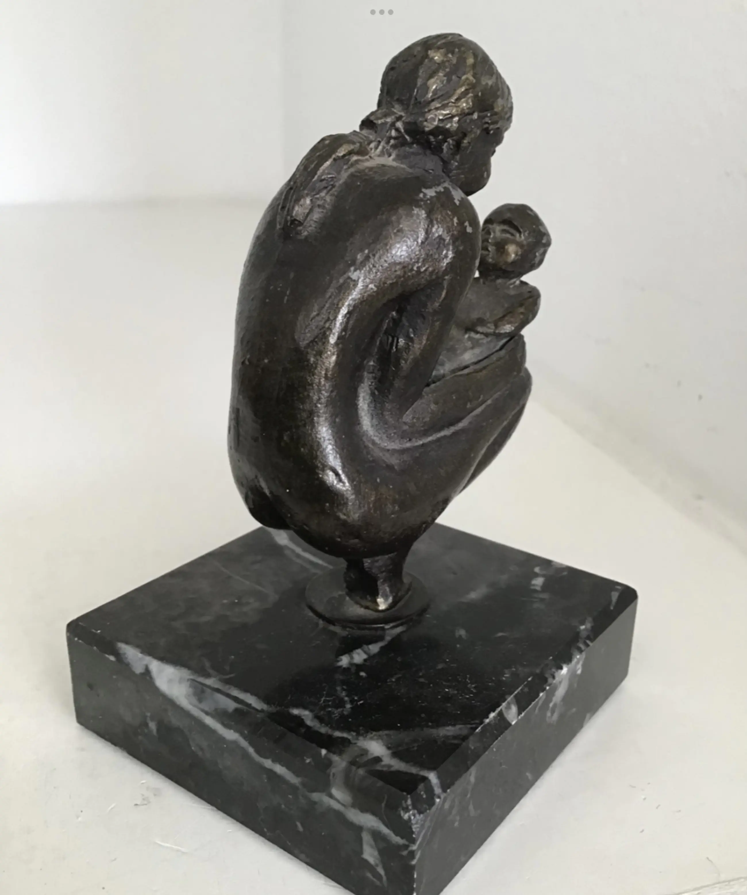 Vertederend en zeer gedetailleerd uitgevoerd sculptuur van een moeder met in haar armen liefdevol haar kind. Kunstenares: Corry Ammerlaan Materiaal: verbronsd metaal op marmeren sokkel Hoogte : 11 cm Het sculptuur staat een beetje los op de sokkel maar kan vastgedraaid worden, Het beeld verkeert in goede staat en wordt zorgvuldig verpakt en aangetekend verzonden.