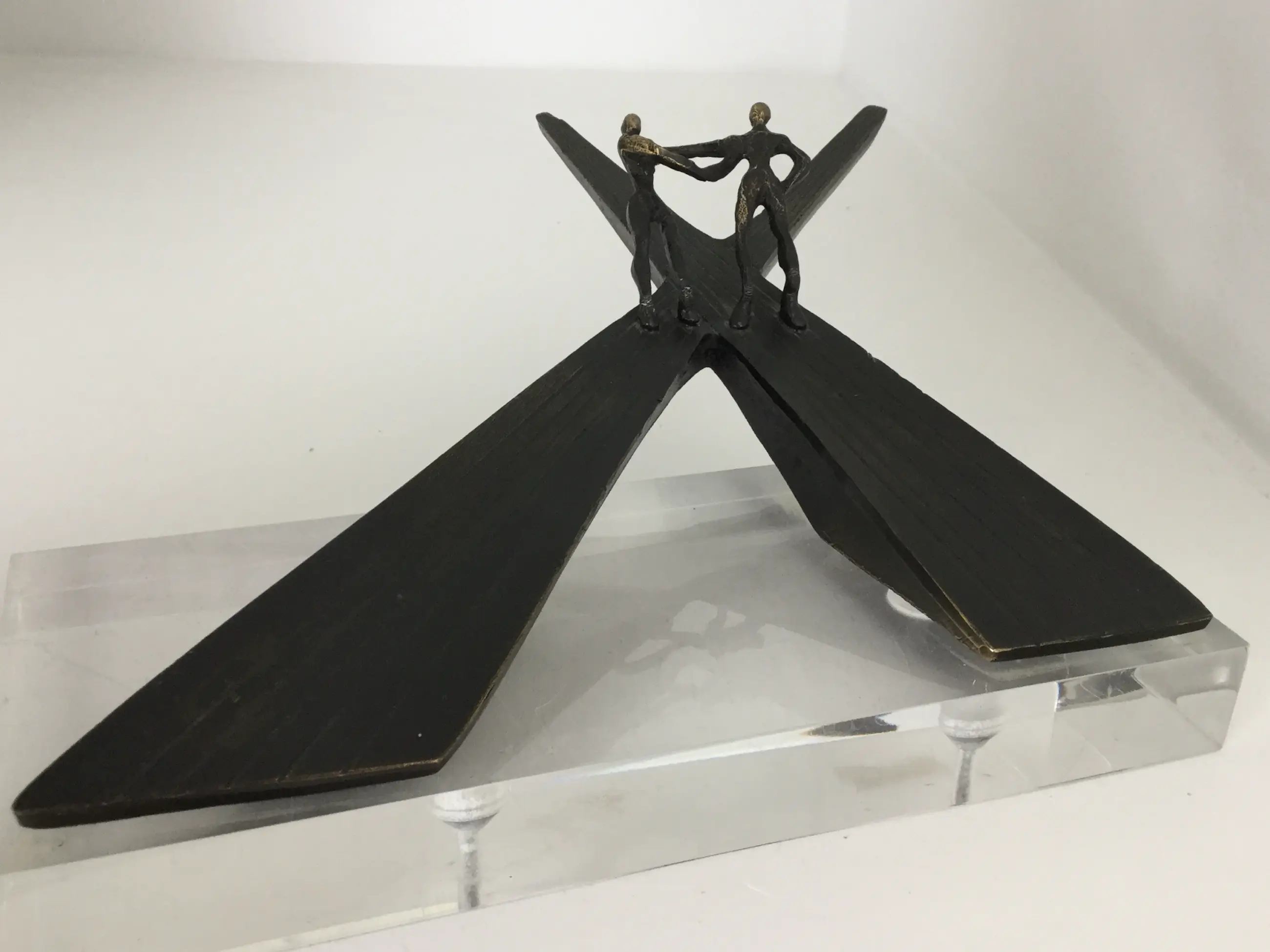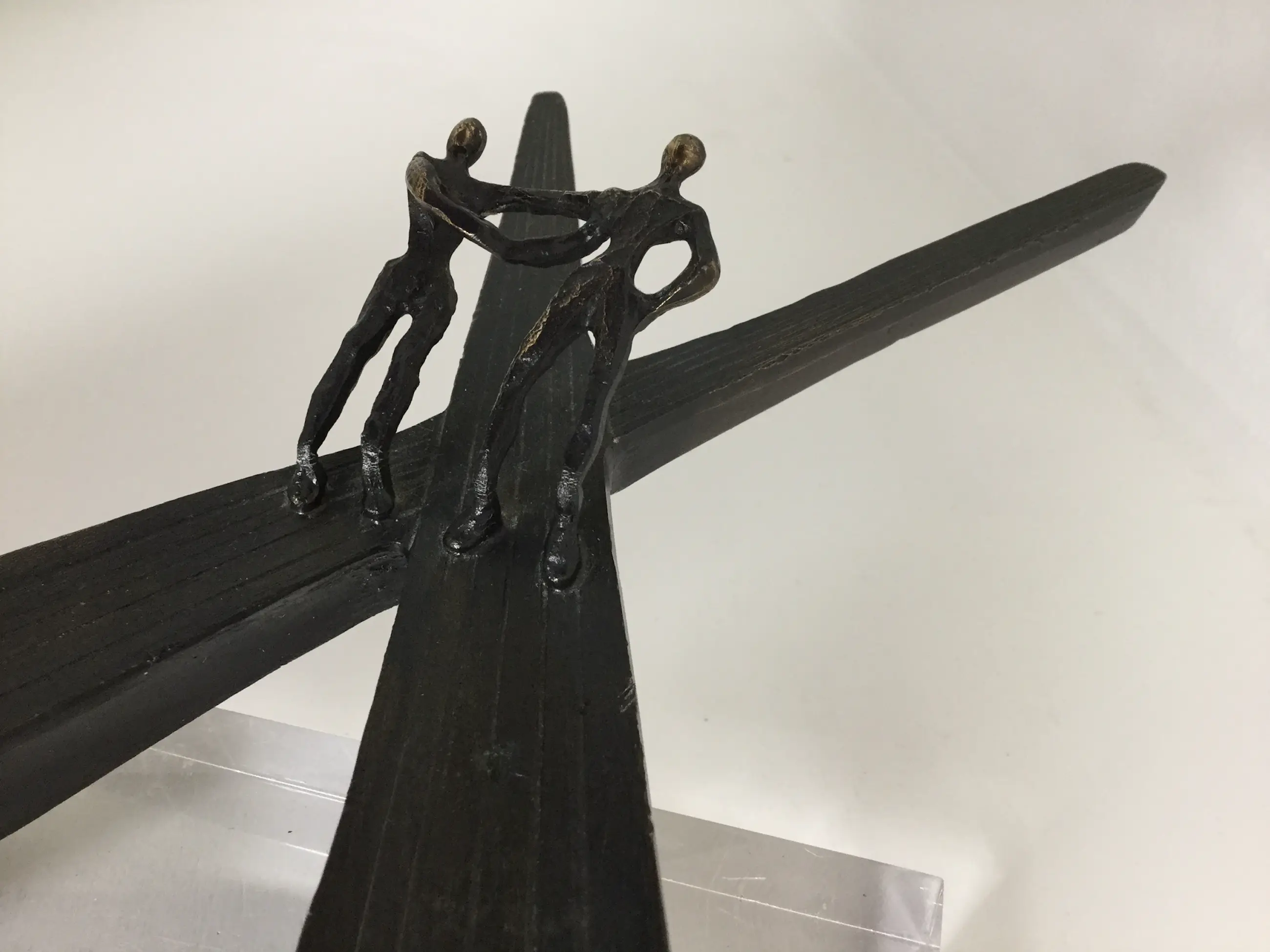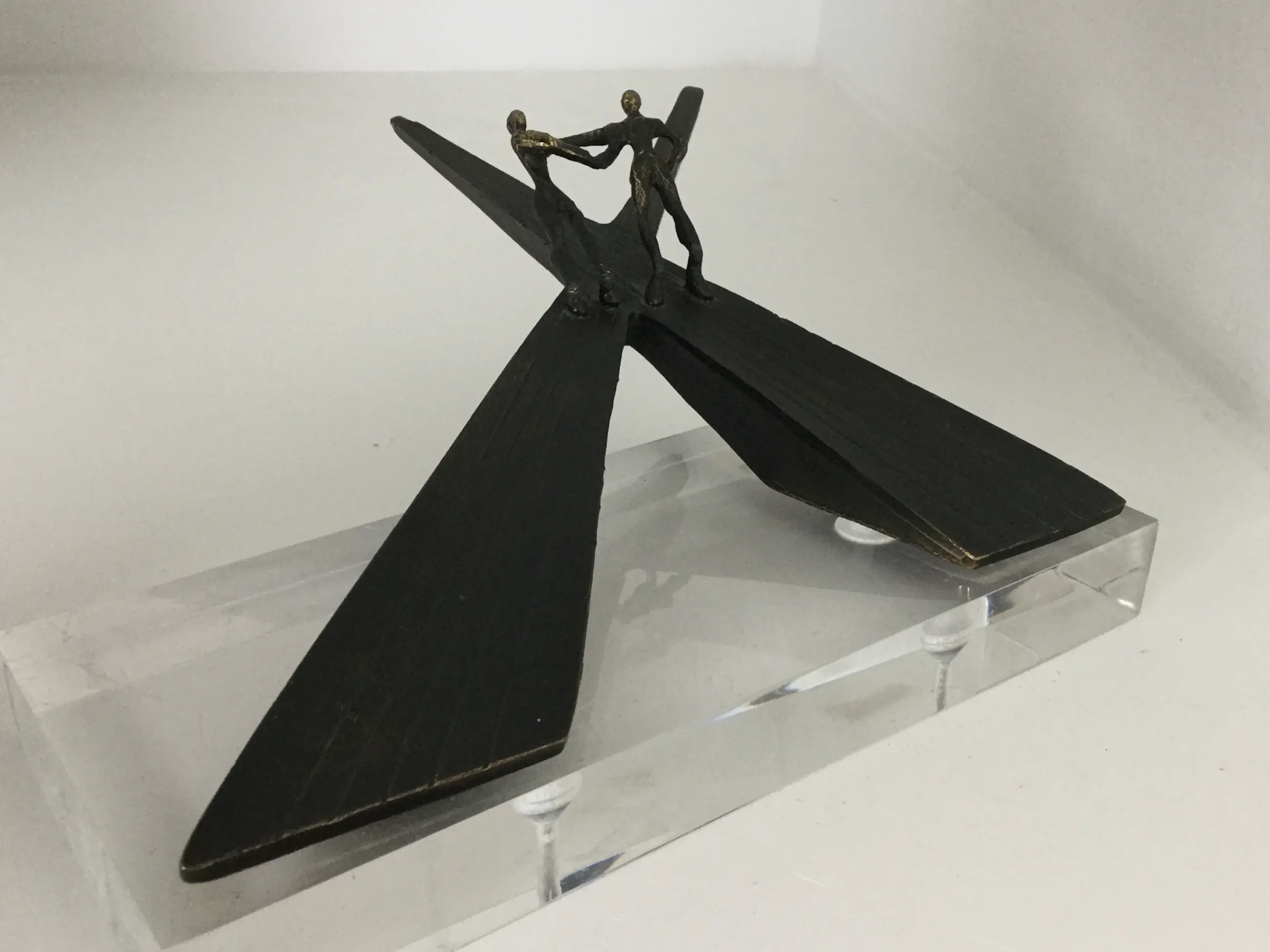 Zeer fraai en gedetailleerd uitgevoerd sculptuur van twee mensfiguren die elkaar de hand schudden en ieder hun eigen weg in slaan. Kunstenares: Corry Ammerlaan Achtergrondgedachte “ Veel geluk op de weg die u in de toekomst zult gaan ! “ Hoogte: 9 cm Breedte: 18 cm Diepte : 16 cm Materiaal: Alloy op fraaie kunststof voet. Het beeld verkeert in goede staat en wordt zorgvuldig verpakt en aangetekend verzonden.