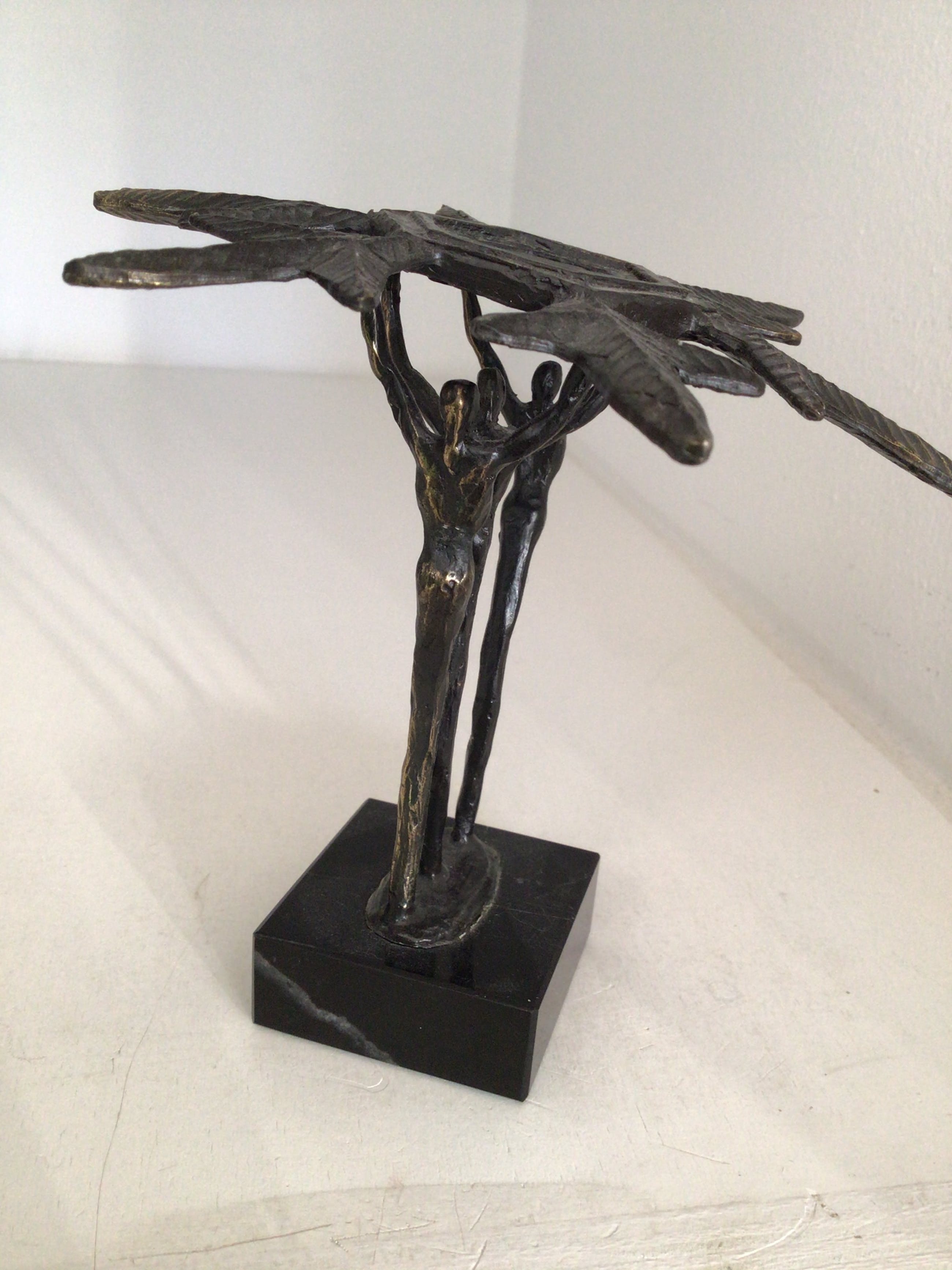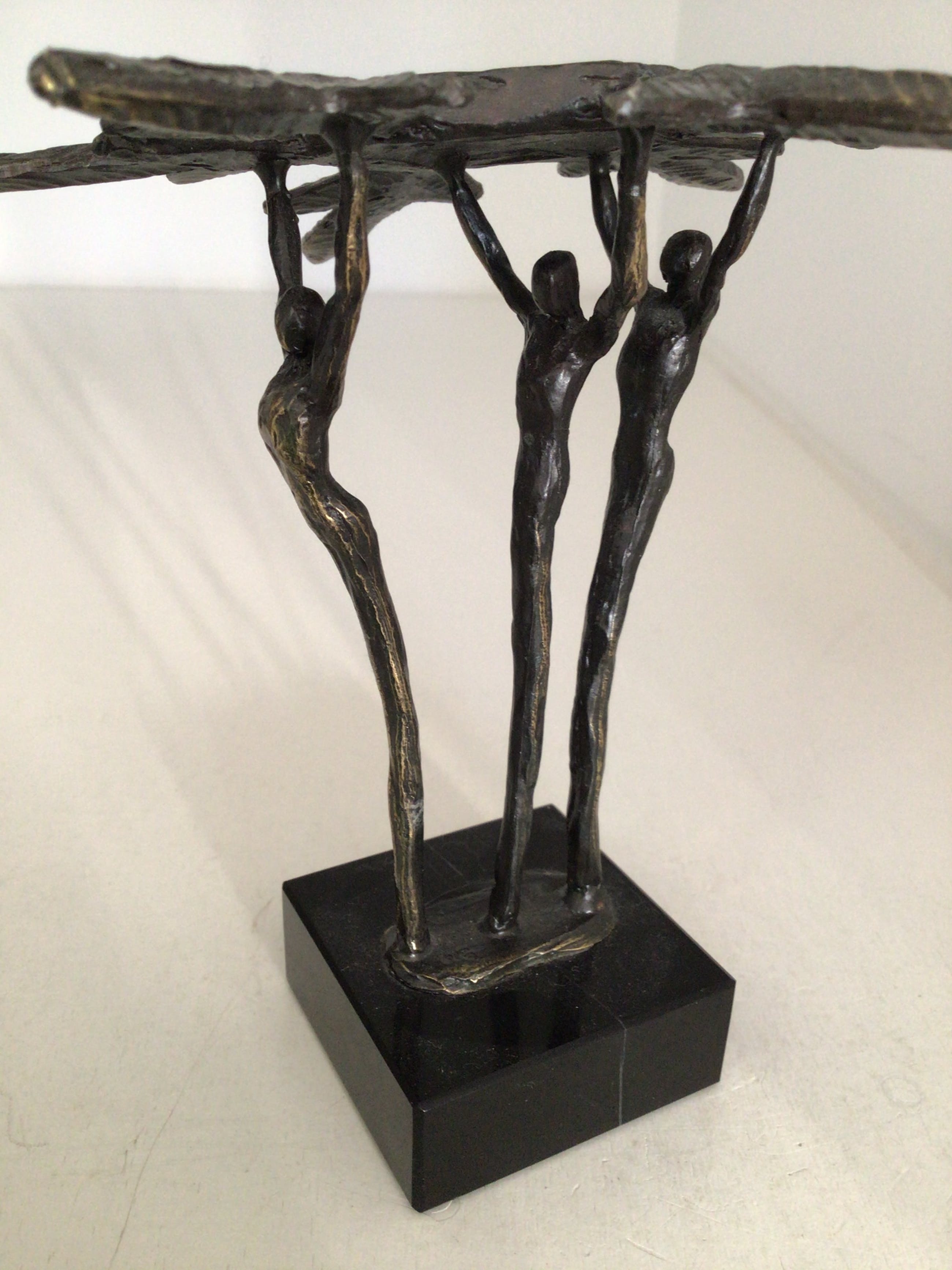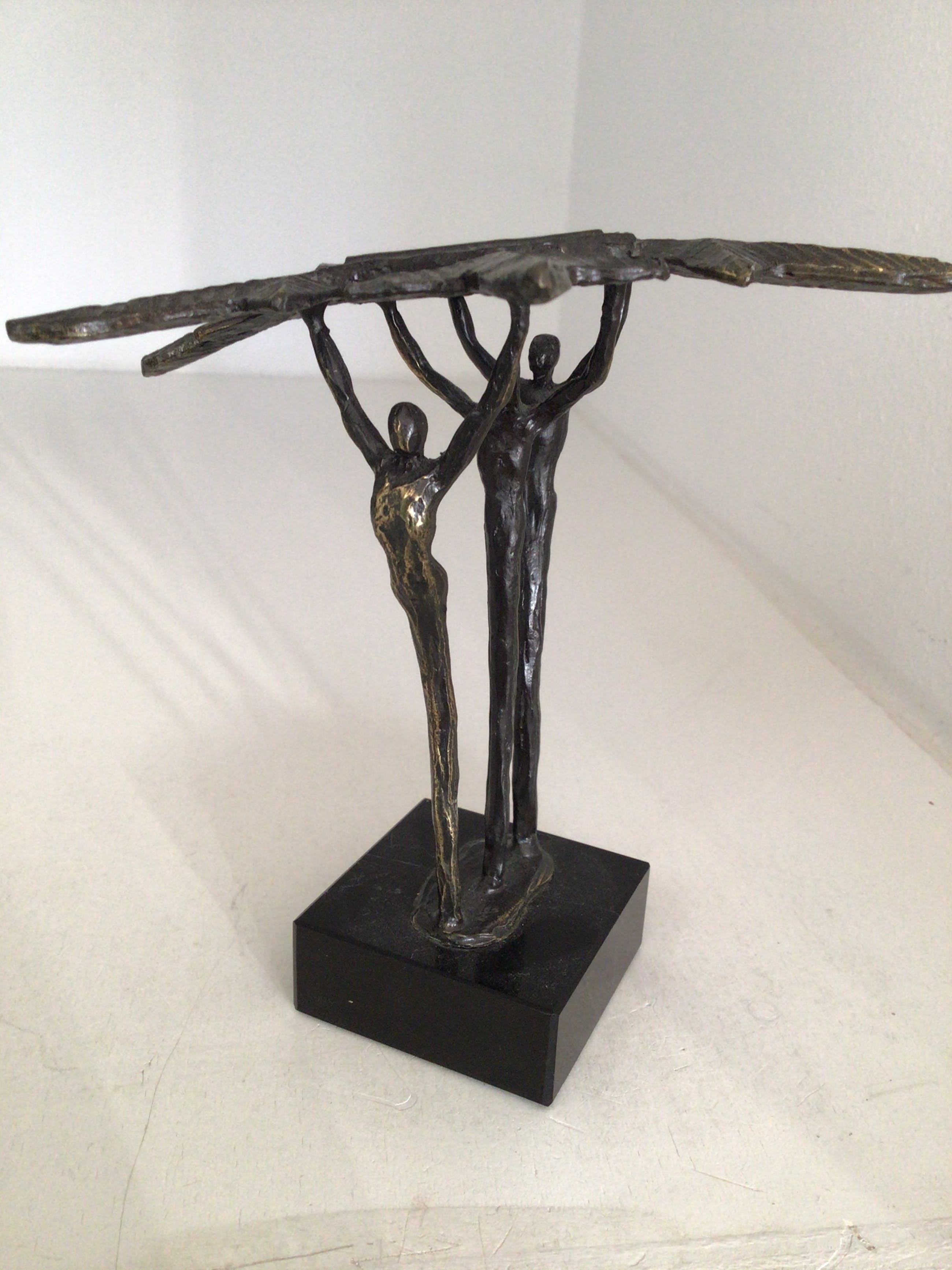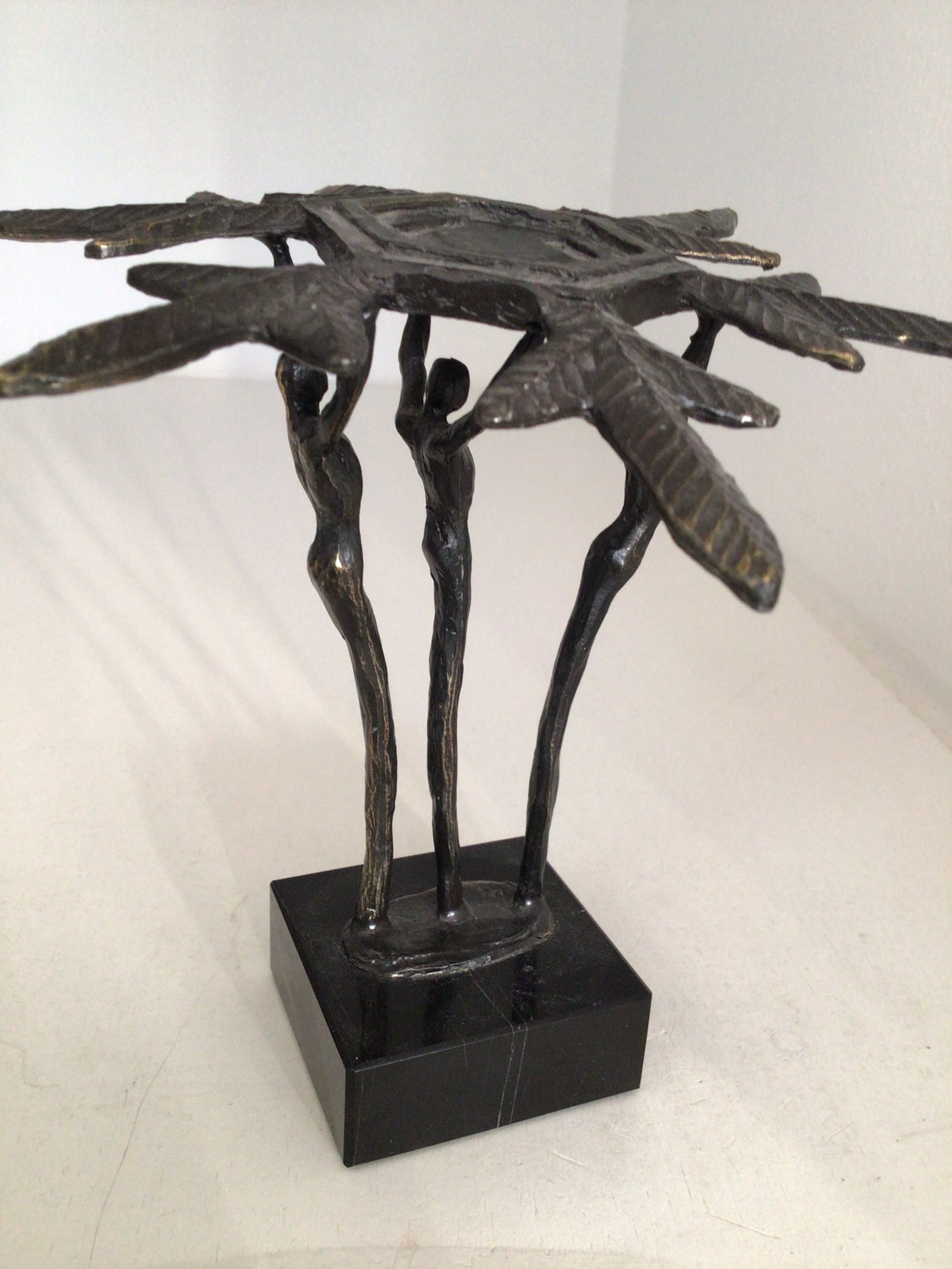 Zeer fraai en zeldzaam sculptuur waarin drie mensfiguren gezamenlijk de “ last “ dragen. Titel : Samen de schouders er onder zetten. Kunstenares : Corry Ammerlaan Op het sculptuur kan tevens een waxinelichtje gezet worden waardoor er een erg mooi effect ontstaat. Hoogte : 14 cm Materiaal : verbronsd metaal Het sculptuur verkeert in goede staat en wordt zorgvuldig verpakt en aangetekend verzonden .