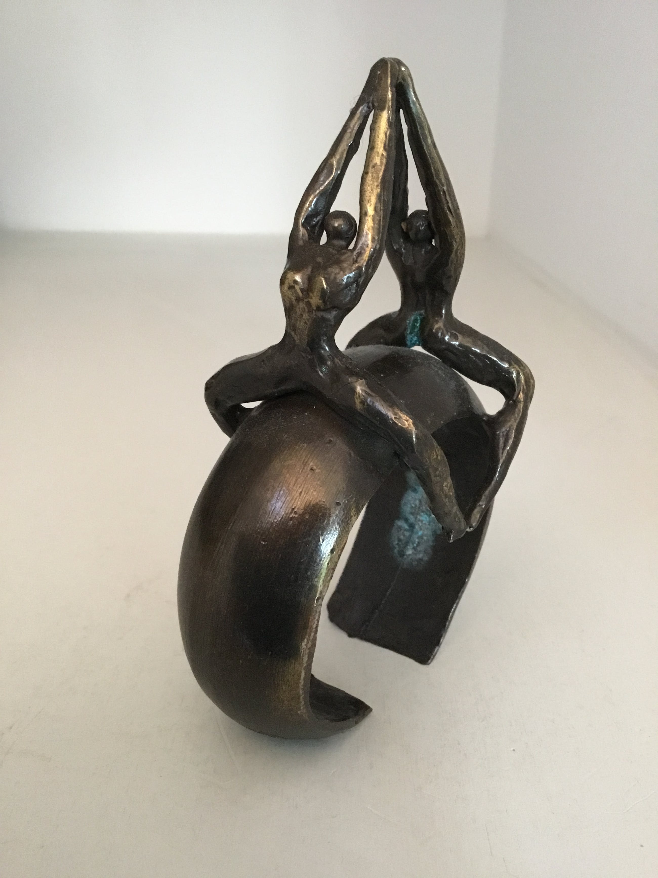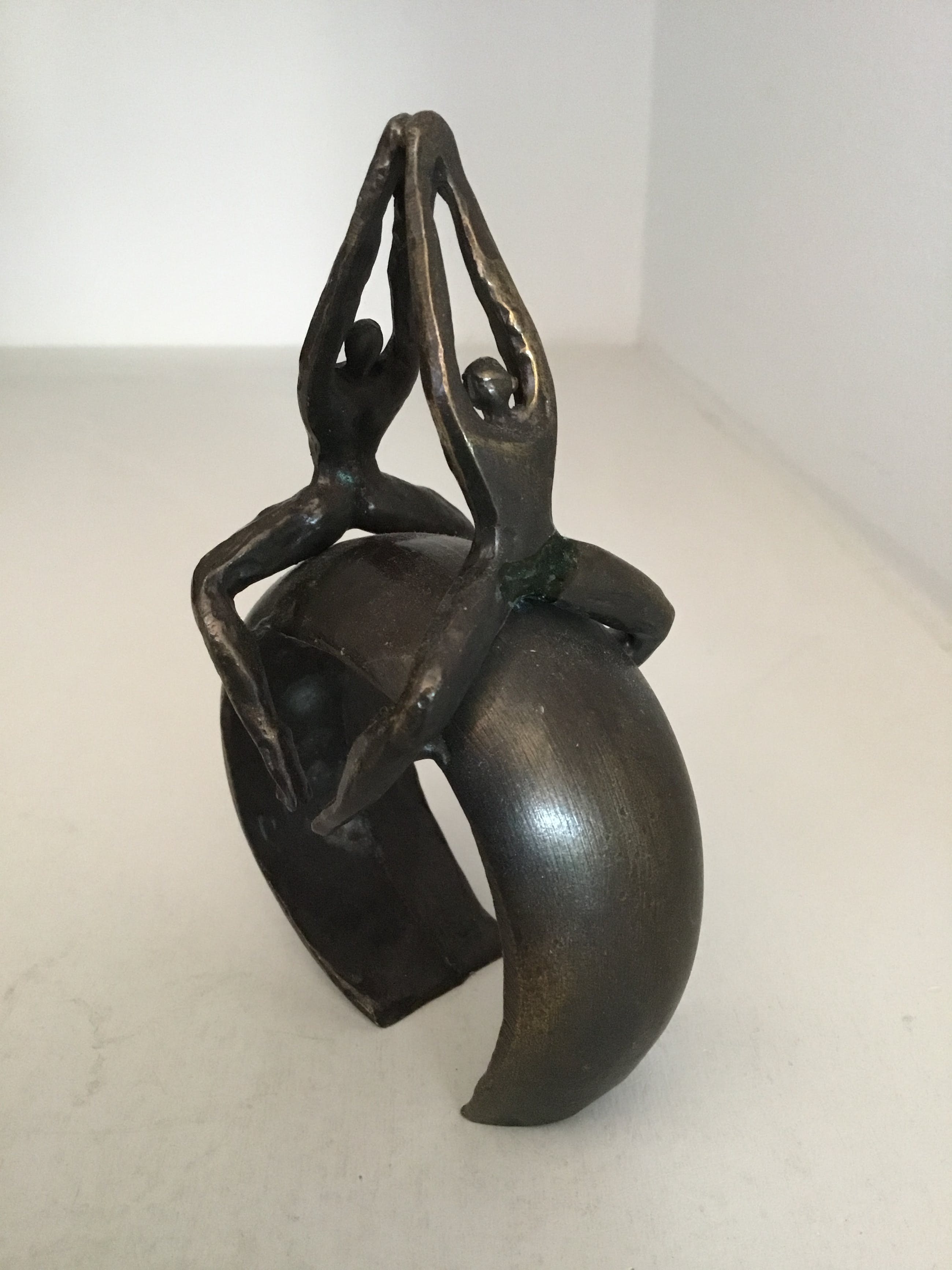 Mooi symbolisch sculptuur van twee mensfiguren die samen balanceren op een halve cirkel. Kunstenares : Corry Ammerlaan Materiaal : brons Het sculptuur verkeert in goede staat en wordt zorgvuldig verpakt en aangetekend verzonden .