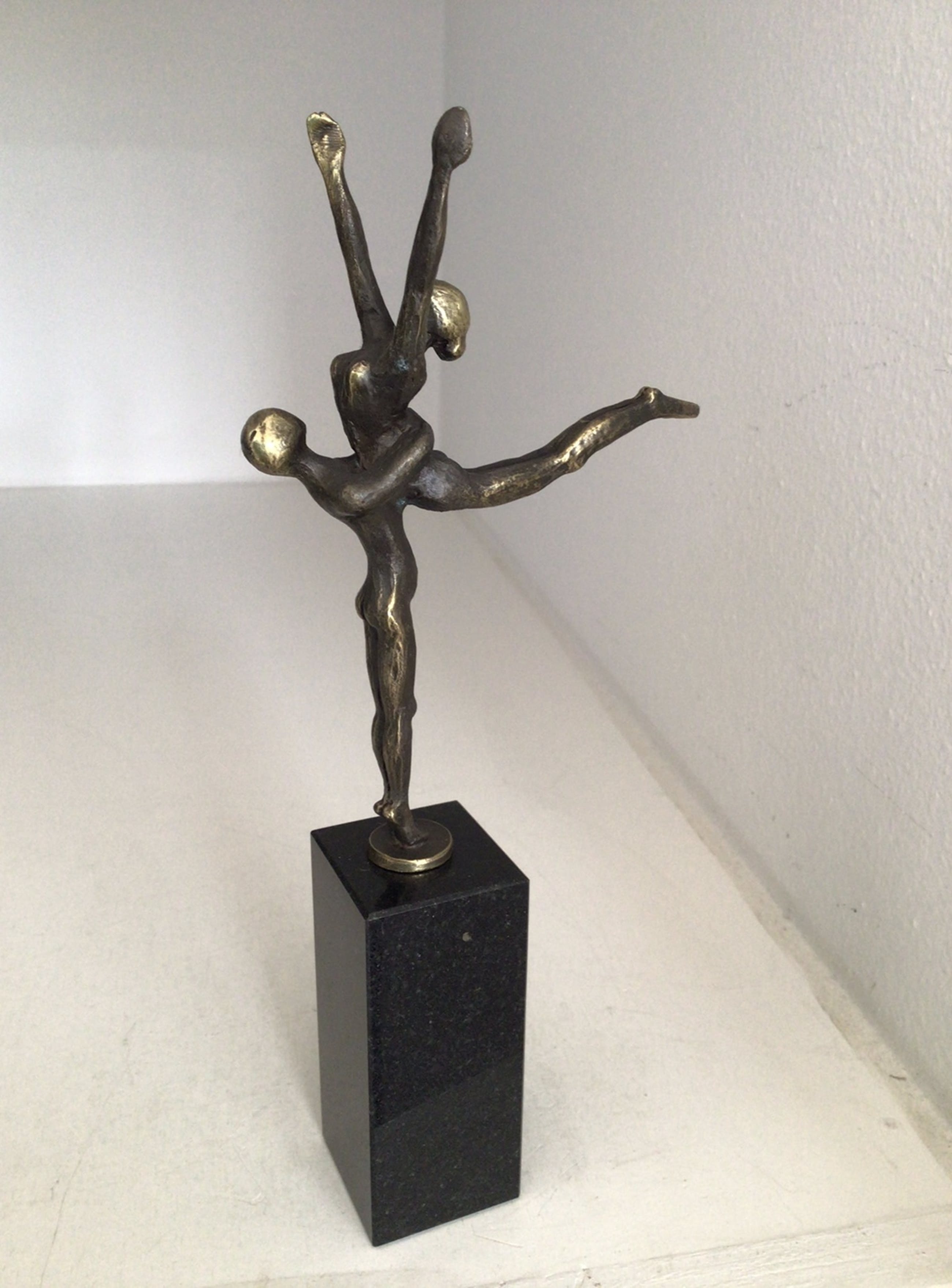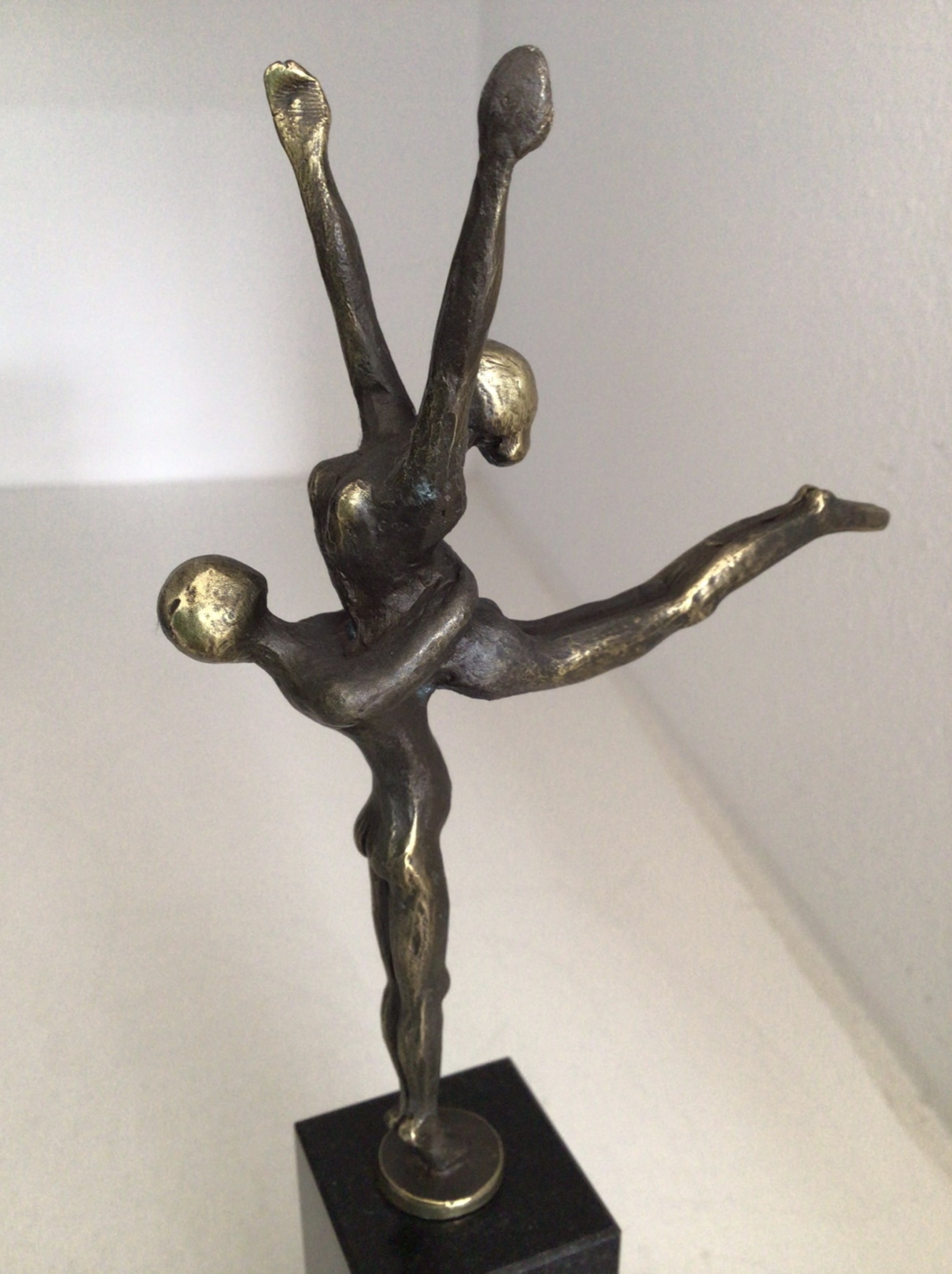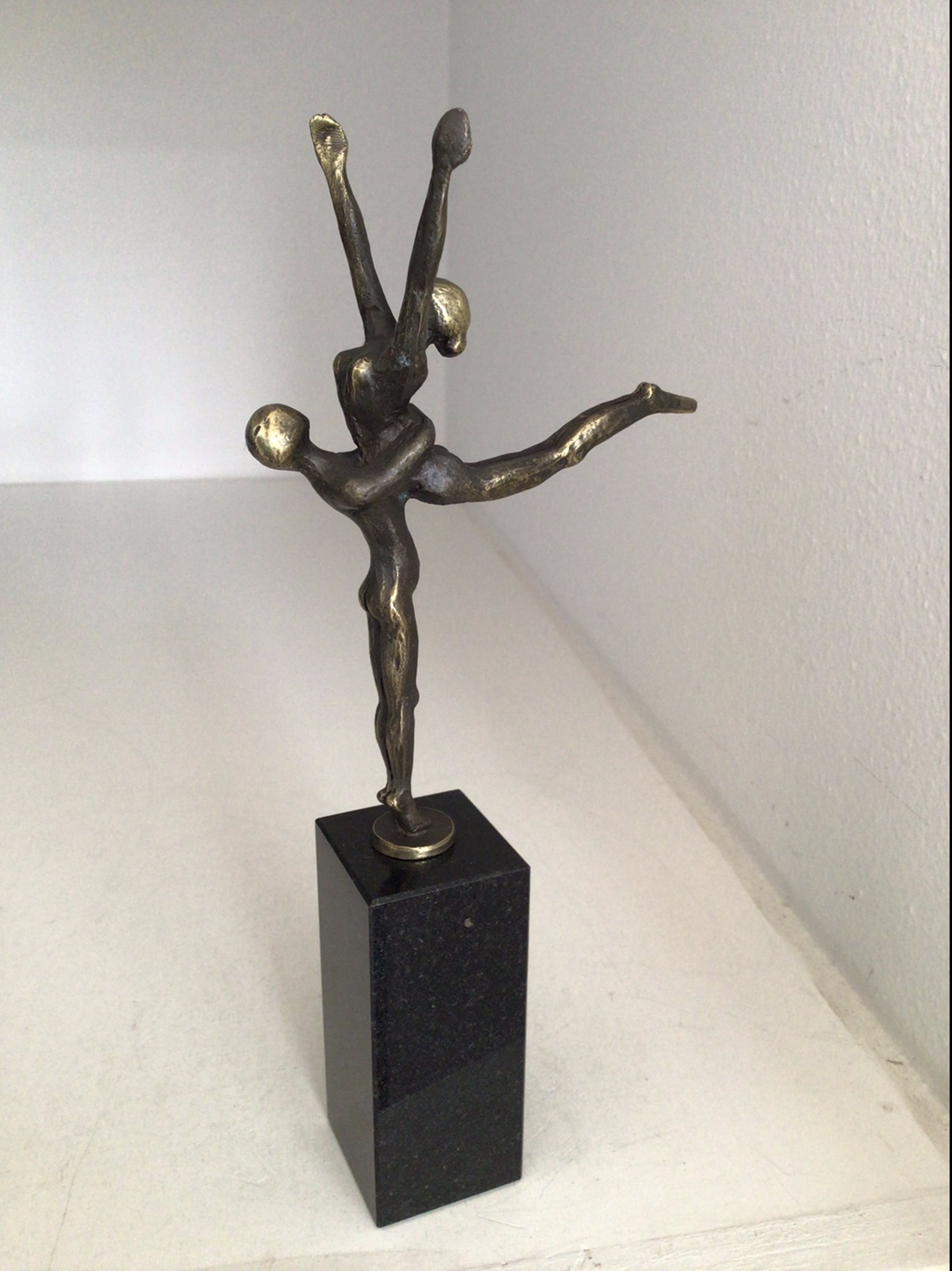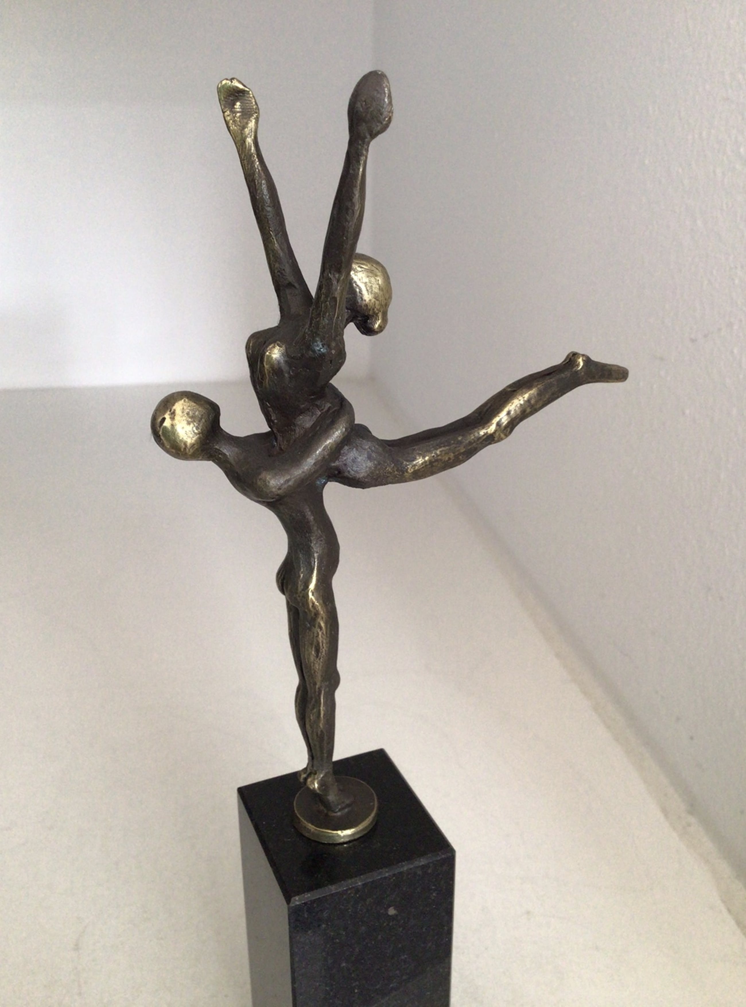 Prachtig sierlijk sculptuur van twee dansers in een fraaie danspose. Titel “ Samenspel “ Hoogte : 22 cm Materiaal: verbronsd metaal op fraaie zwart marmeren sokkel. Kunstenares: Corry Ammerlaan Het beeld verkeert in zeer goede staat en wordt zorgvuldig verpakt en aangetekend verzonden.