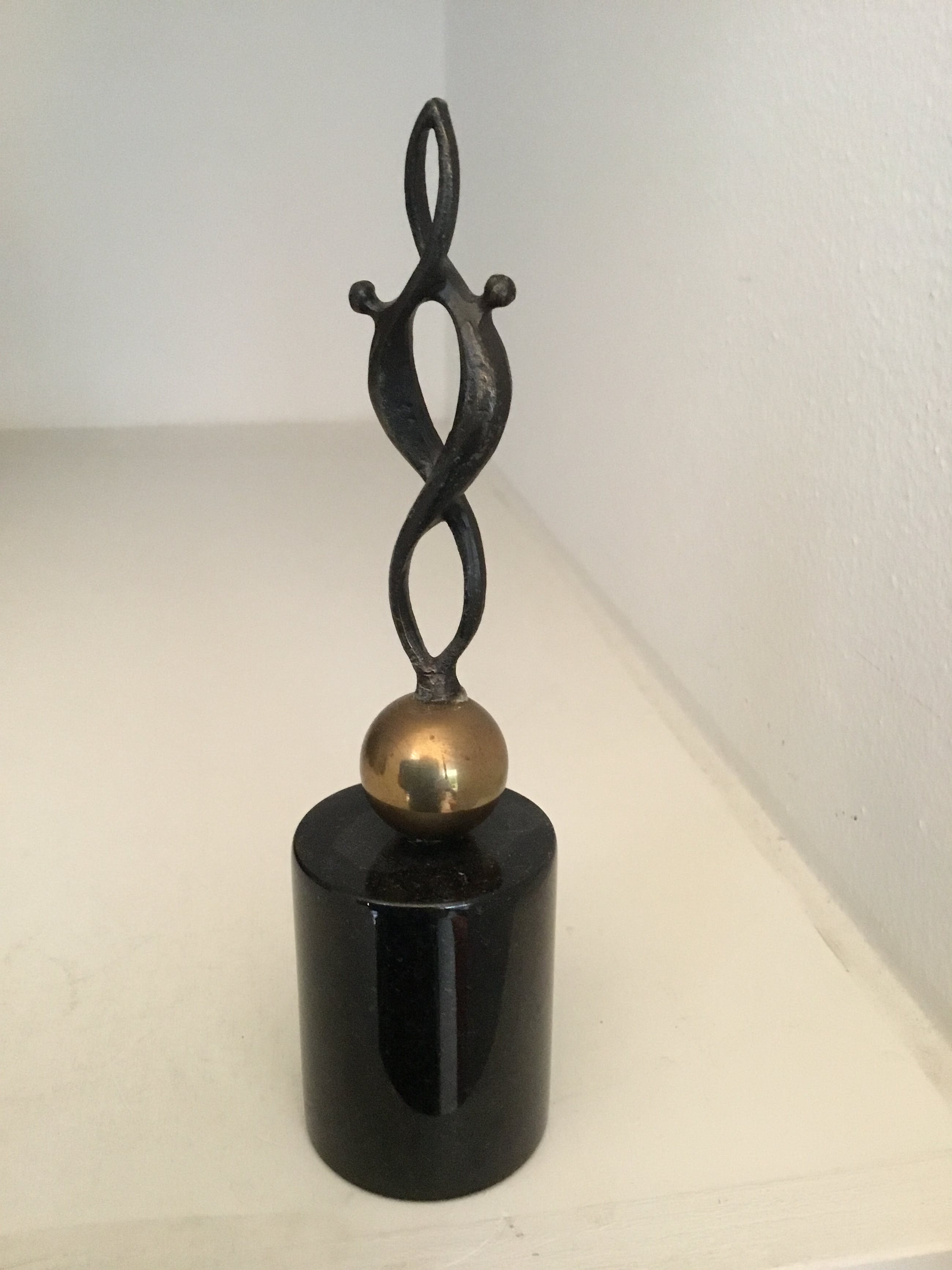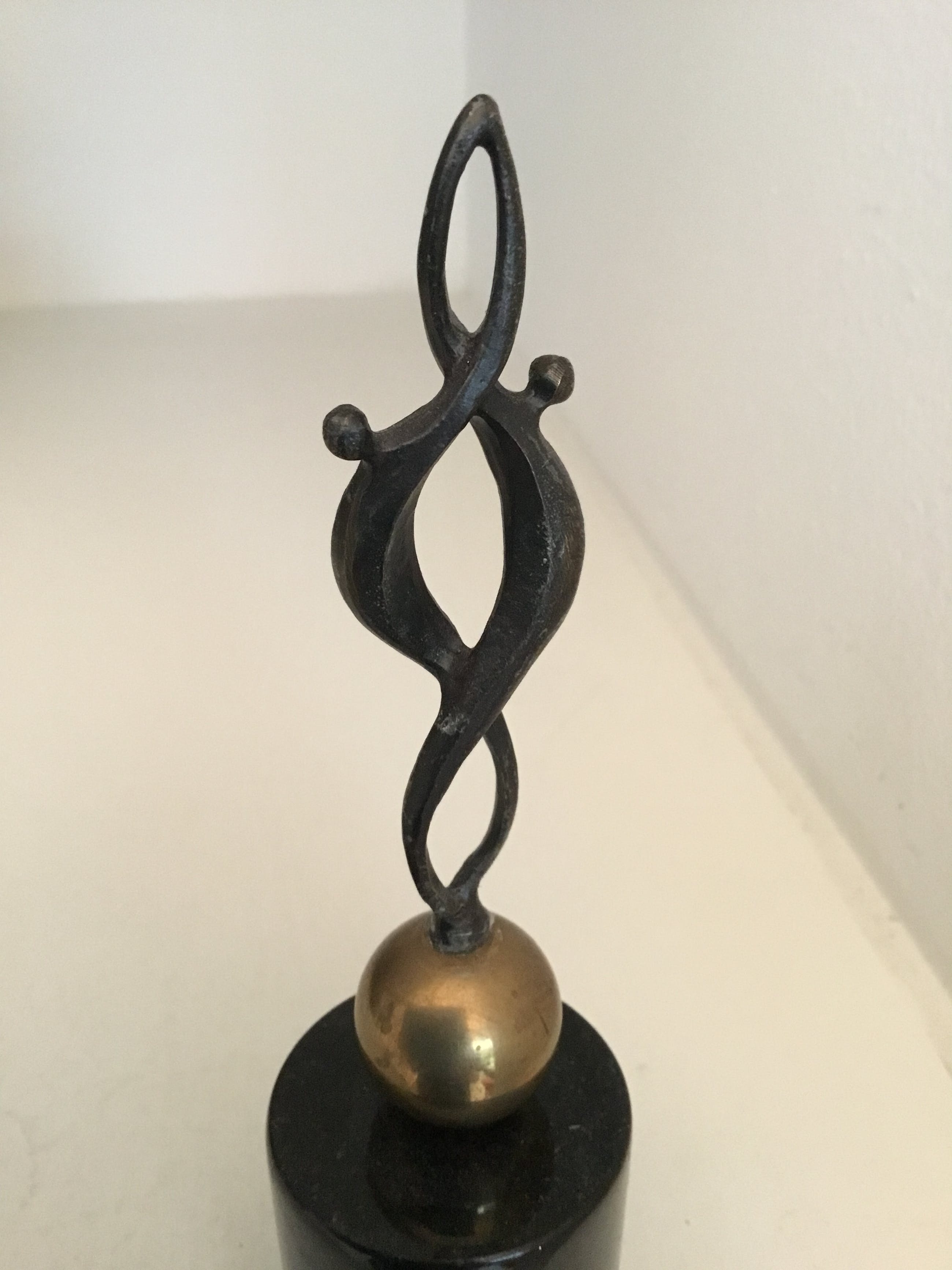 Mooi symbolisch sculptuur van twee mensfiguren samen staande op een gouden bol Titel “ Together “ Hoogte : 17 cm Materiaal : brons op marmeren voet Het sculptuur verkeert in zeer goede staat en wordt zorgvuldig verpakt en aangetekend verzonden .