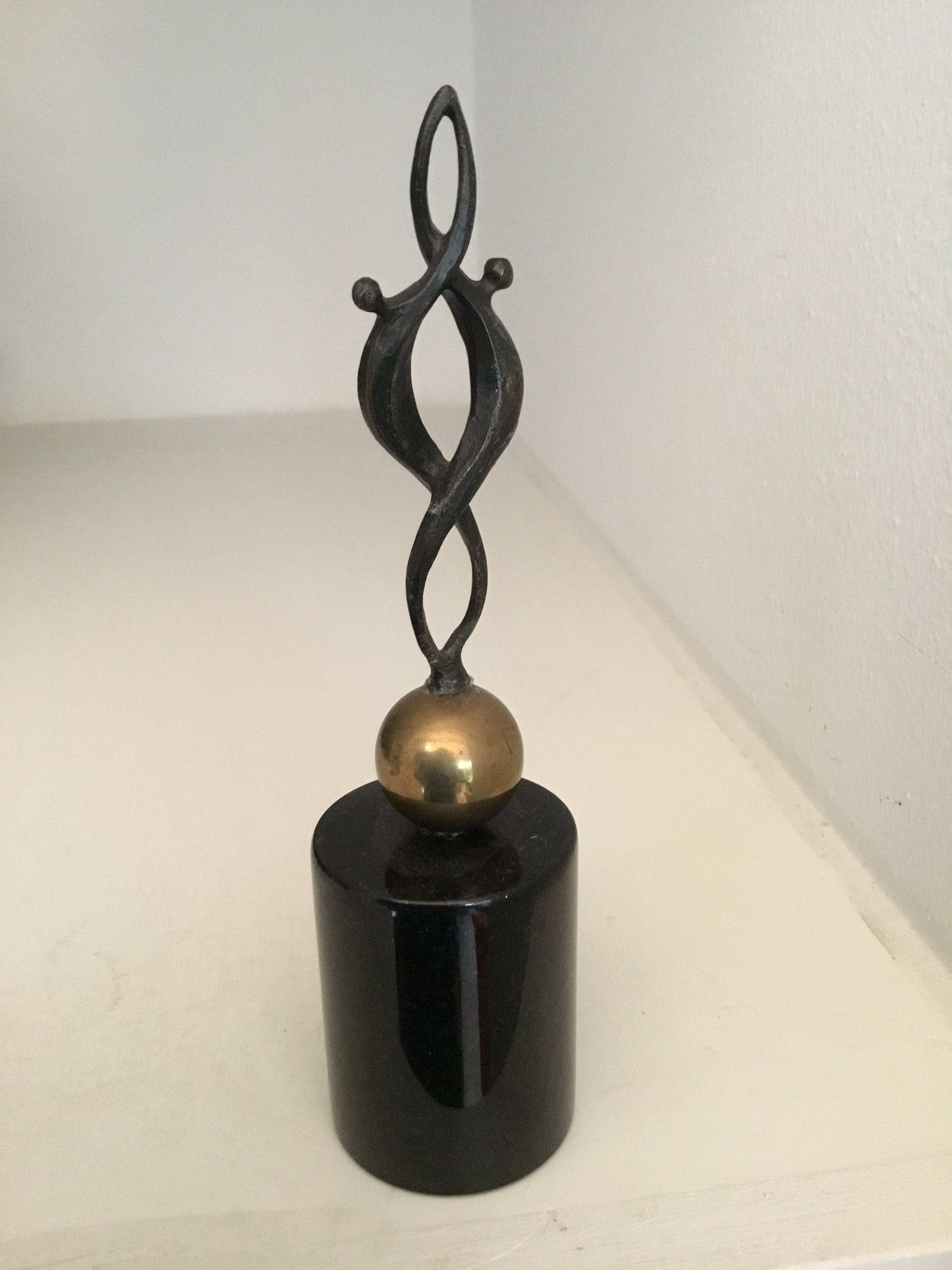 Mooi symbolisch sculptuur van twee mensfiguren samen staande op een gouden bol Titel “ Together “ Hoogte : 17 cm Materiaal : brons op marmeren voet Het sculptuur verkeert in zeer goede staat en wordt zorgvuldig verpakt en aangetekend verzonden .