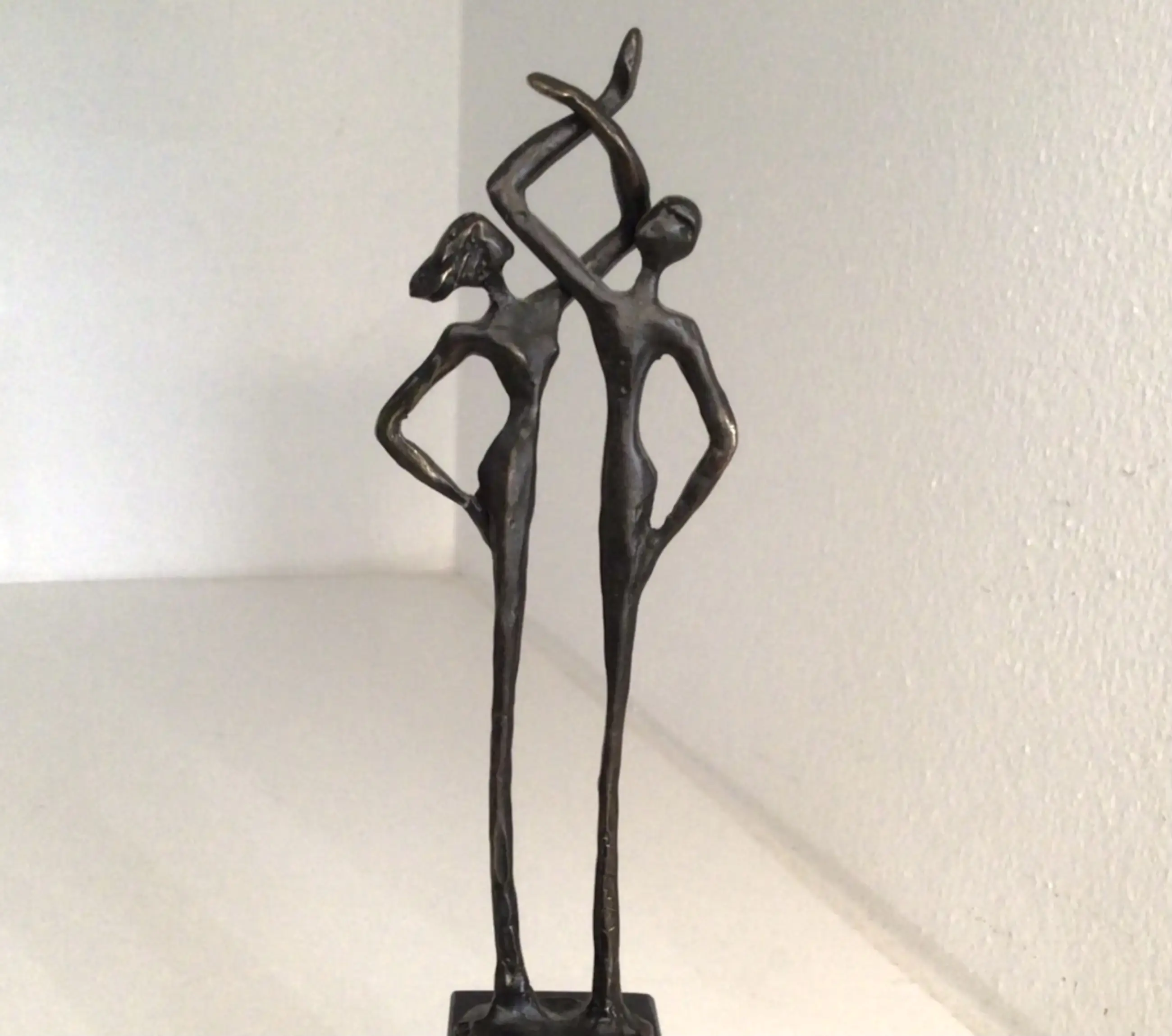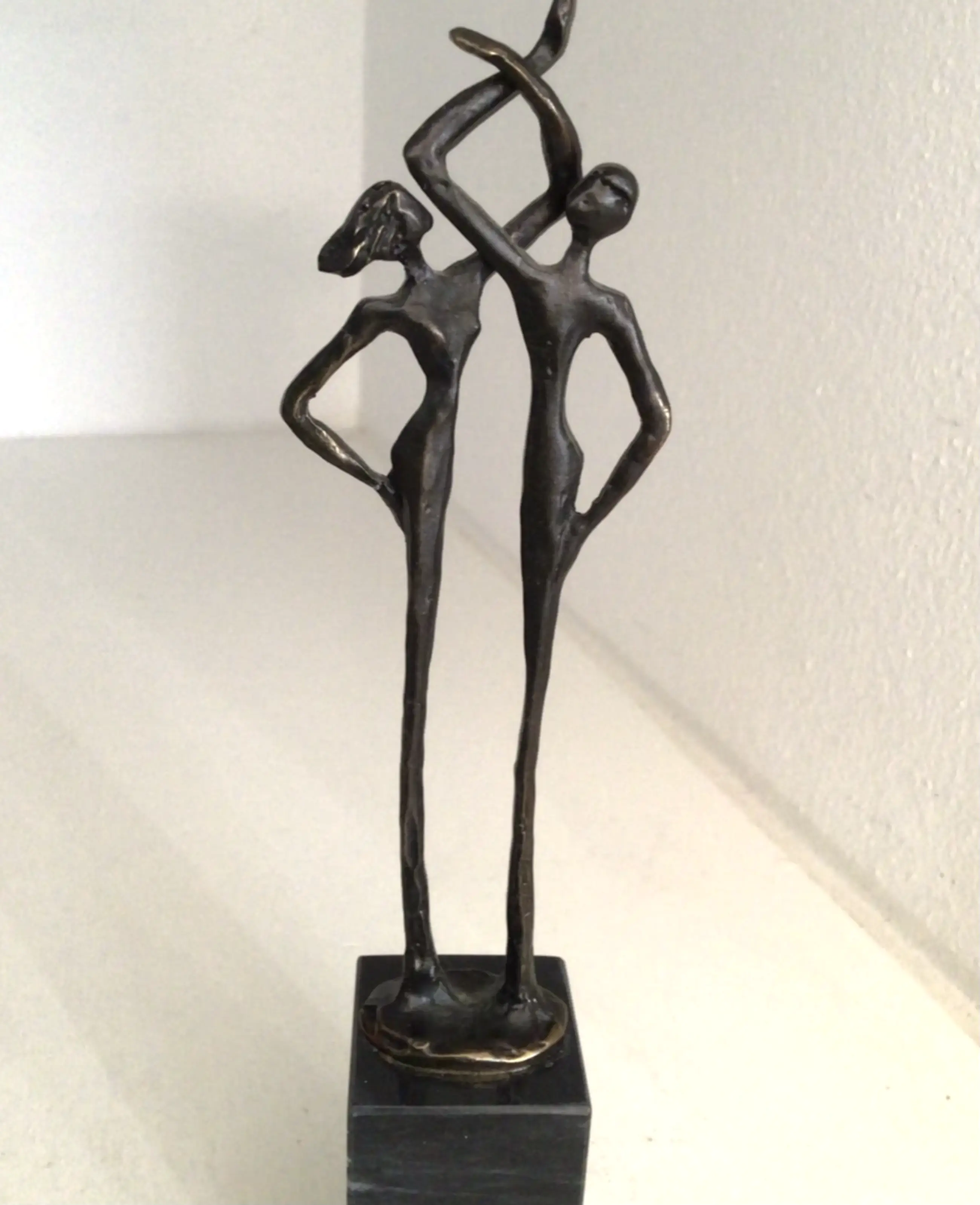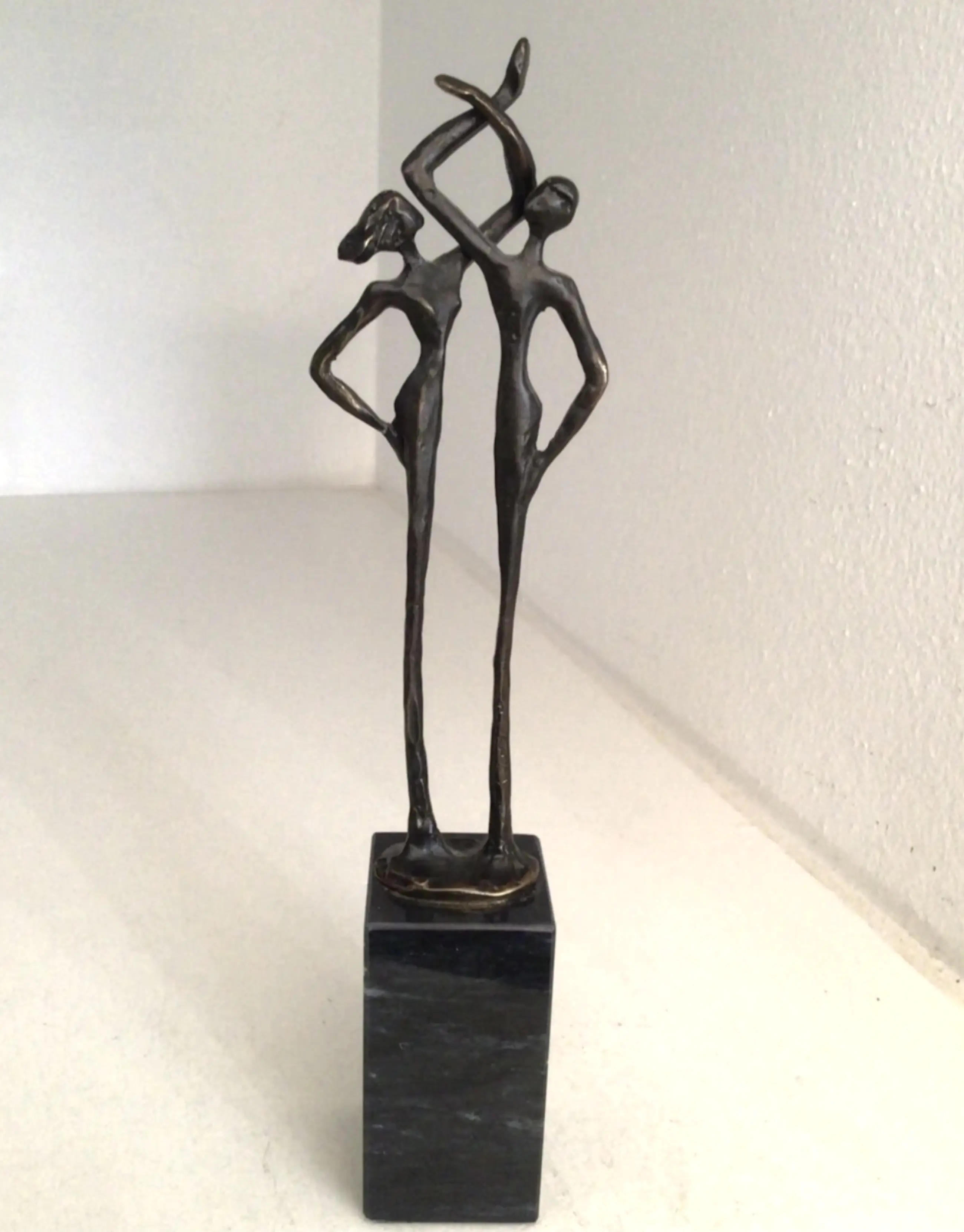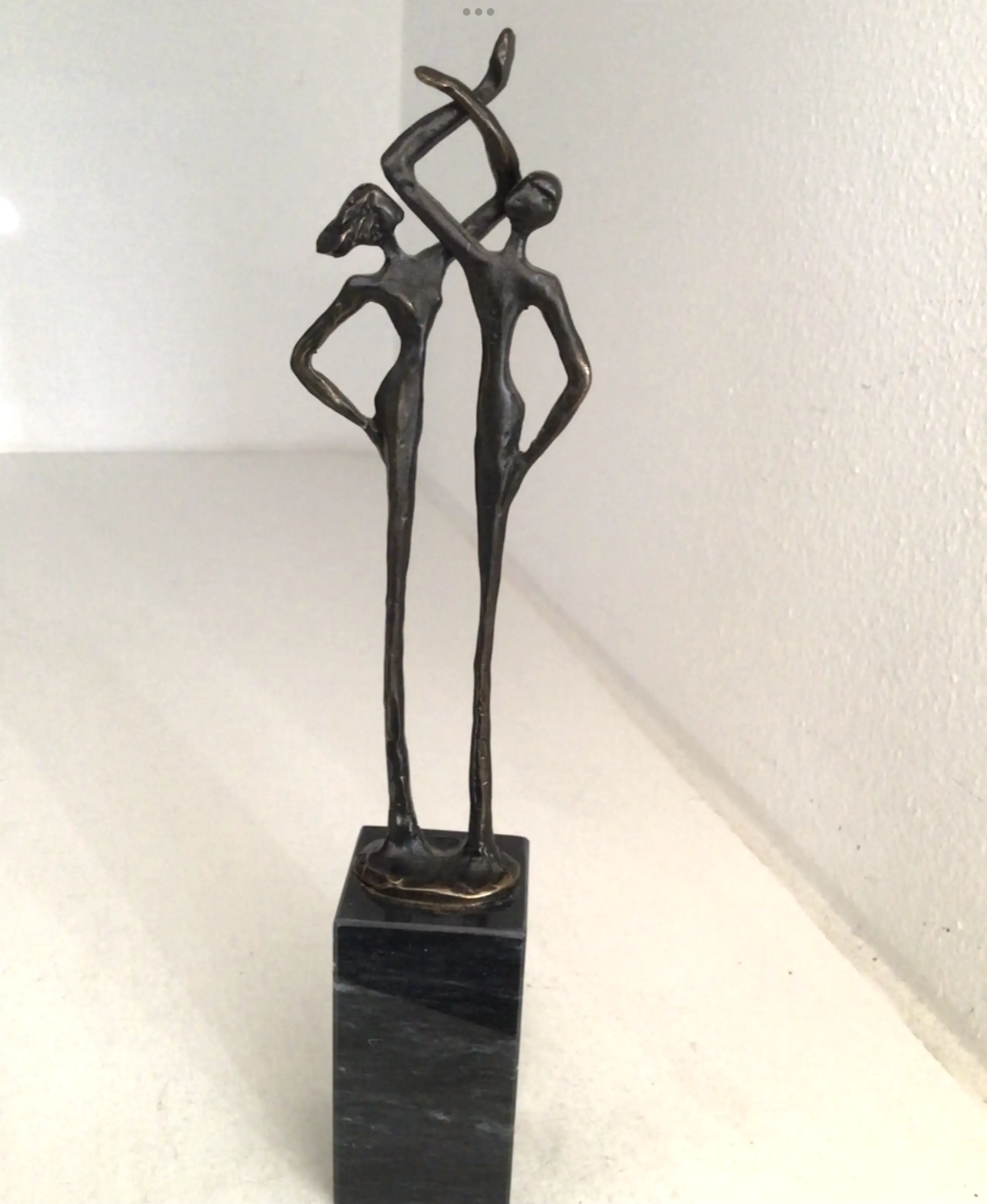 Zeer fraai sculptuur van twee geliefden die samen een mooie danspose maken. Titel “ Together “ Kunstenares : Corry Ammerlaan Hoogte : 20 cm Materiaal: Alloy op zwart marmeren sokkel Het beeld verkeert in goede staat en wordt zorgvuldig verpakt verzonden.