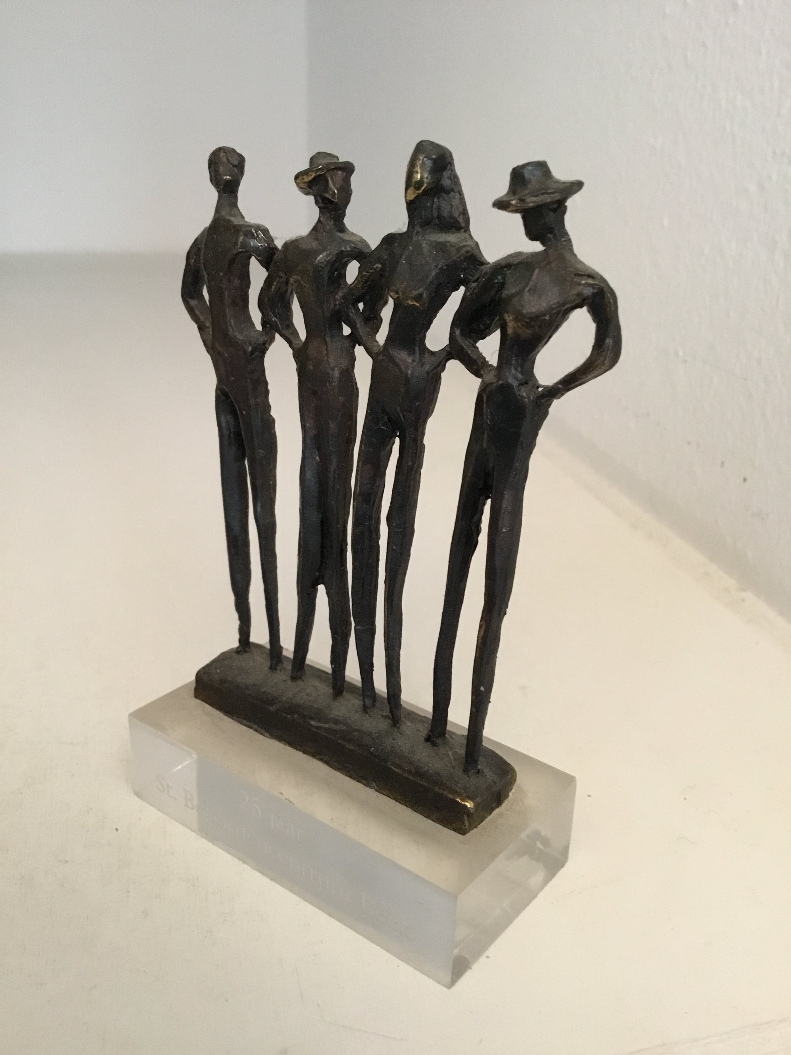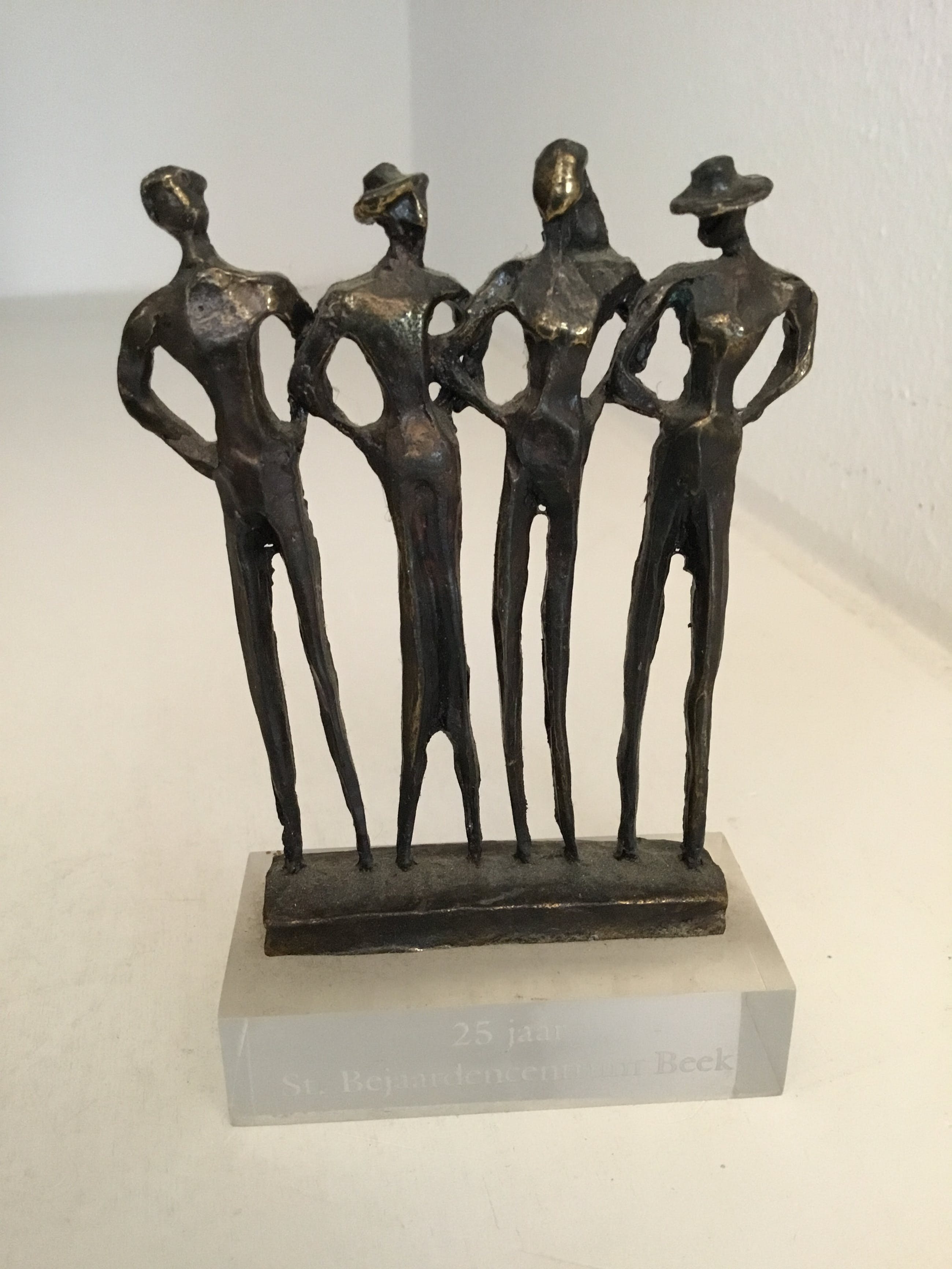 Fraai sculptuur van vier mensfiguren die gearmd samen op weg zijn. Kunstenares : Corry Ammerlaan Materiaal : Brons op voet van kunststof waarin een inscriptie staat. Het beeld verkeert in goede staat en wordt zorgvuldig verpakt en aangetekend verzonden .