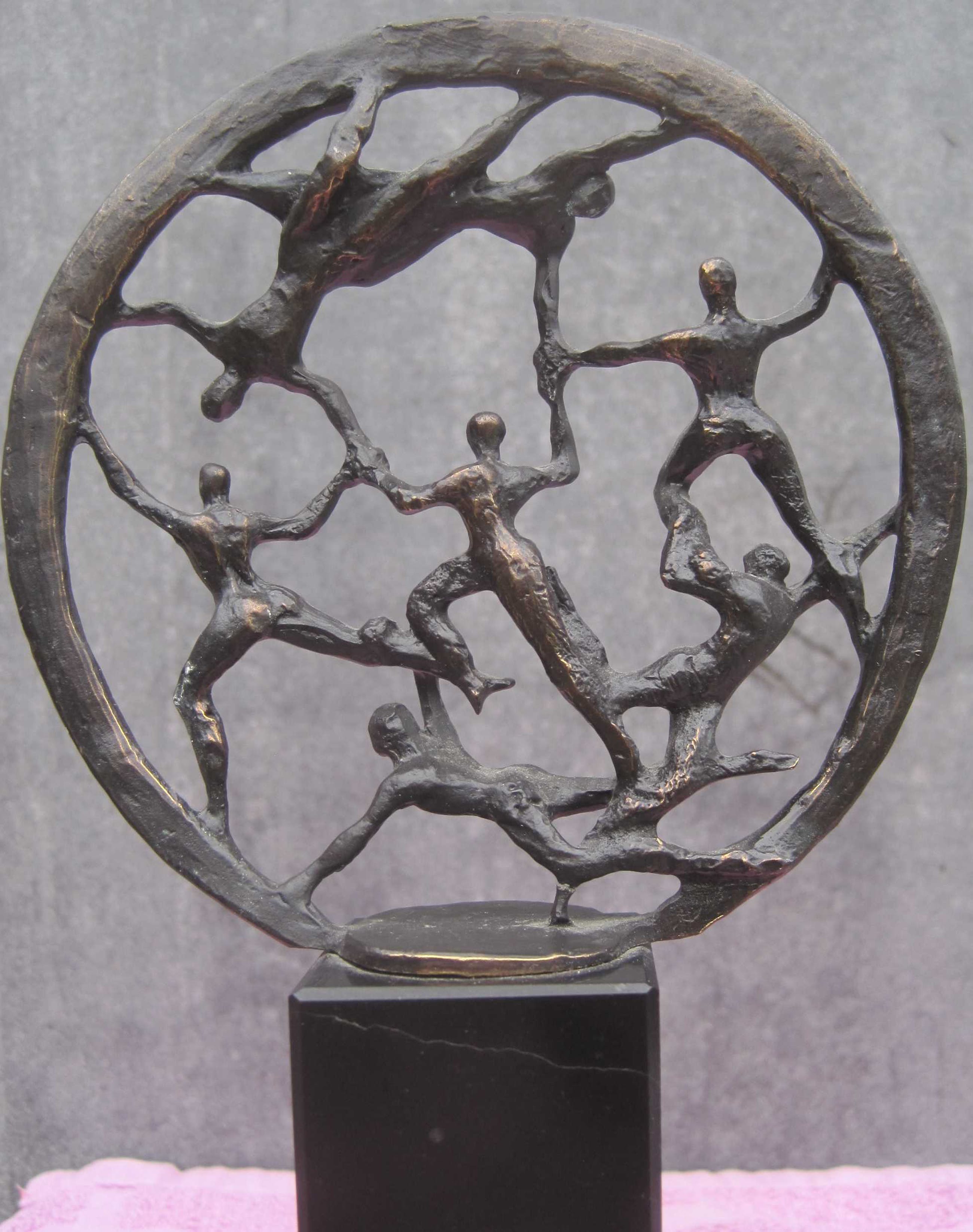 Een prachtig beeldje van een 7 mensen binnen een cirkel die elkaar vasthouden en of vooruit helpen. Ongesigneerd, maar ongetwijfeld van de hand van Corry Ammerlaan- van Niekerk. De afmetingen van het beeldje zonder de sokkel zijn 12 cm diameter en met een dikte van 2 cm.