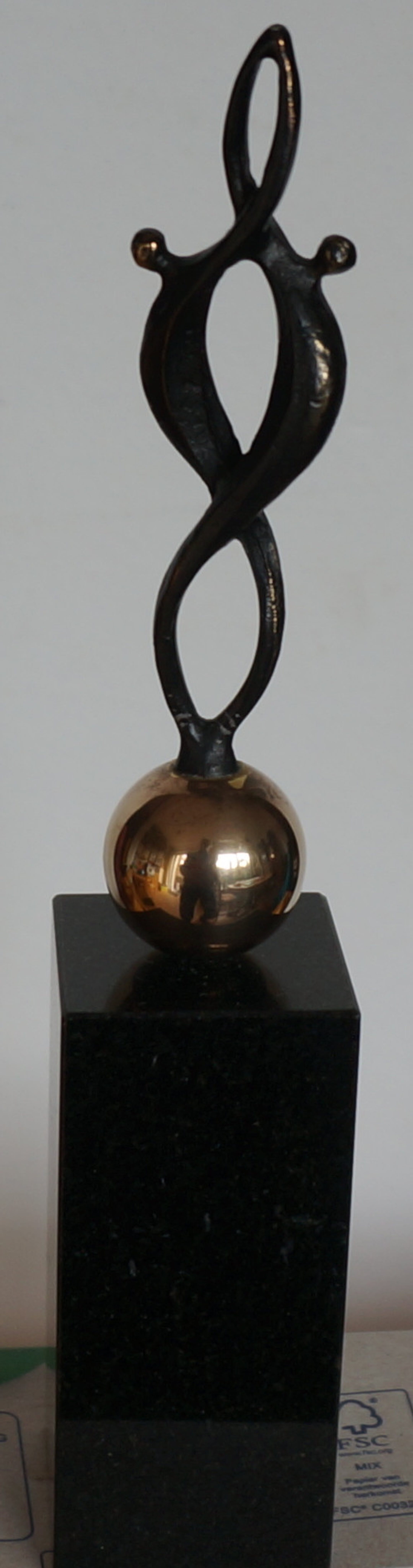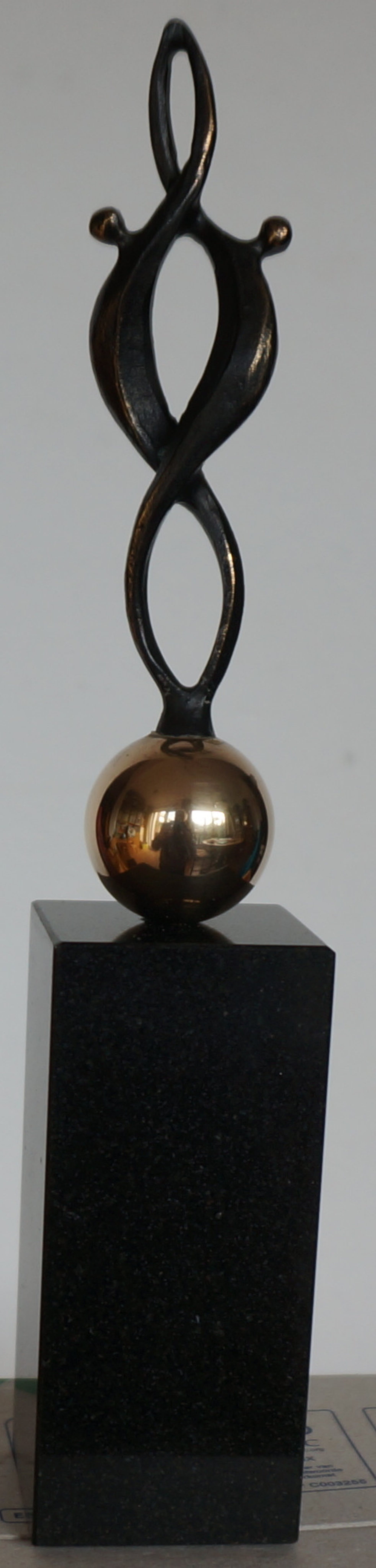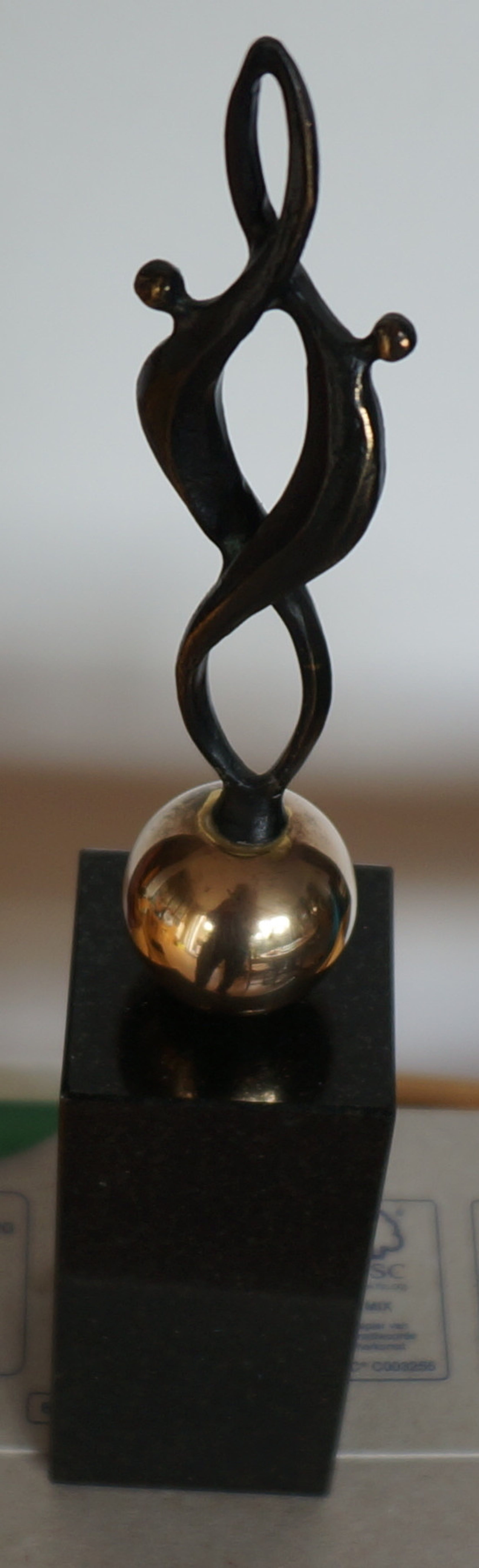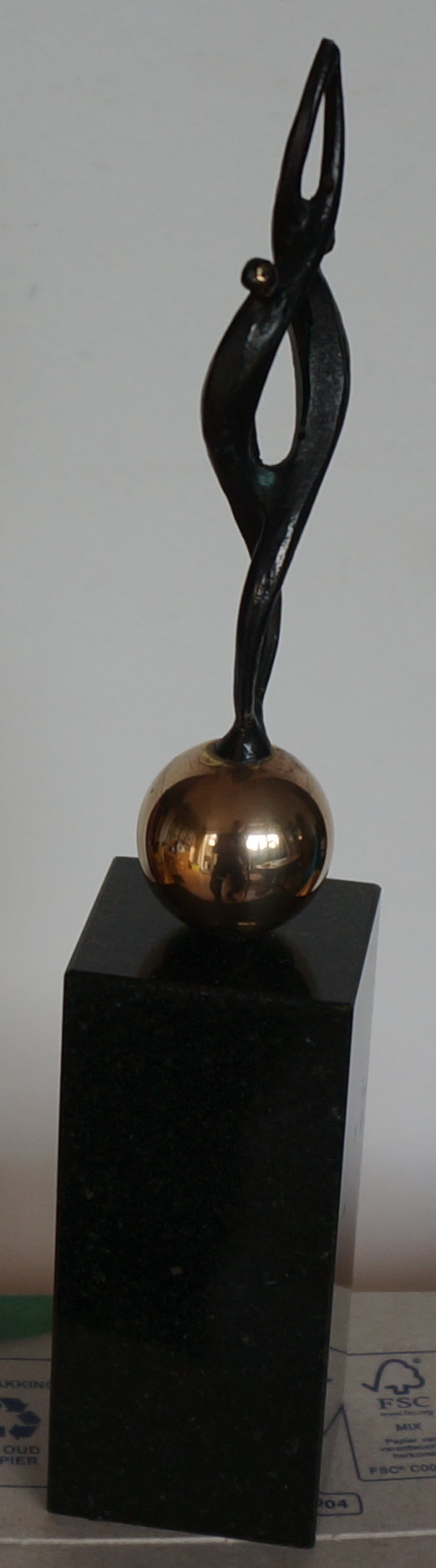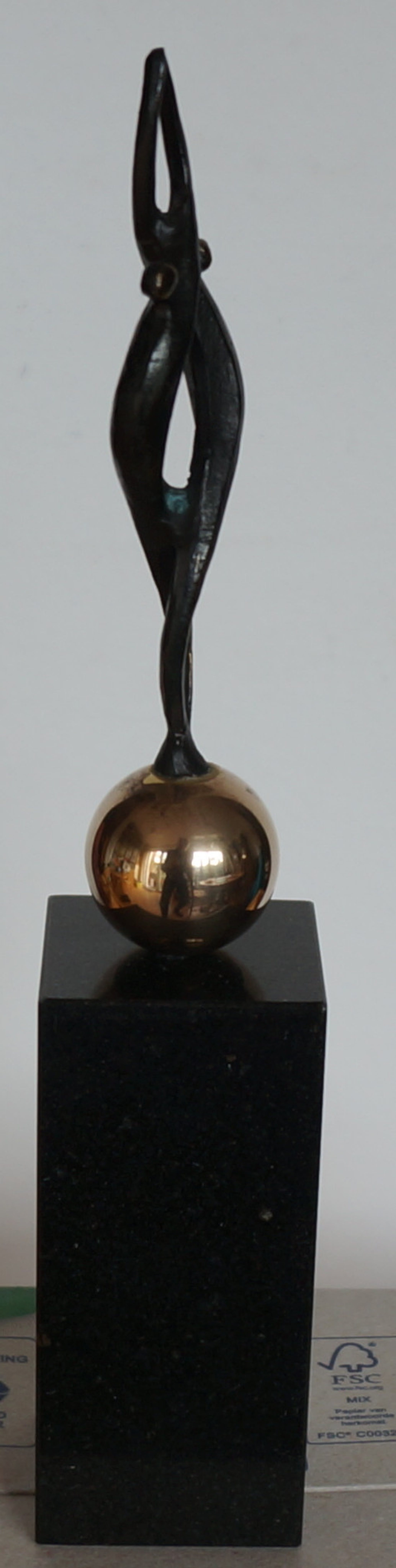 Bijzonder sierlijke verbronsde sculptuur van een van twee verstrengelde figuren op een "gouden" bol, die gezien kunnen worden als symbool van een wereld in gelukkige harmonie