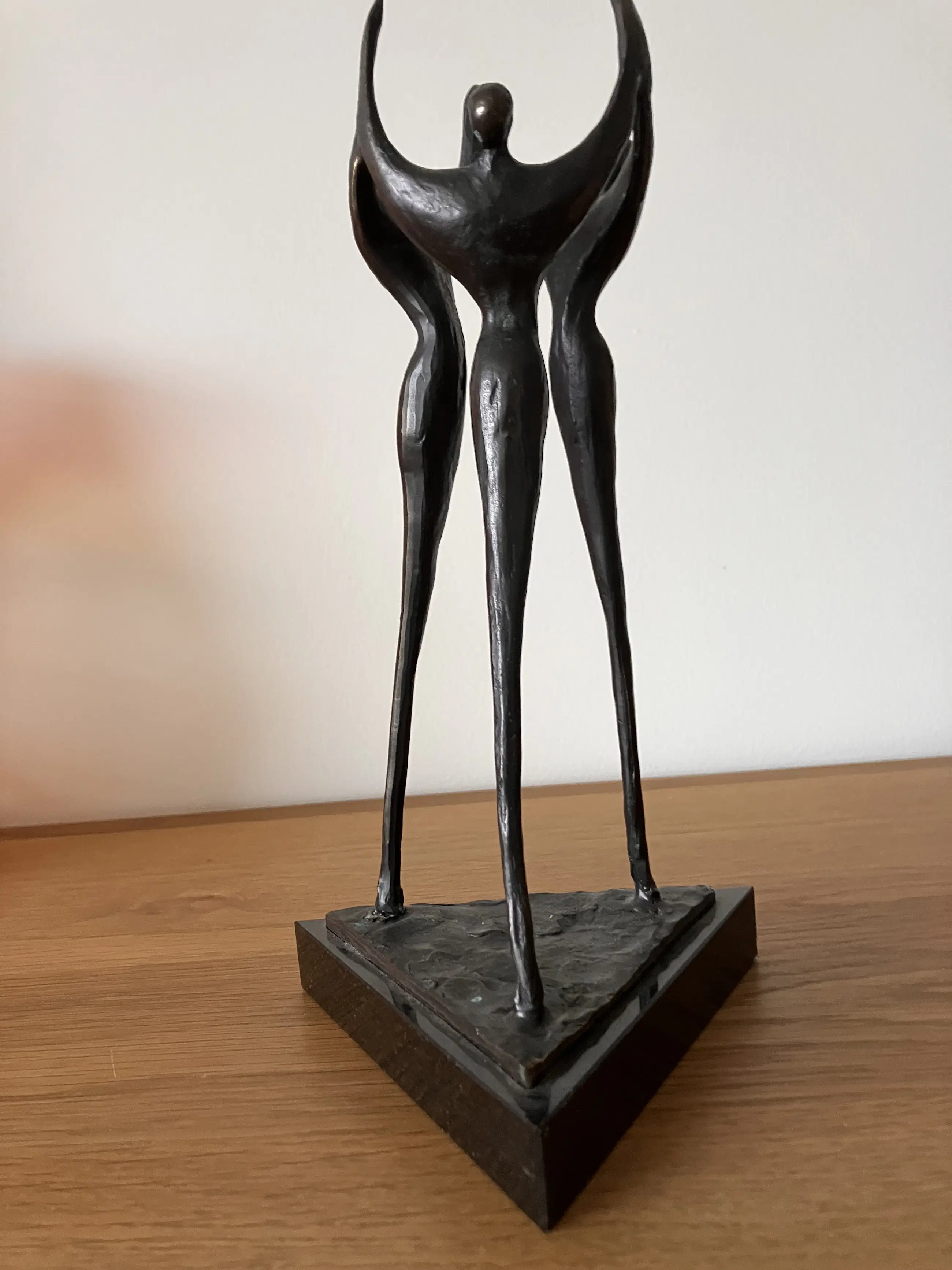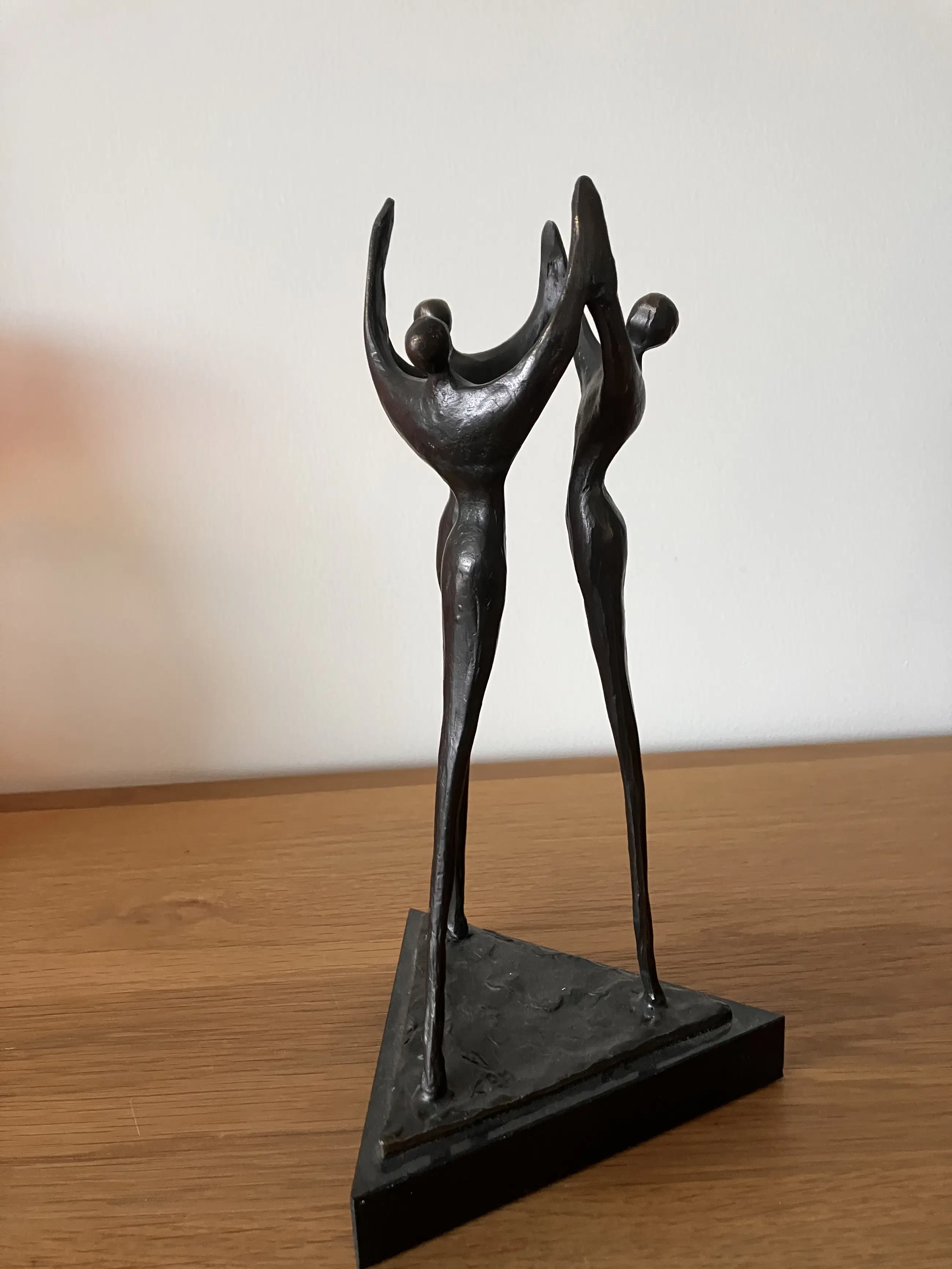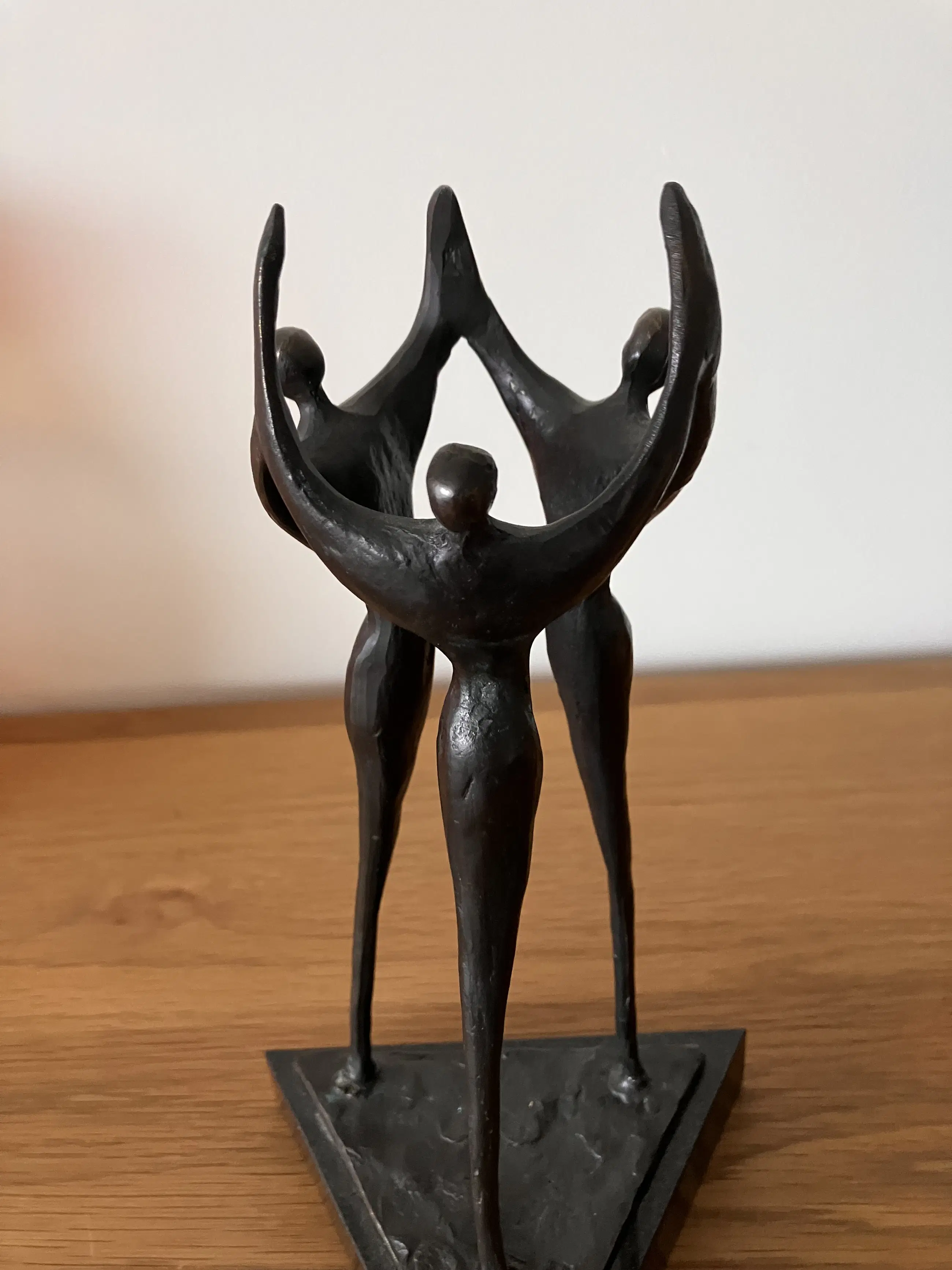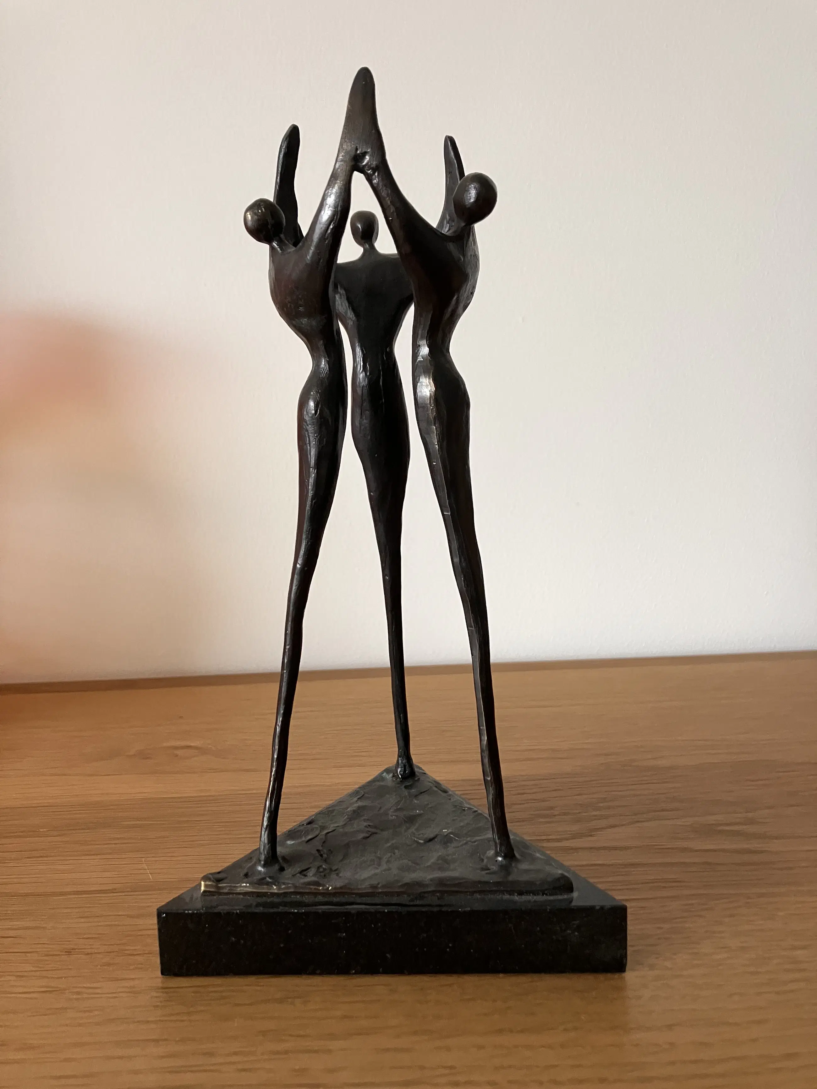 Op zwarte driehoekige natuurstenen sokkel staan drie personen in triomfantelijke stemming