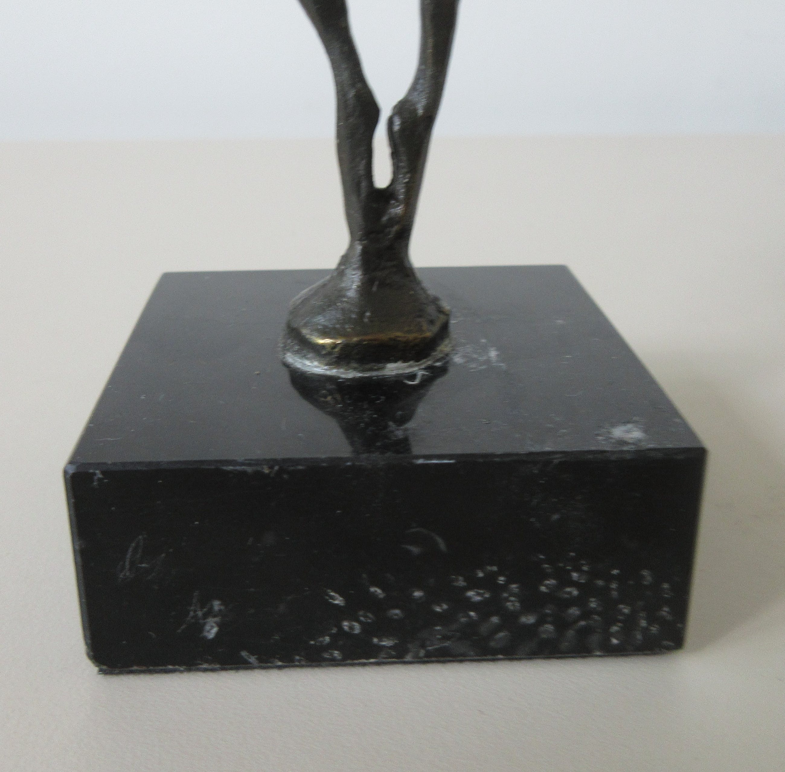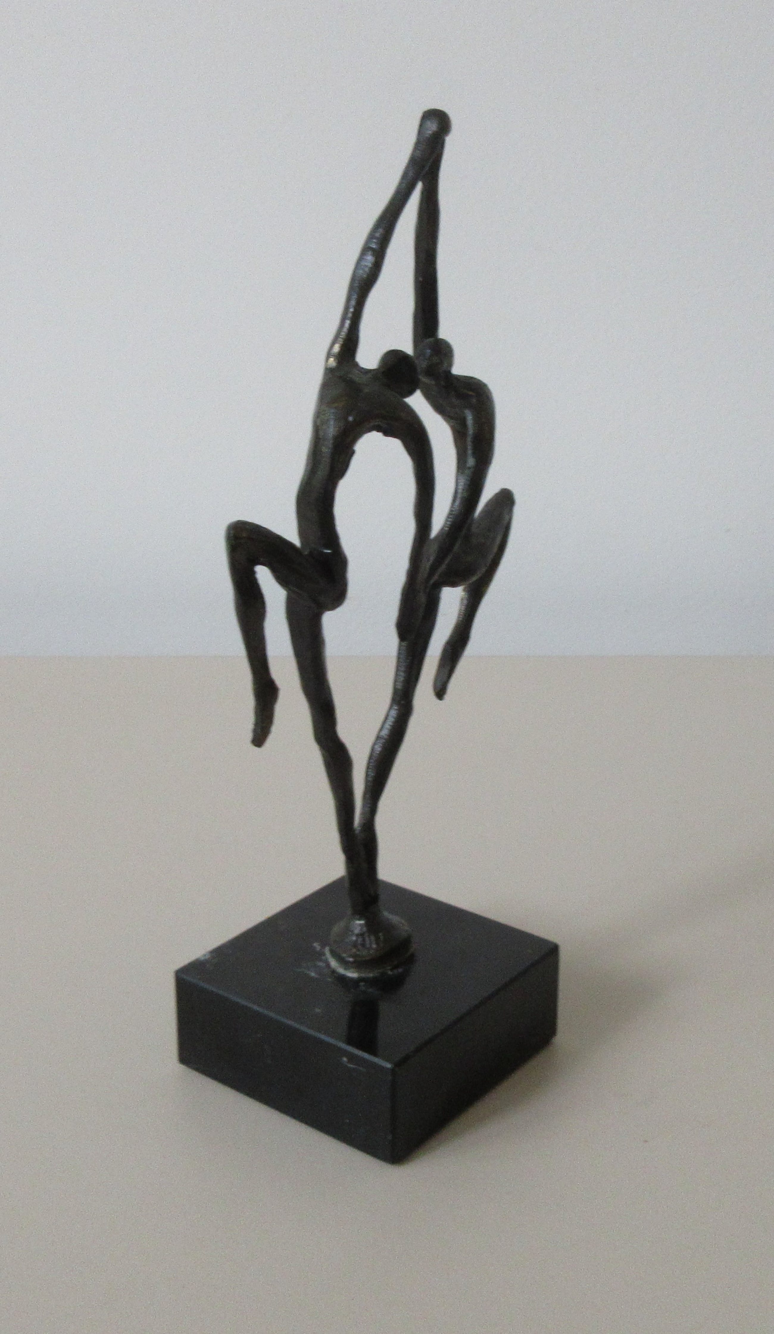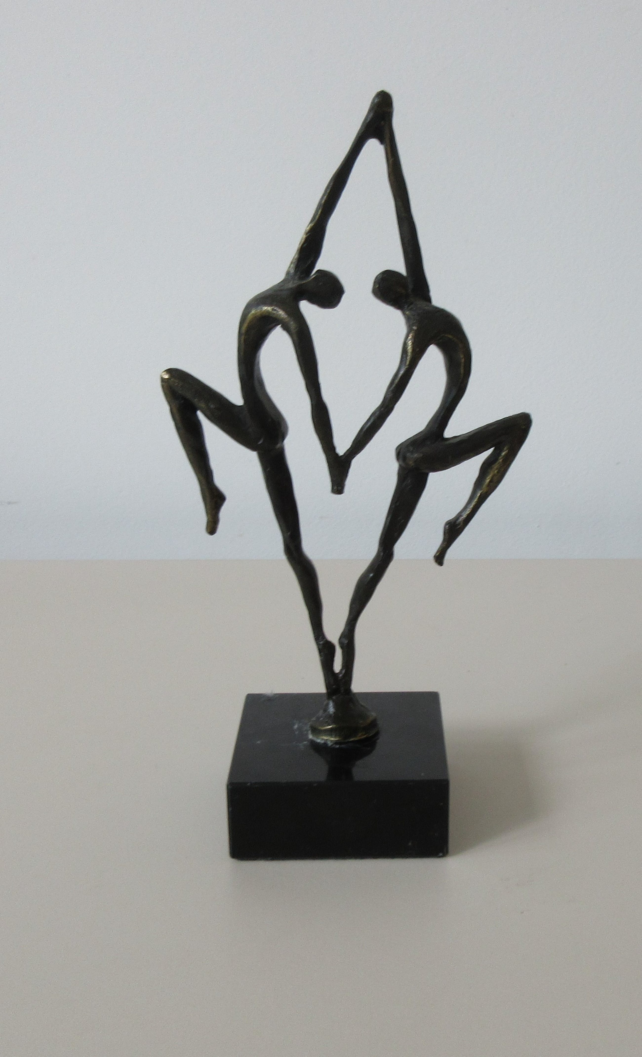 Fraai beeldje van twee dansers, van Corrie Ammerlaan -Van Niekerk voor Artihove. Het beeldje is gemaakt van een verbronsde tinlegering en staat op een natuurstenen sokkel. En is gesigneerd op de voet CAM.