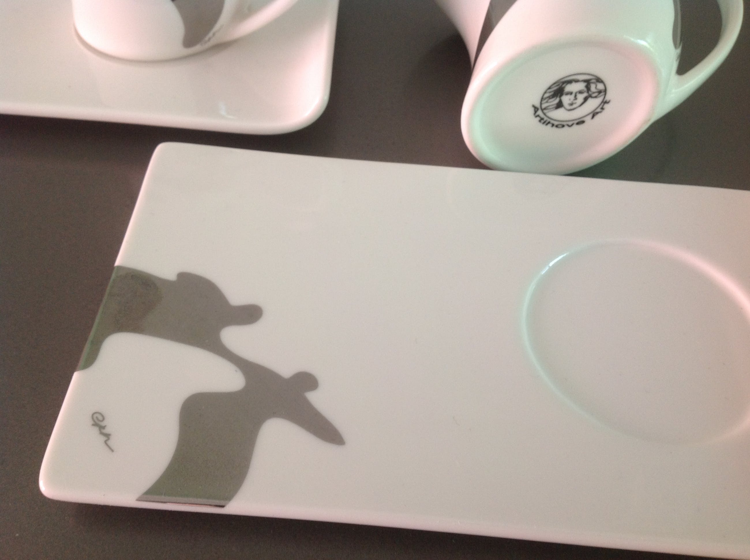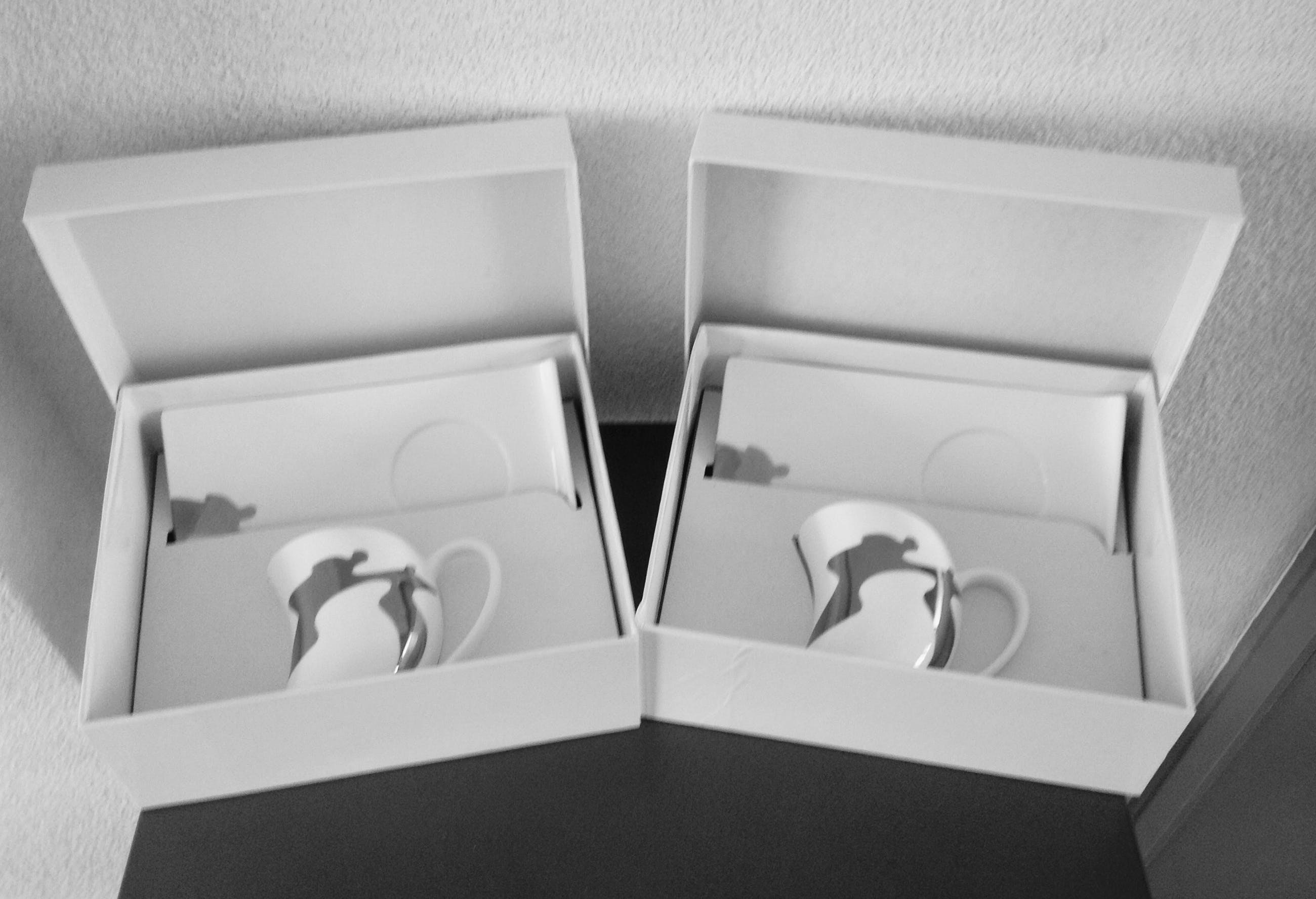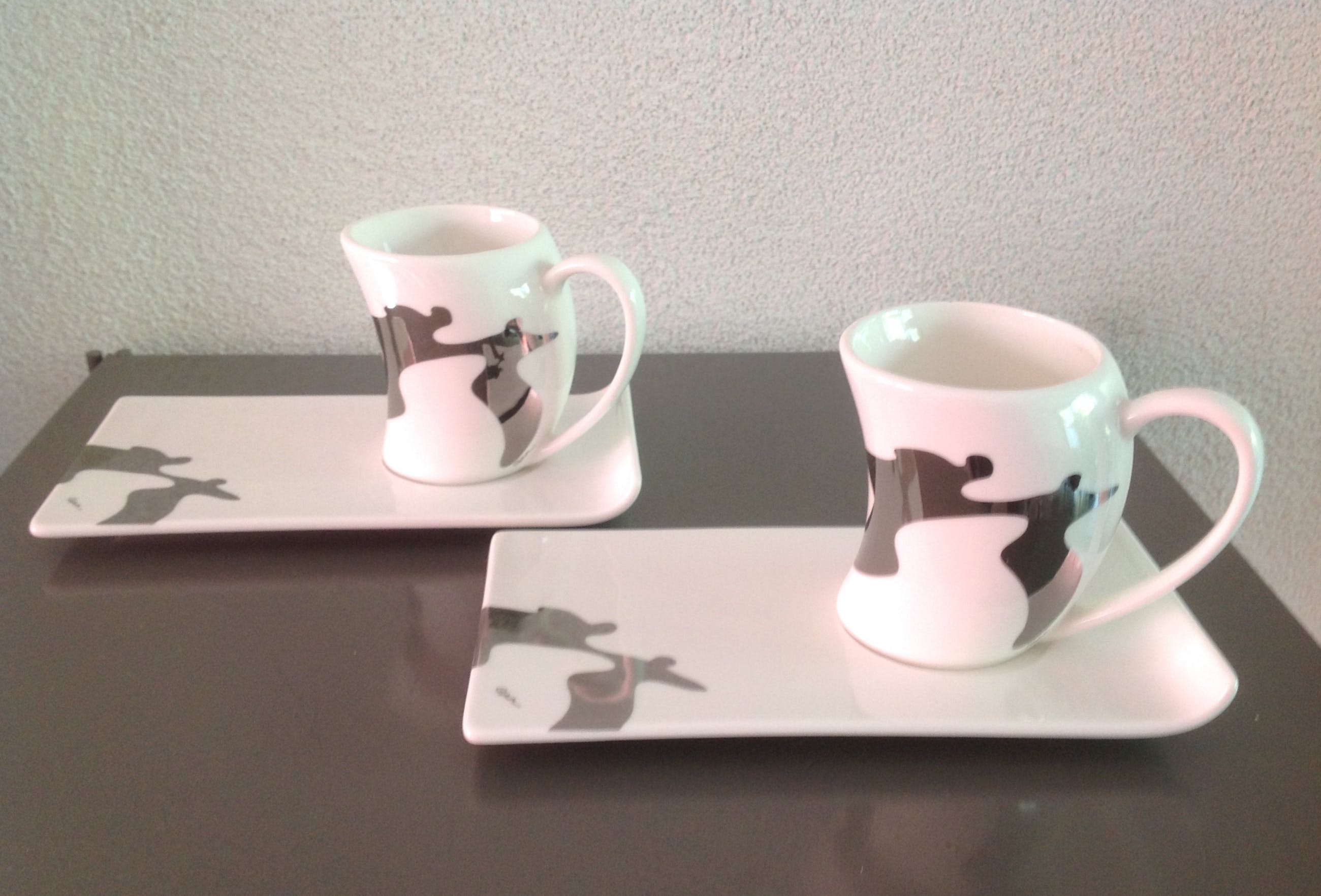 Twee porseleinen kop en schotels met zilveren opdruk van Corry Ammerlaan.Zowel het kopje als de schotel zijn gesigneerd.