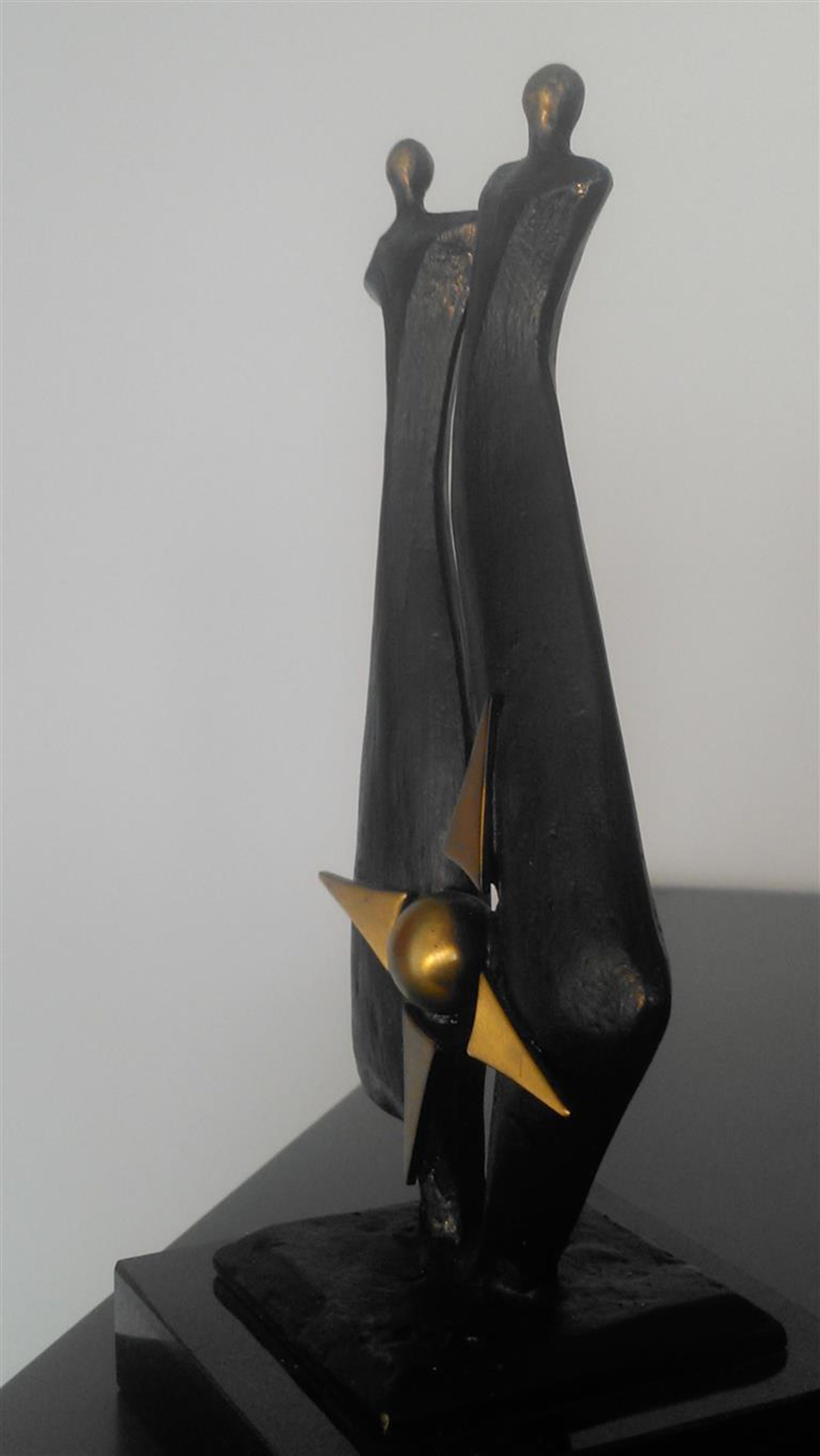 Echt prachtig (zwaar) beeld van twee personen met kompasster op een plateau , op marmeren sokkel !