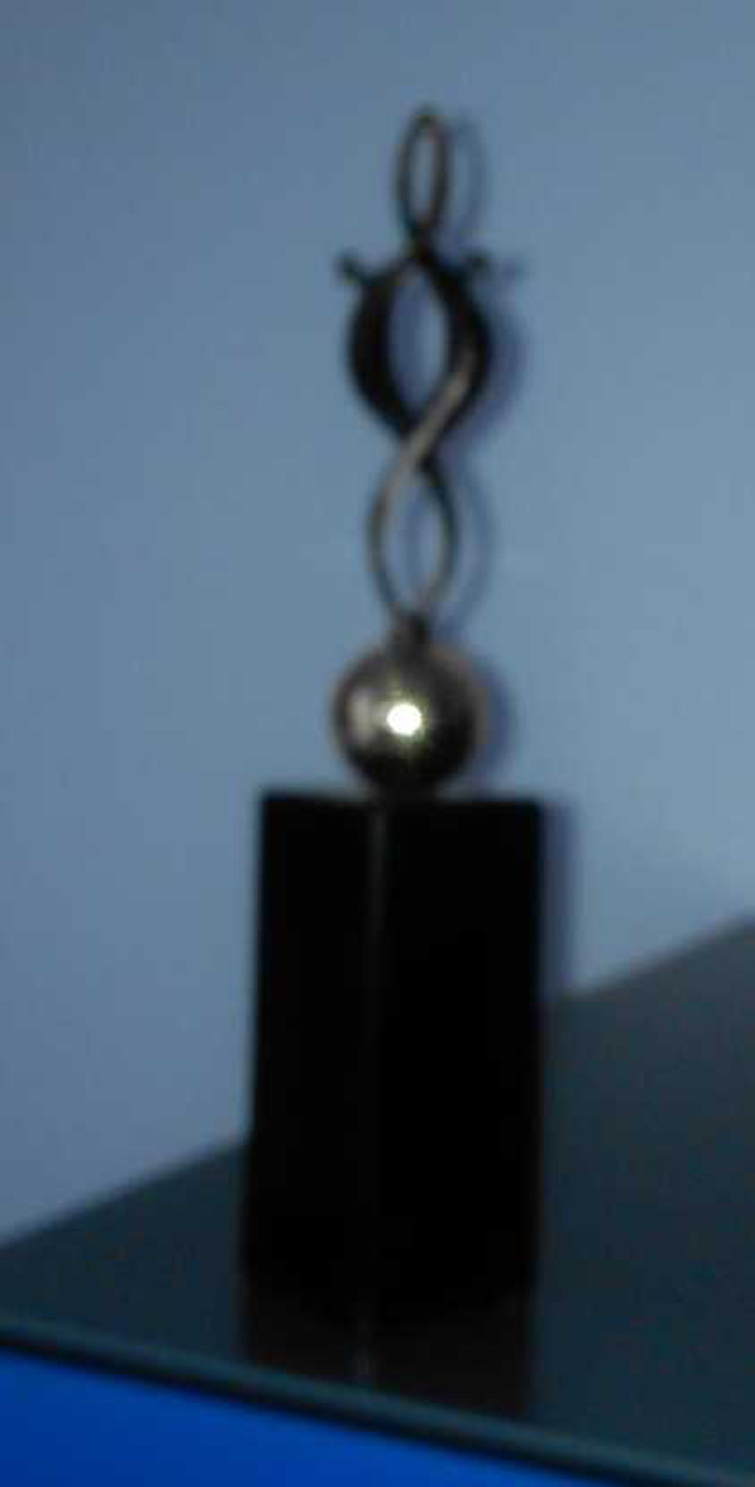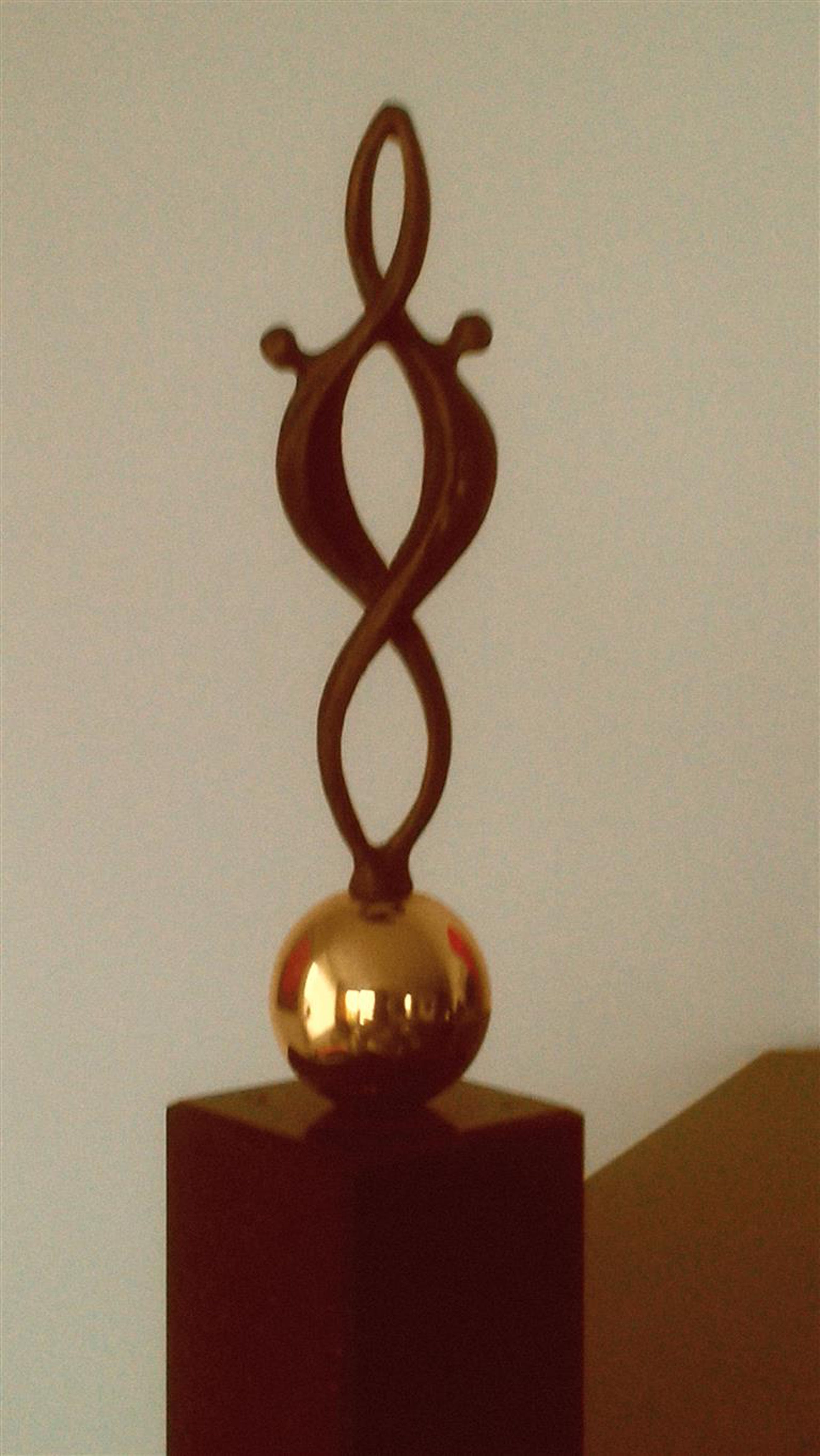 Op natuurstenen sokkel 3,5 x 3,5 x 8 cm aan onderzijde gemerkt Artihove deze gouden bol met daarop twee personen. Corry Ammerlaan van Niekerk is kunstenaar en kunstzinnig directrice van Artihove