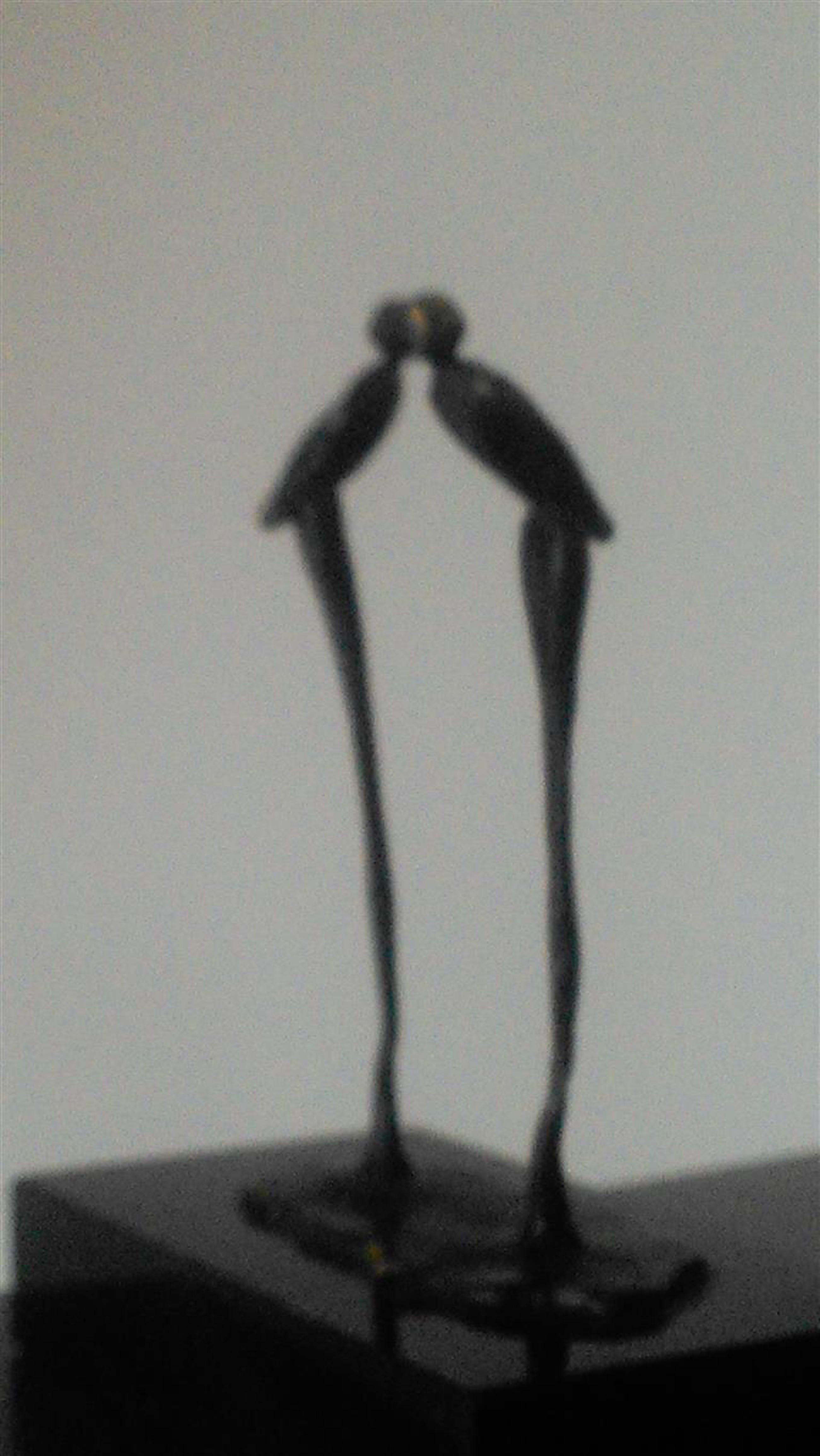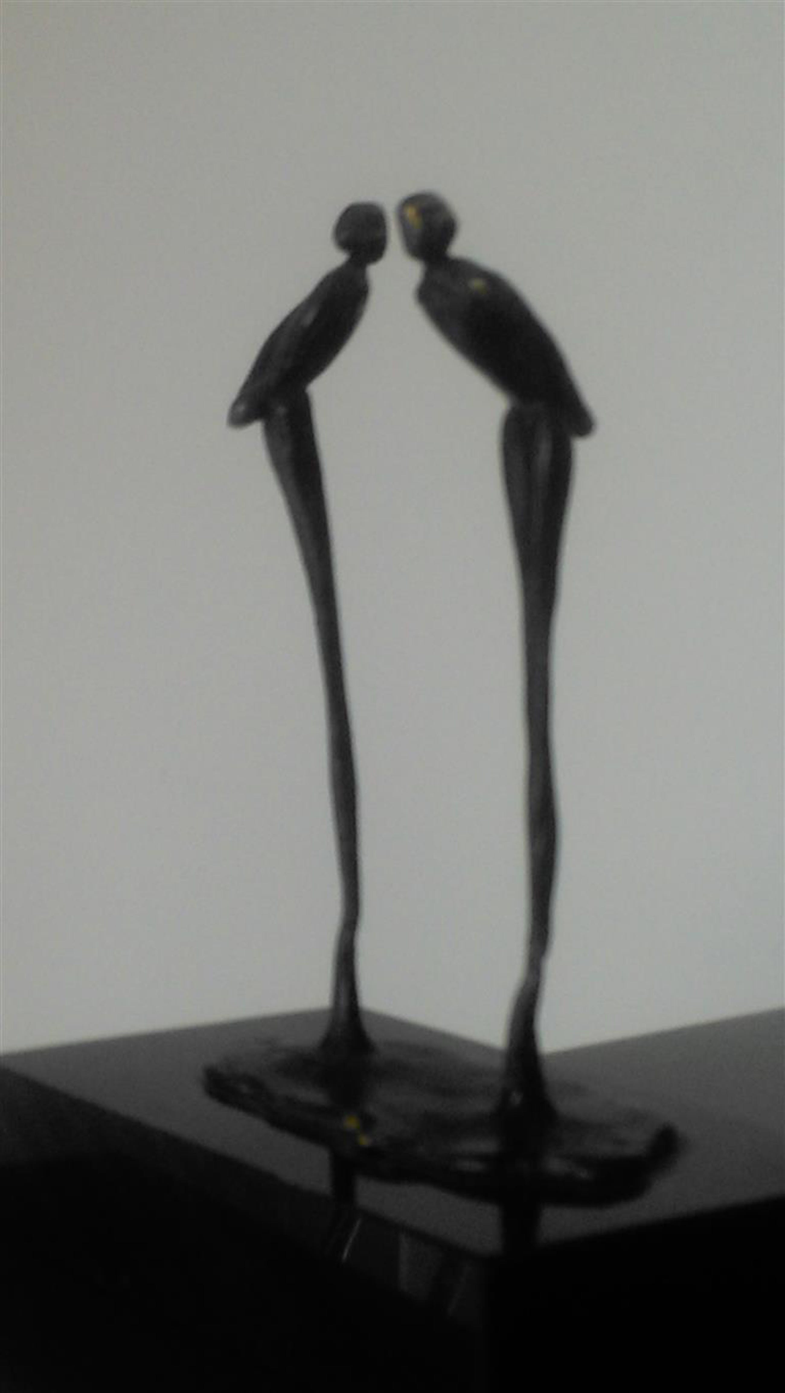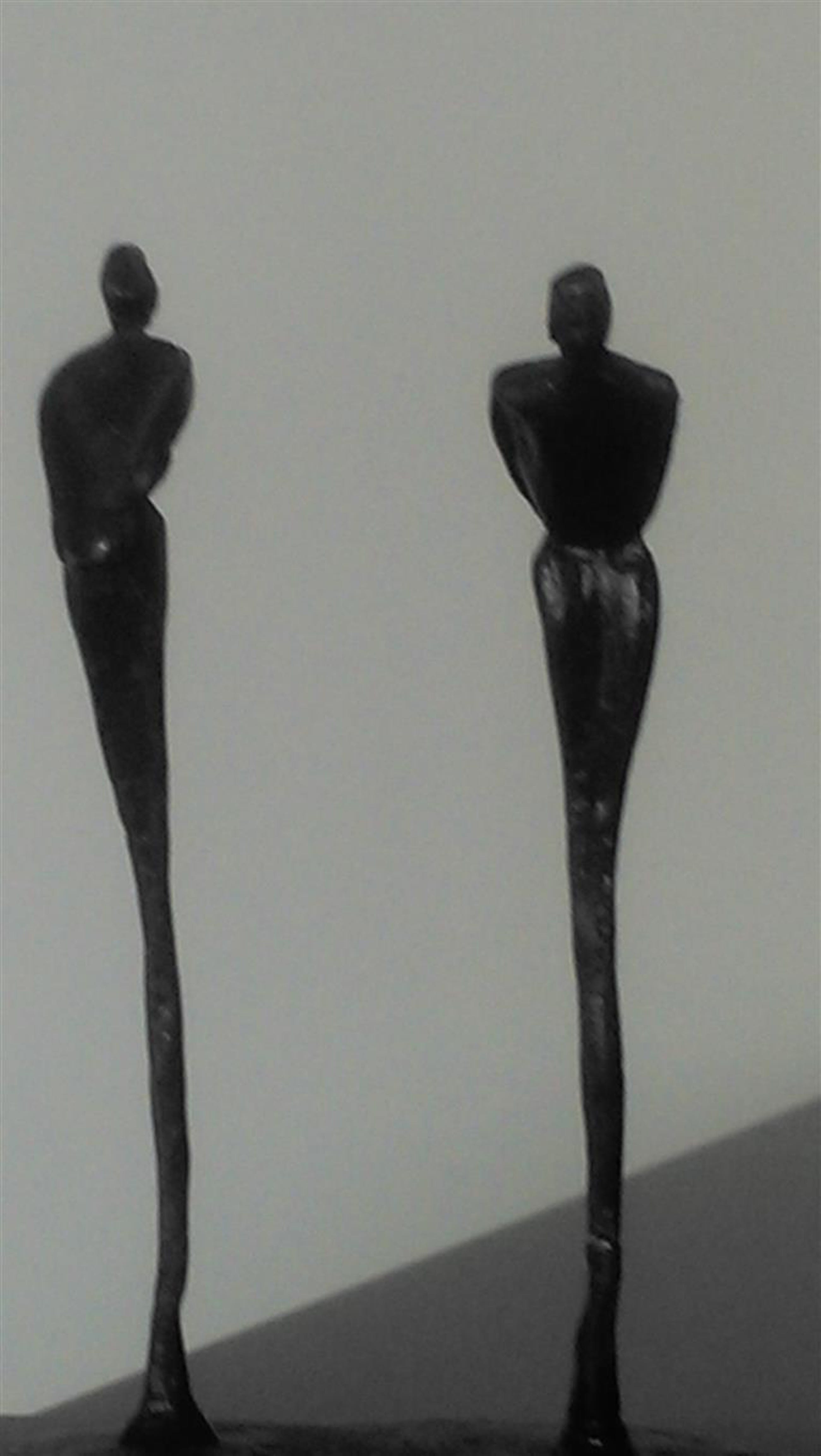 Twee fragiele personen in dezelfde houding, armen op de rug, kijken eenieder de andere kant op. Op gesigneerd CAN plateau op natuurstenen sokkel