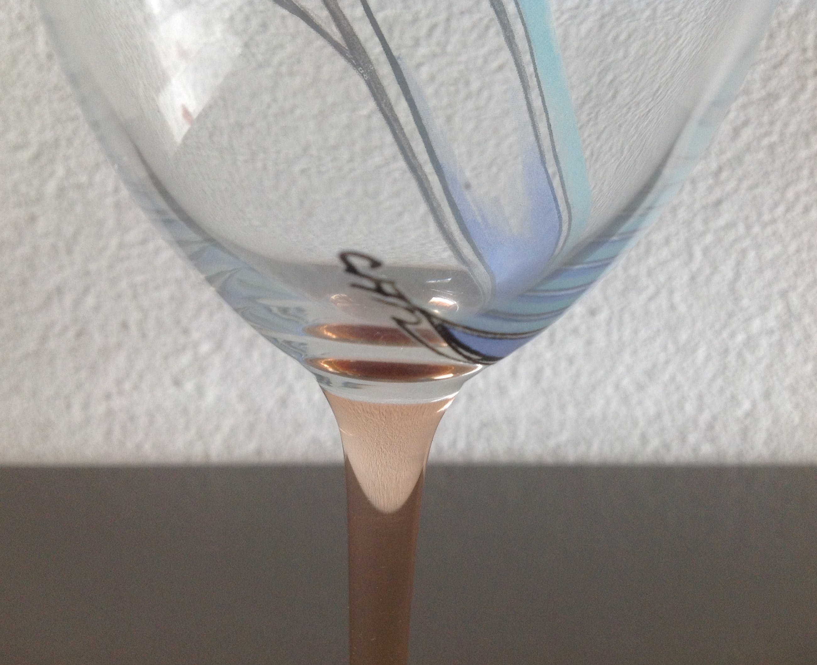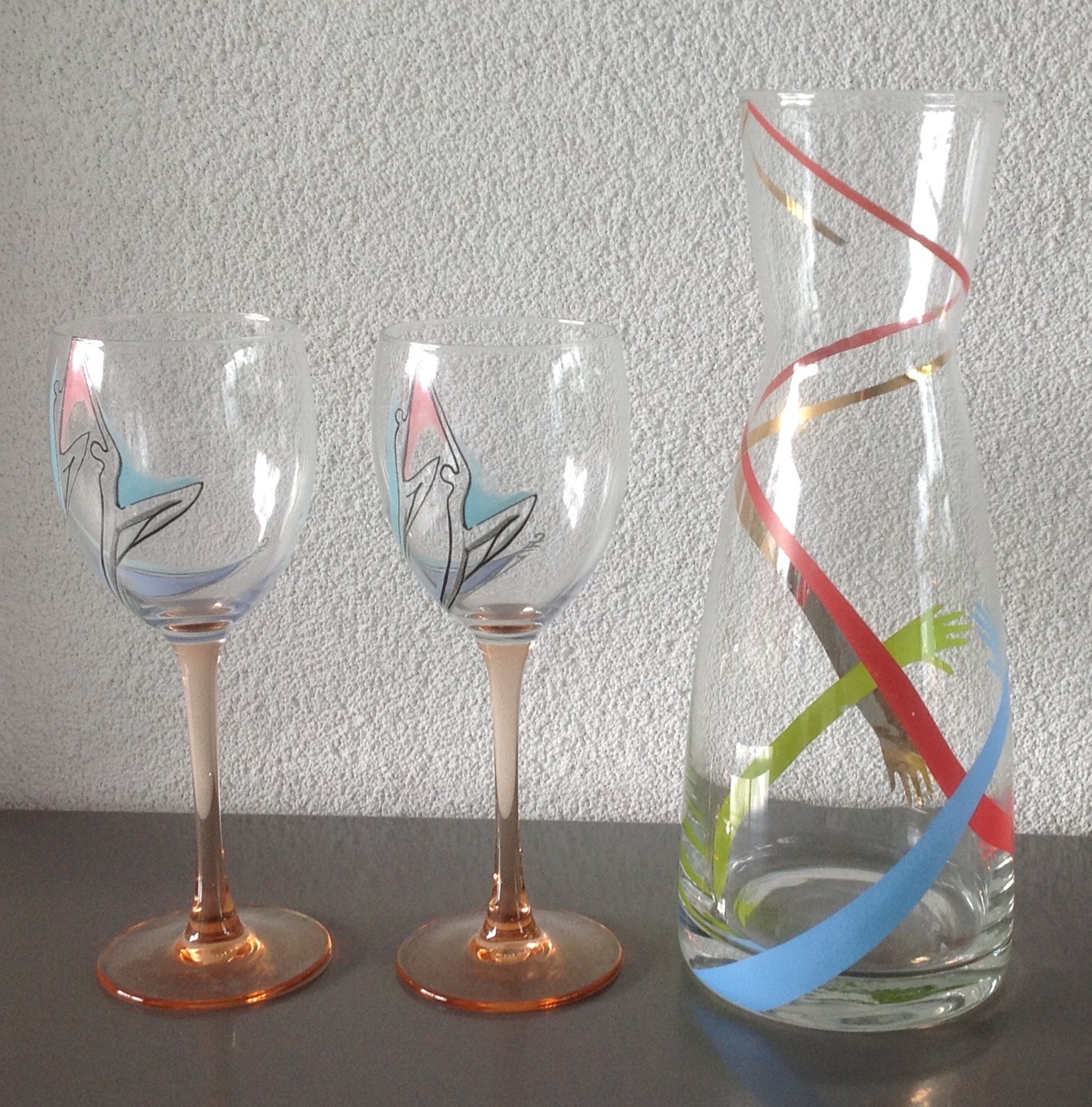 Twee glazen en een karaf met de kenmerkende Corry Ammerlaan afbeeldingen.De glazen zijn 19 cm hoog en gesigneerd met CAN.De karaf is 26 cm hoog.