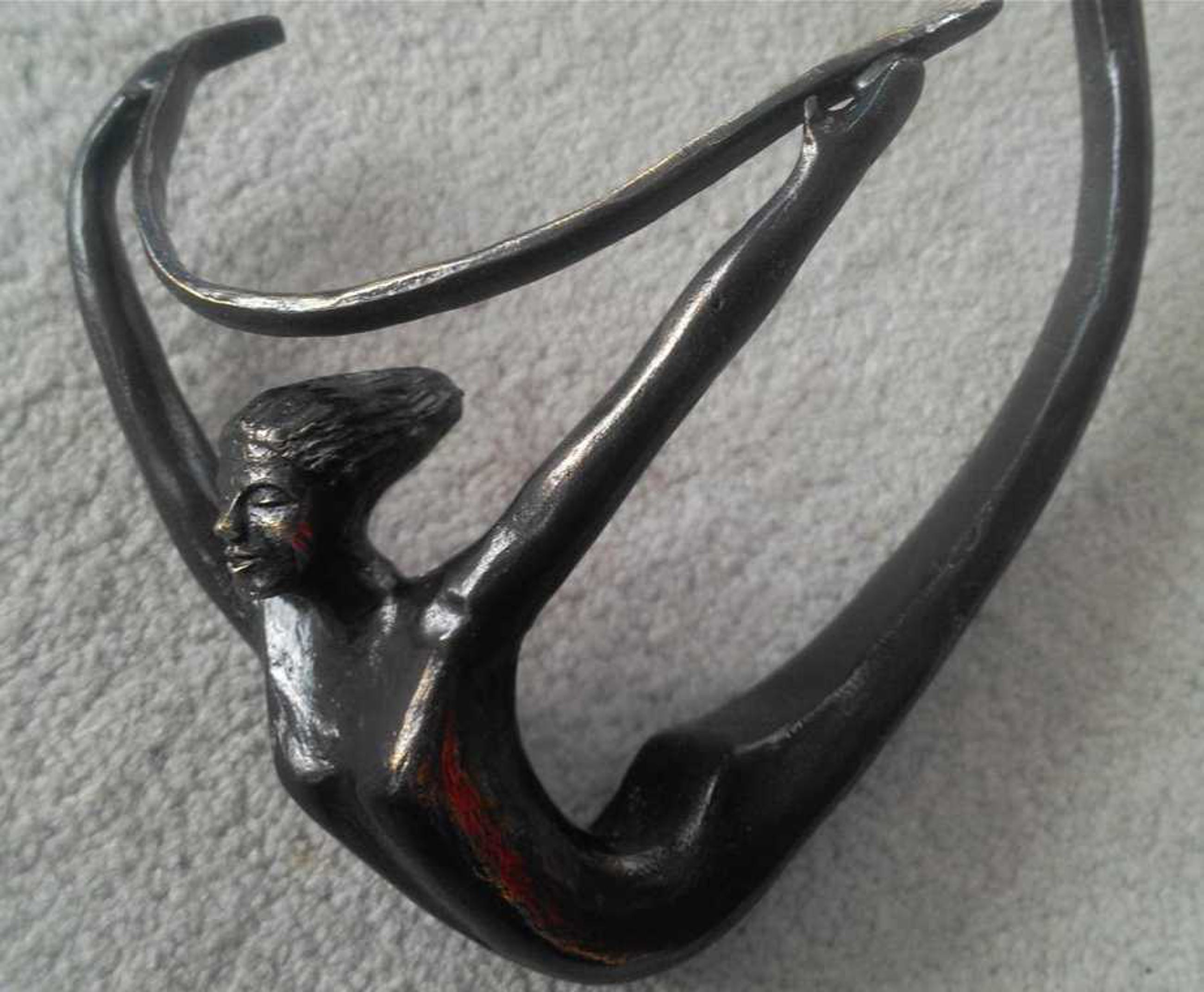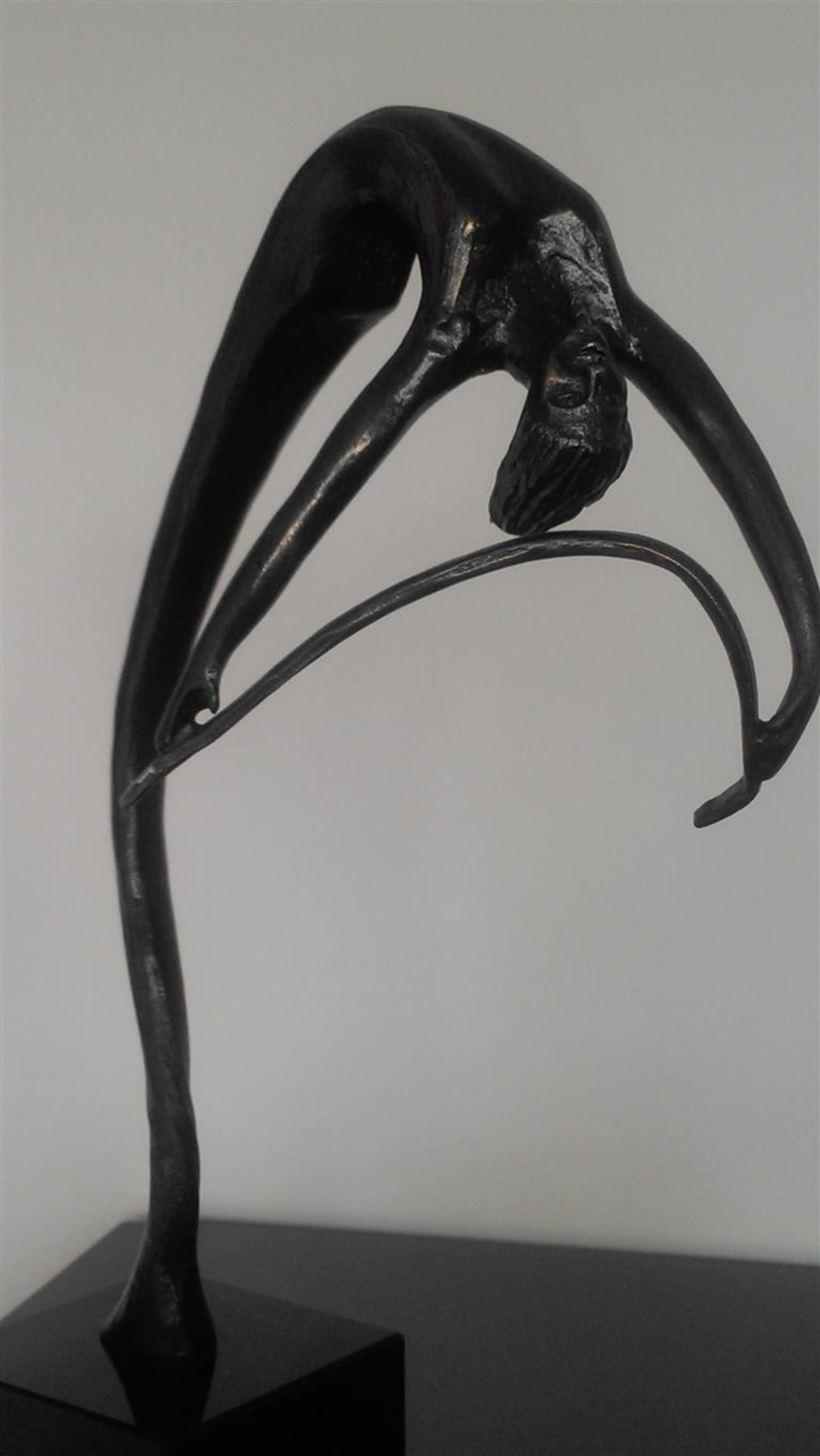 Gemerkt aan de bodemzijde van de sokkel Artihove waar Corry Ammerlaan van Niekerk de kunstzinnige directeur is en zij is tevens beeldhouwster Beeld met beweging op natuurstenen zwarte sokkel 8 x 6 x 6 cm