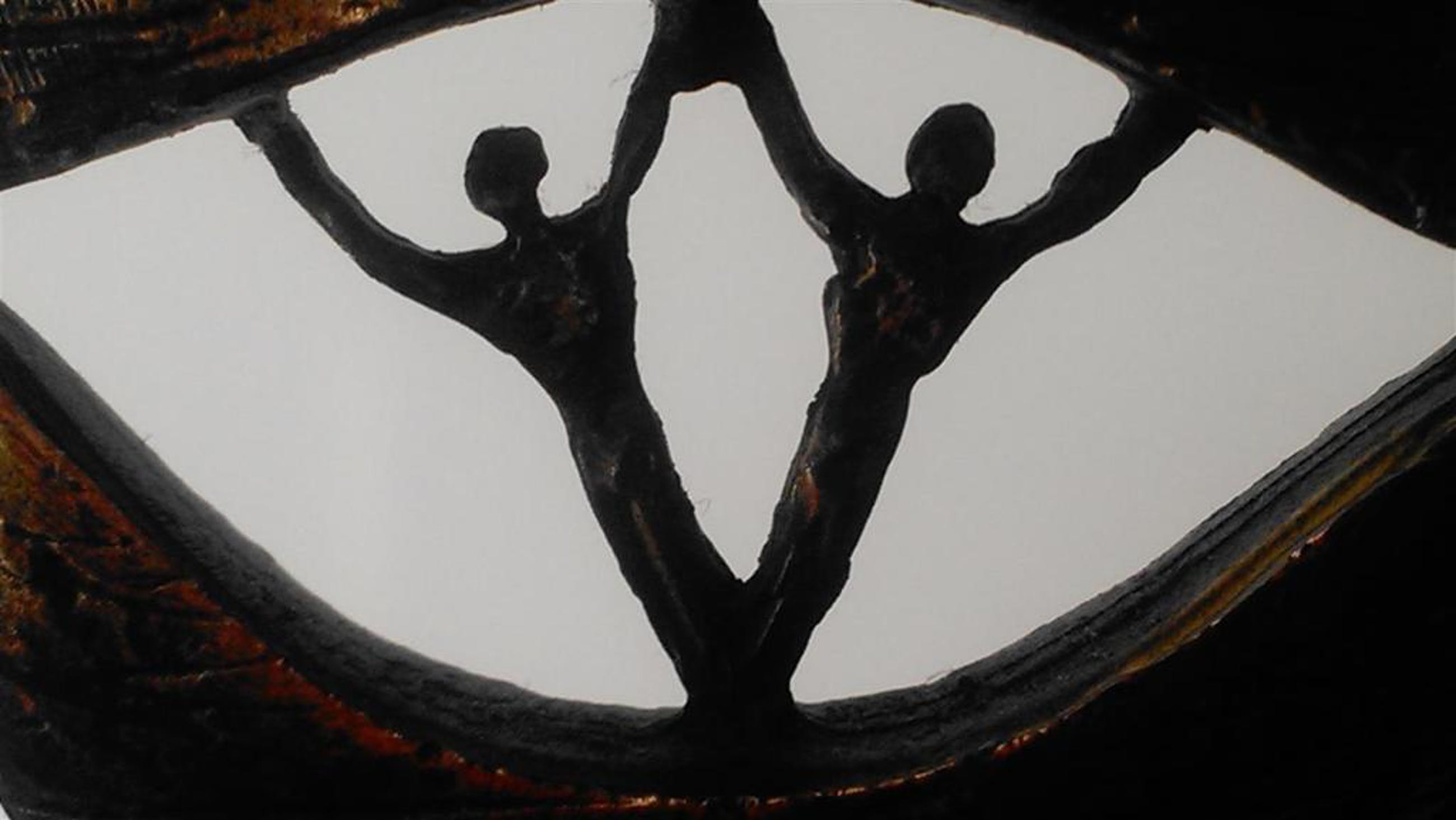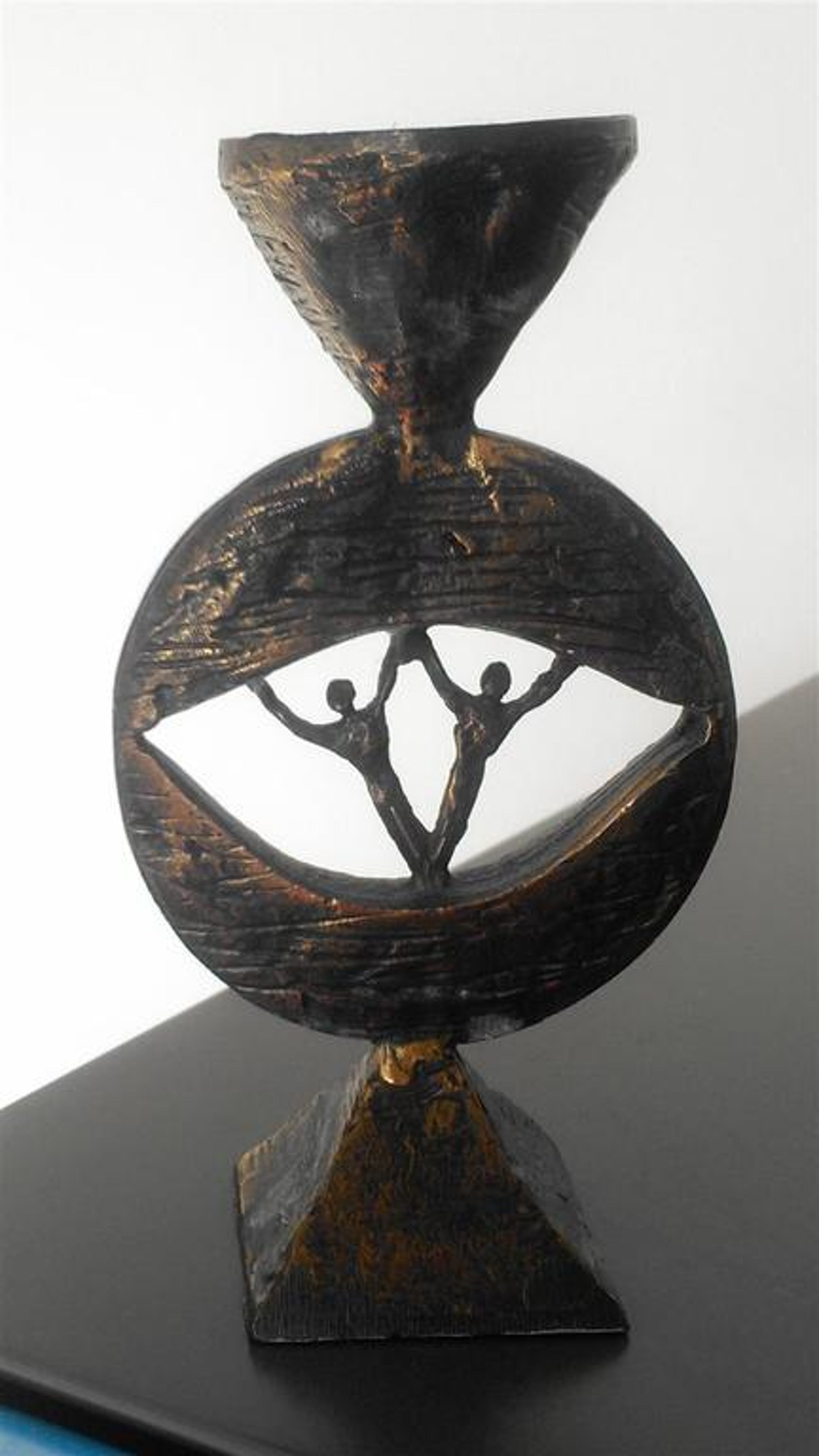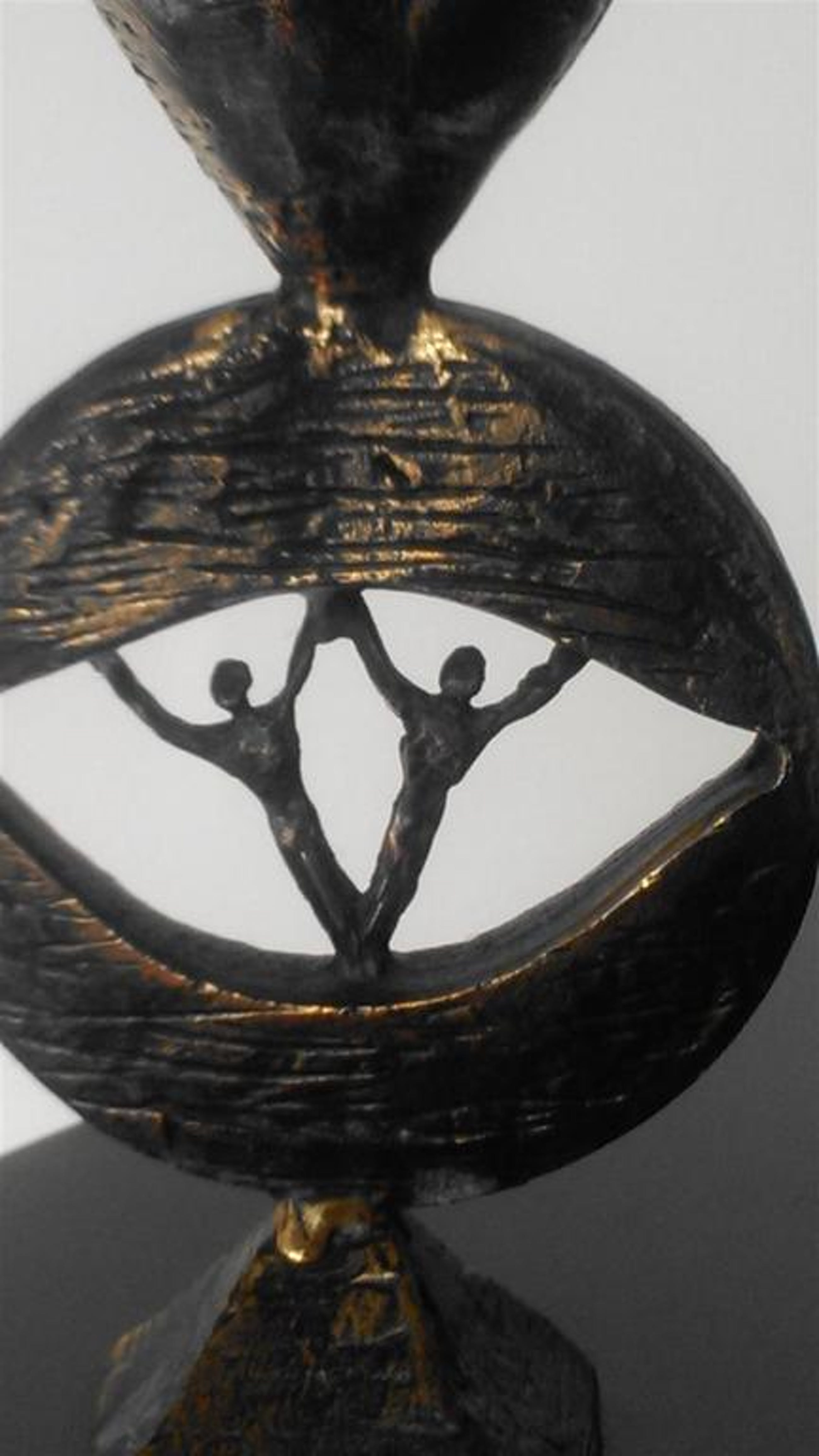 Solide bronzen kandelaar 13 cm hoog met fijne decoratie van twee personen