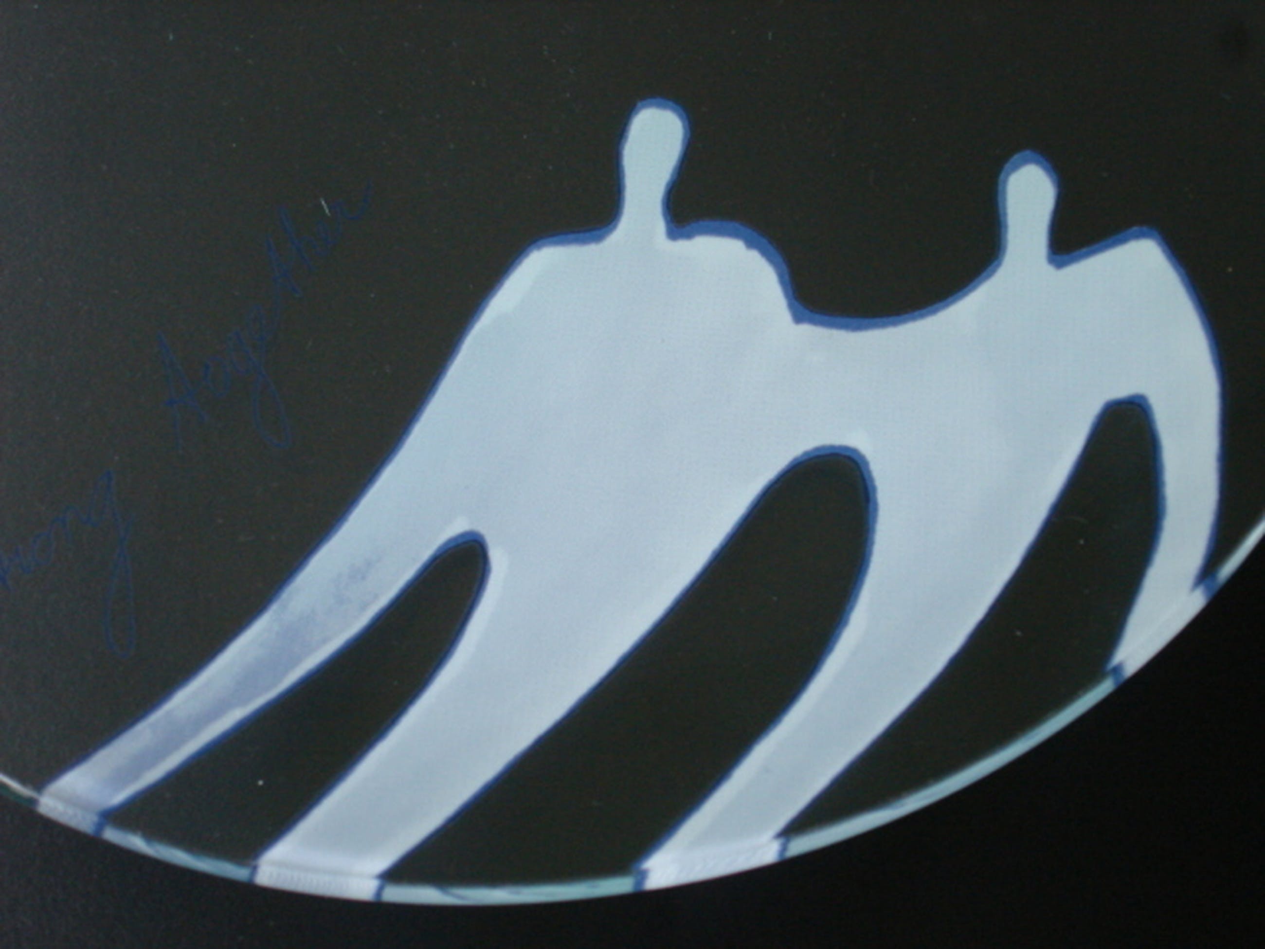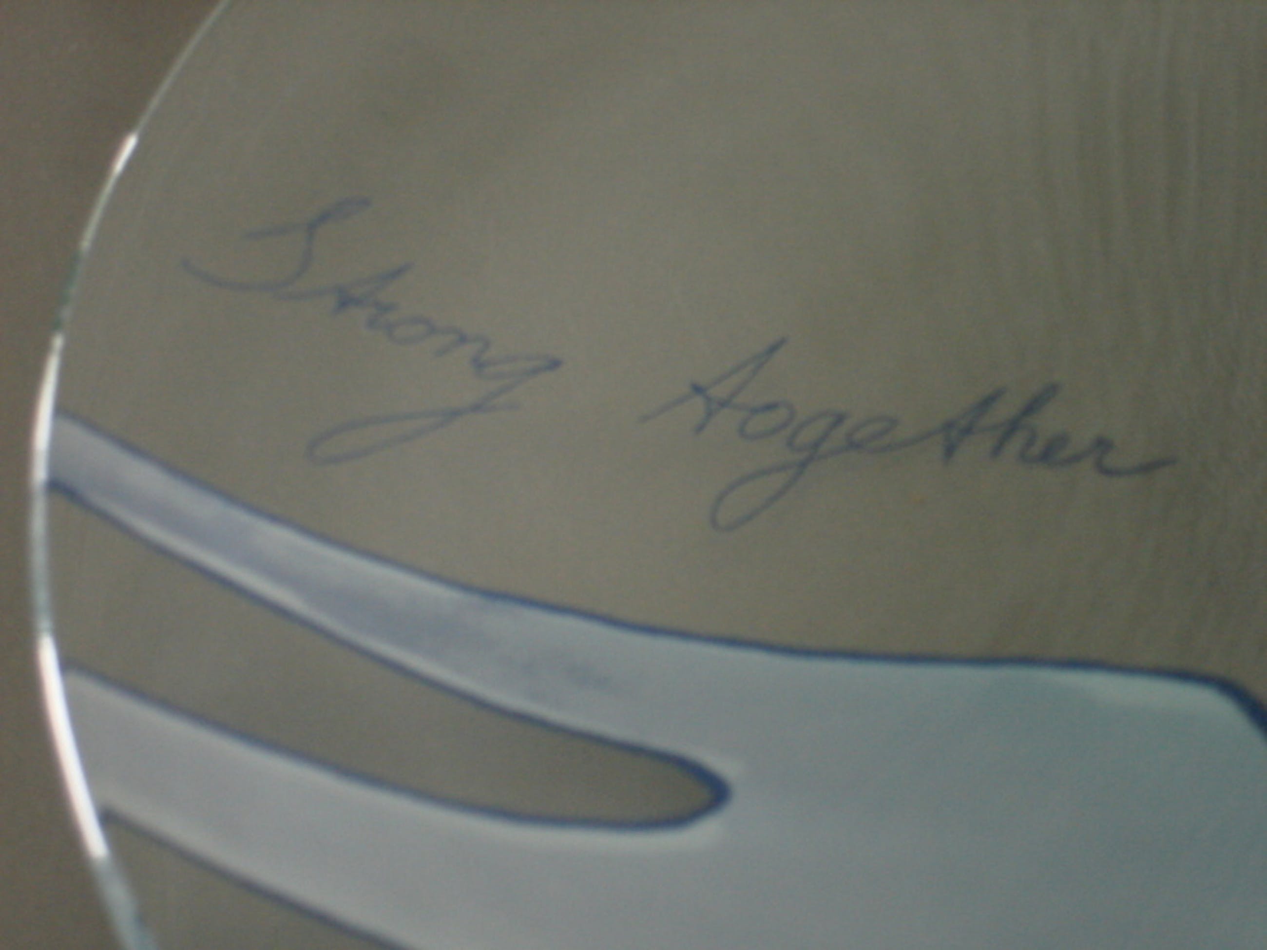 De schaal heeft een gestileerde afbeelding van twee personen met als tekst Strong together.