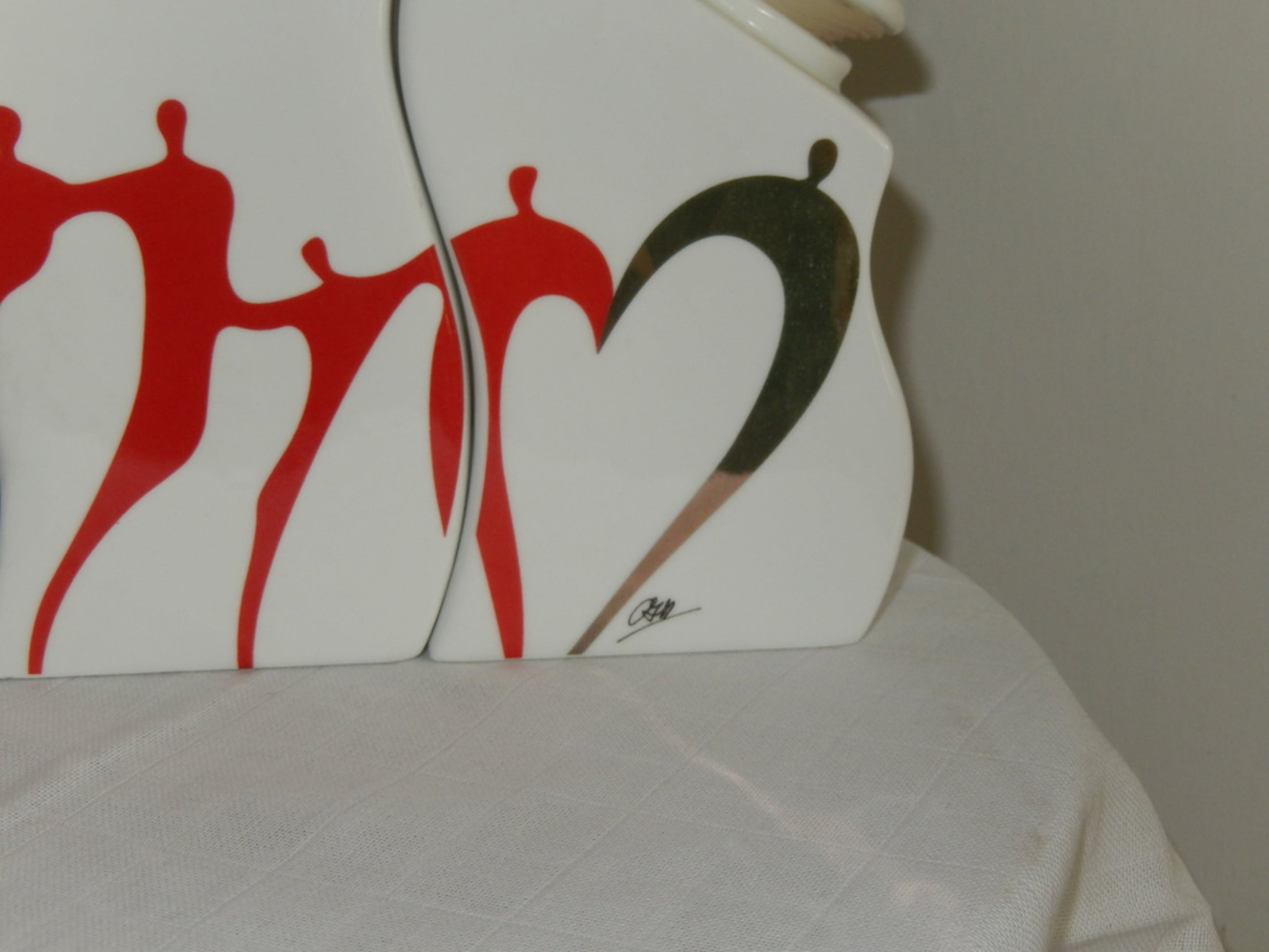 Wit met rood/zilveren dessin van mensfiguren in typerende CAN stijl.