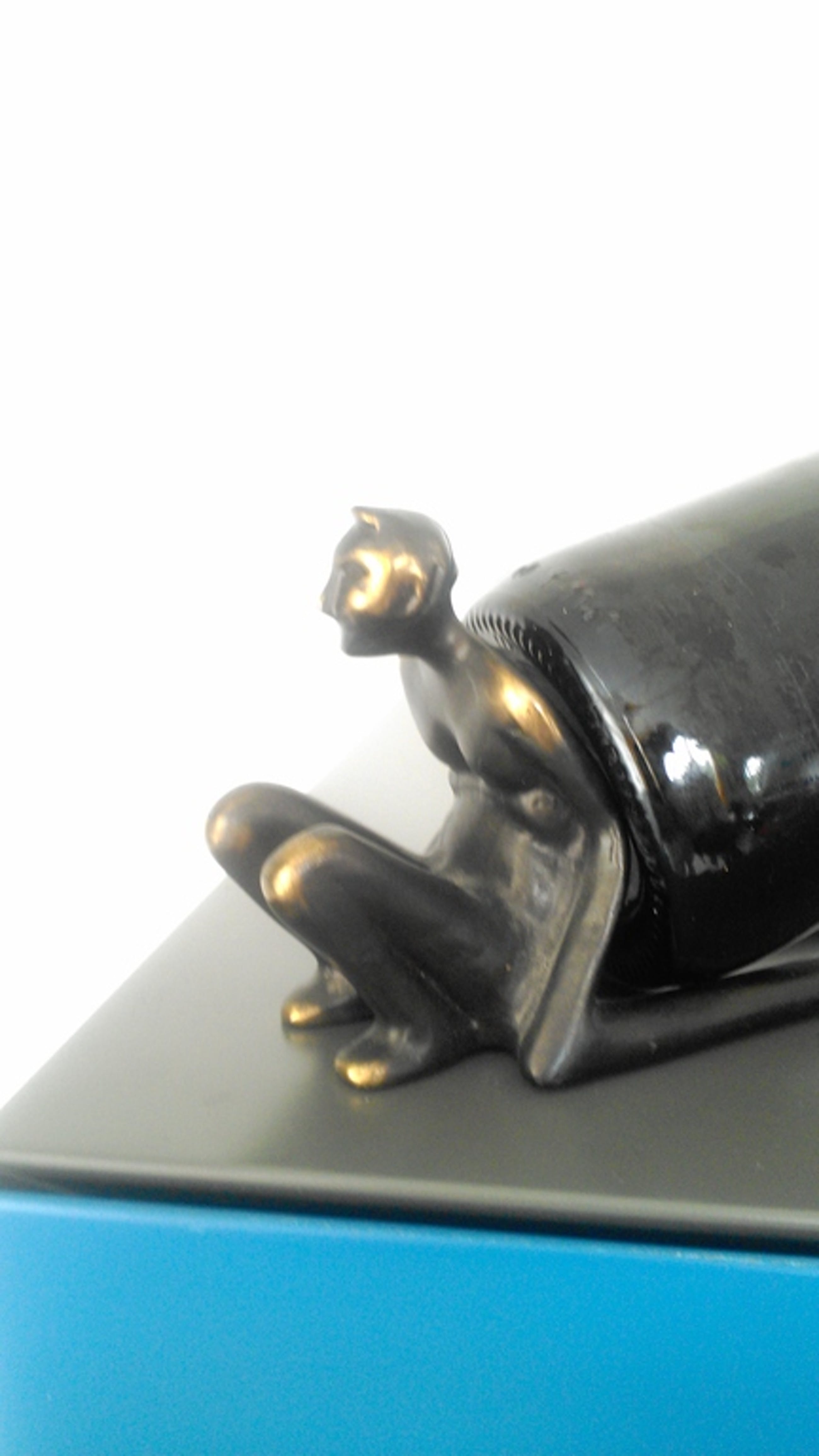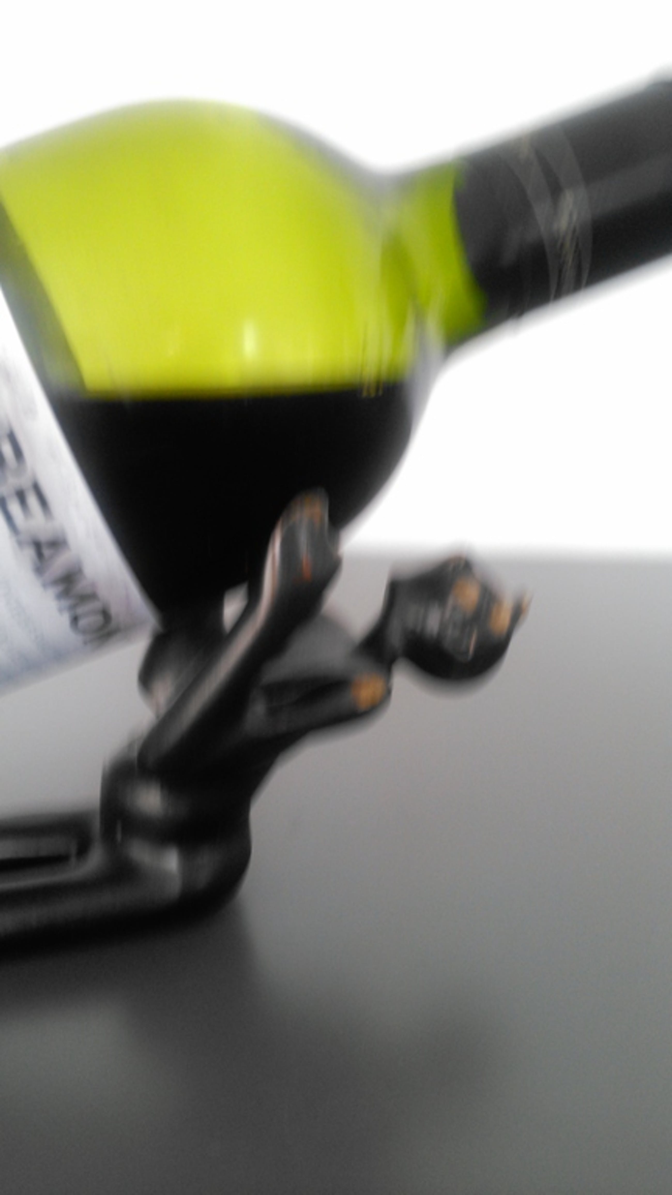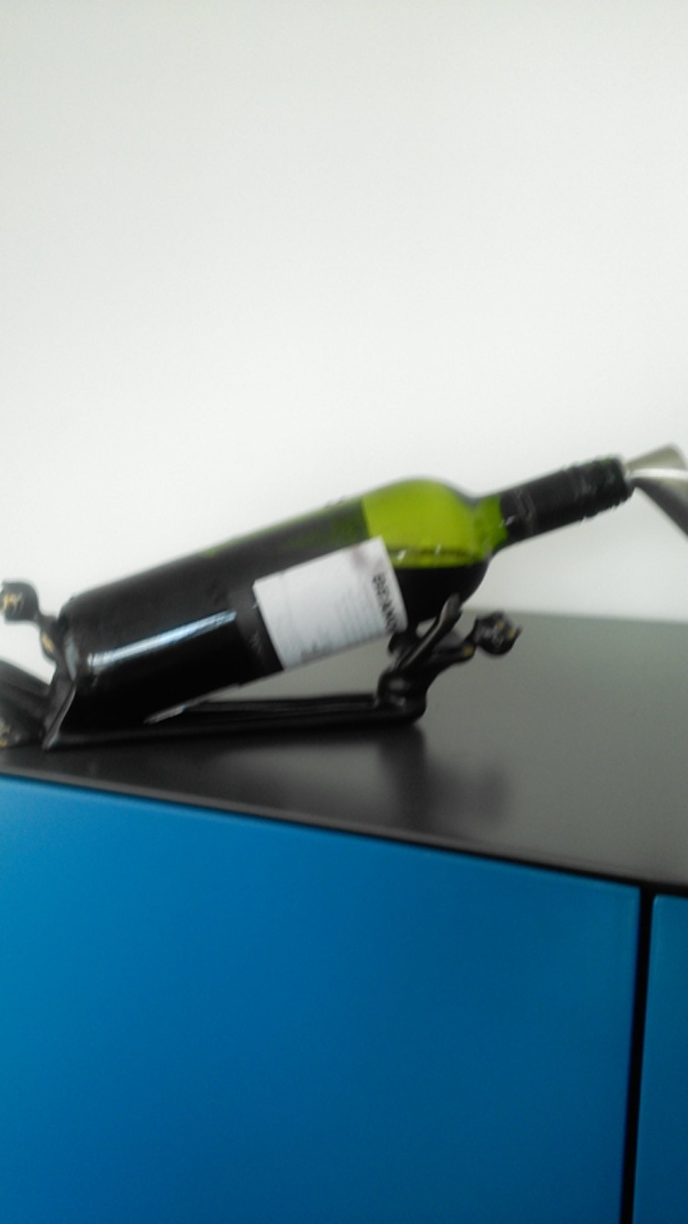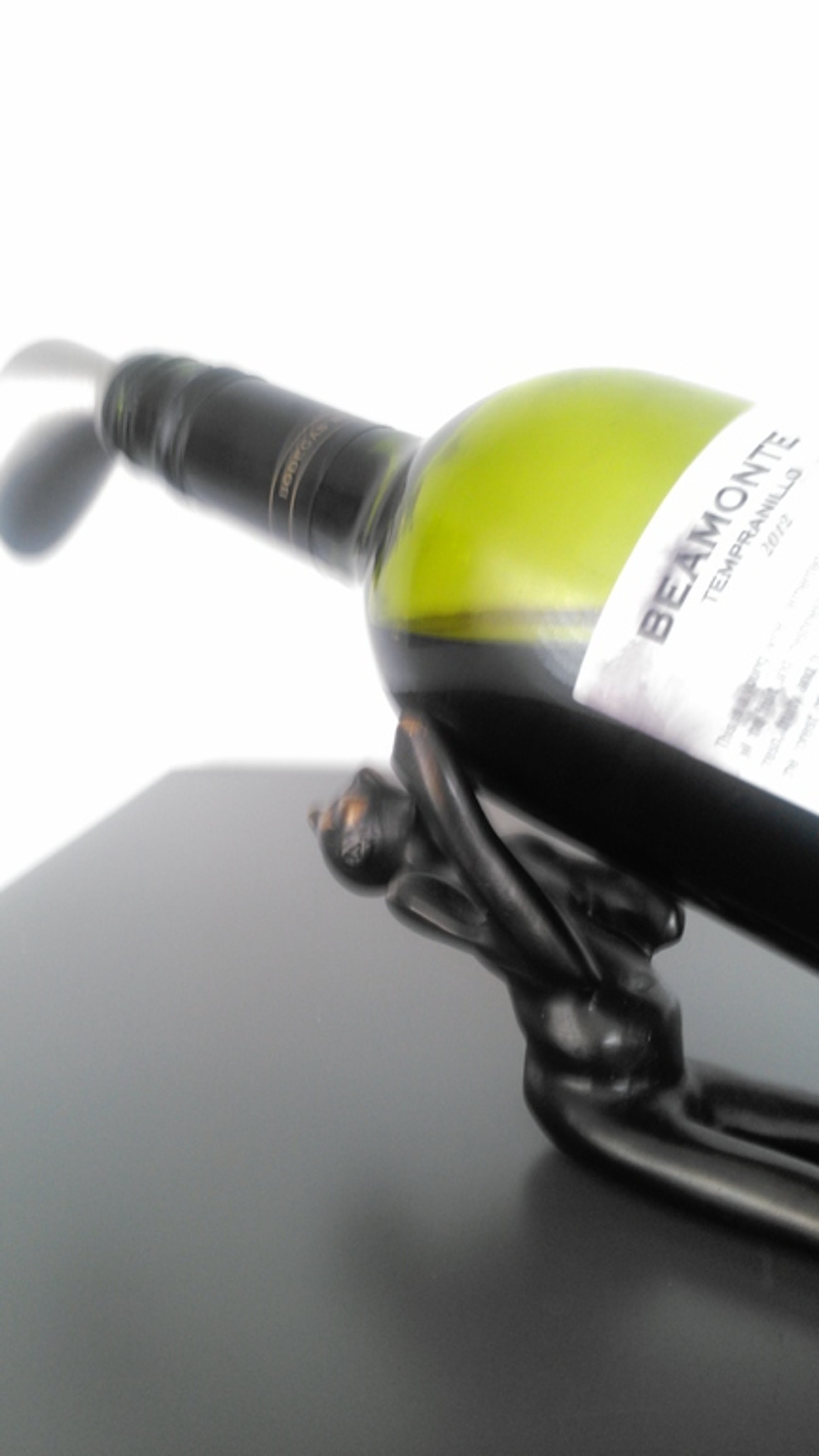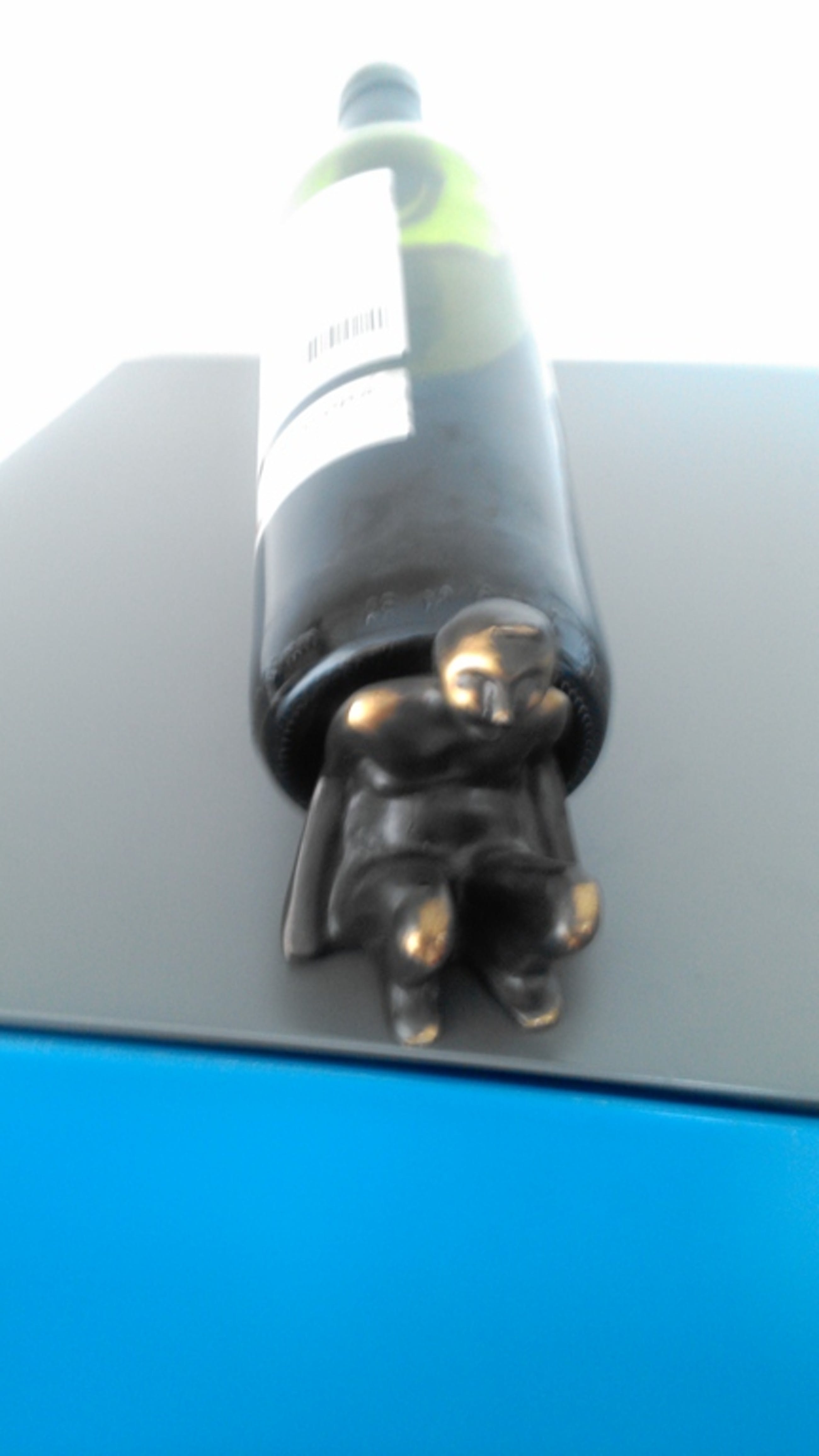 Stevige bronzen wijnfleshouder ludiek en uniek gevormd twee mannetjes die de taak hebben de fles overeind te houden