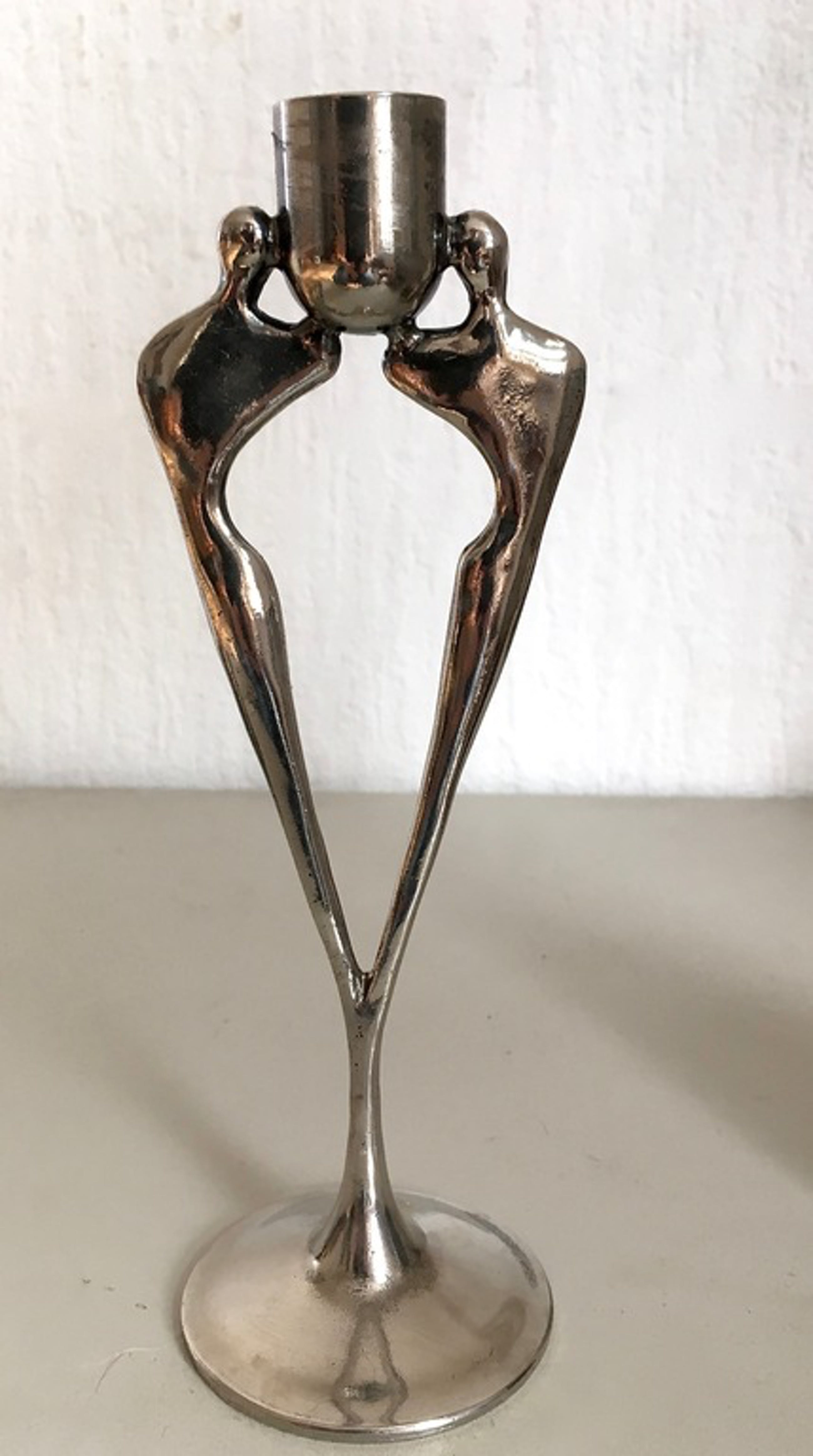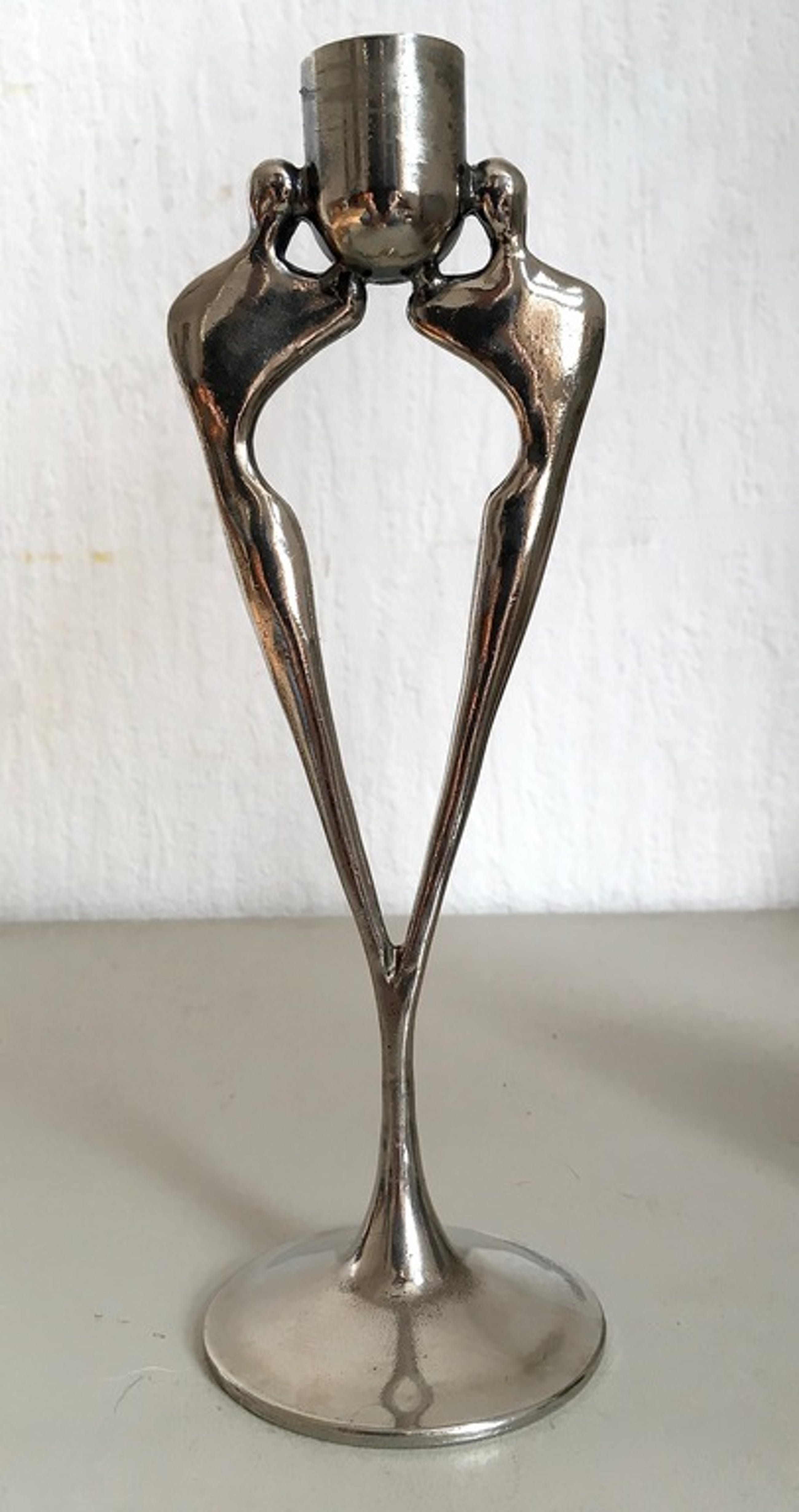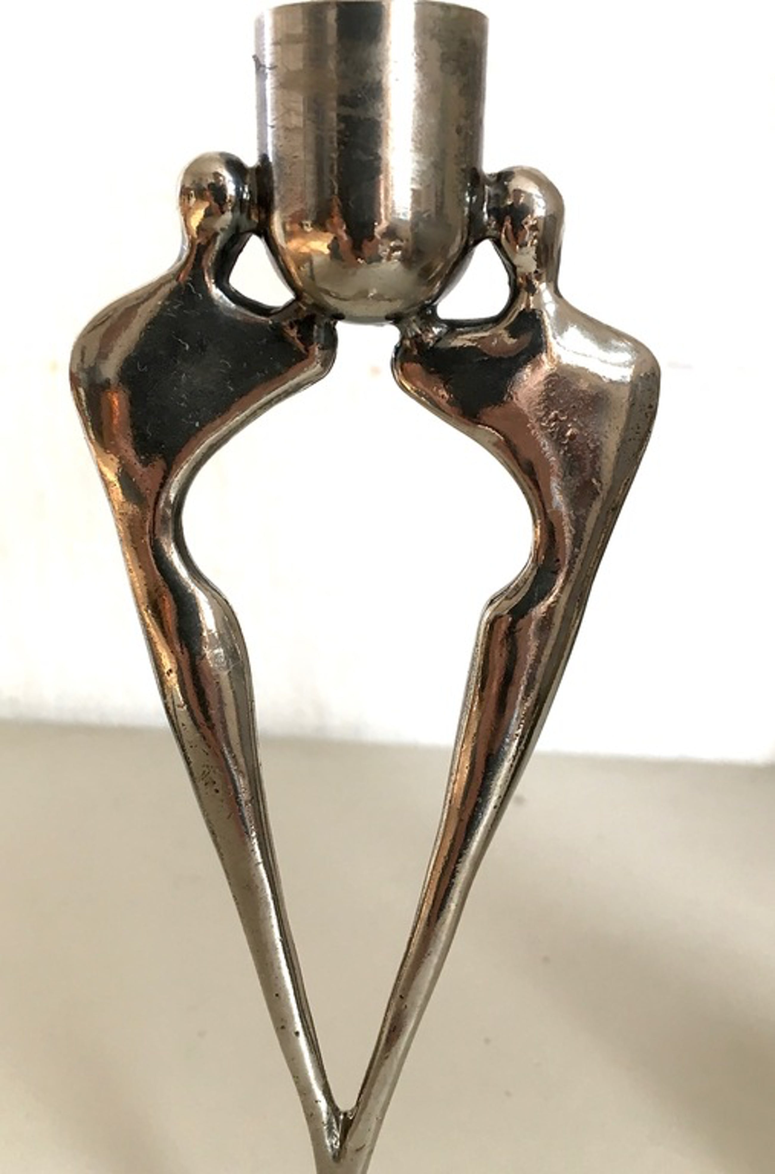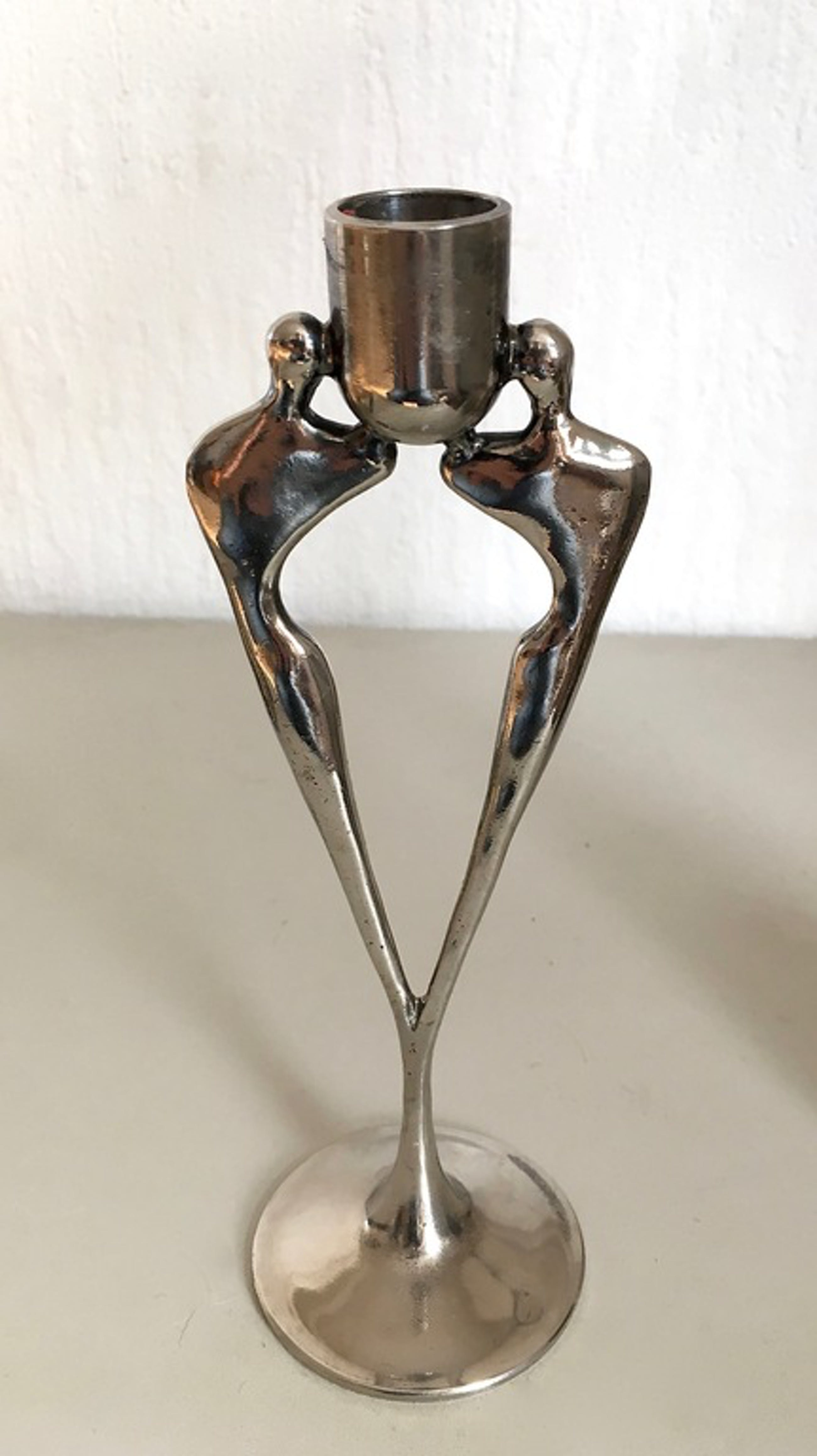 Goed vormgegeven Corry Ammerlaan van Niekerk verchroomde kandelaar met als thema 'verbondenheid' of 'liefde'.