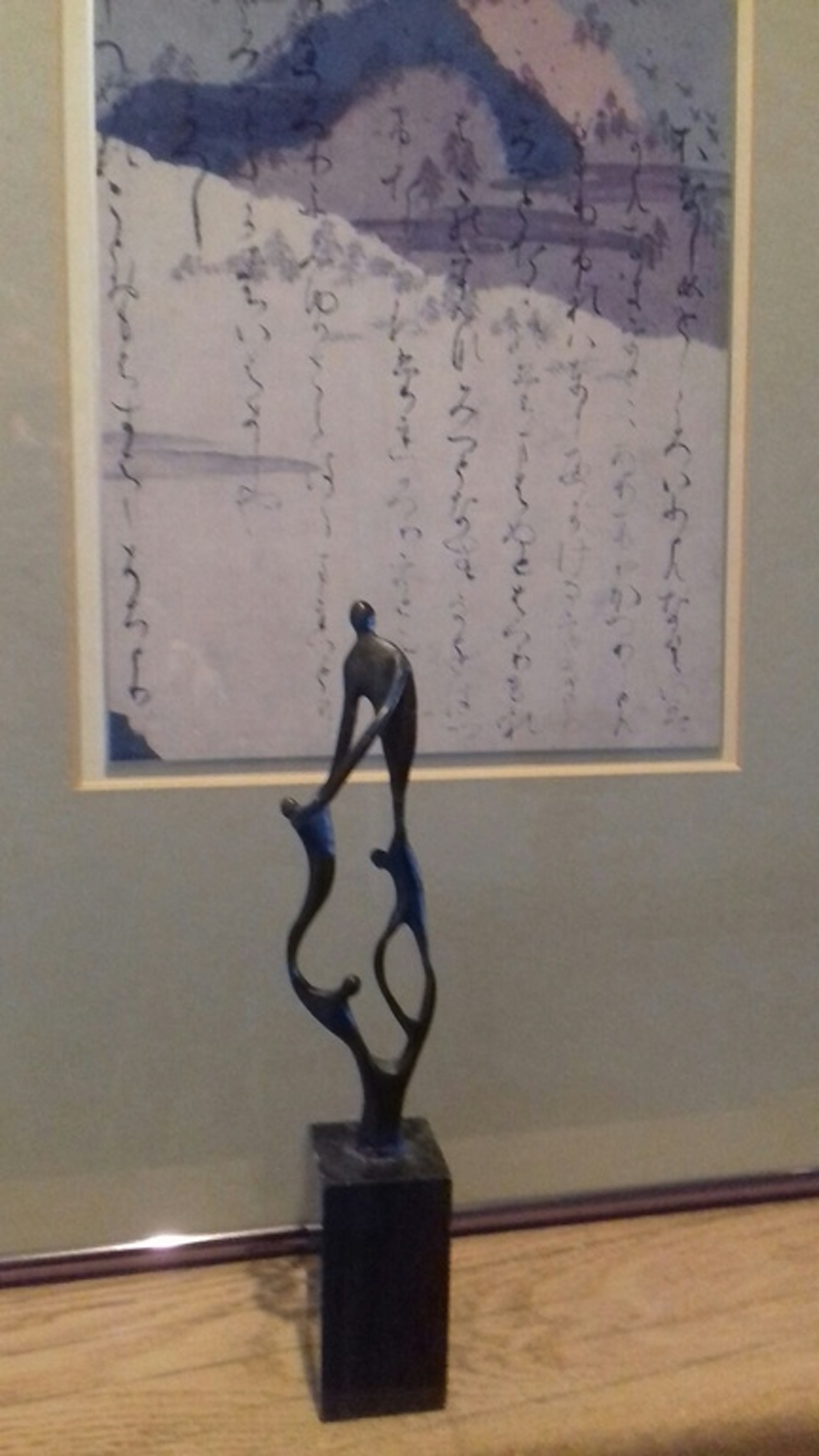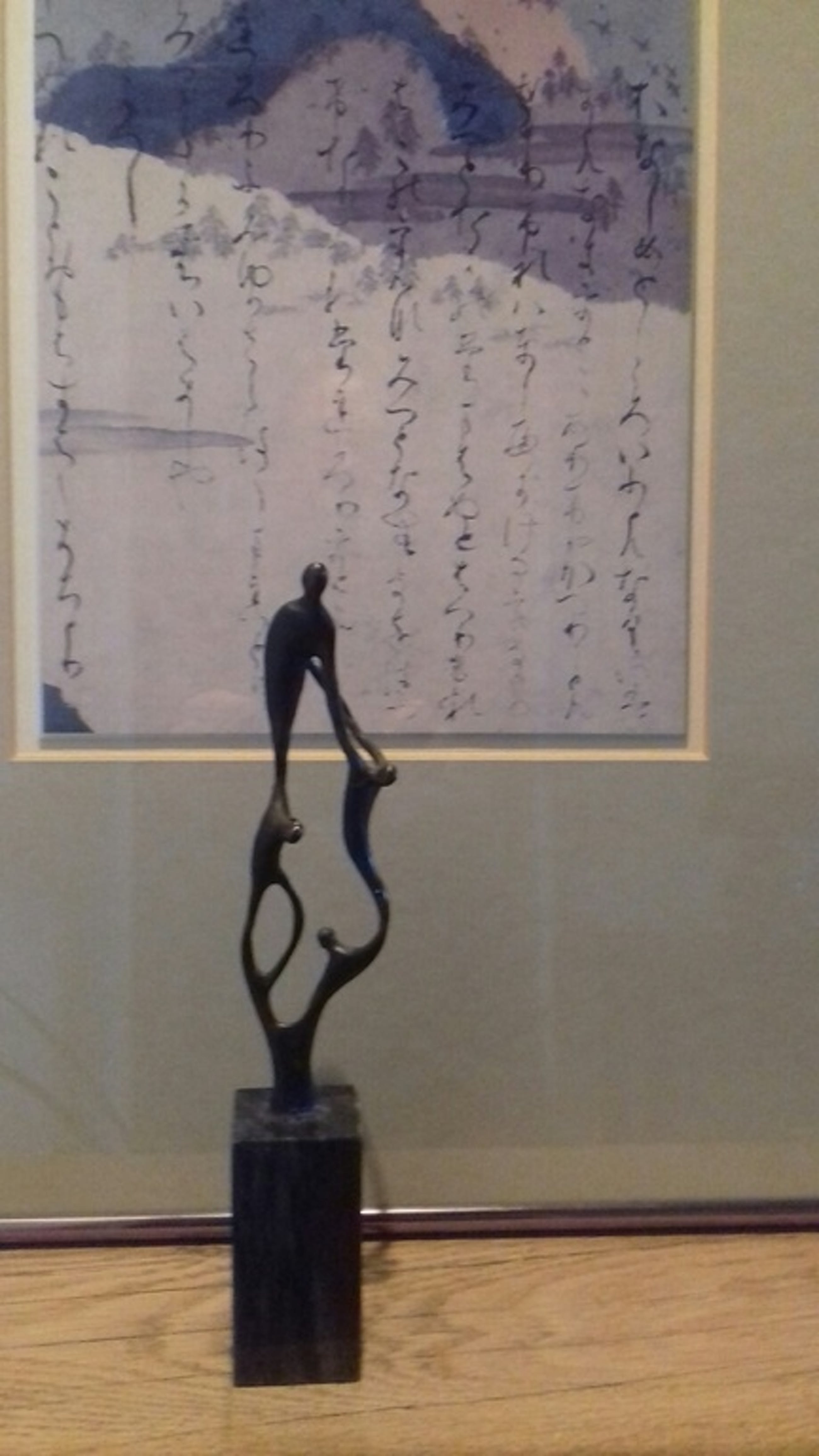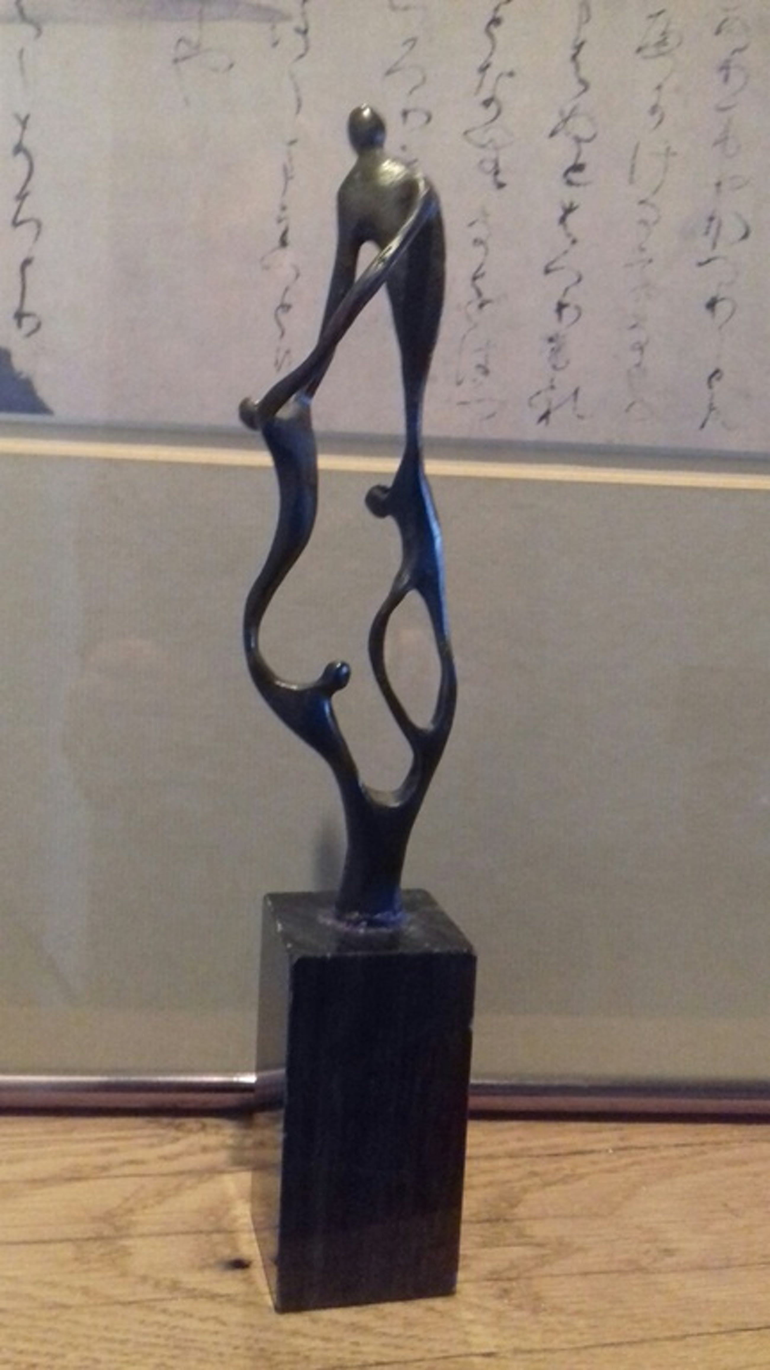 Verbronsde sculptuur op marmeren sokkel.