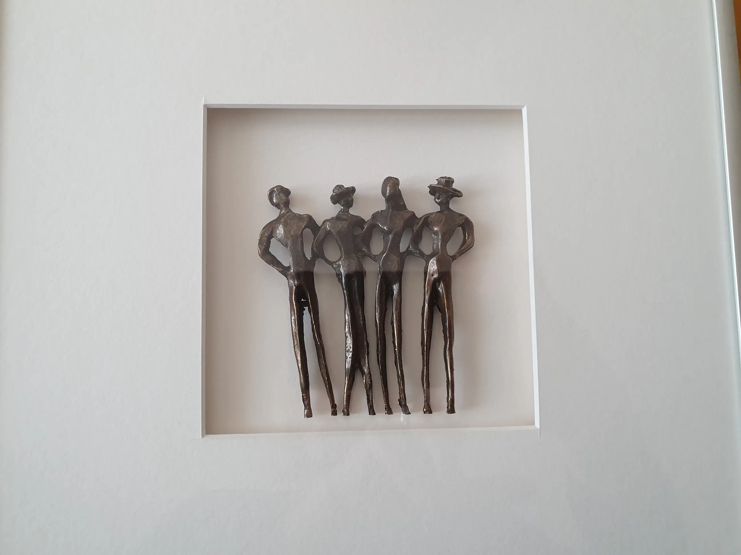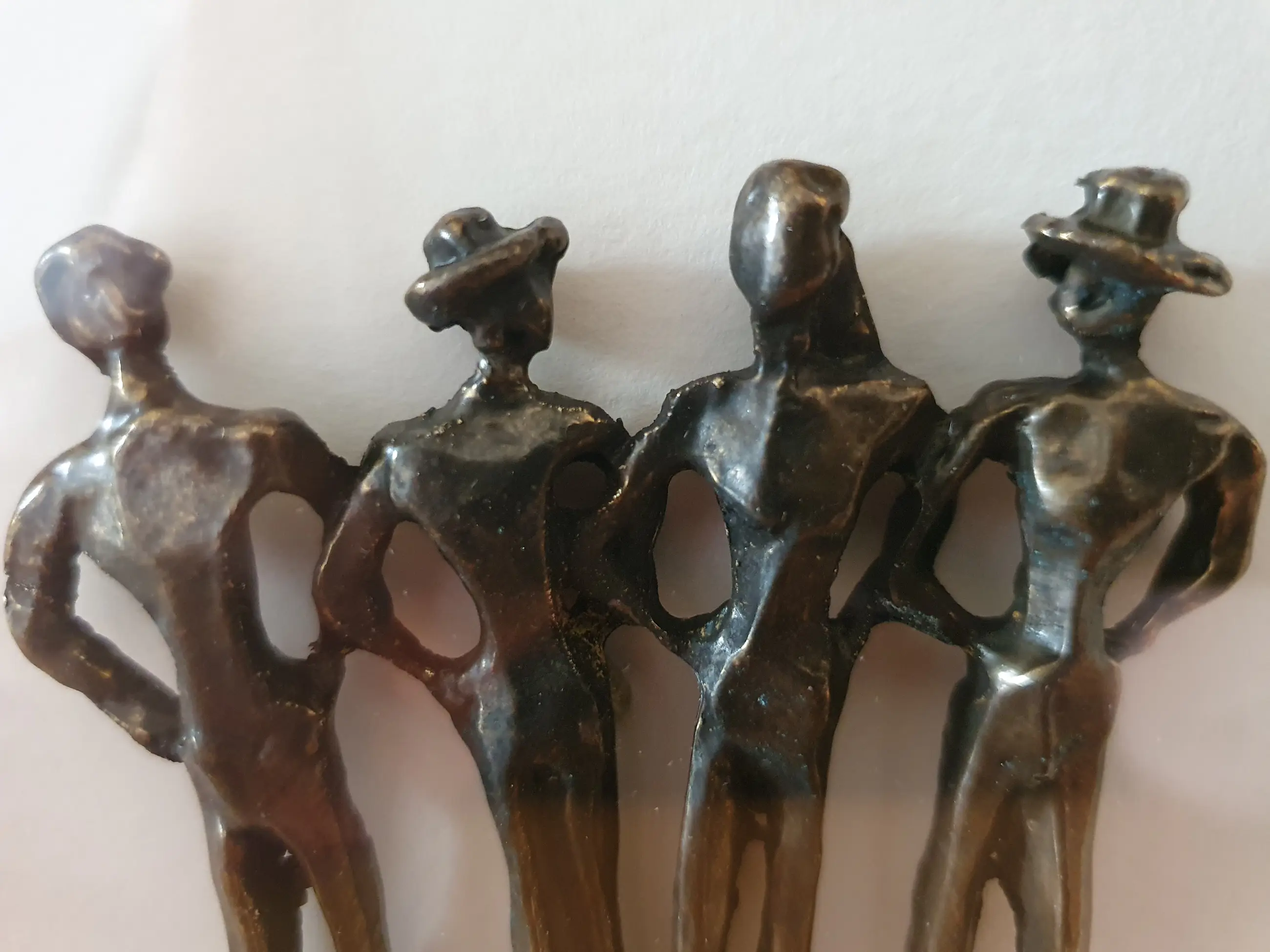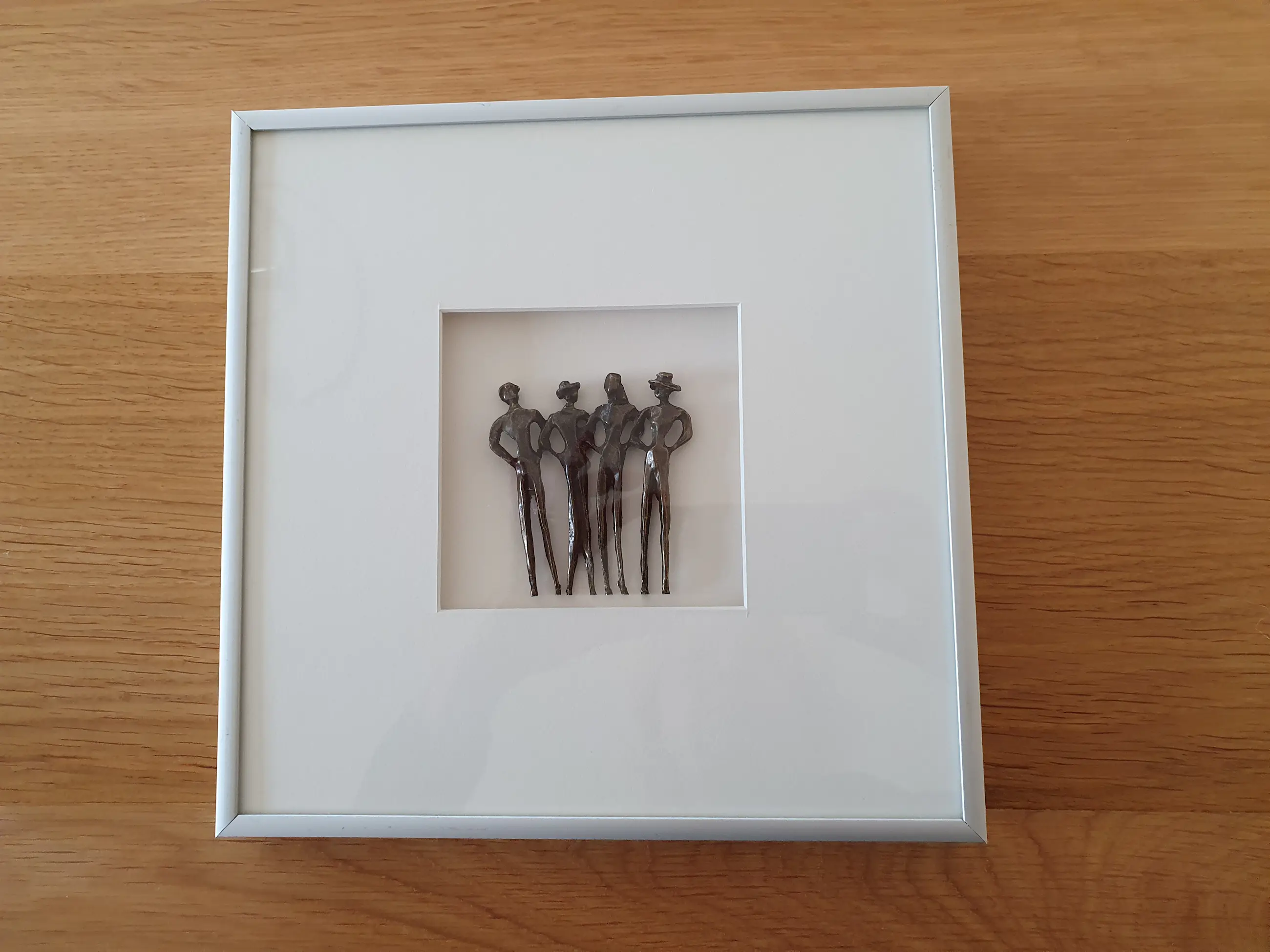 Een voorstelling van vier gearmde bronzen figuren (Saamhorigheid - Team Spirit geheten) achter een verdiept passepartout. Is ingelijst in zilverkleurige lijst en geeft een totale maat van 24,5 x 24,5 cm. Mooie diepte- en schaduwwerking.