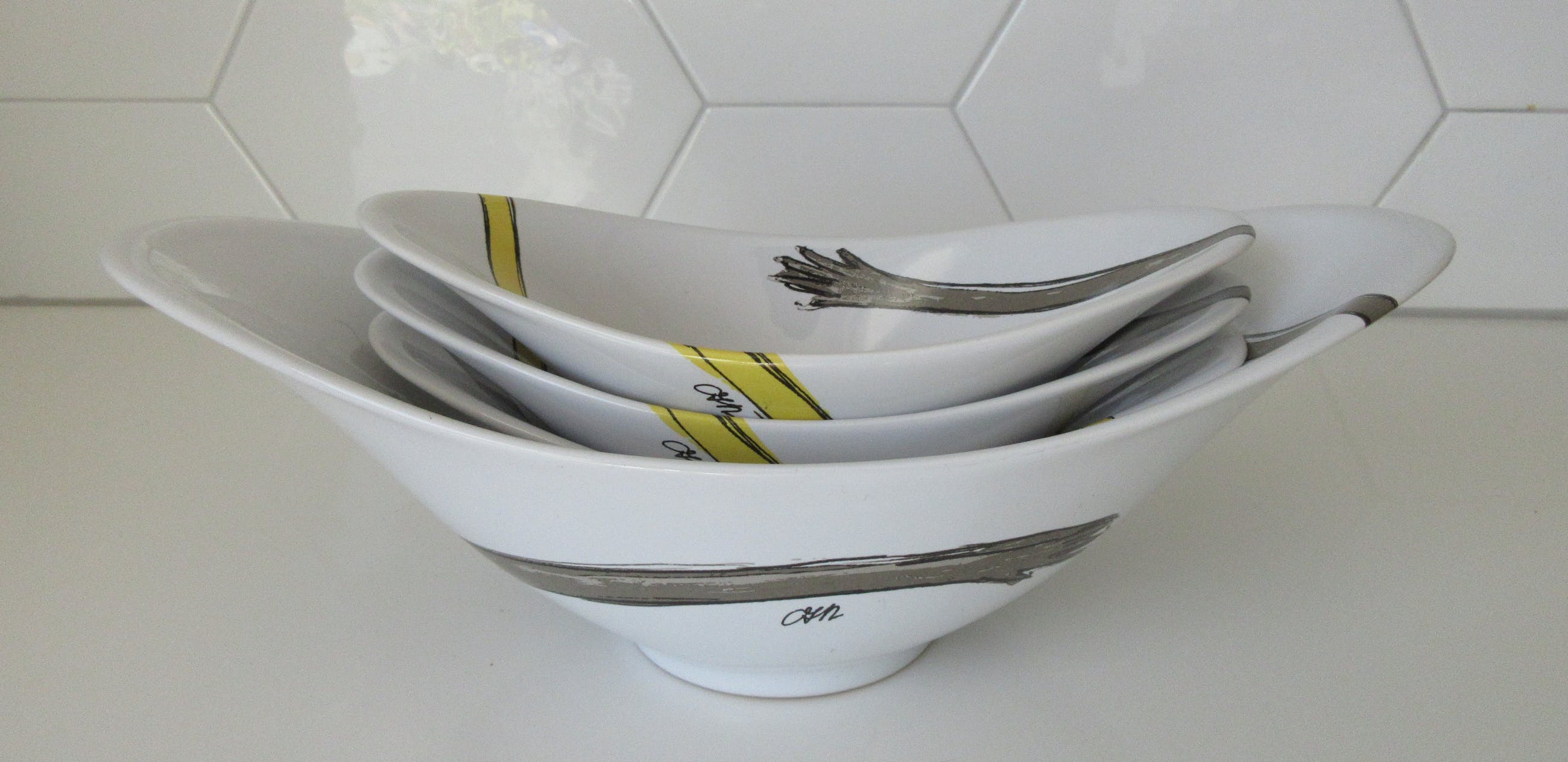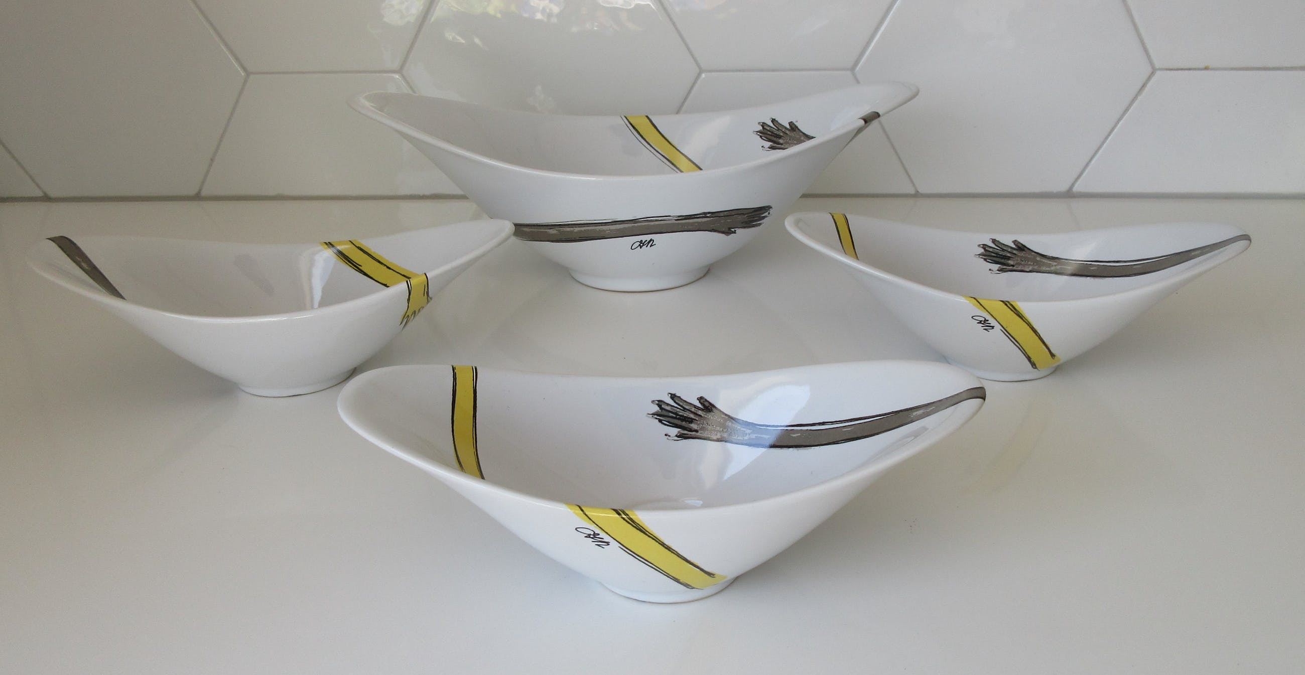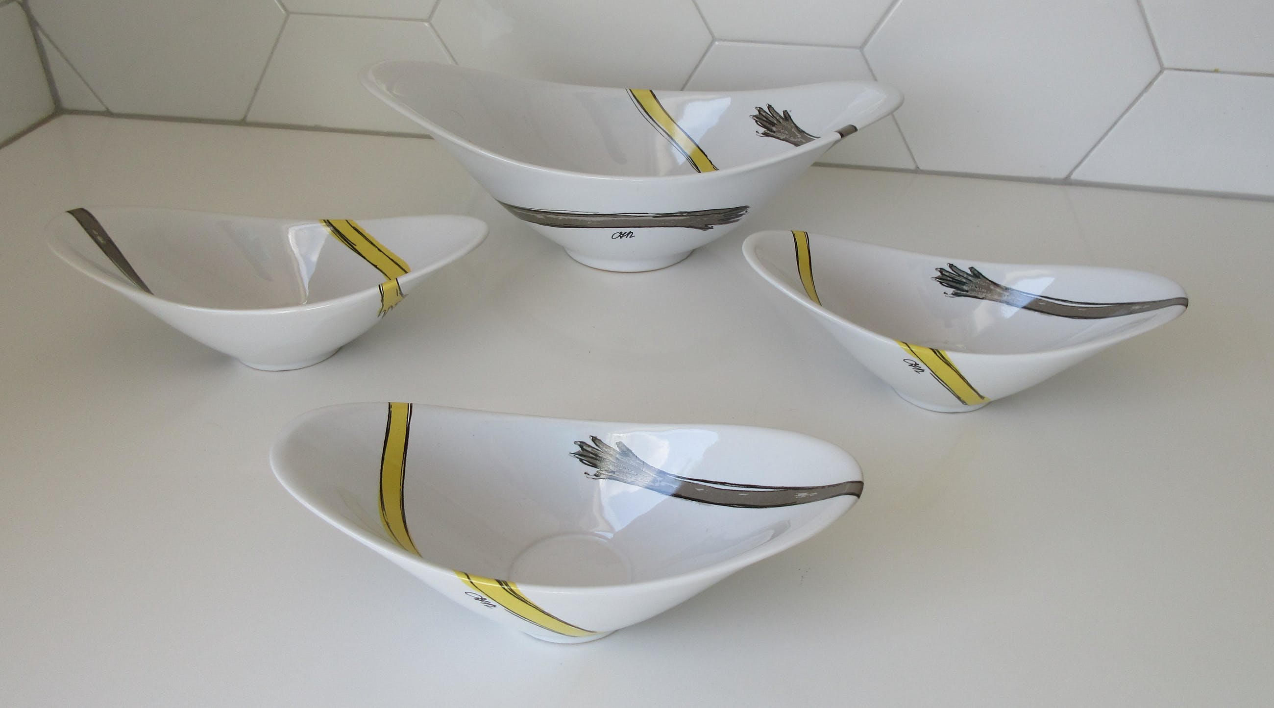4 schalen van Corry Ammerlaan. 1 grote schaal breedte 30.5 cm. 2 kleine schalen breedte 22 c