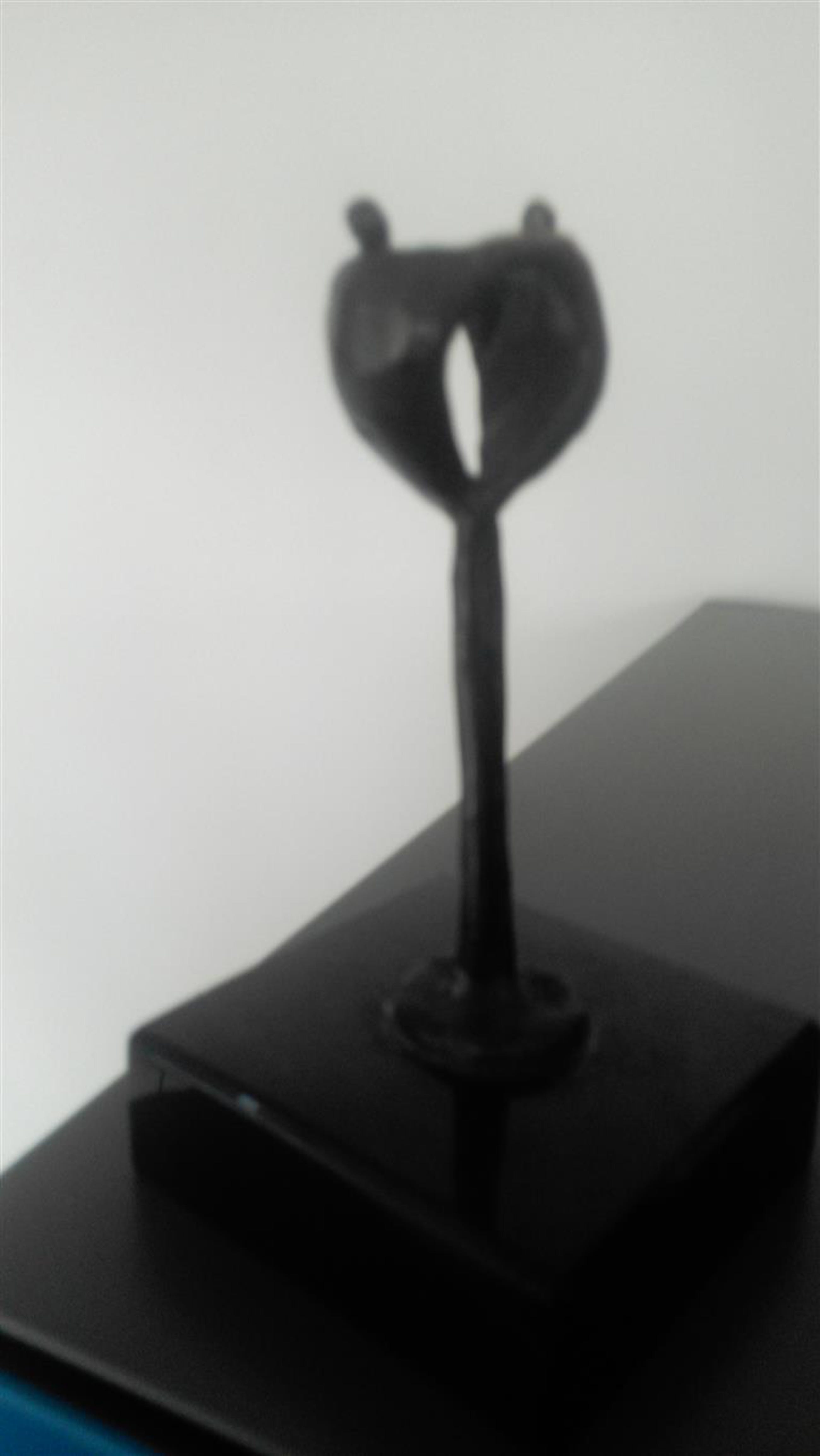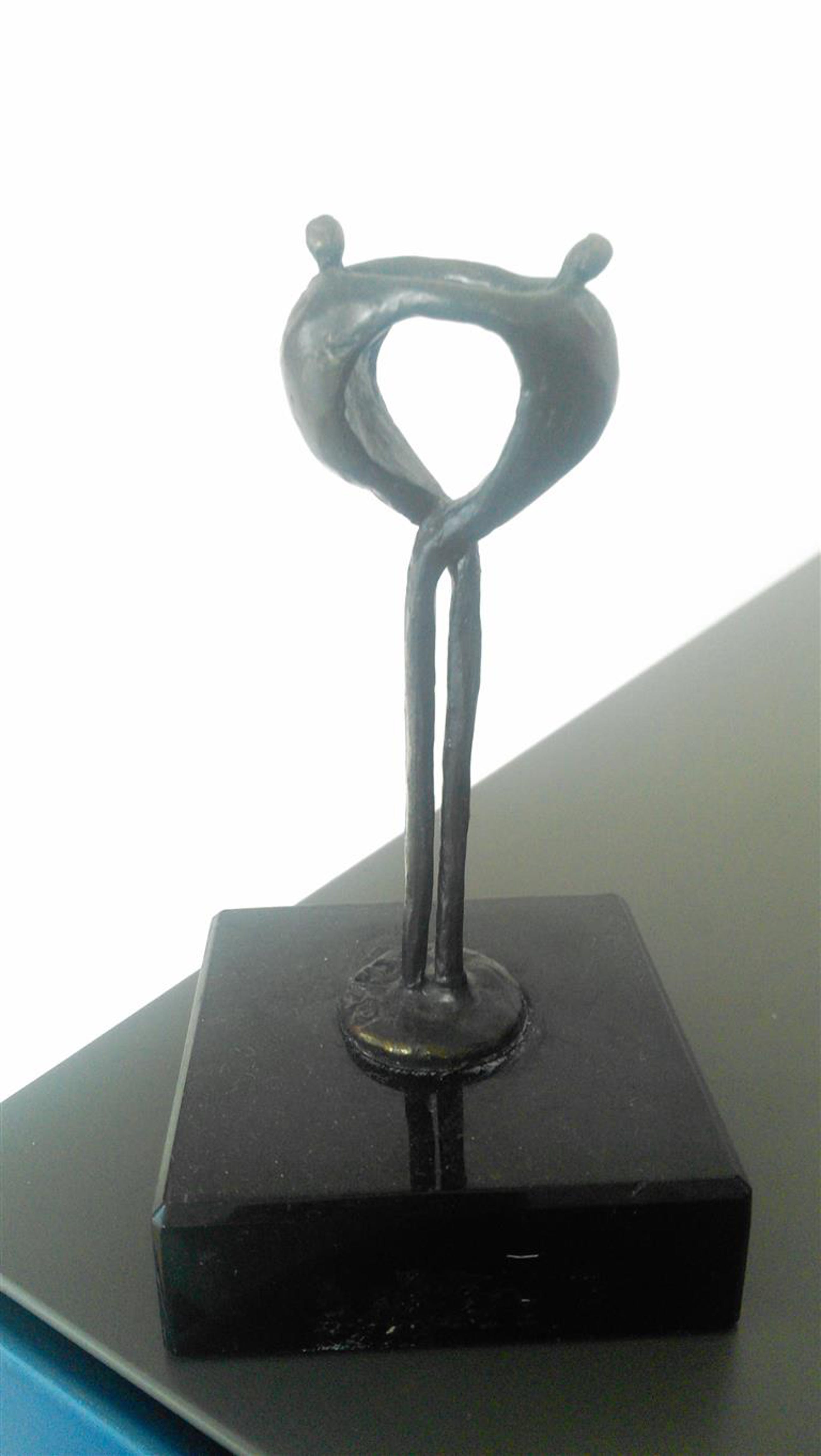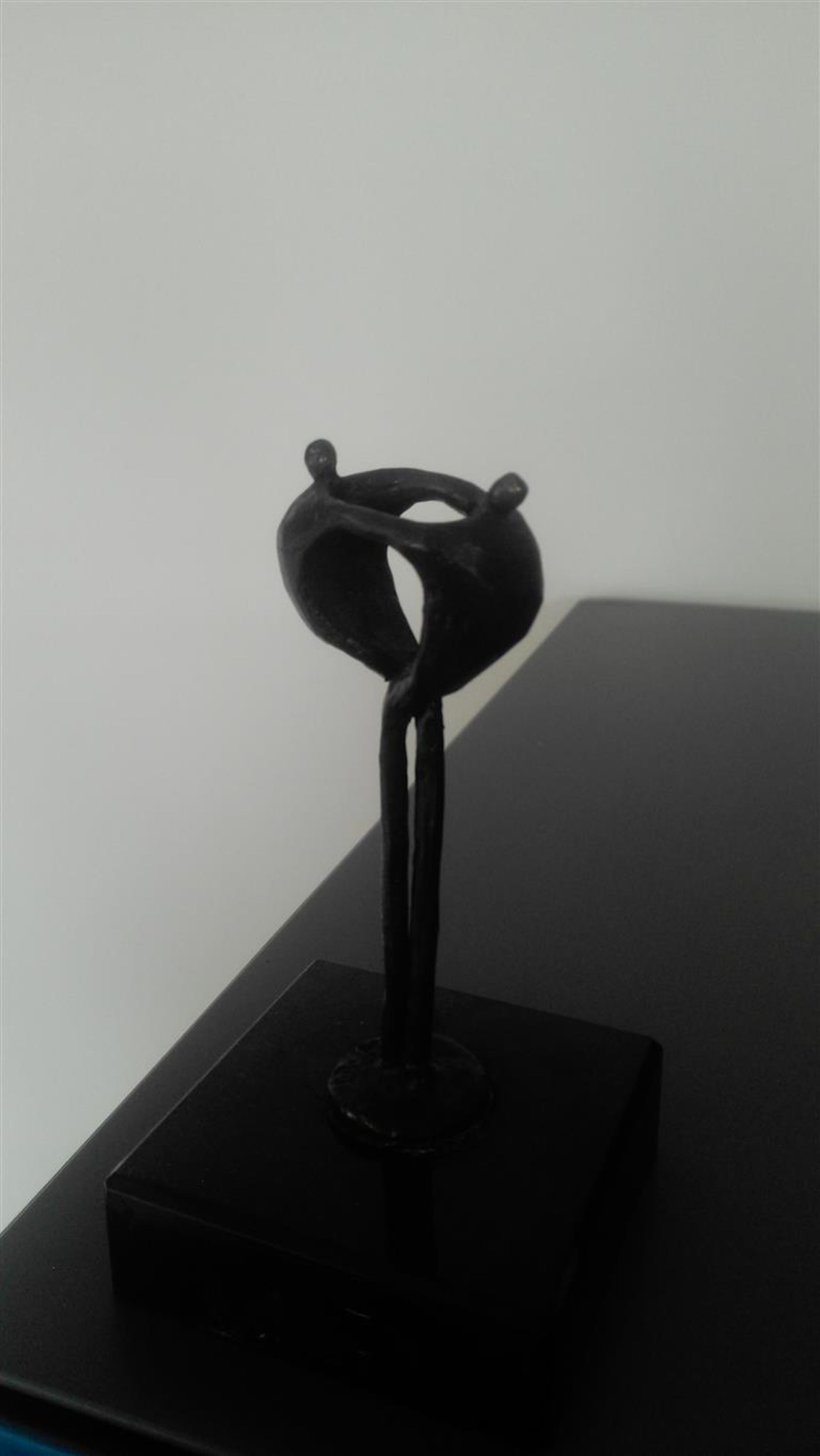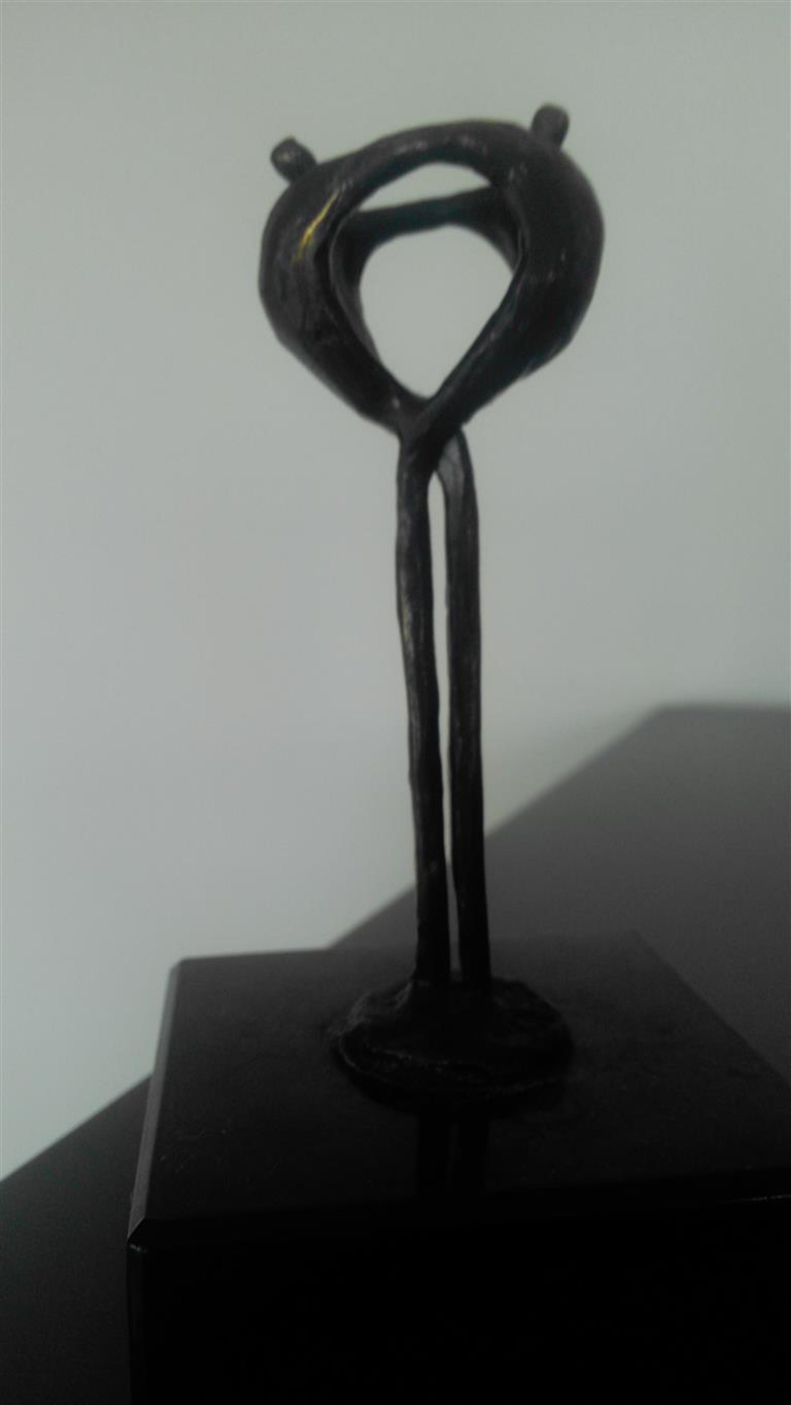 Een vrolijke begroeting van twee personen op kunsstof sokkel van 6 x 6 x 2 cm Gesigneerd CAN Corry Ammerlaan van Niekerk