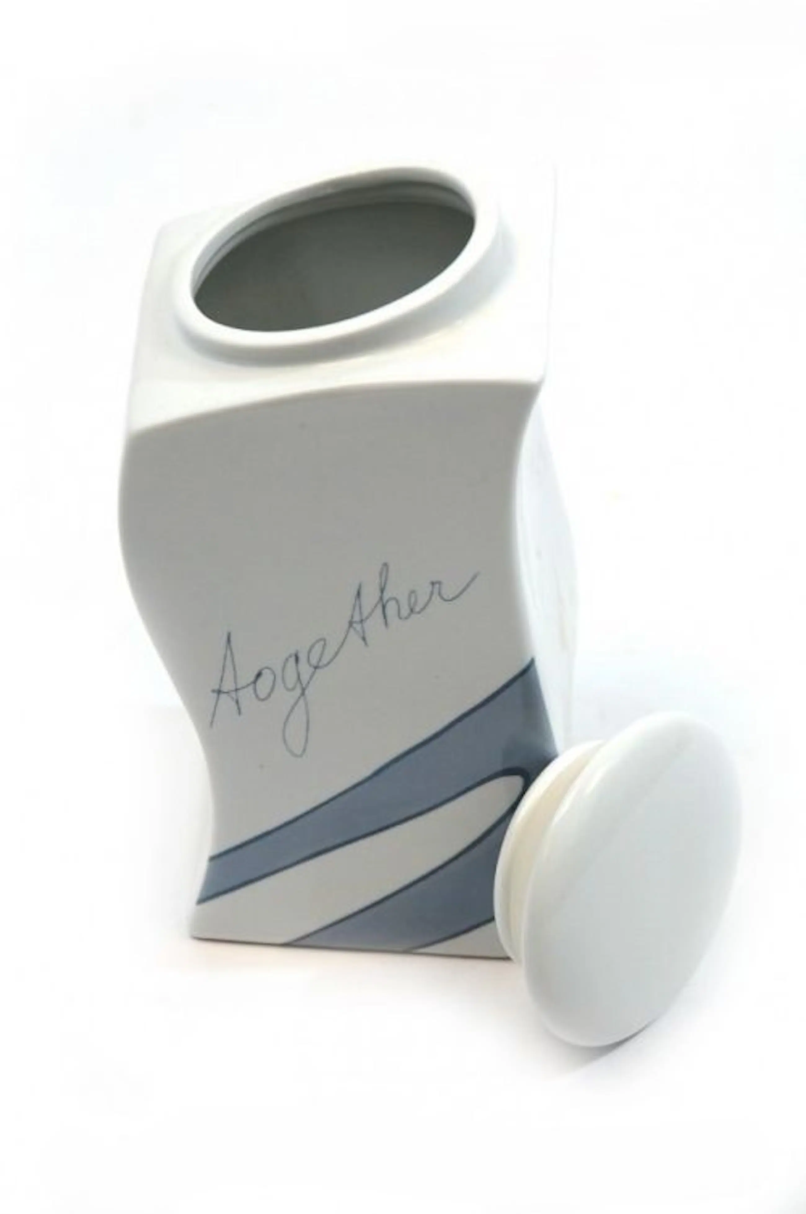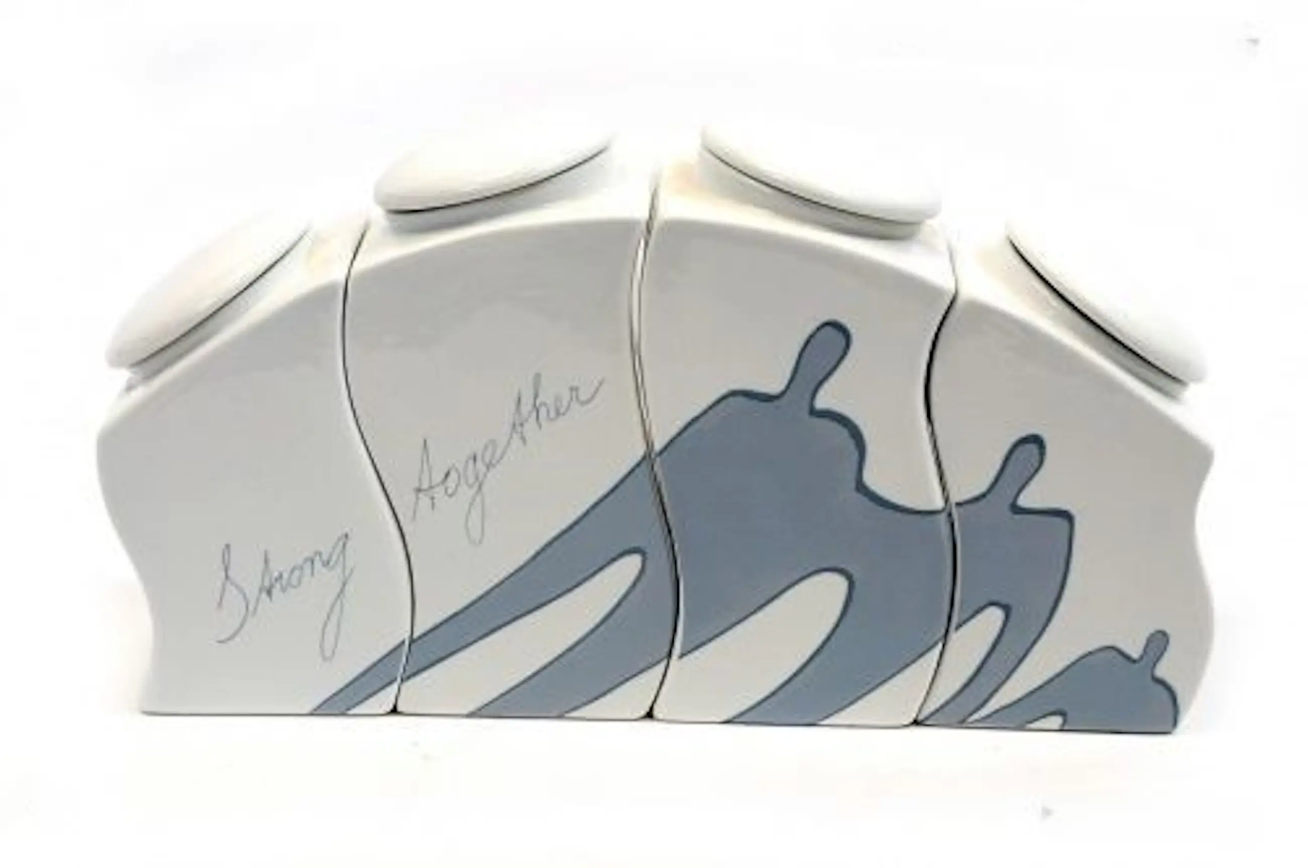 Vier voorraadpotten 'Strong together' die mooi in elkaar passen. Deksels met plastic afsluitingen. Op alle 4 potten staat op de onderkant Artihove Art en is gesigneerd met CAN. De conditie is uitstekend. ongebruikt.