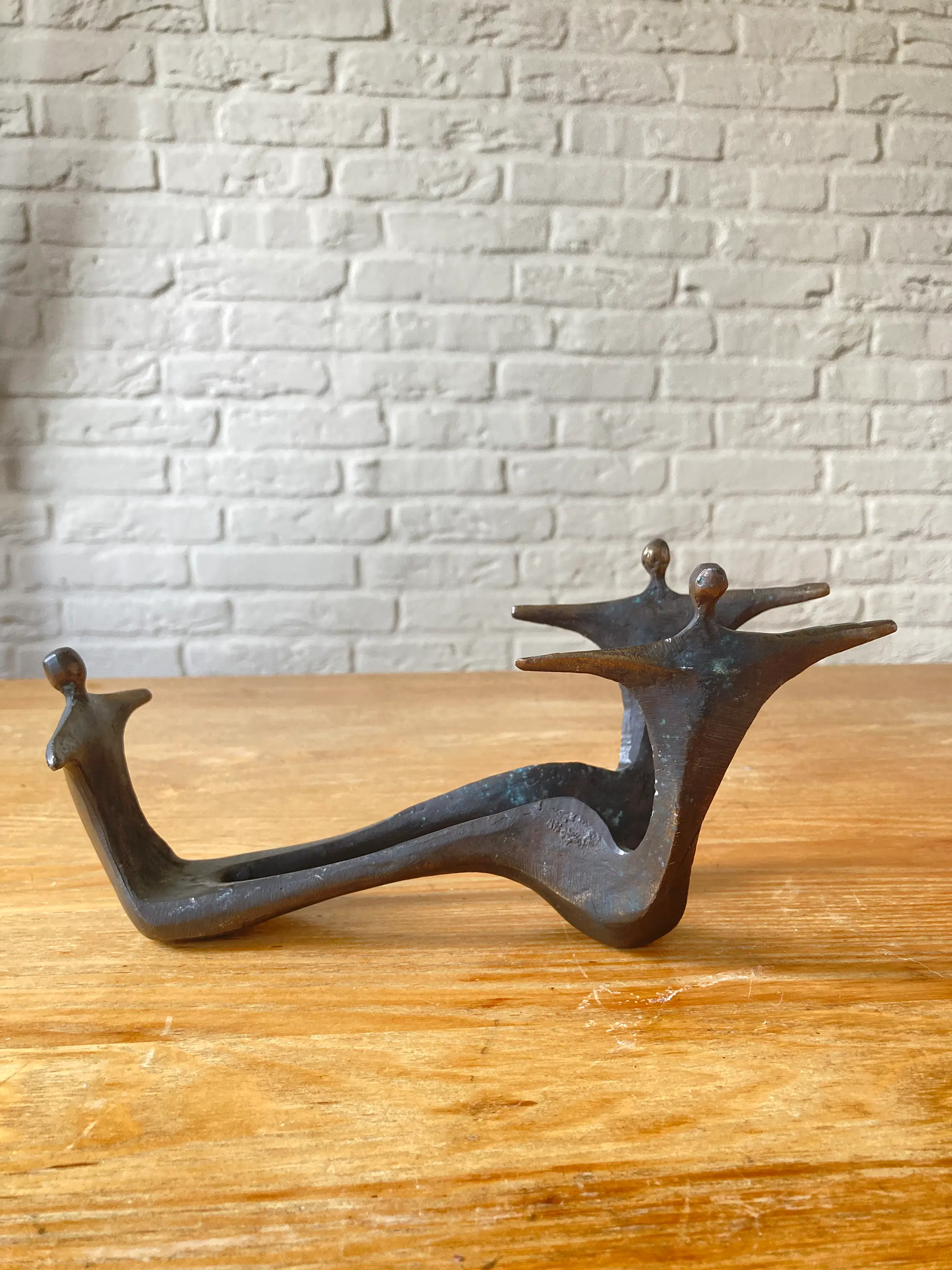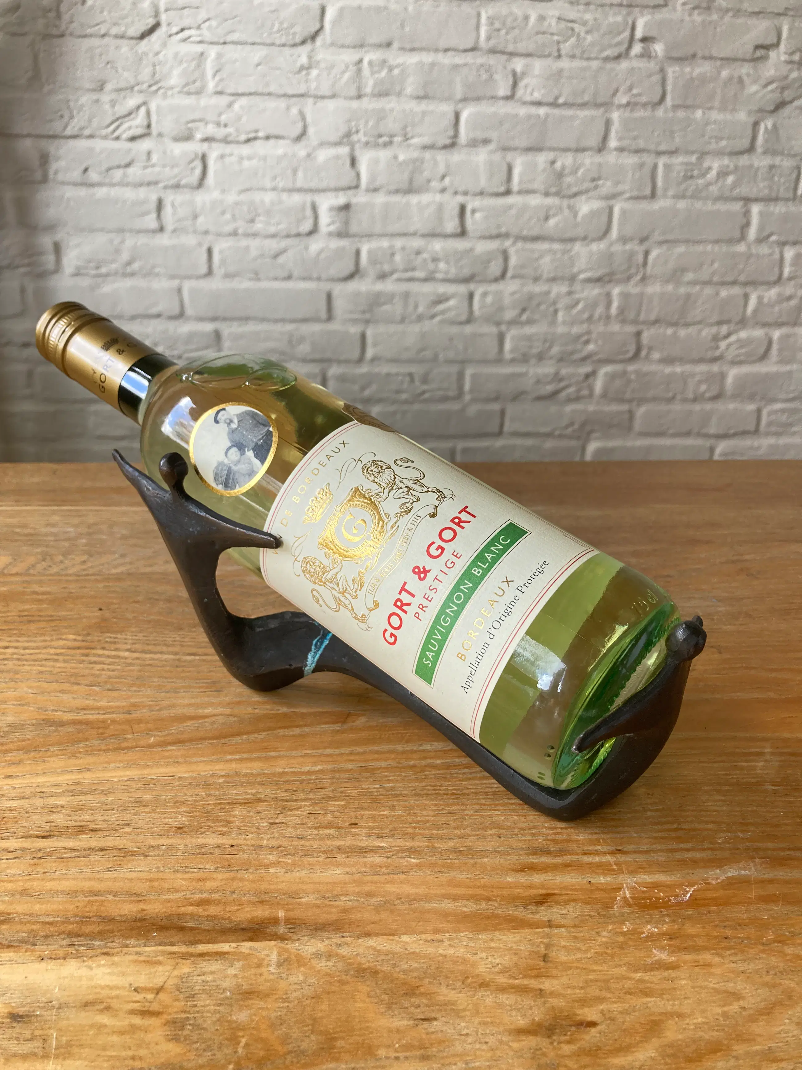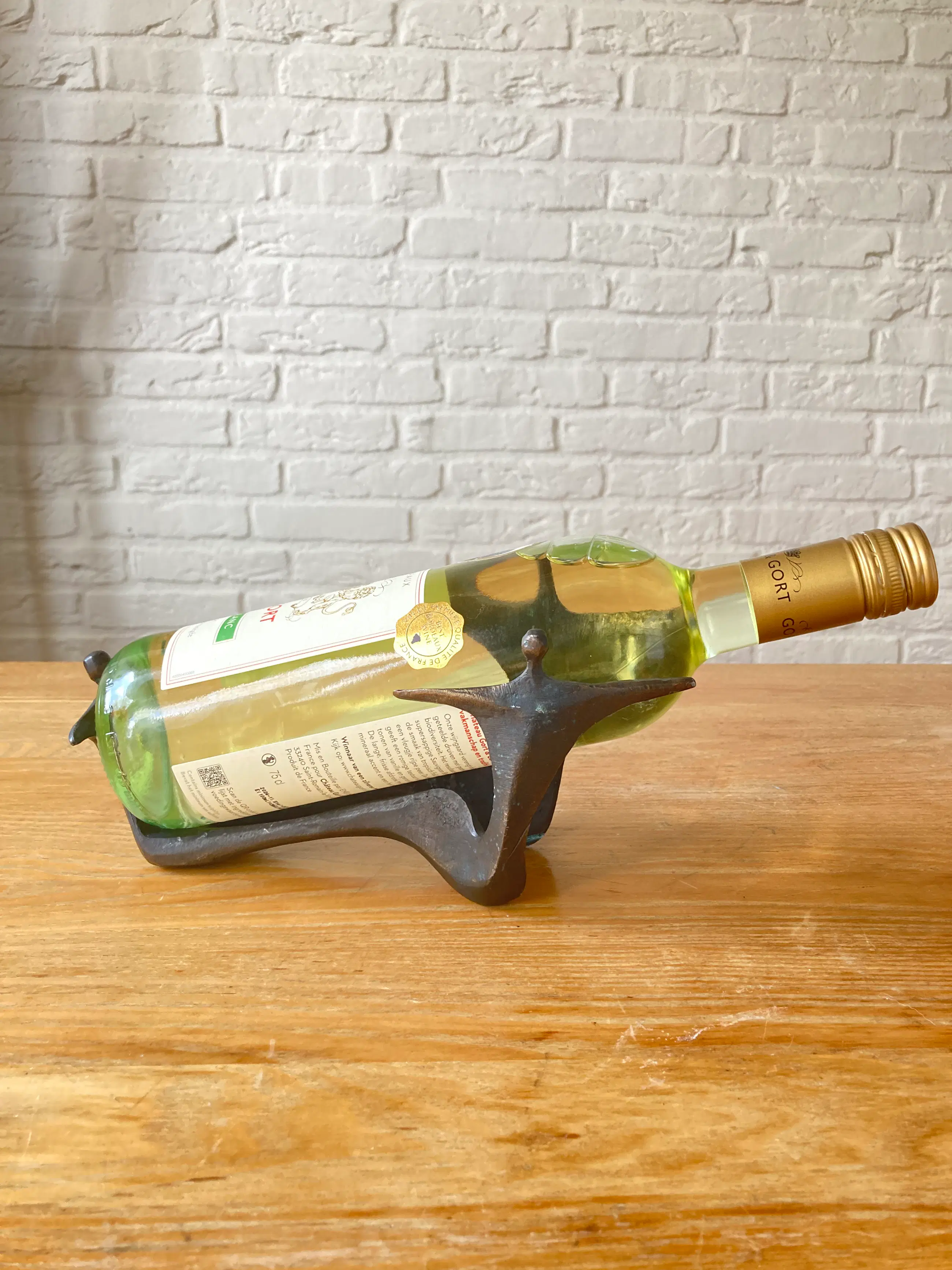Massief bronzen beeld/wijnfleshouder Kunstenares Corry Ammerlaan van Niekerk 2e Helft 20e eeuw Exclusief fles wijn Afmeting: 22,5 x 9 x 10 cm Conditie zeer goed