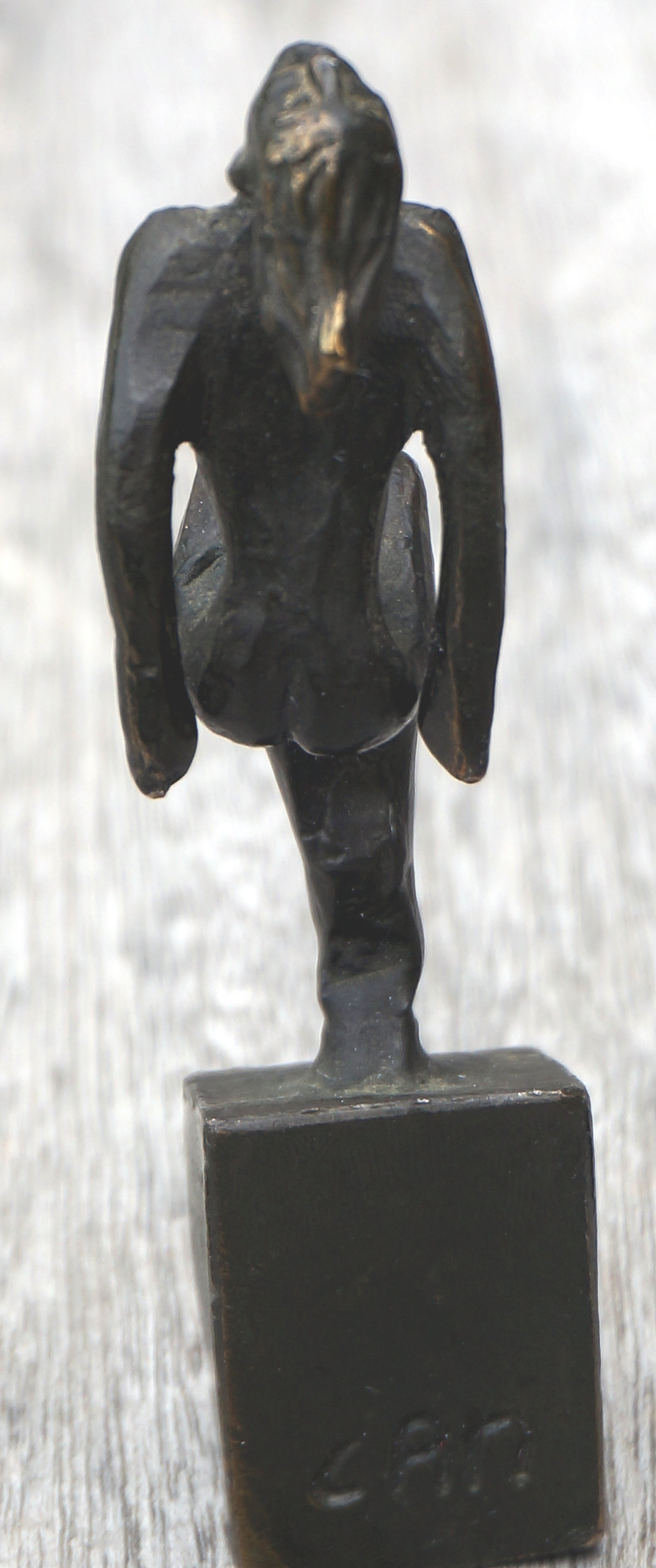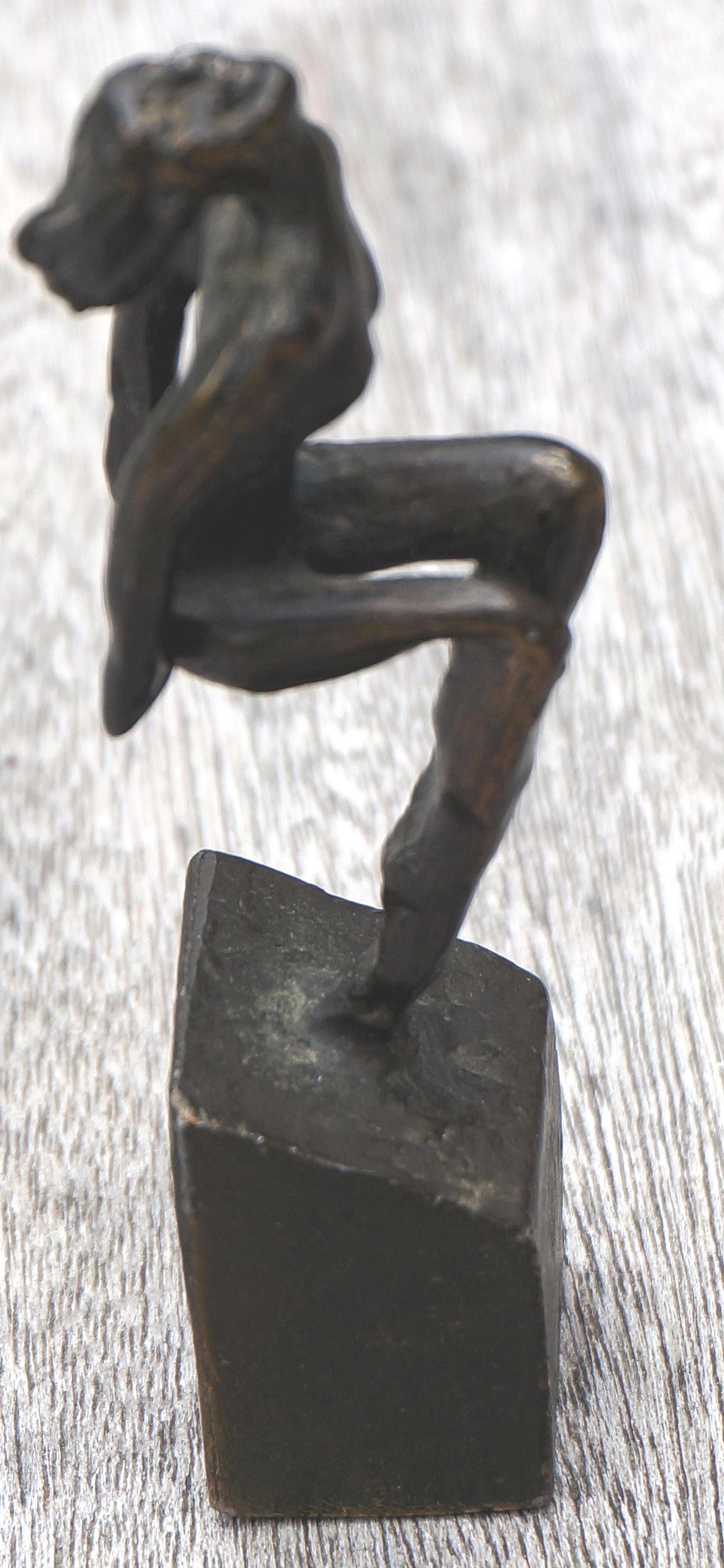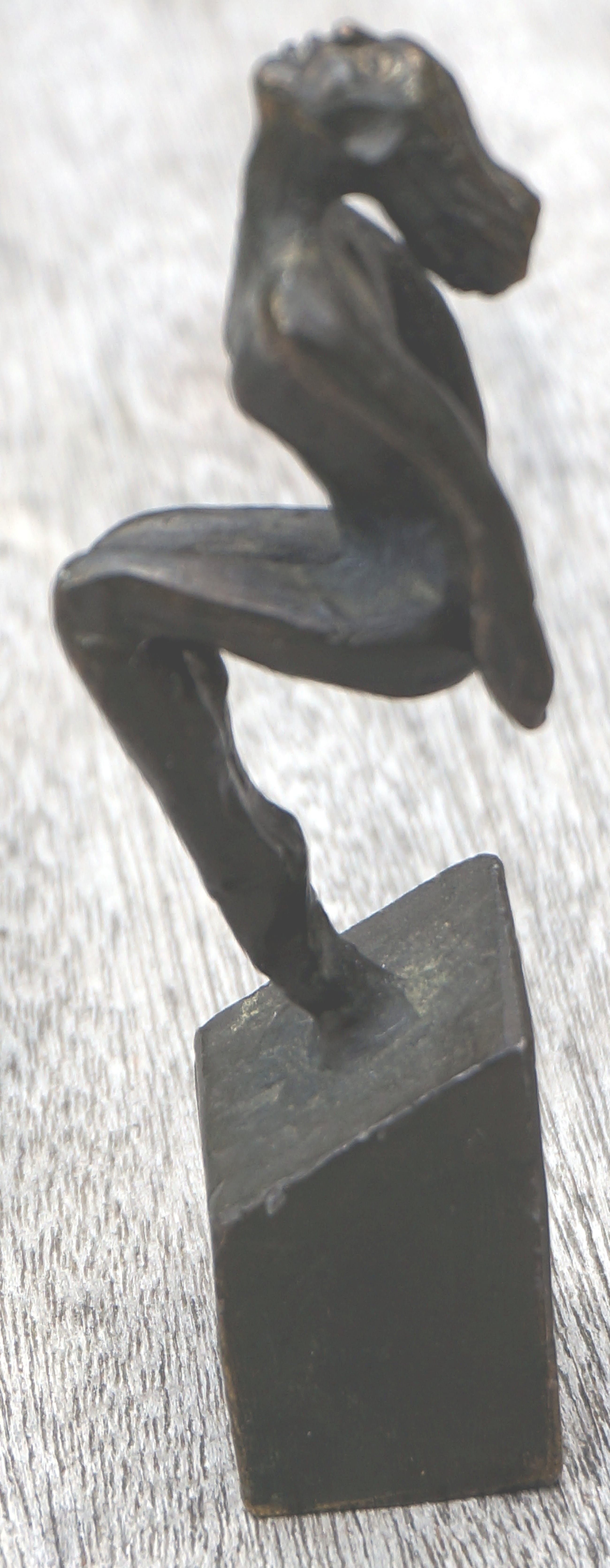 Bijzonder fraai bronzen beeldje ( Klijn maar heel fijn!) van een sierlijk vrouwenfiguurtje dat op het punt staat het leven in te duiken; klaar voor de start
