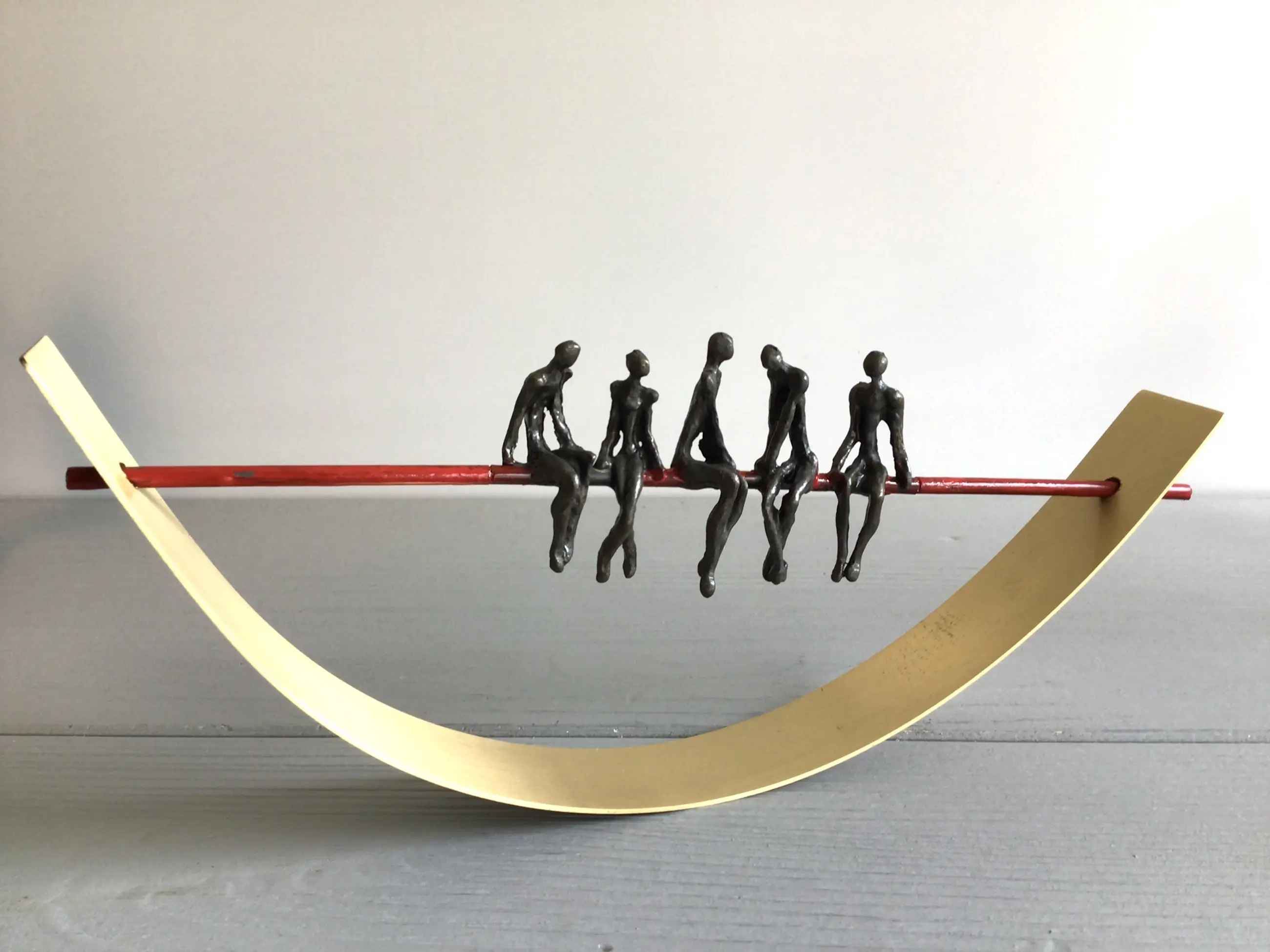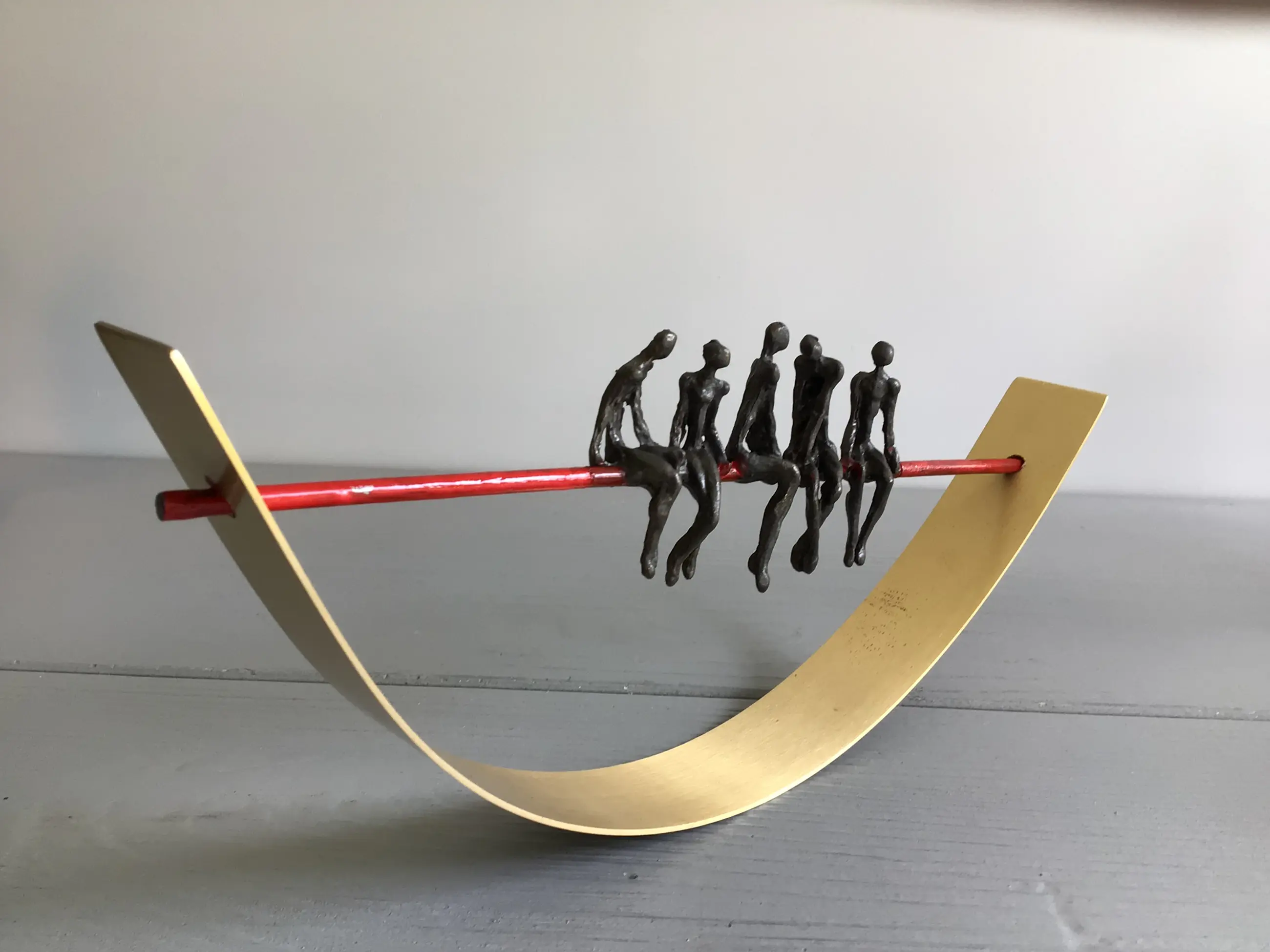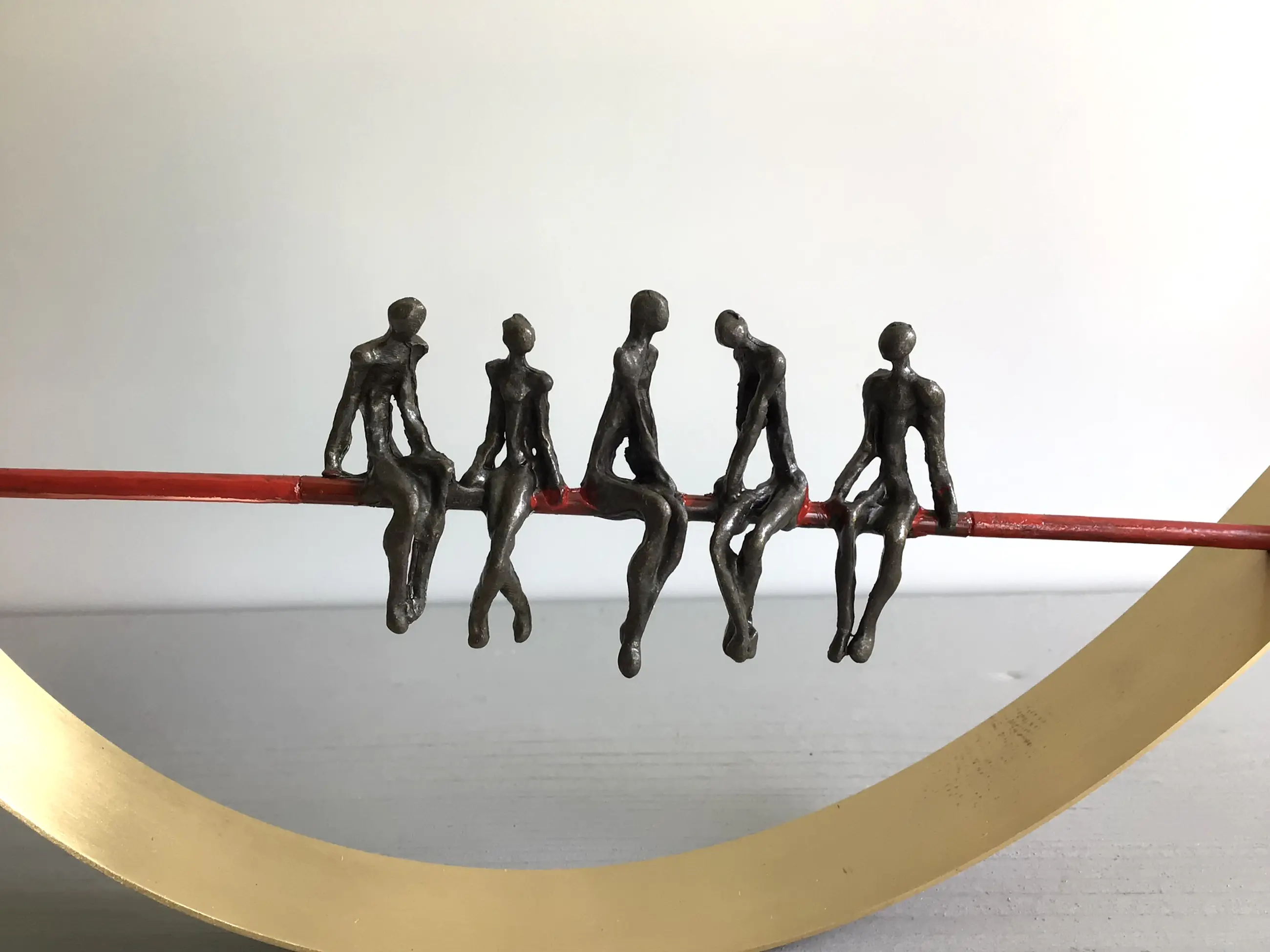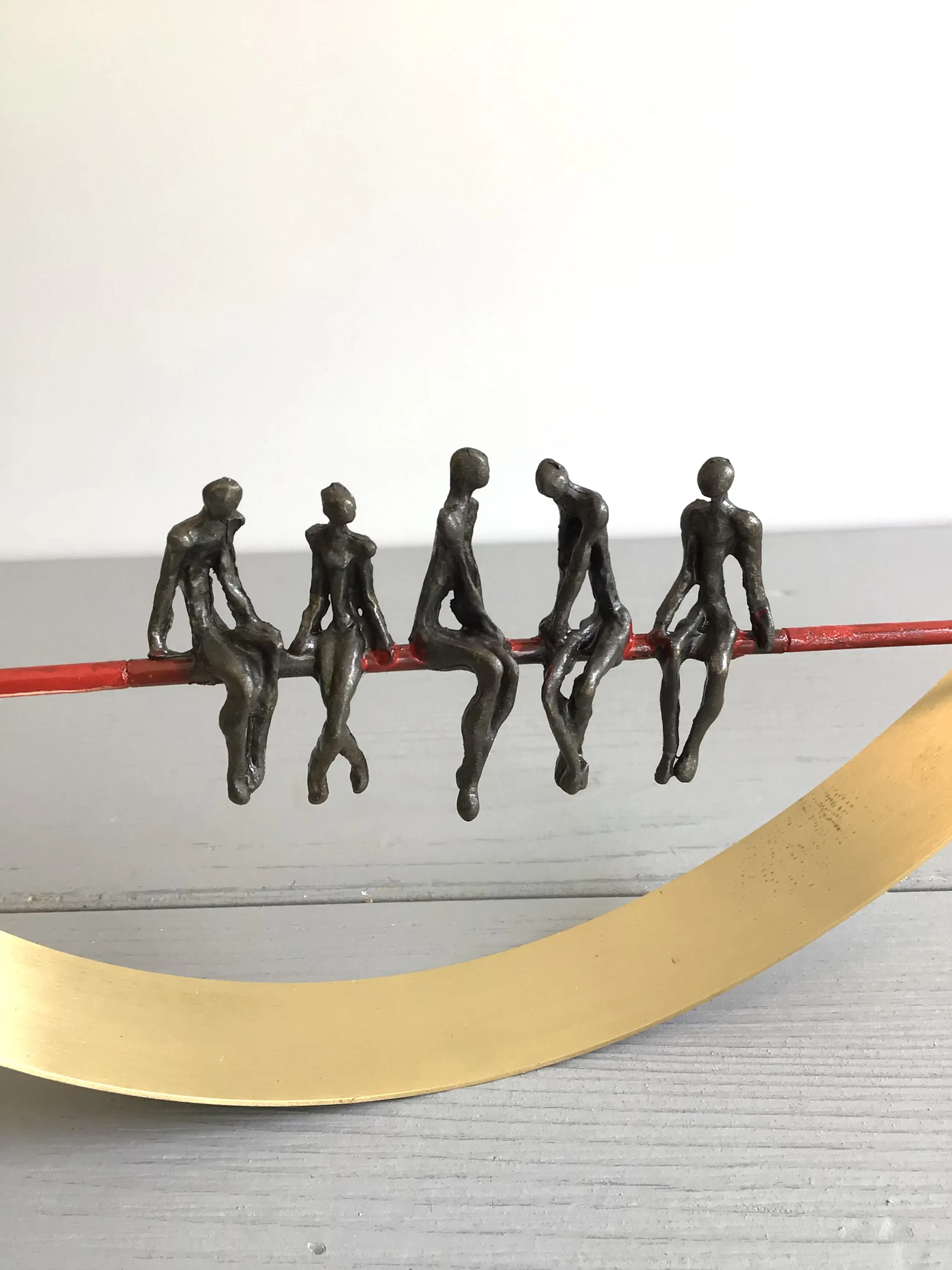 Zeer fraai vormgegeven en verfijnd sculptuur van vijf mensfiguren in gesprek zittend op een rode draad in een halve goudkleurige boog. Achtergrond gedachte “ De juiste communicatie vormt de rode draad van een organisatie in balans Kunstenares: Corry Ammerlaan Het beeld verkeert in zeer goede staat en wordt zorgvuldig verpakt verzonden.