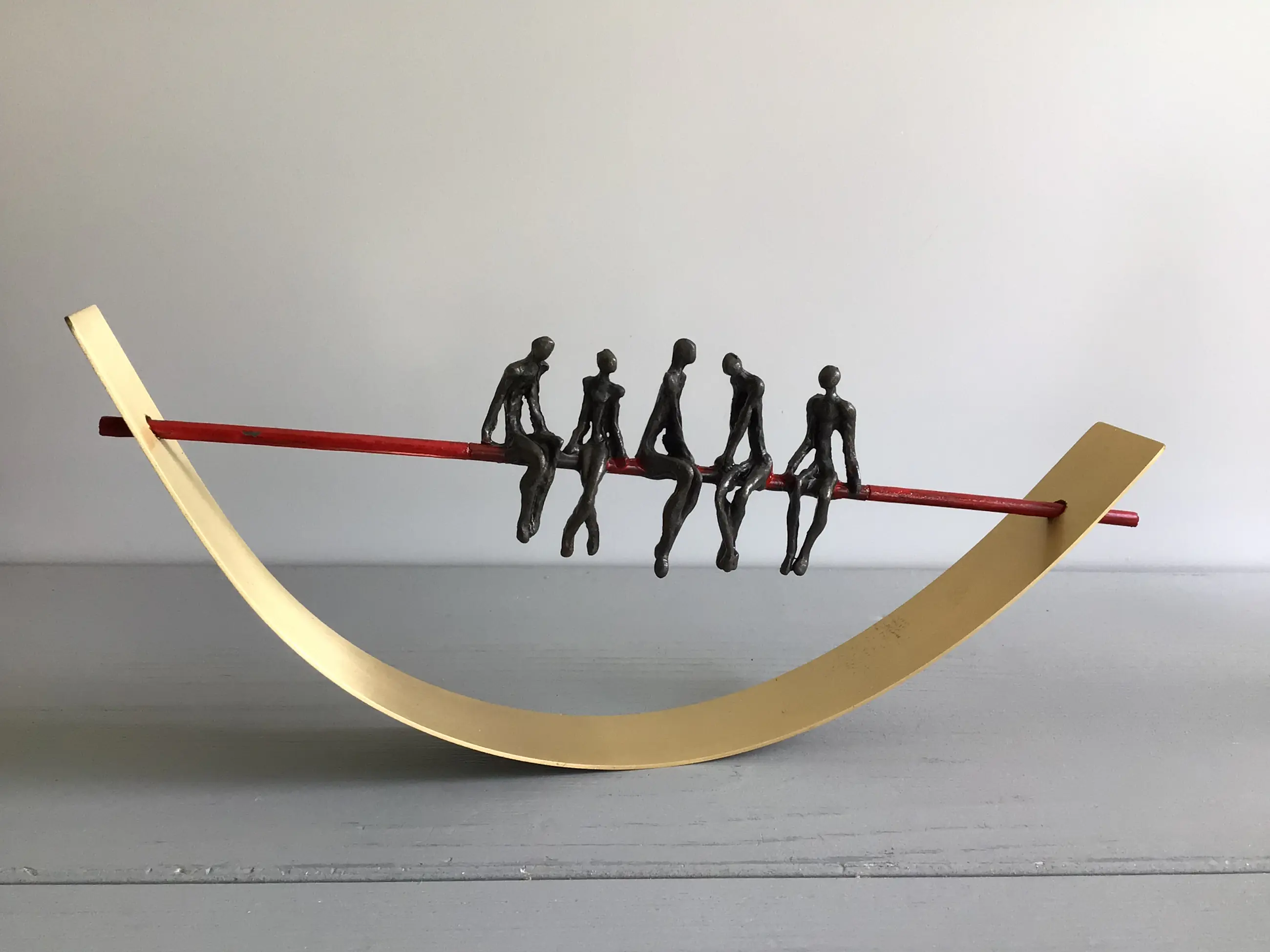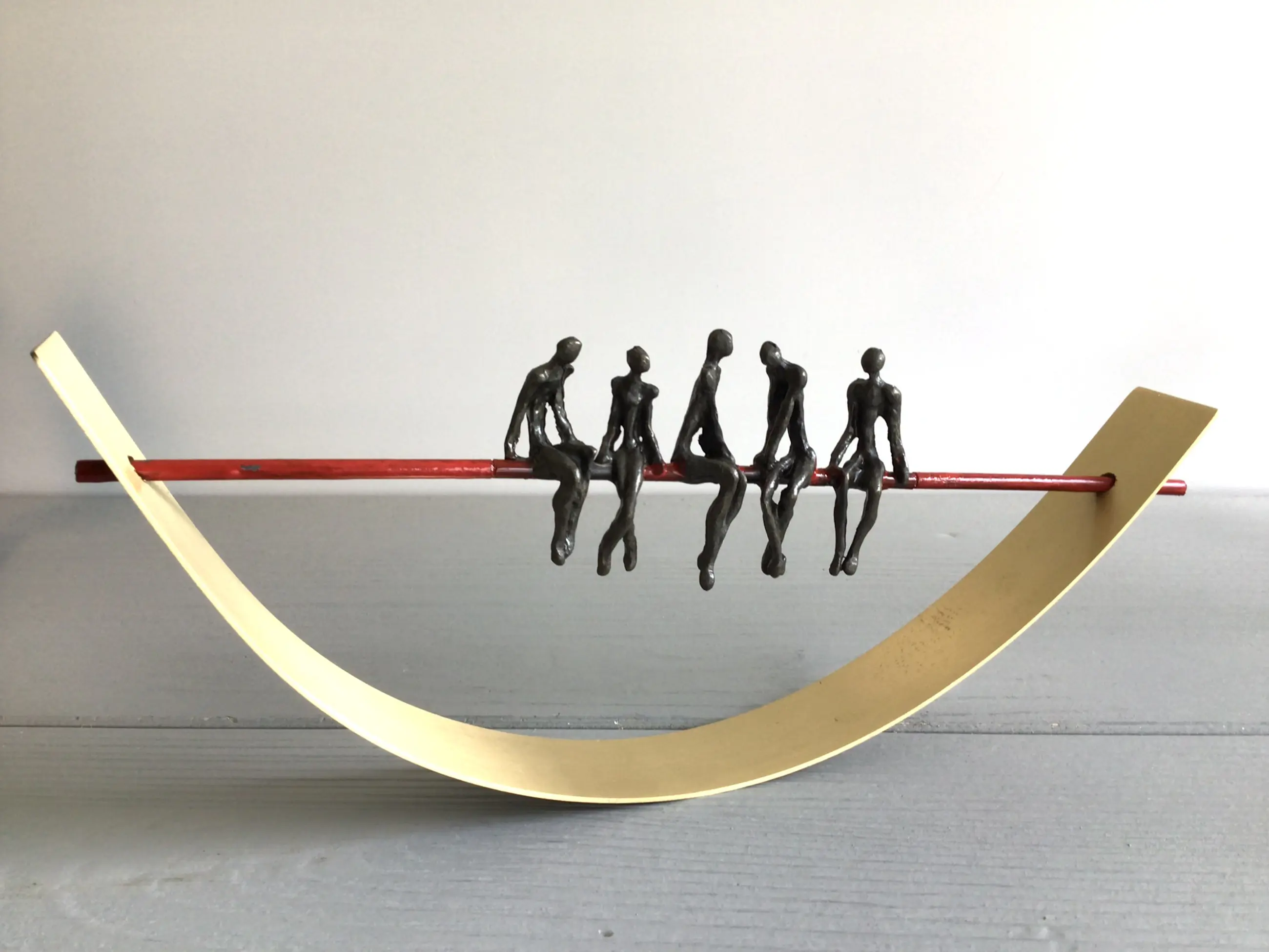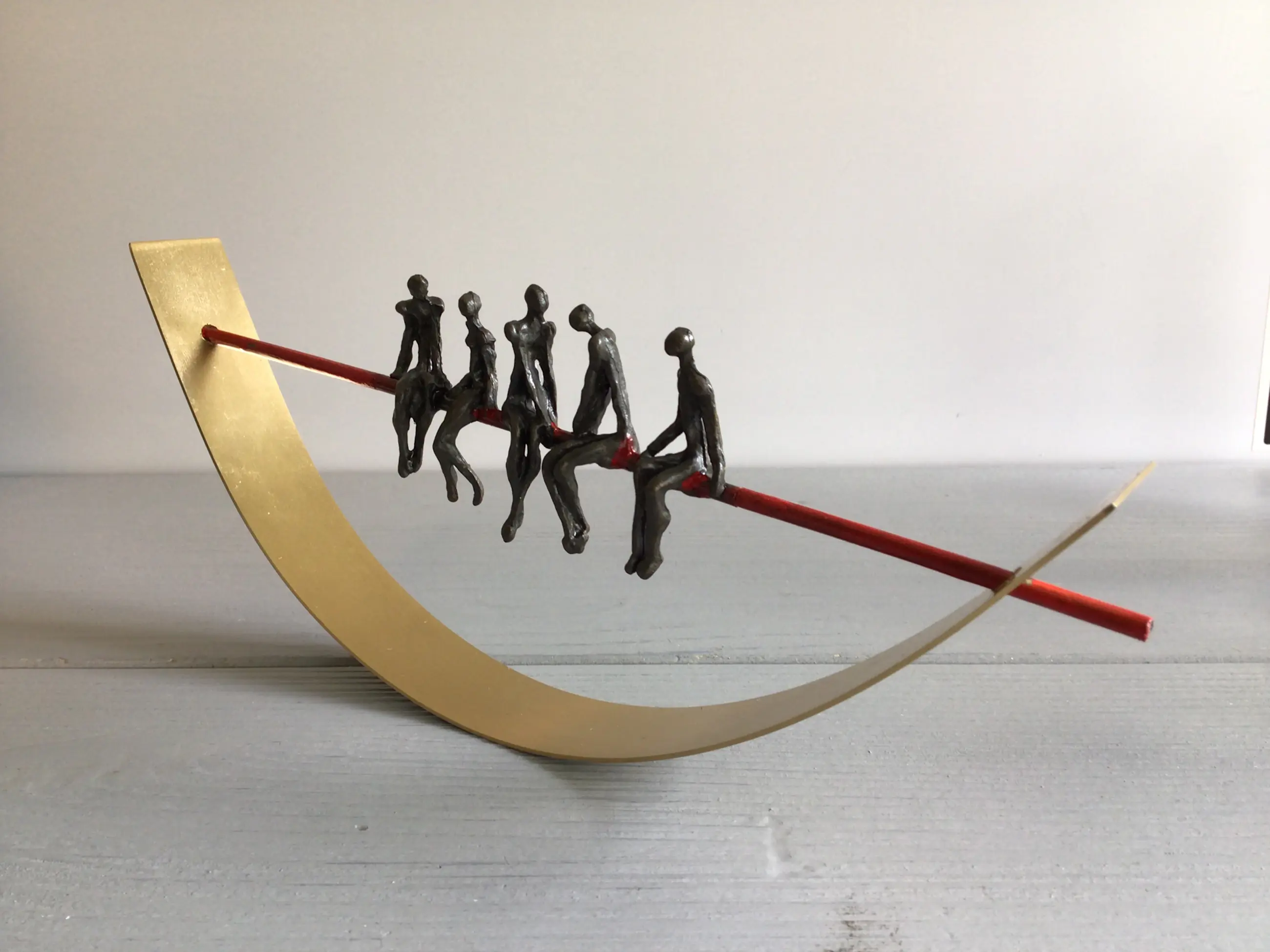Zeer fraai vormgegeven en verfijnd sculptuur van vijf mensfiguren in gesprek zittend op een rode draad in een halve goudkleurige boog. Achtergrond gedachte “ De juiste communicatie vormt de rode draad van een organisatie in balans Kunstenares: Corry Ammerlaan Het beeld verkeert in zeer goede staat en wordt zorgvuldig verpakt verzonden.
