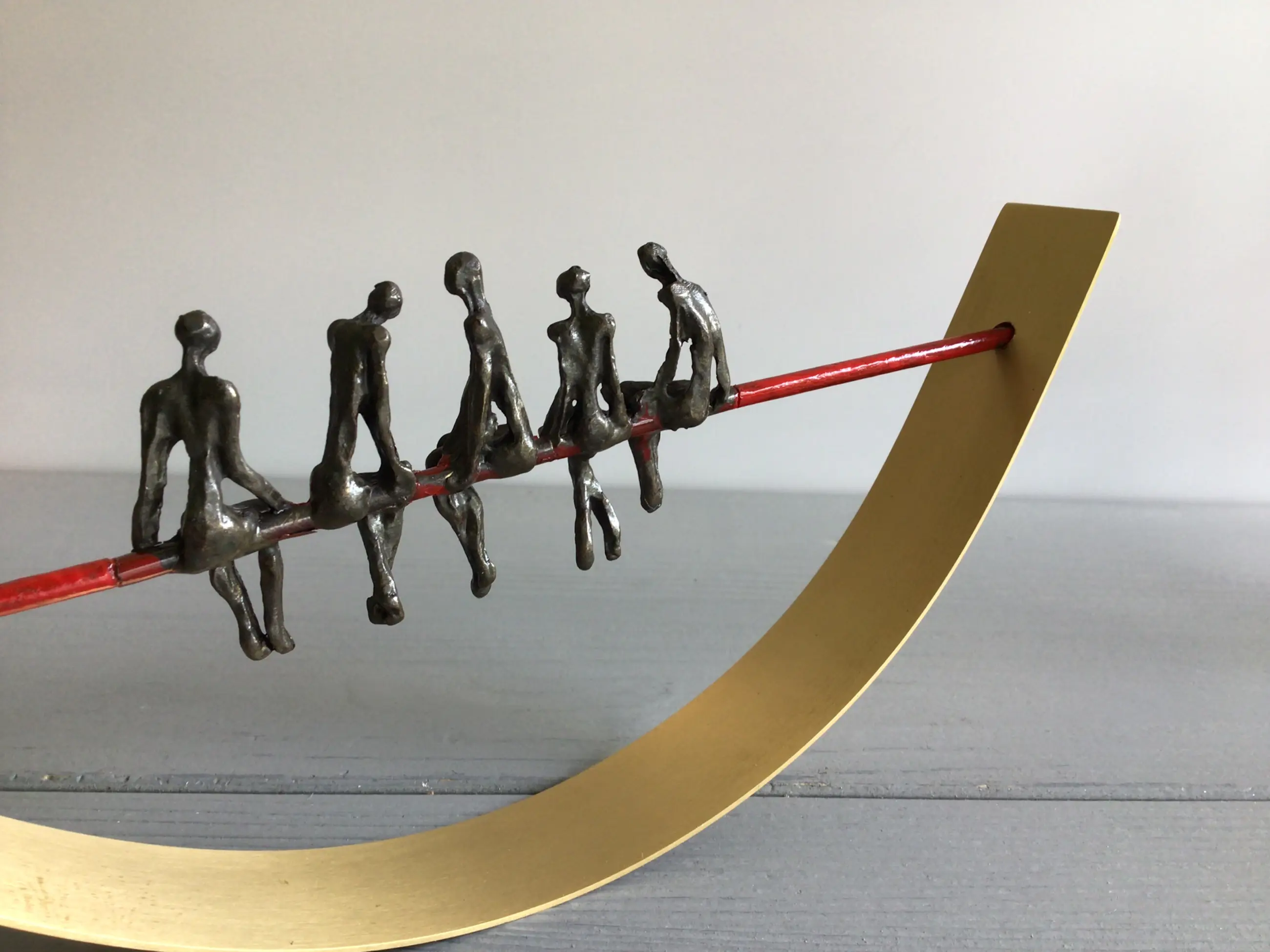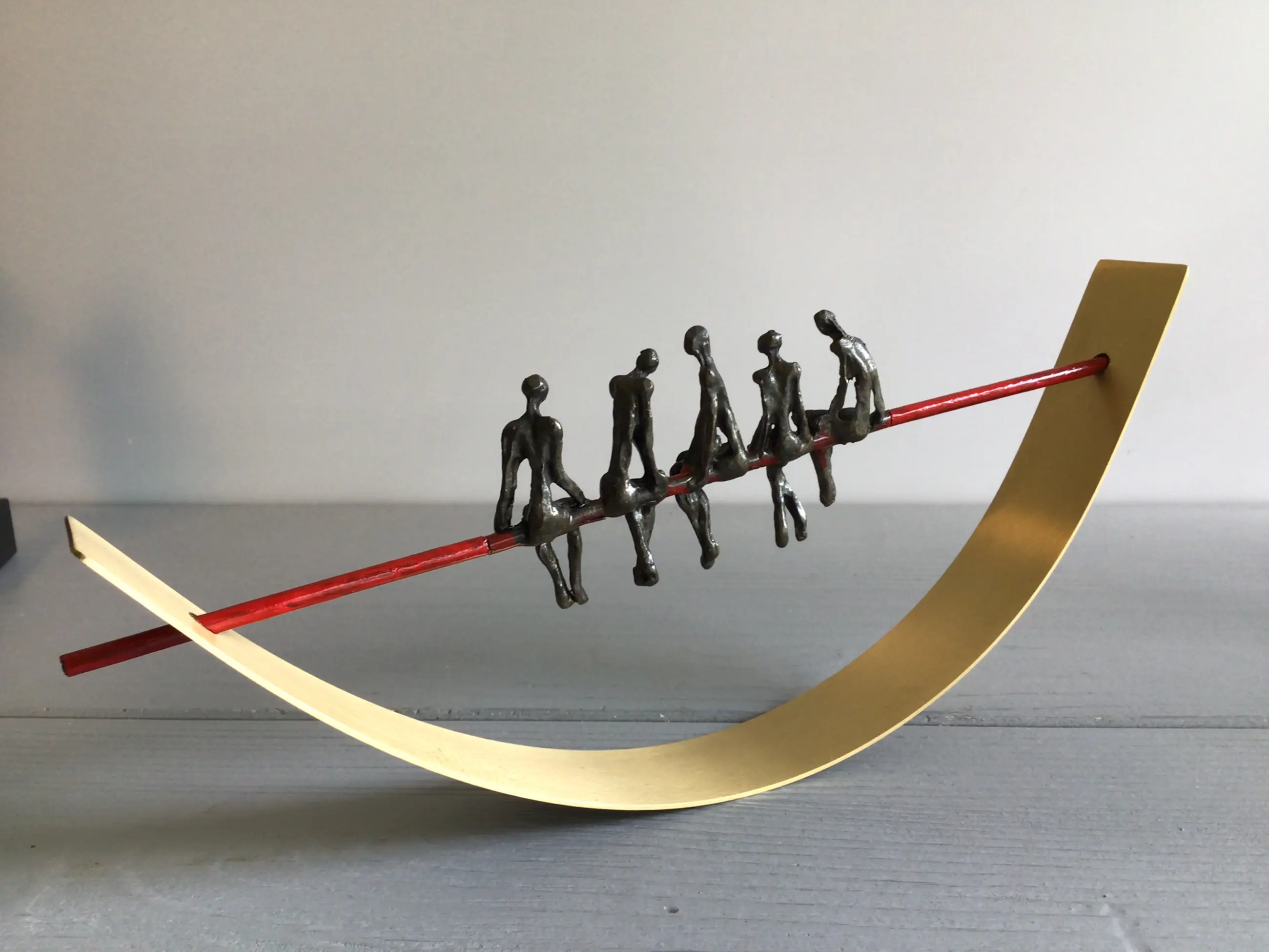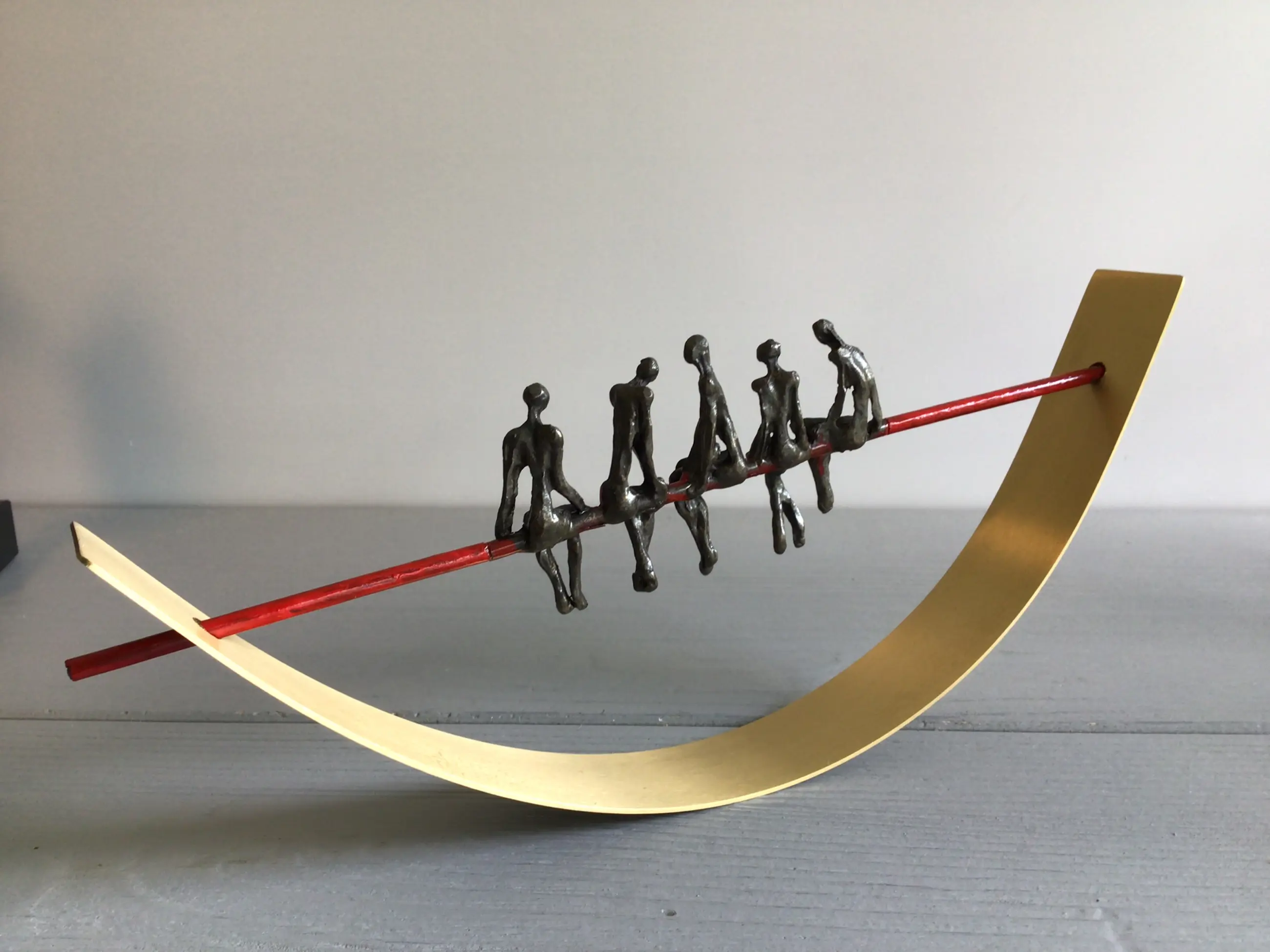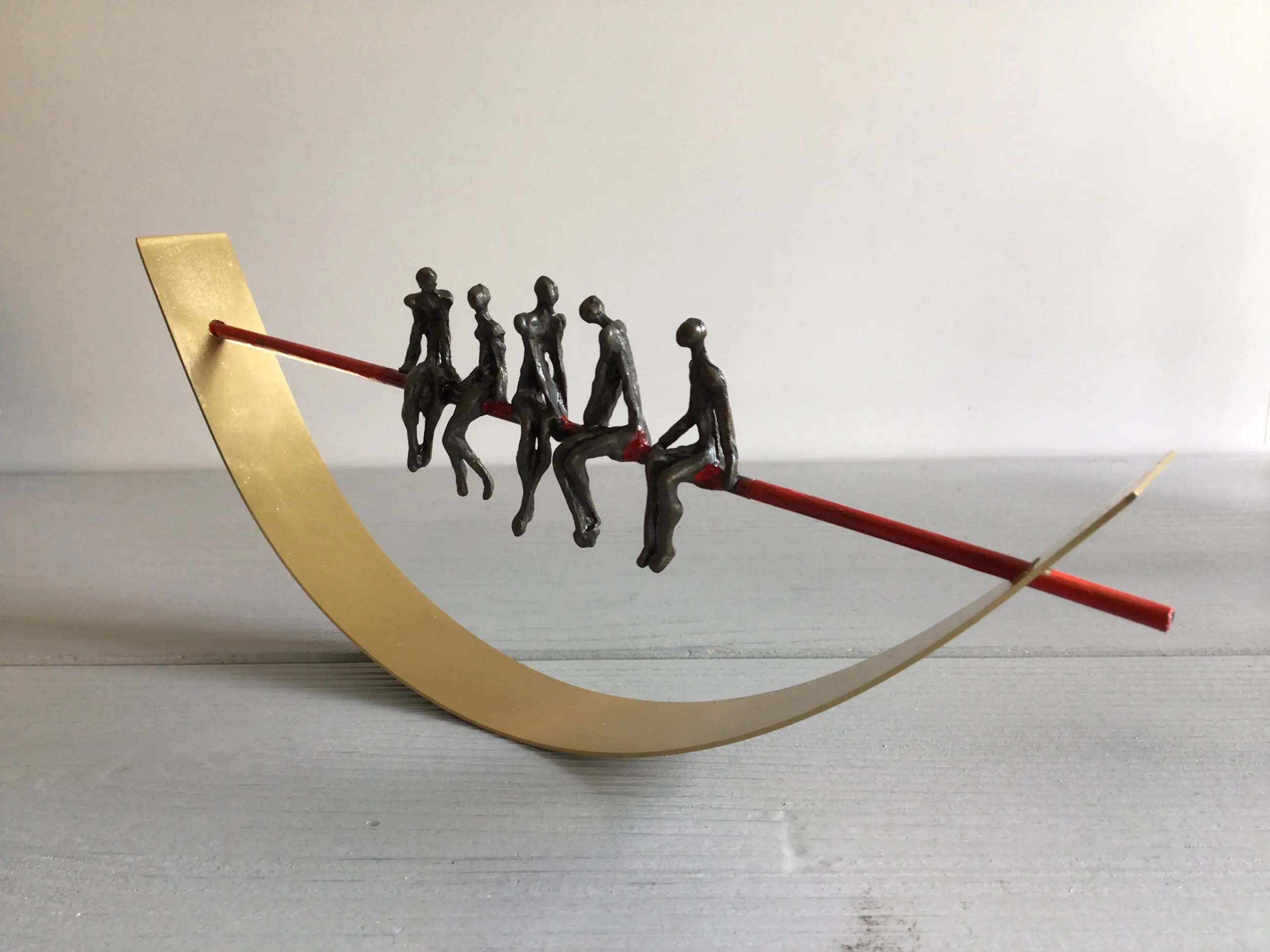 Zeer fraai vormgegeven en verfijnd sculptuur van vijf mensfiguren in gesprek zittend op een rode draad in een halve goudkleurige boog. Achtergrond gedachte “ De juiste communicatie vormt de rode draad van een organisatie in balans Kunstenares: Corry Ammerlaan Het beeld verkeert in zeer goede staat en wordt zorgvuldig verpakt verzonden.
