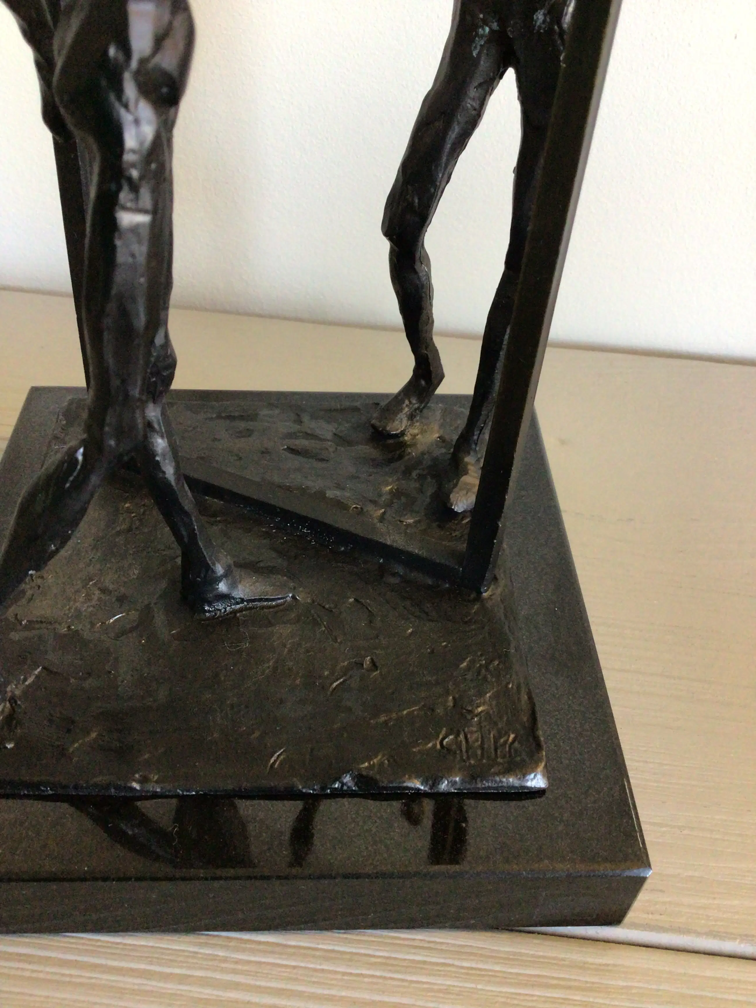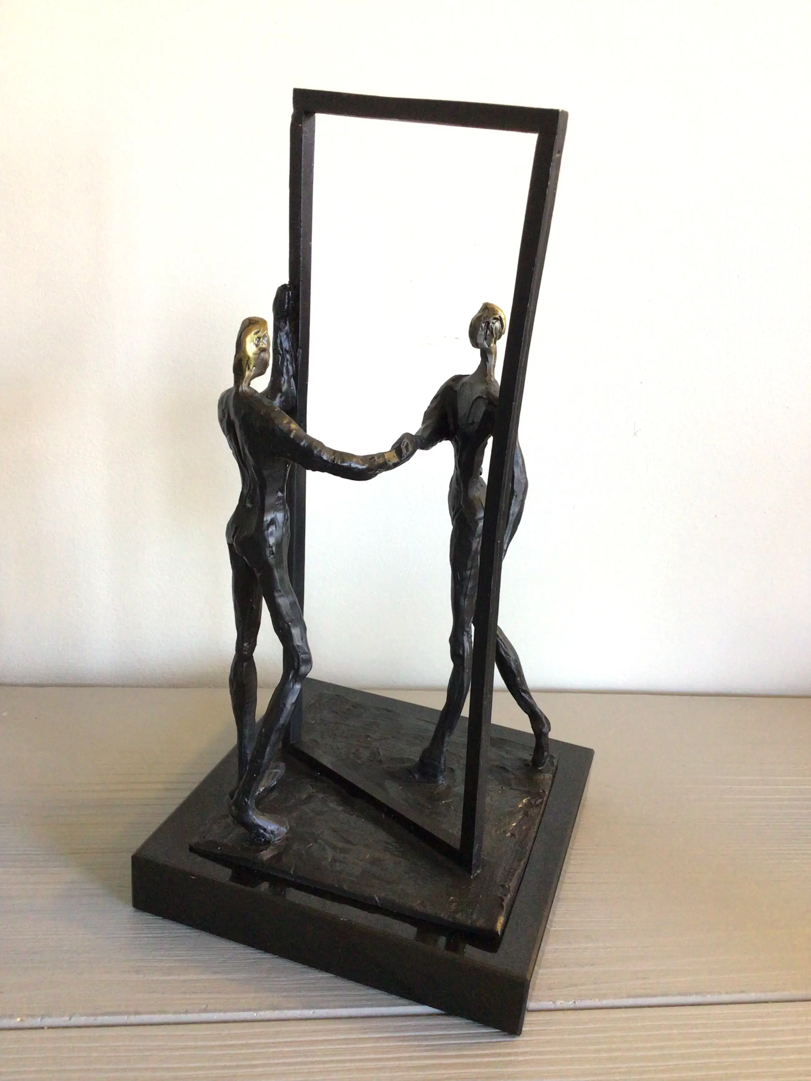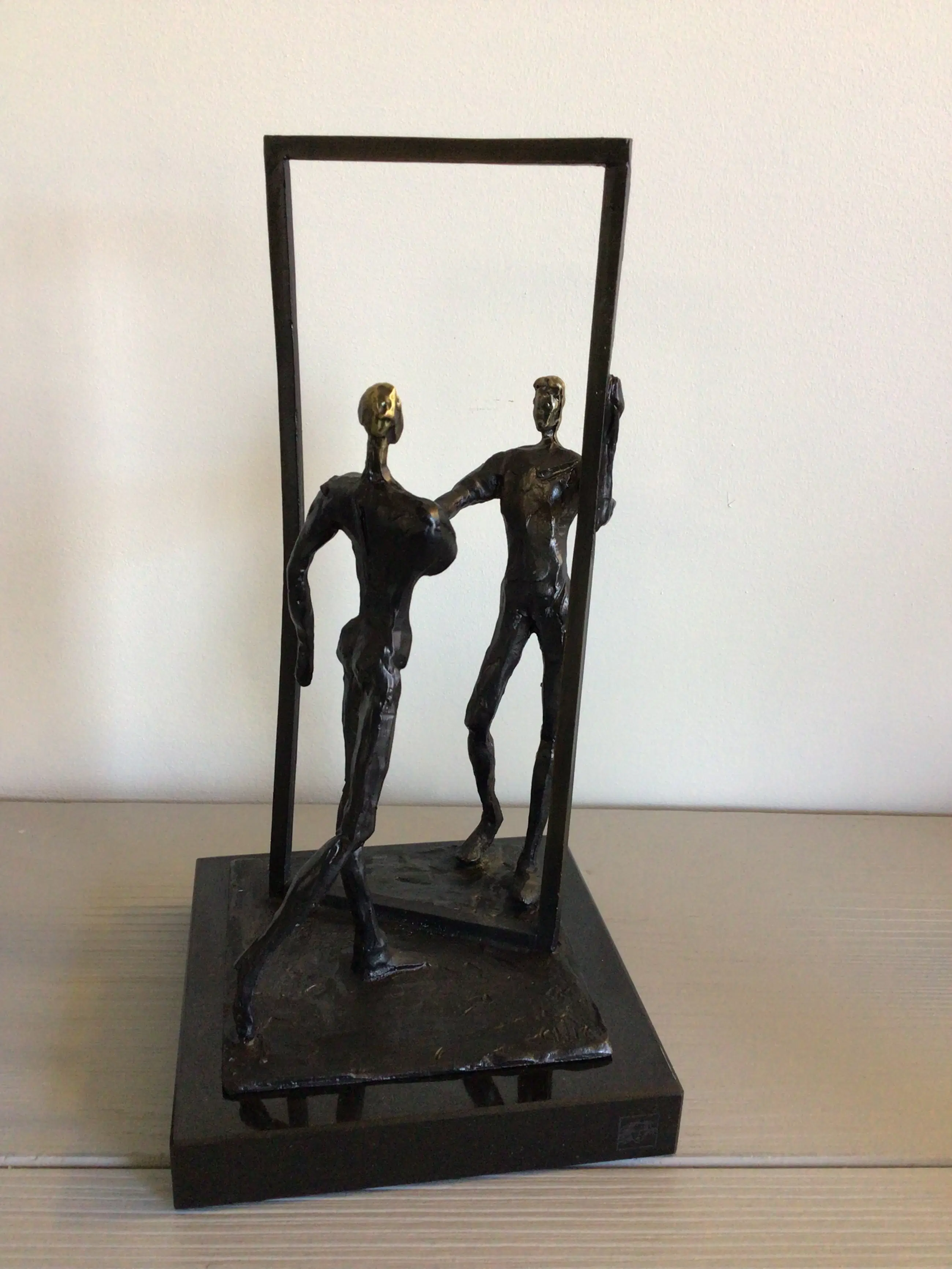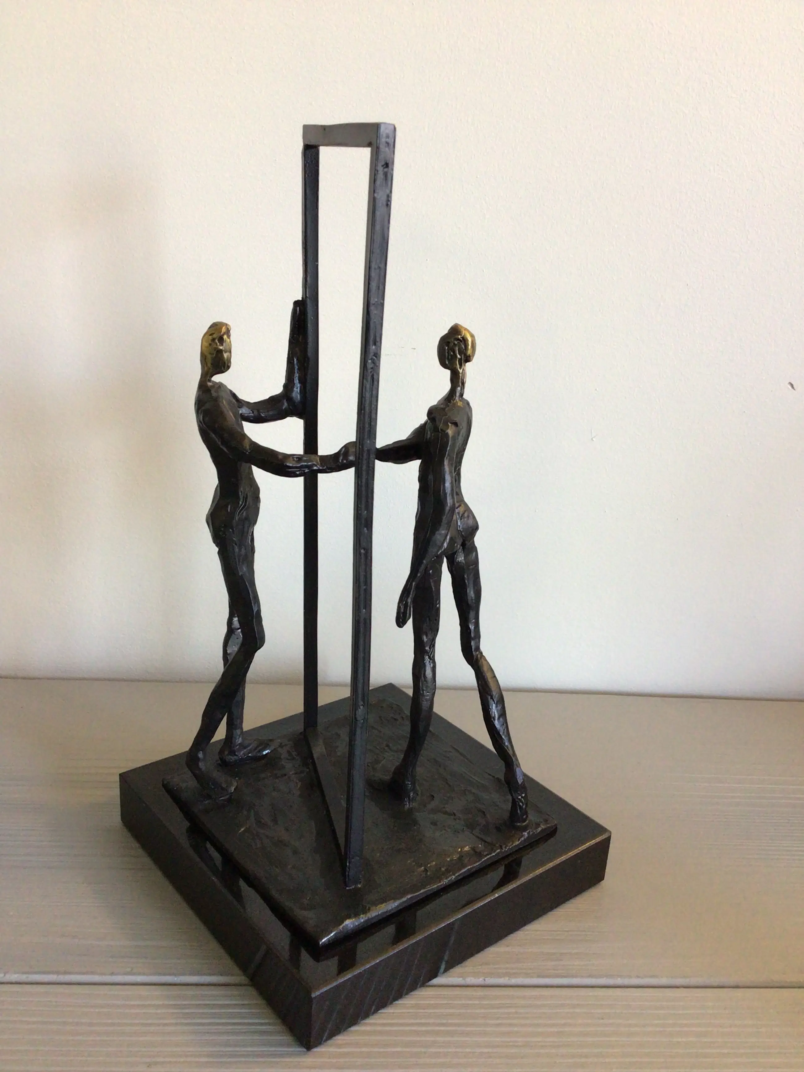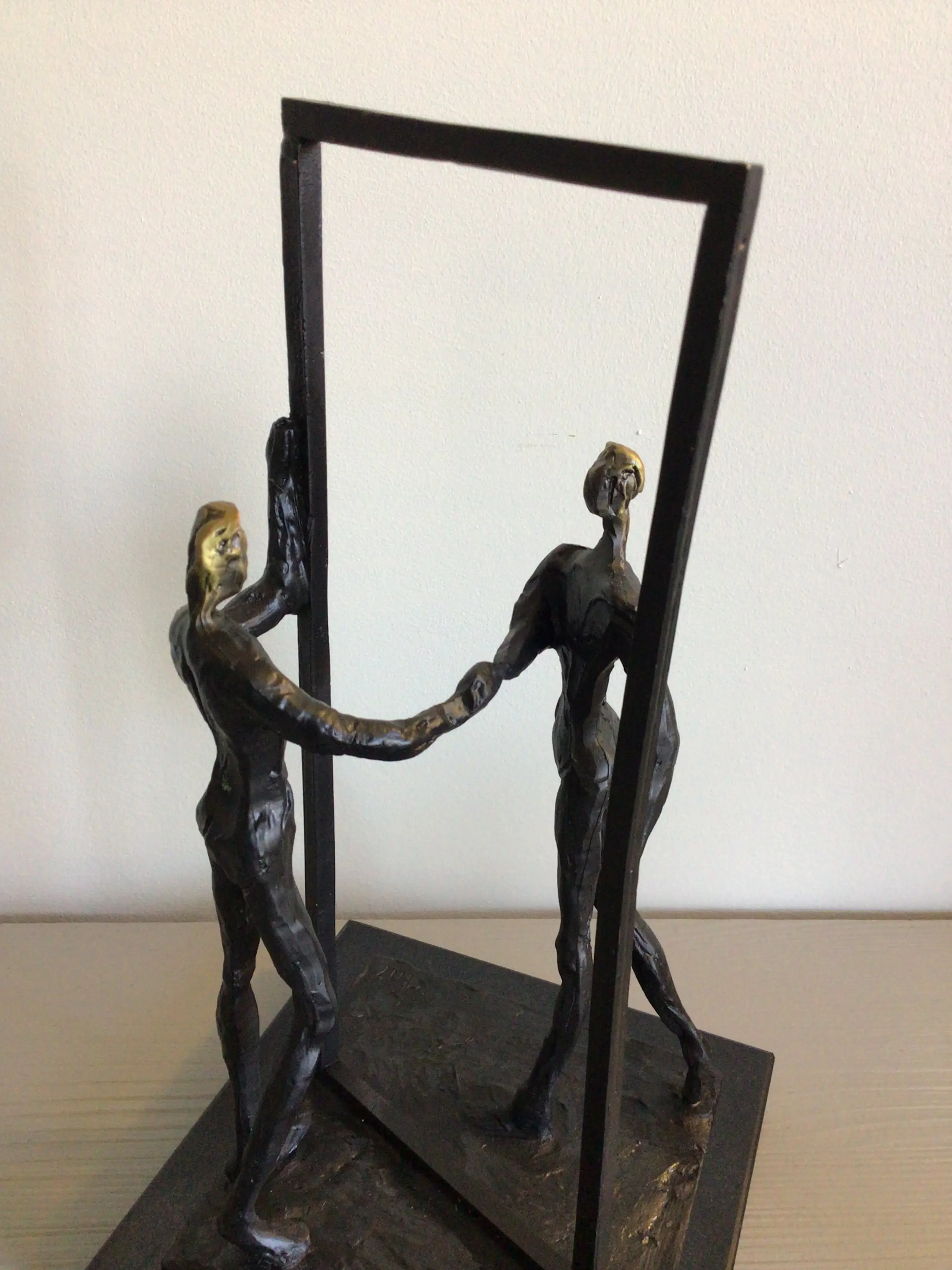Zeer fraai vormgegeven symbolisch sculptuur van twee mensfiguren die elkaar de hand schudden staande voor een poort, een mooie symboliek Titel “ De ontmoeting “ Kunstenares: Corry Ammerlaan Het beeld is gesigneerd: CAN Het beeld wordt geleverd inclusief originele verpakking Het sculptuur verkeert in zeer goede staat en wordt zorgvuldig verpakt verzonden.
